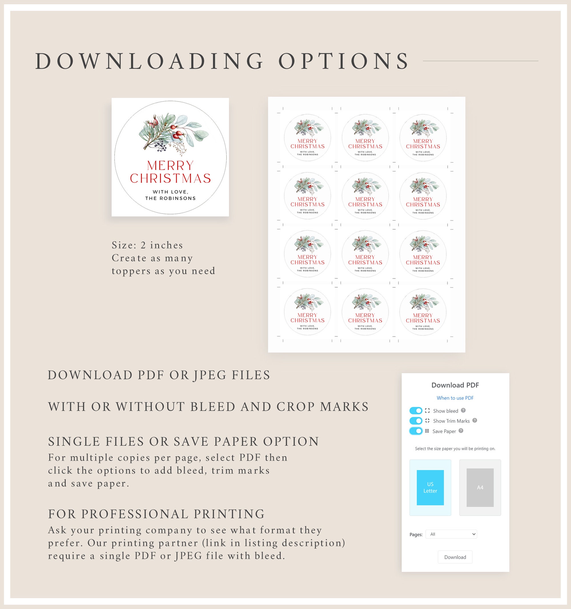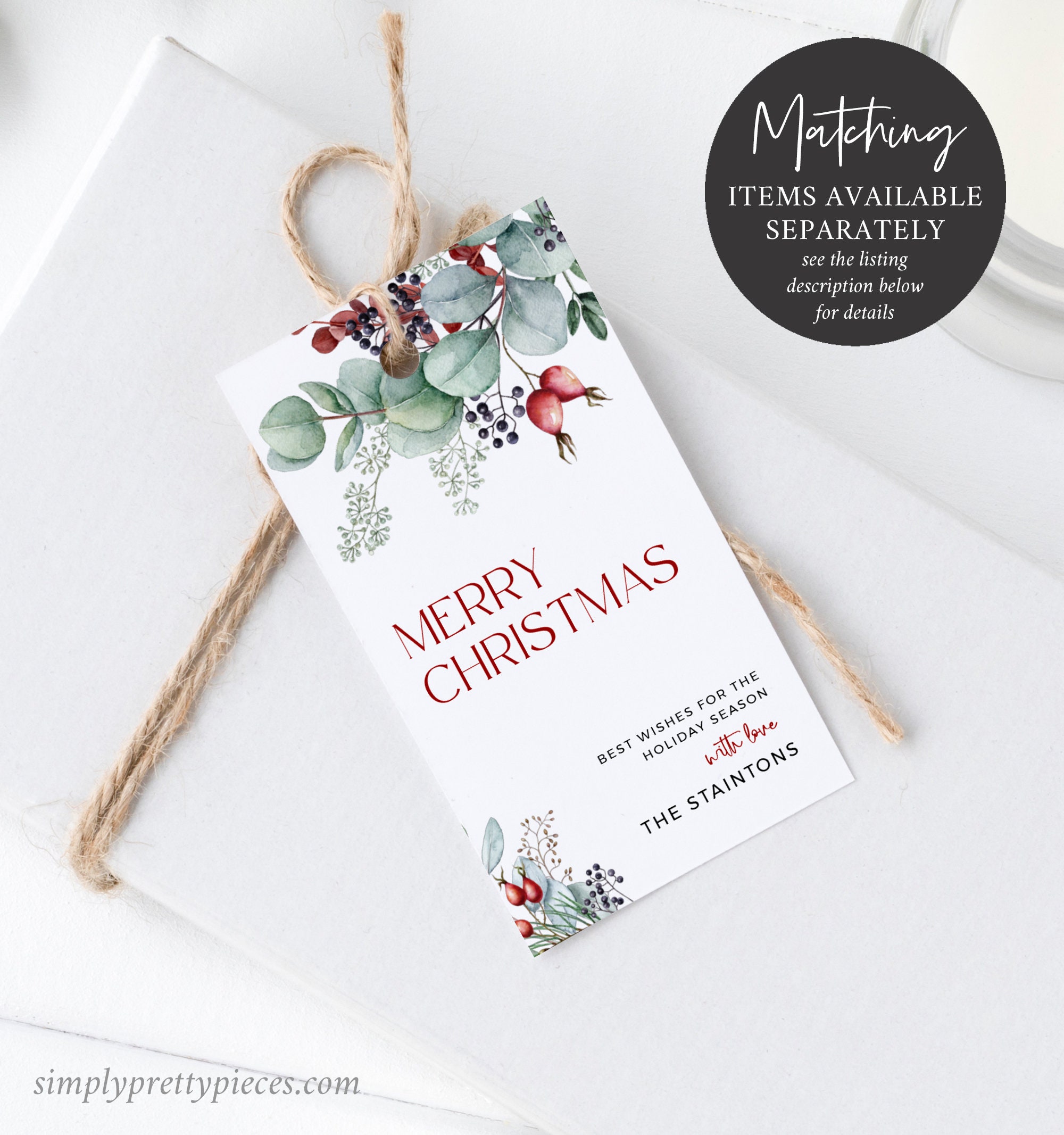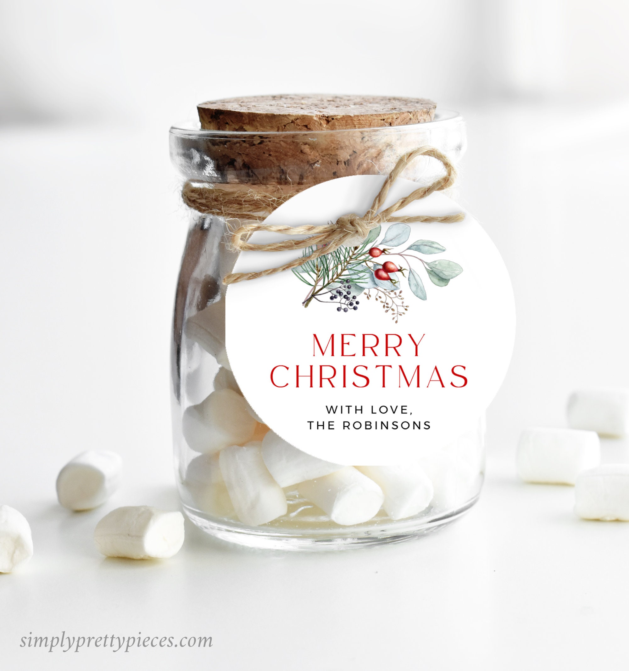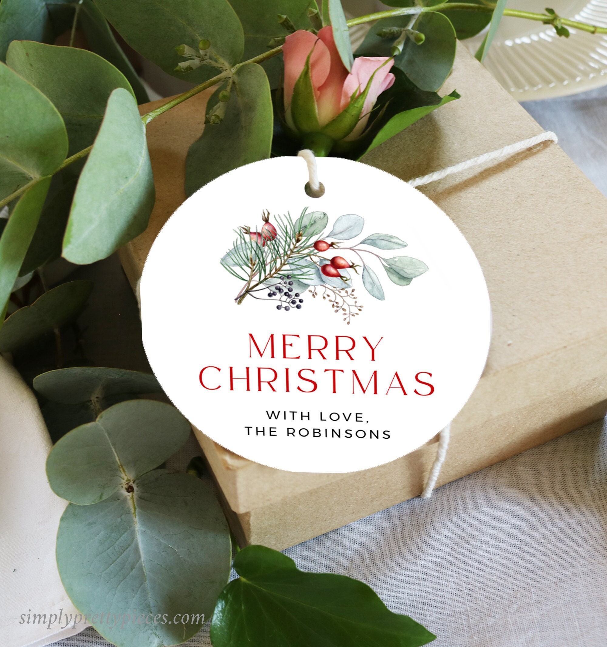 An instant download round holiday gift tag template that has a winter foliage design and a modern font. You can create all the tags or labels you need and they are ideal for christmas gifts or holiday party favors.