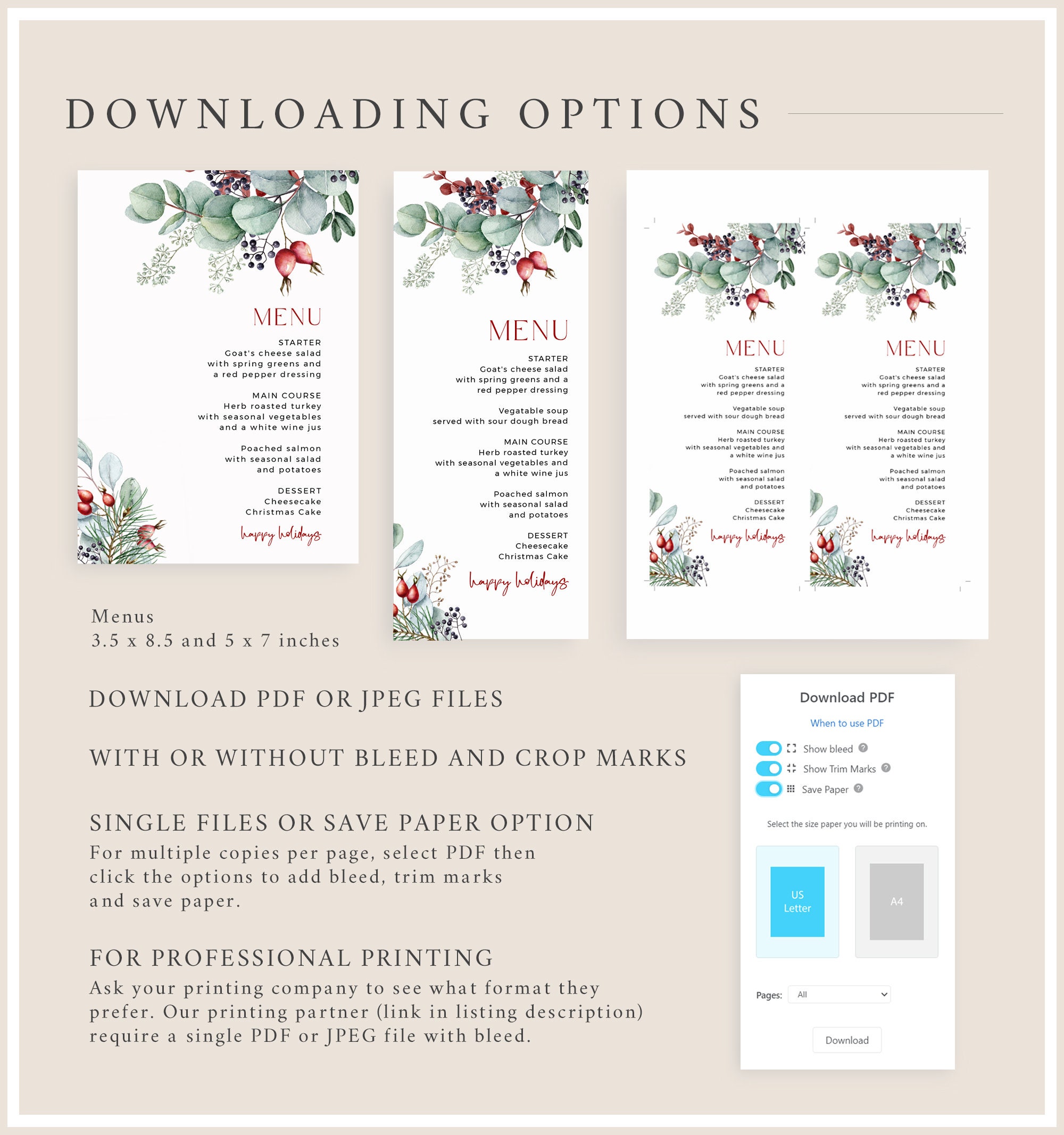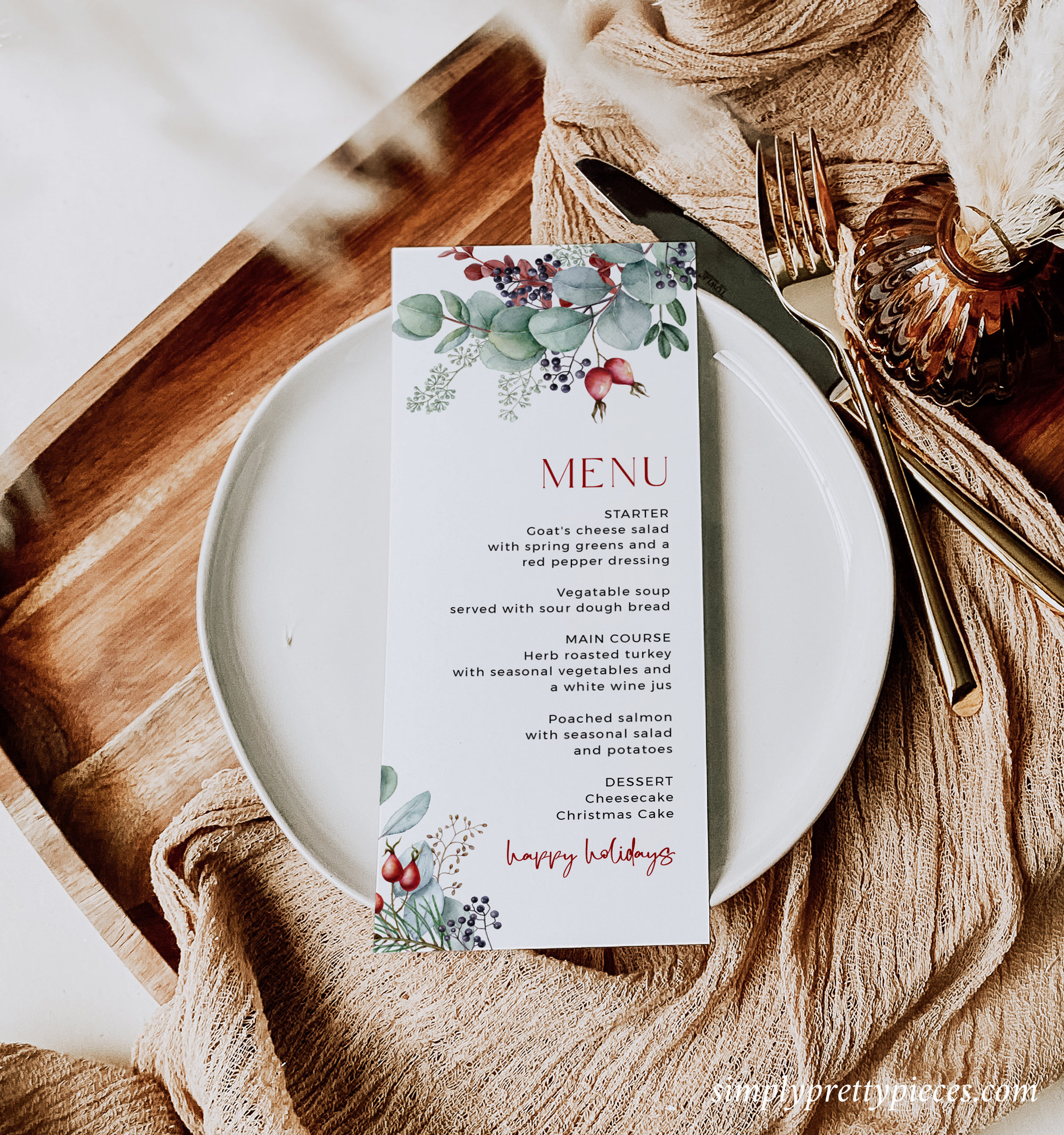 A printable Christmas menu template that features a bold burgundy colors and a winter foliage design. This modern holiday party menu is easy to edit and print so you can customize it as required. Two sizes are included and these will make the perfect table decorations.