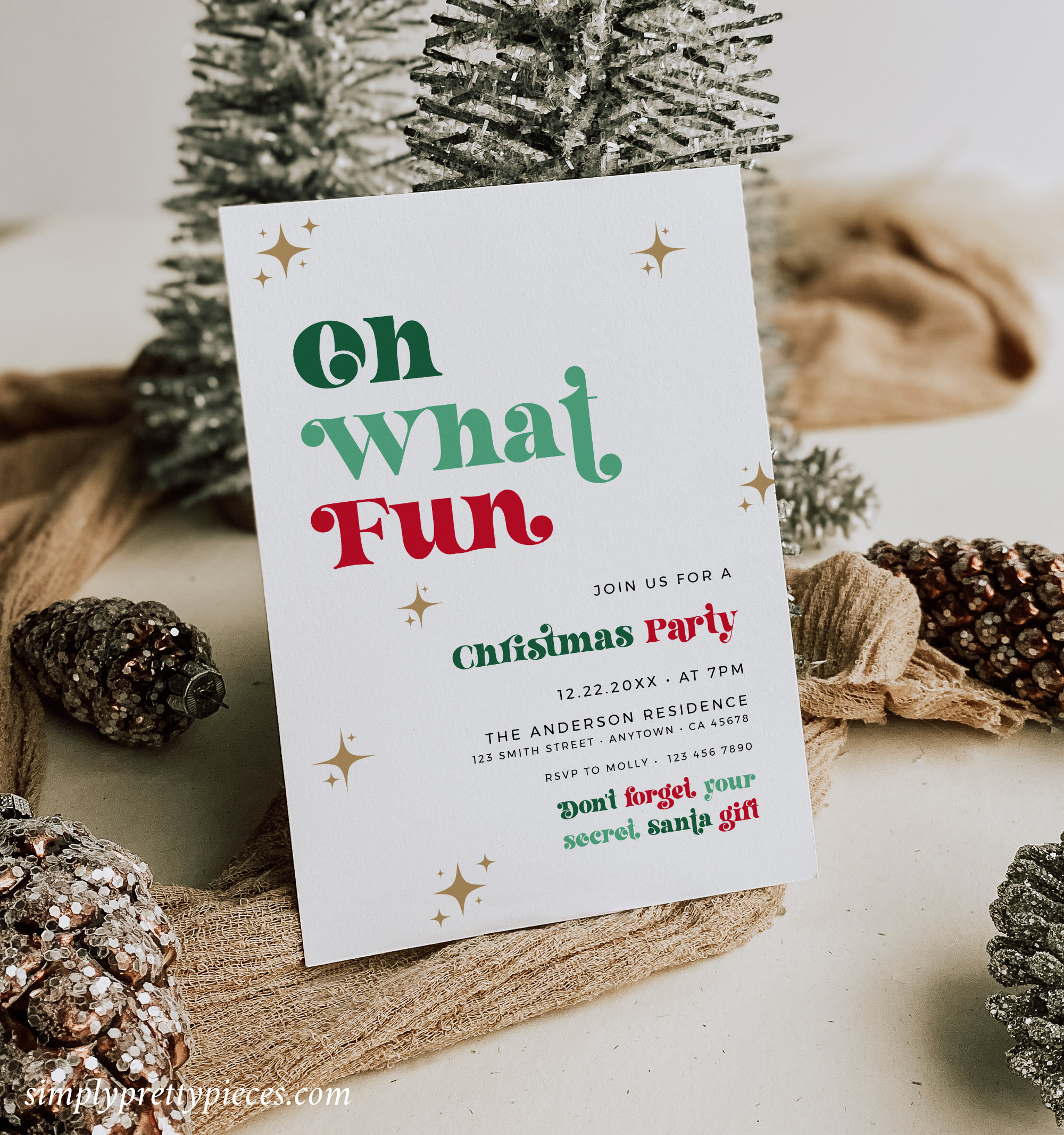 Printable boho Christmas party invitation template that has a modern design, a bright green, red and gold color palette and a retro font. This holiday party invite is easy to edit and print and is the perfect way to invite family and friends to a Christmas party or event.
