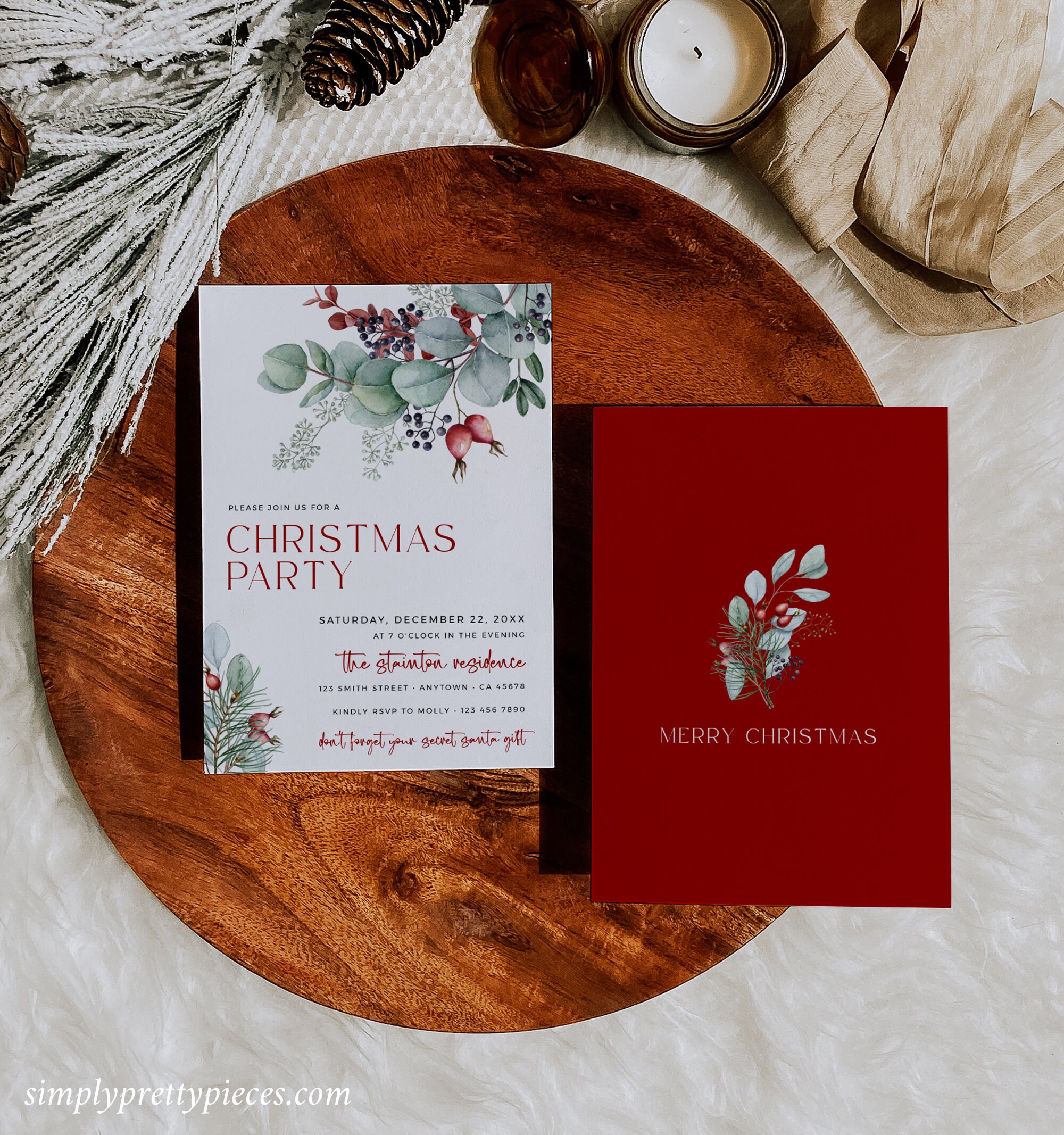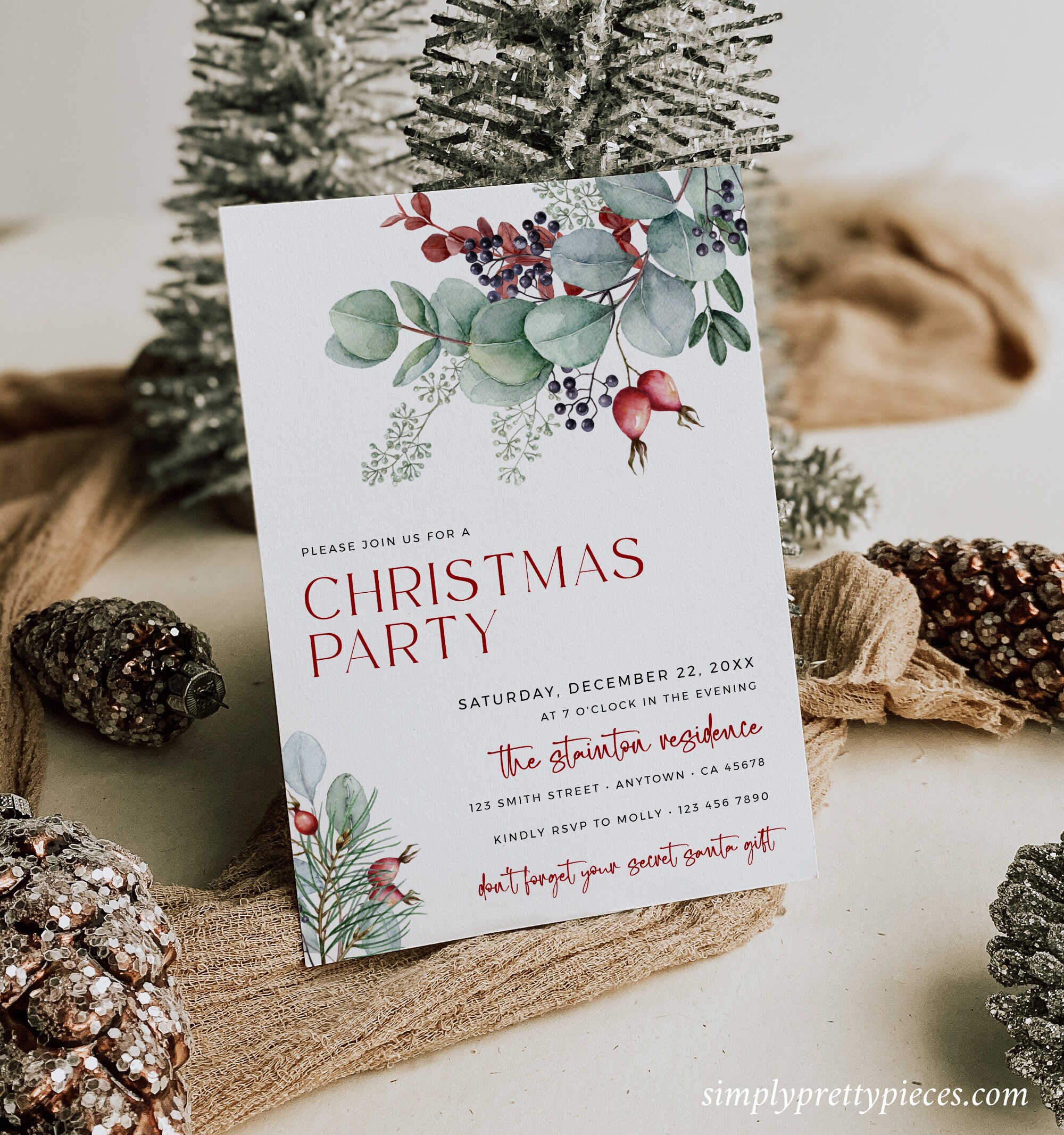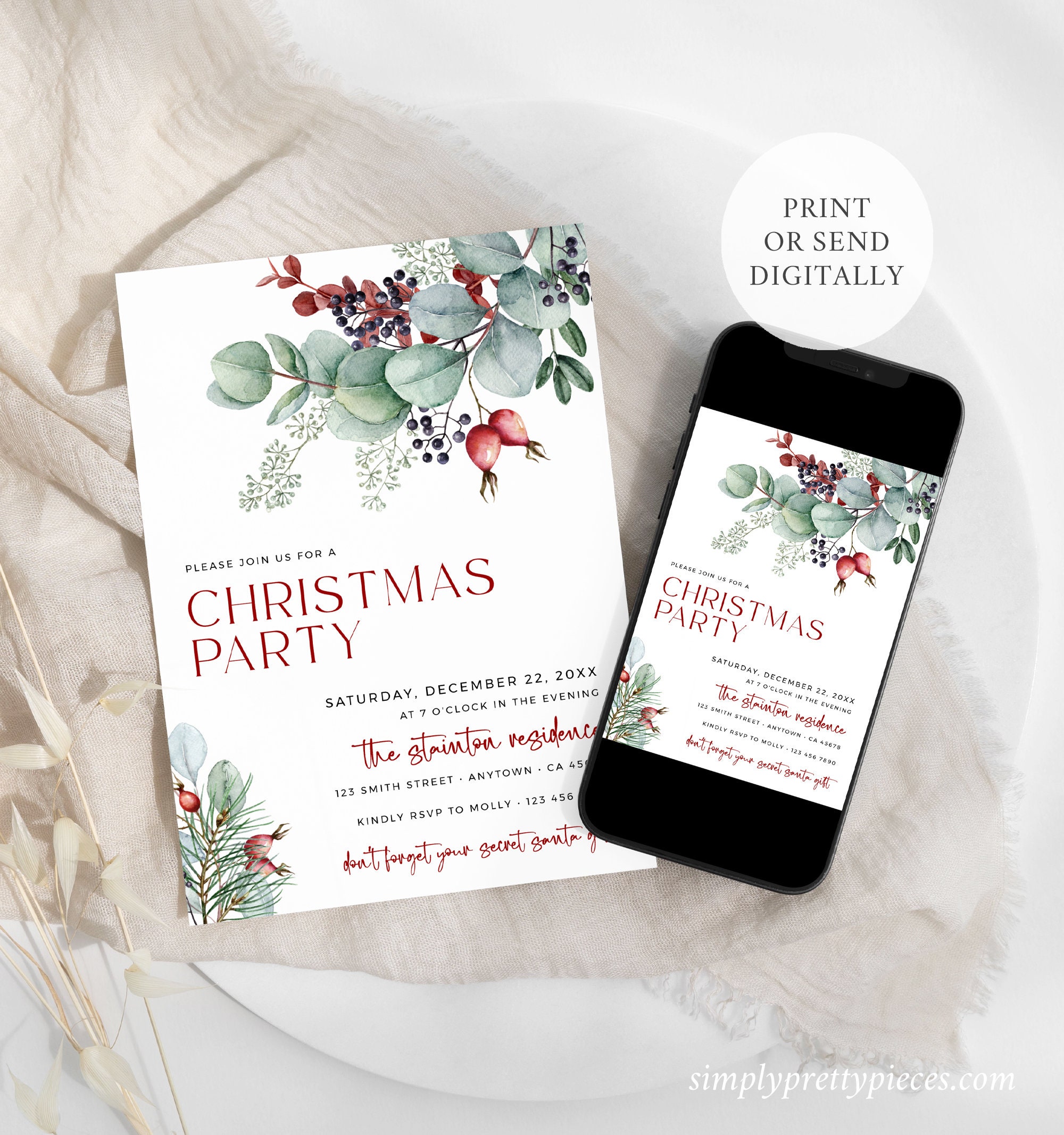 Editable Christmas party invitation template that has a modern winter foliage design, a festive red and green color palette and a modern font. This holiday party invite is easy to edit and print and is the perfect way to invite family and friends to a Christmas party or event.