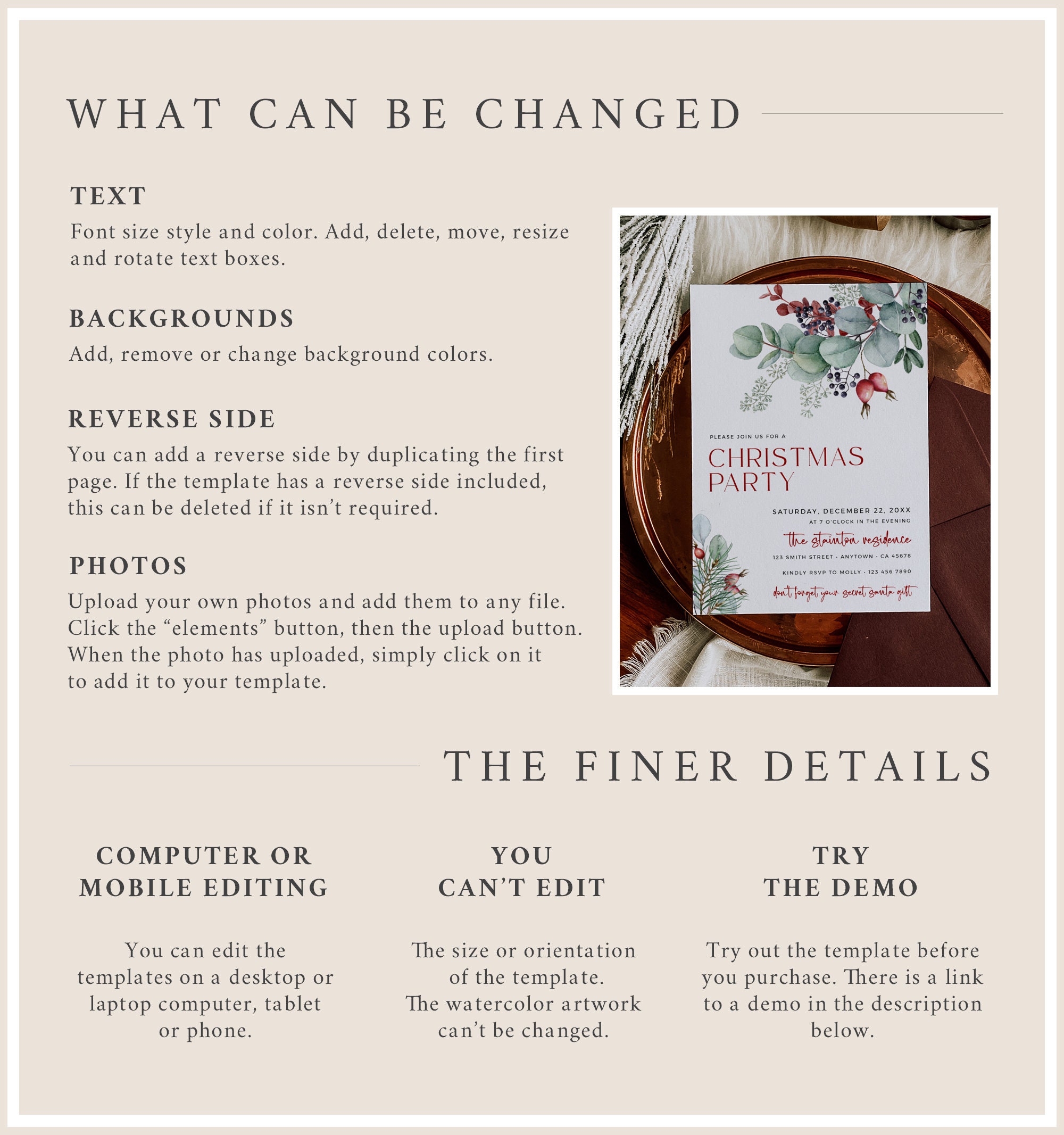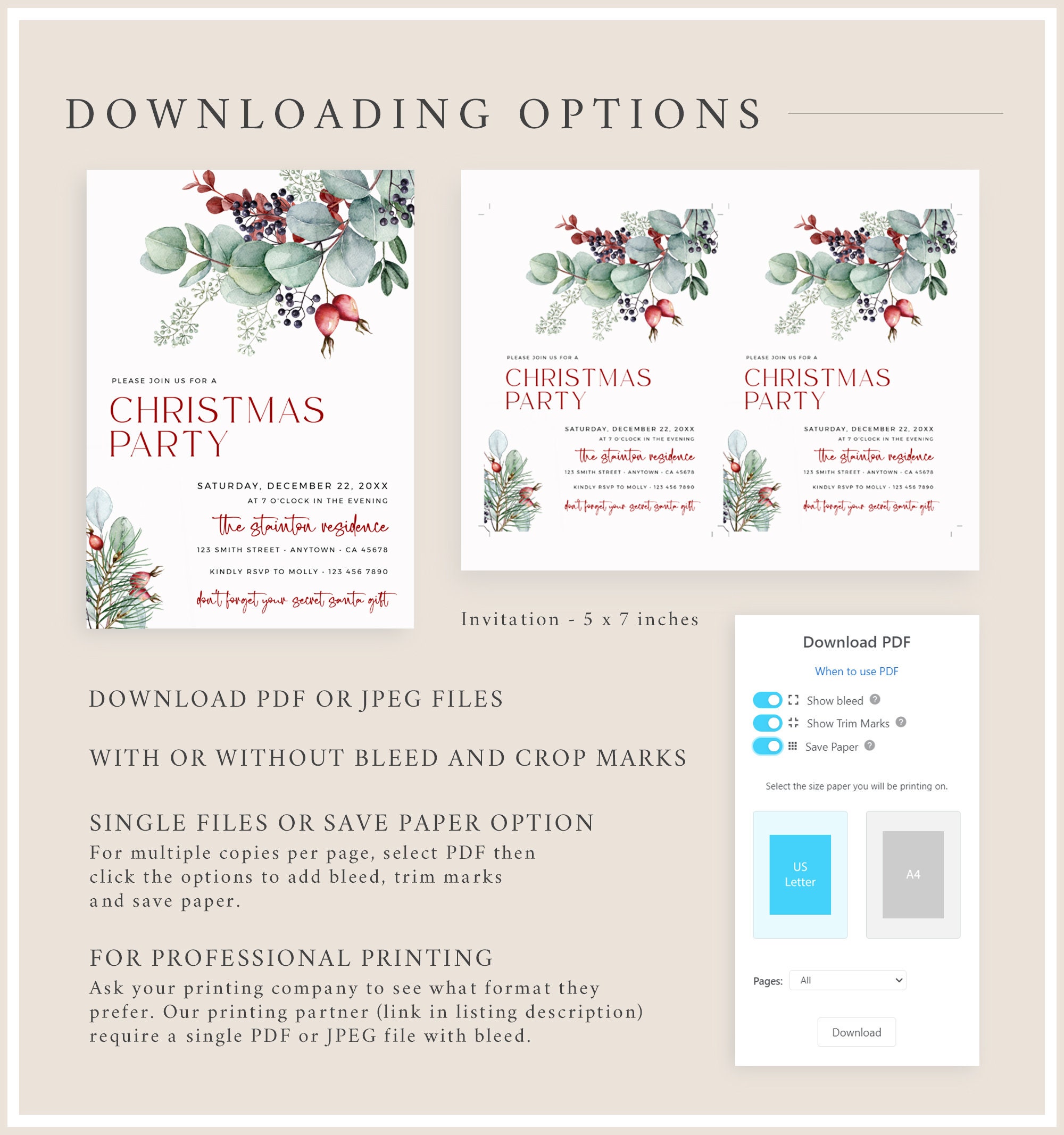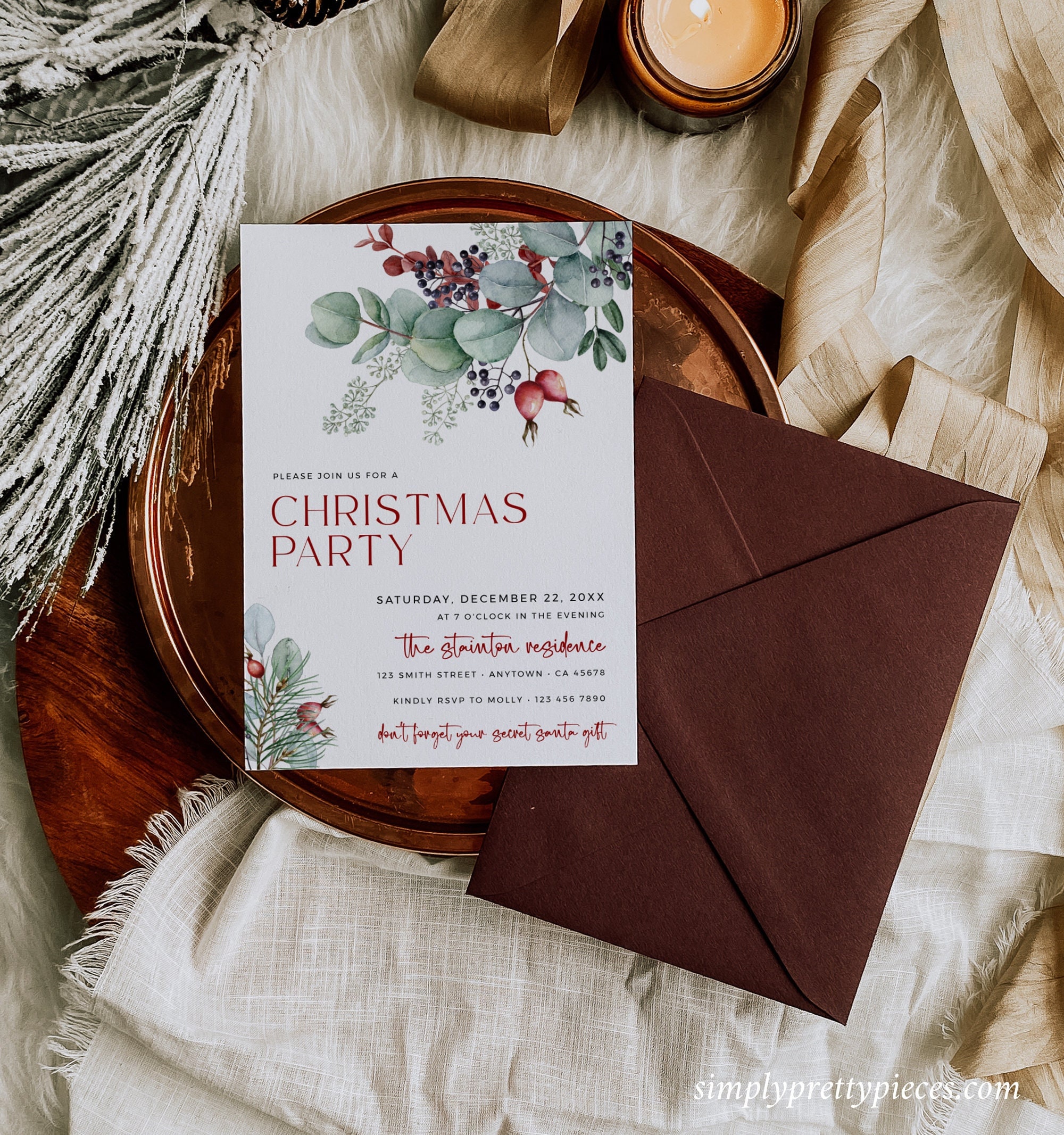 Editable Christmas party invitation template that has a modern winter foliage design, a festive red and green color palette and a modern font. This holiday party invite is easy to edit and print and is the perfect way to invite family and friends to a Christmas party or event.