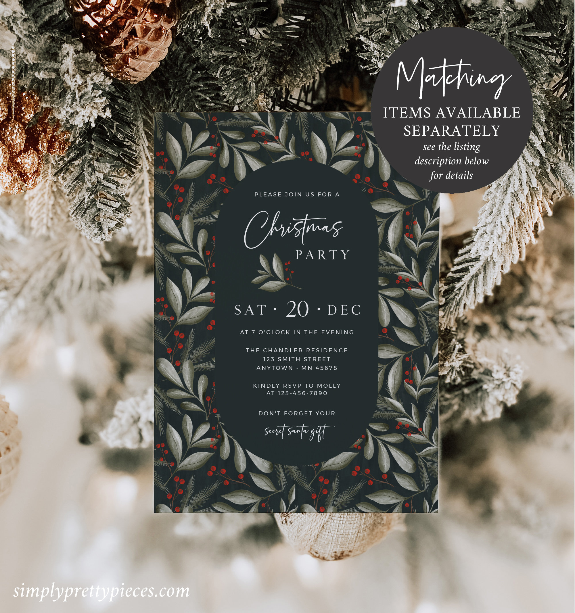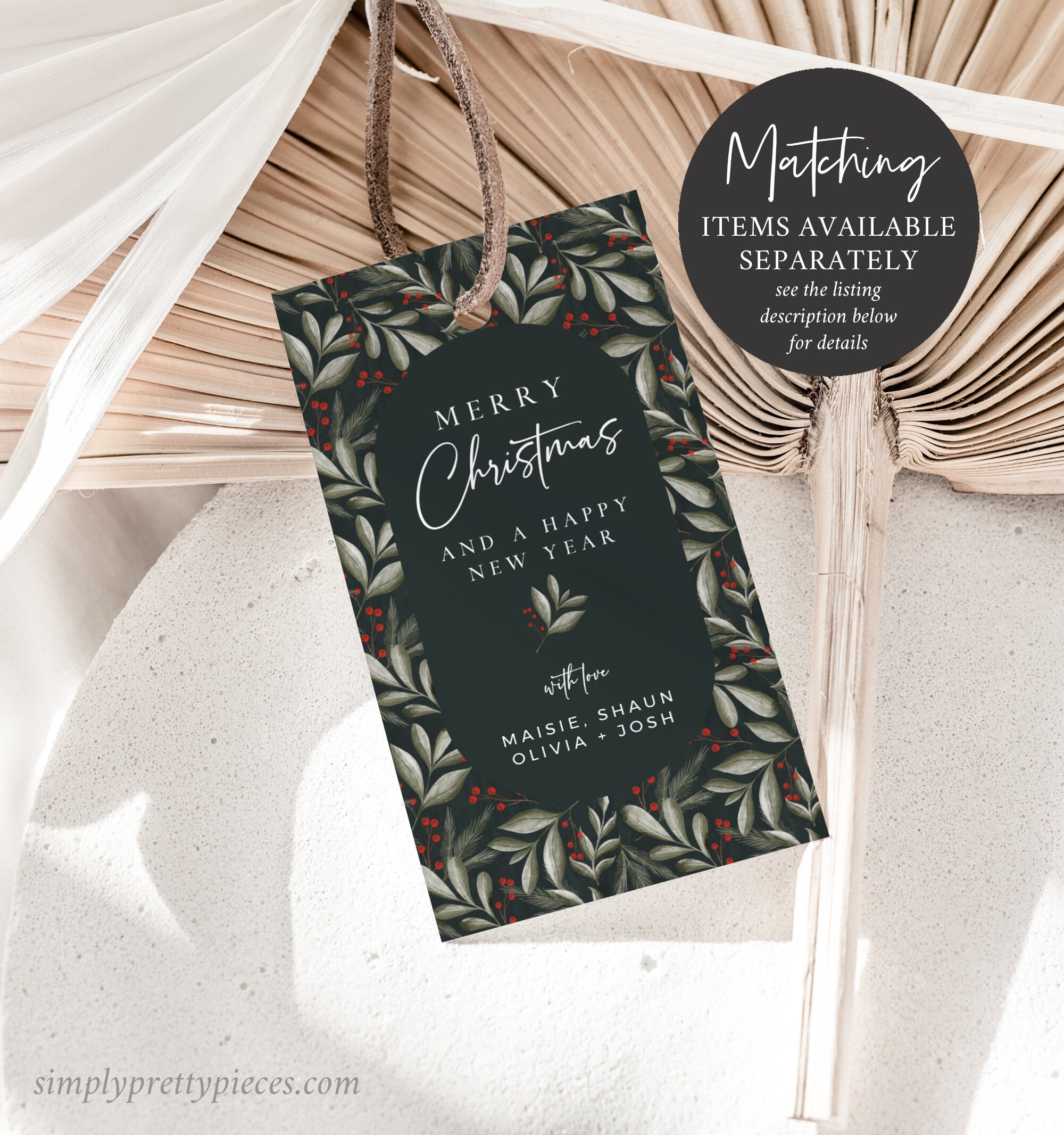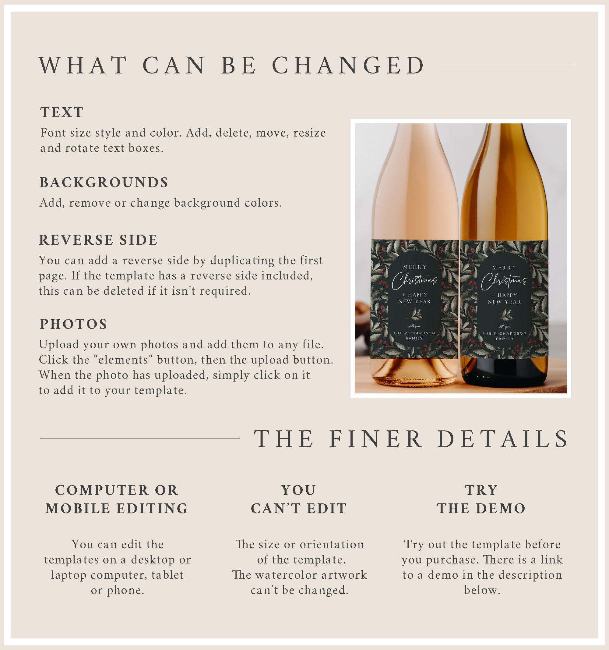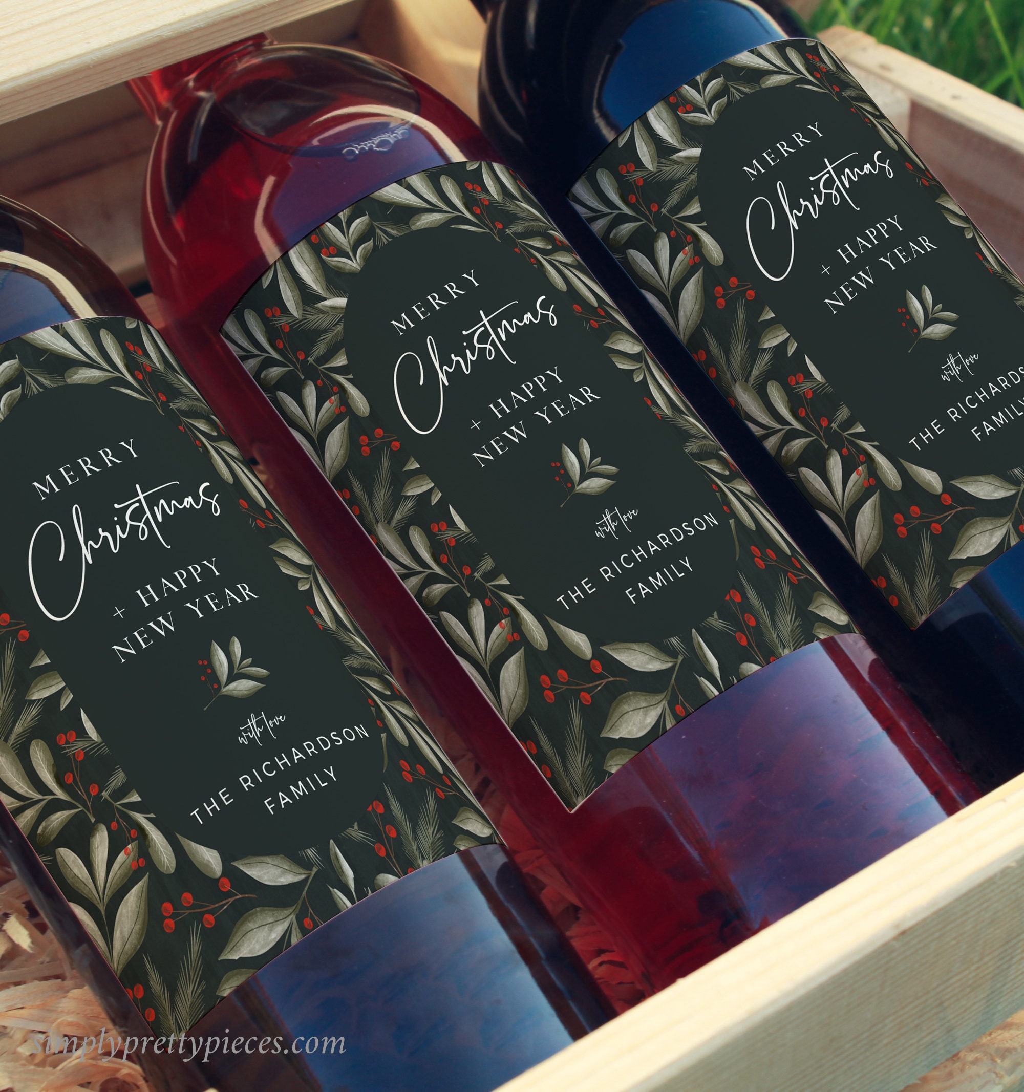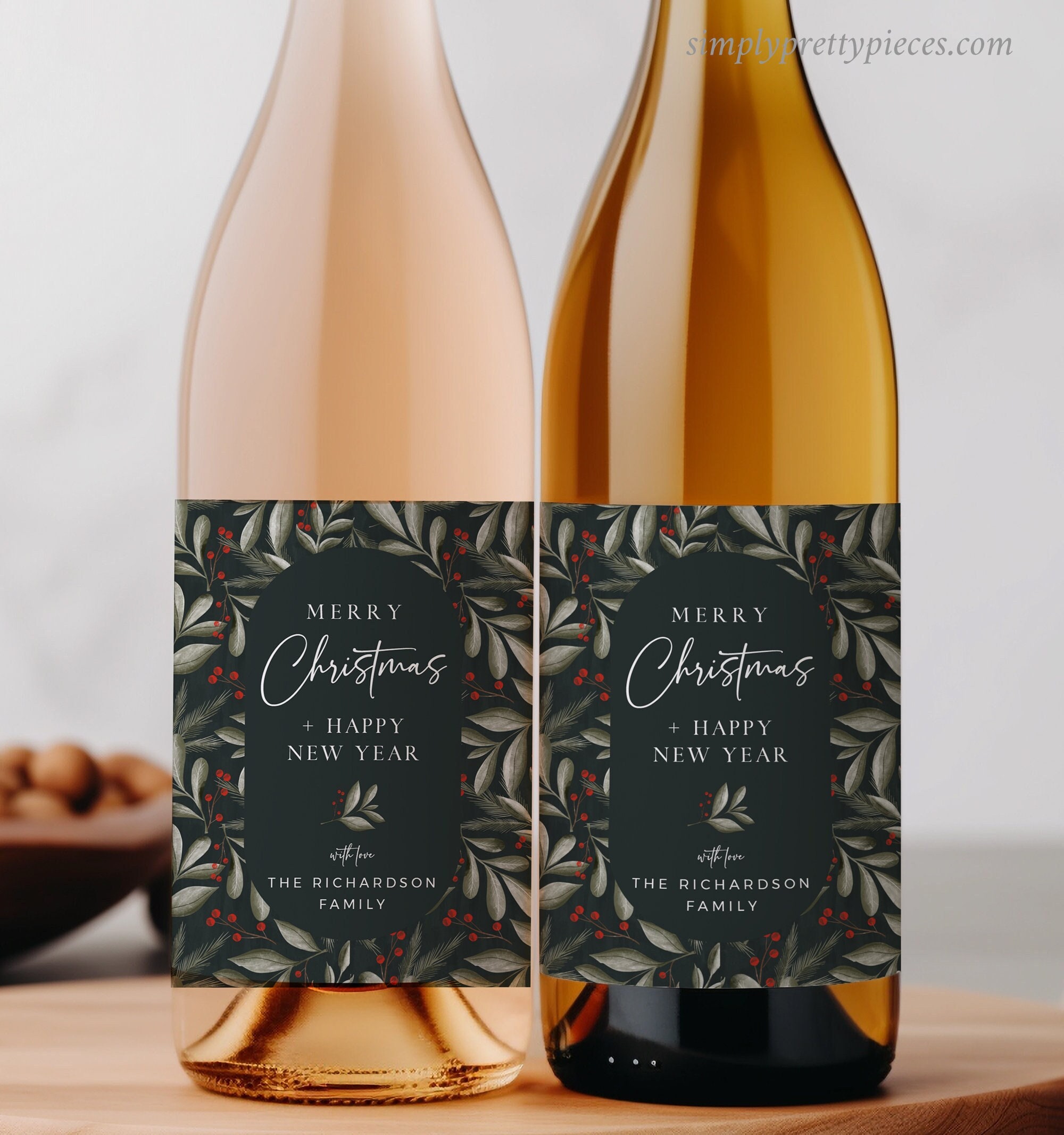 Editable wine bottle label template that has a modern scandi-inspired design, a festive green and red color palette and a modern font. It is easy to edit and print and you can create all the wine bottle labels you need. These can be use on a gift or they make perfect decor for a Christmas dinner party or other special event.