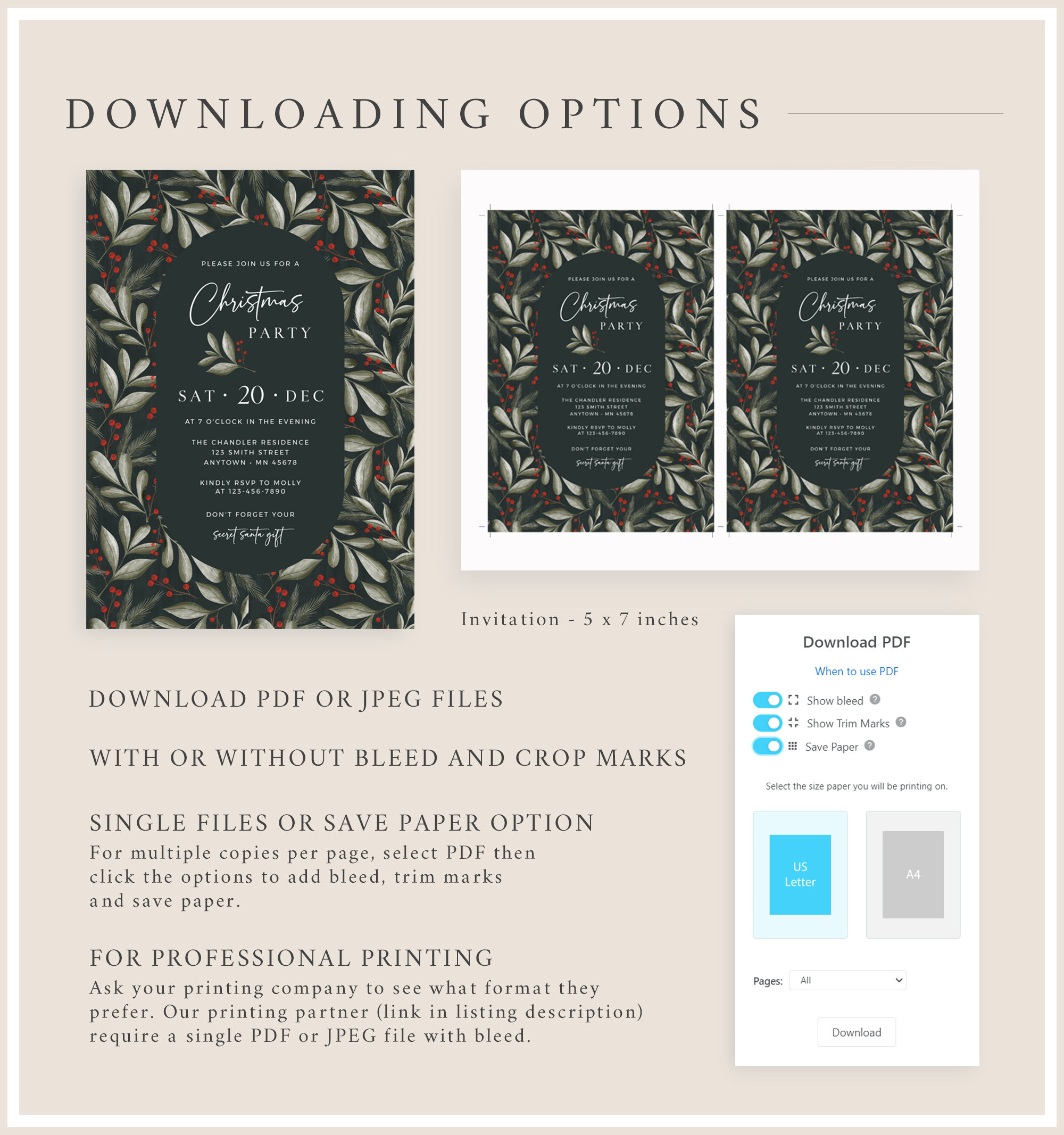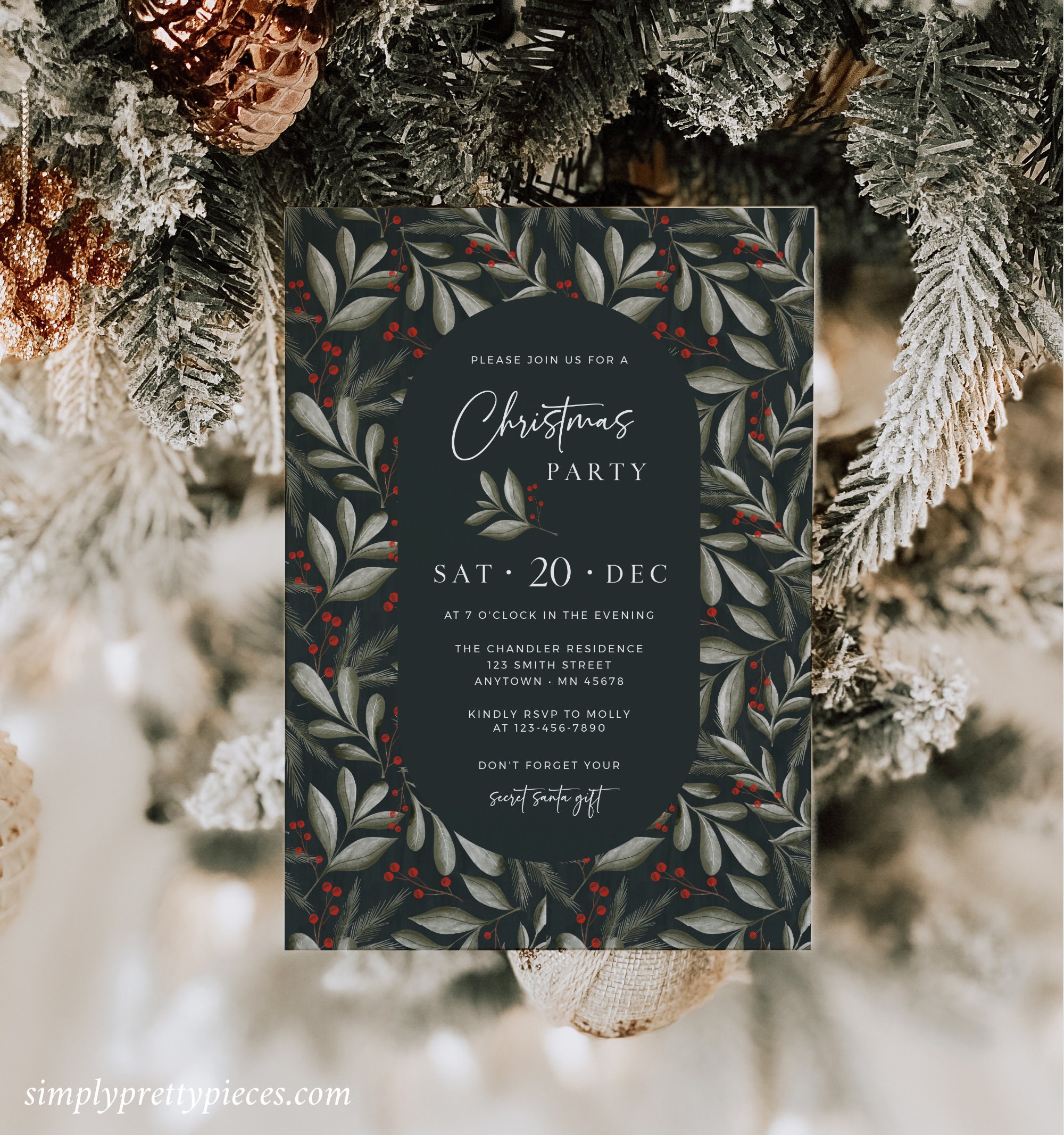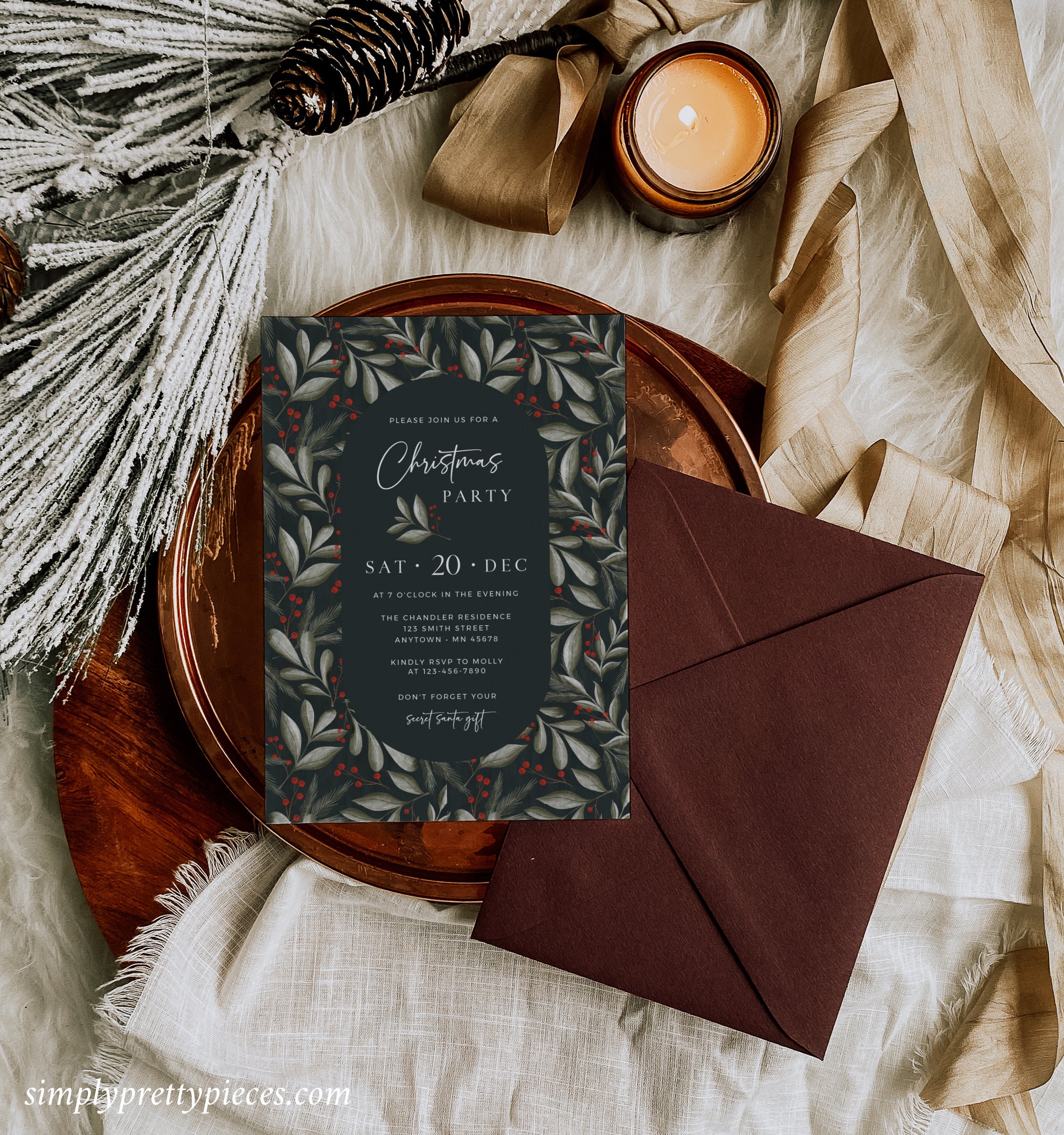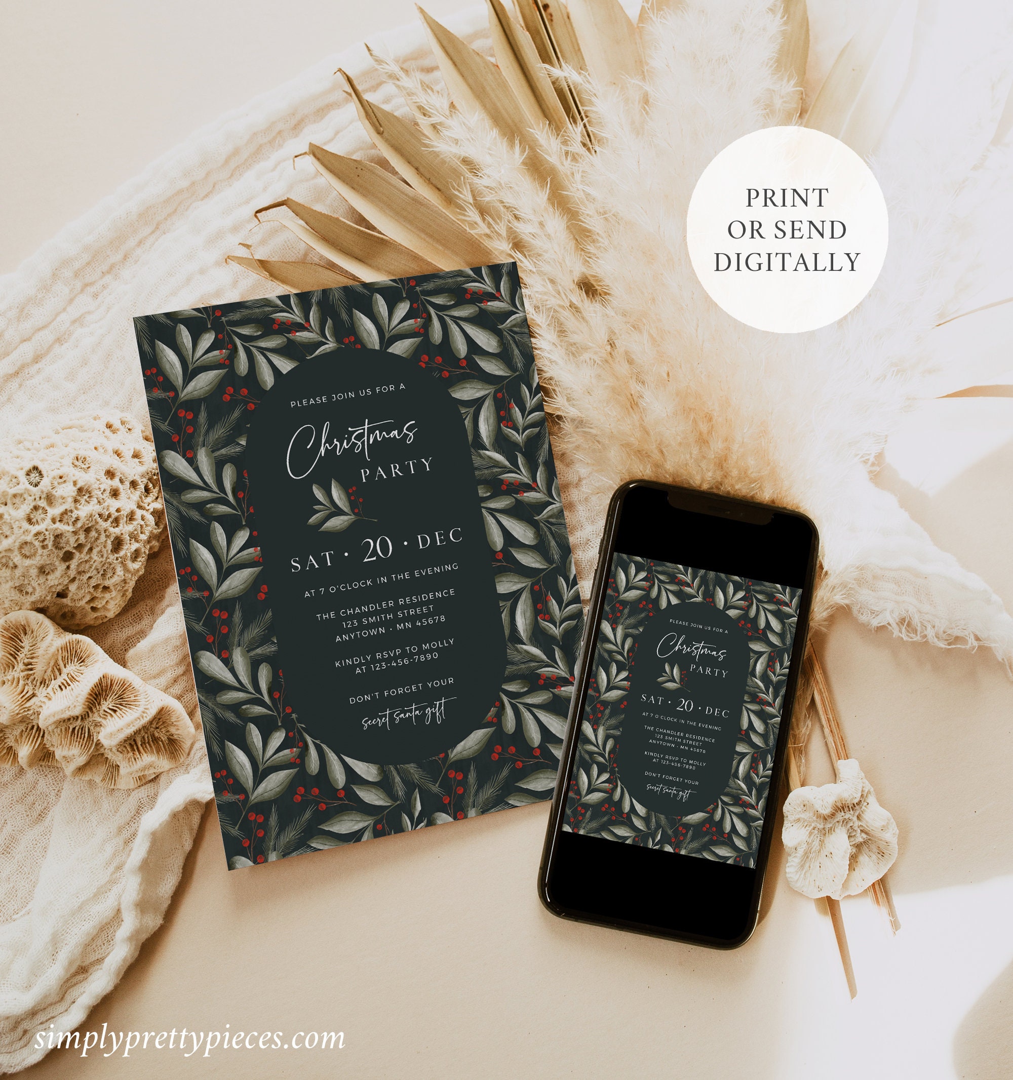 Printable Christmas party invitation template that has a modern scandi-inspired design, a festive red and green color palette and a modern font. This holiday party invite is easy to edit and print and is the perfect way to invite family and friends to a Christmas party or event.