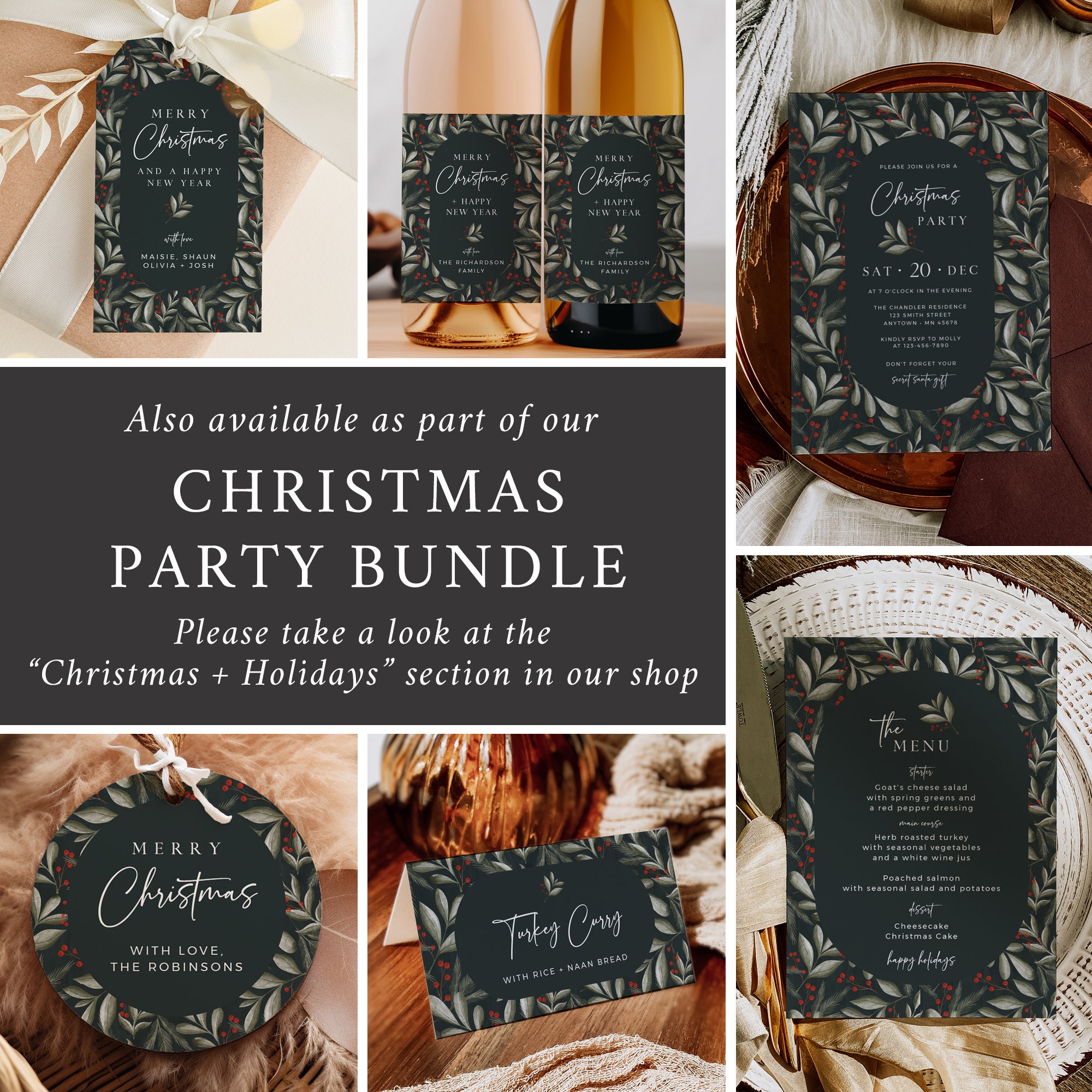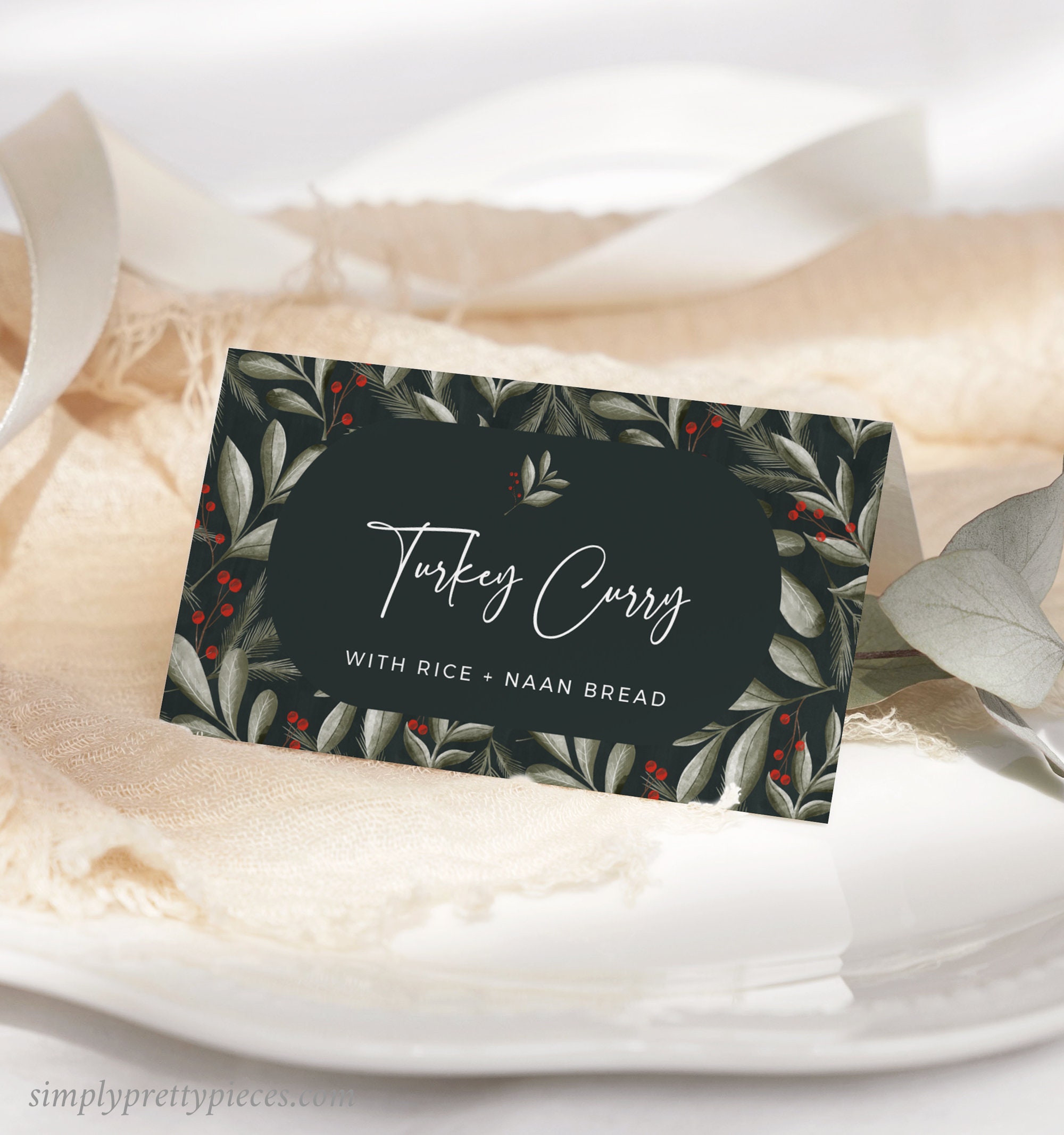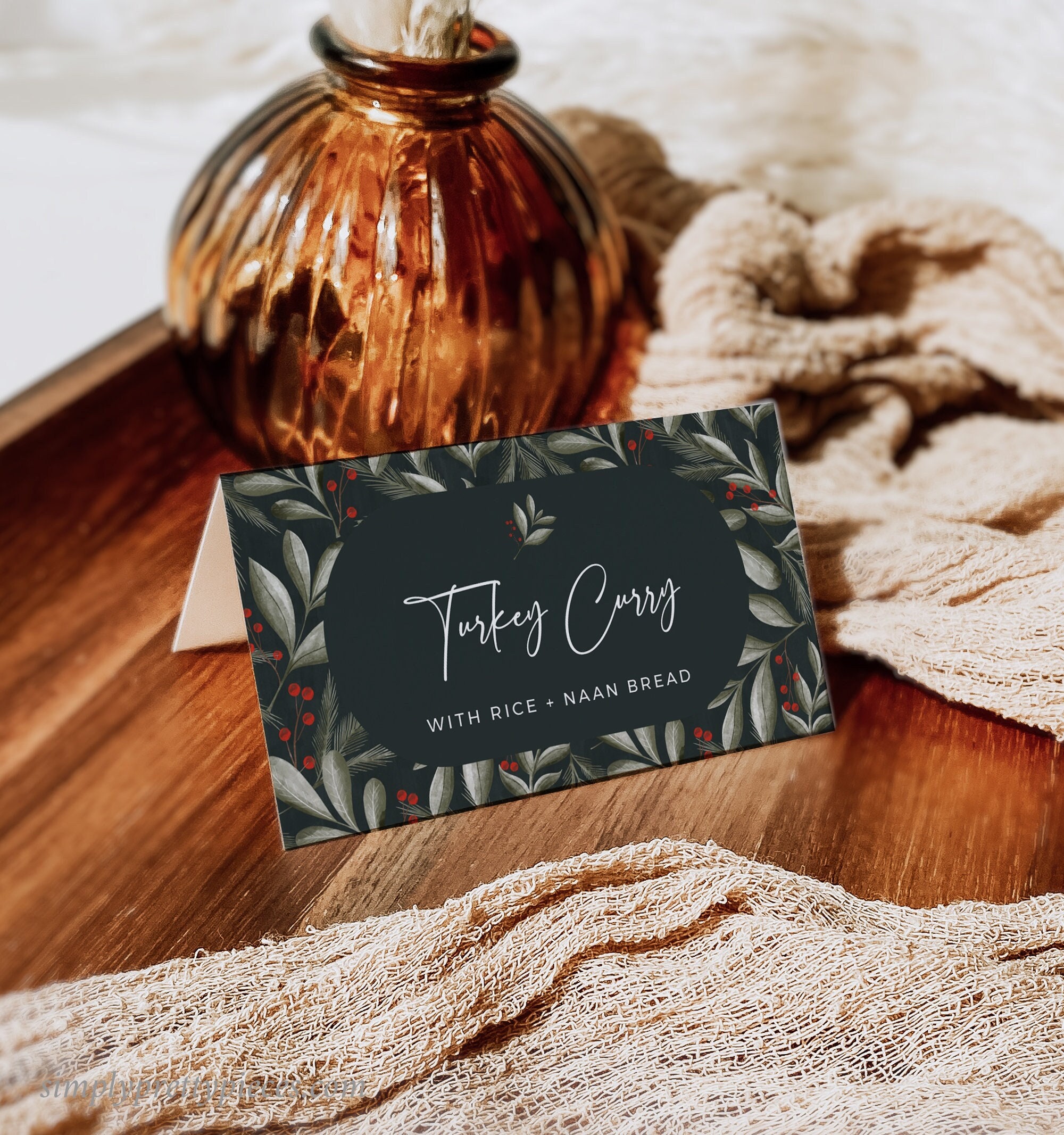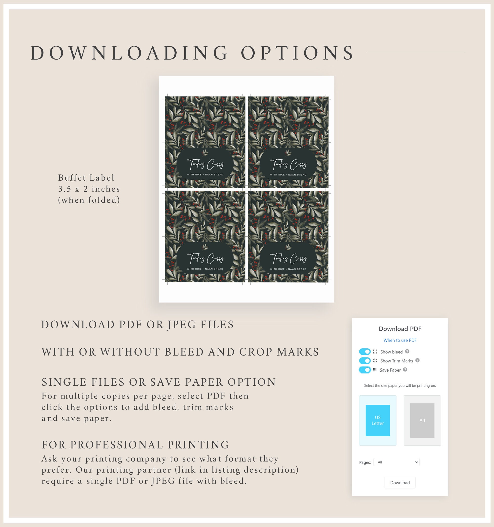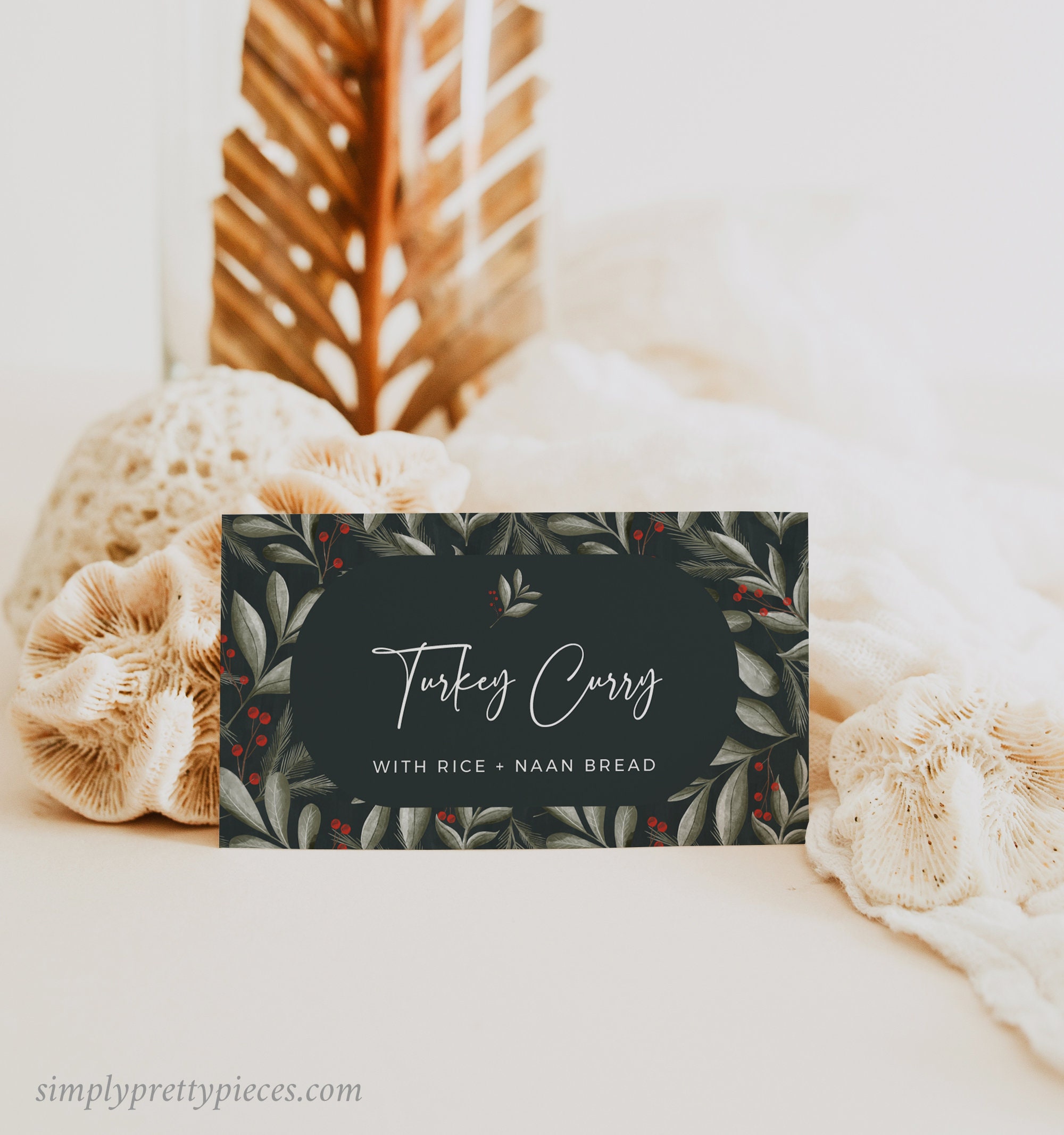 Printable buffet label template that has modern scandi-inspired graphics, a classic red and green color palette and a modern font. They can be used as food tent cards or place cards. They are easy to edit and print and you can make as many labels as you need. Simply print, trim and add to your buffet or table settings for the perfect finishing touch.