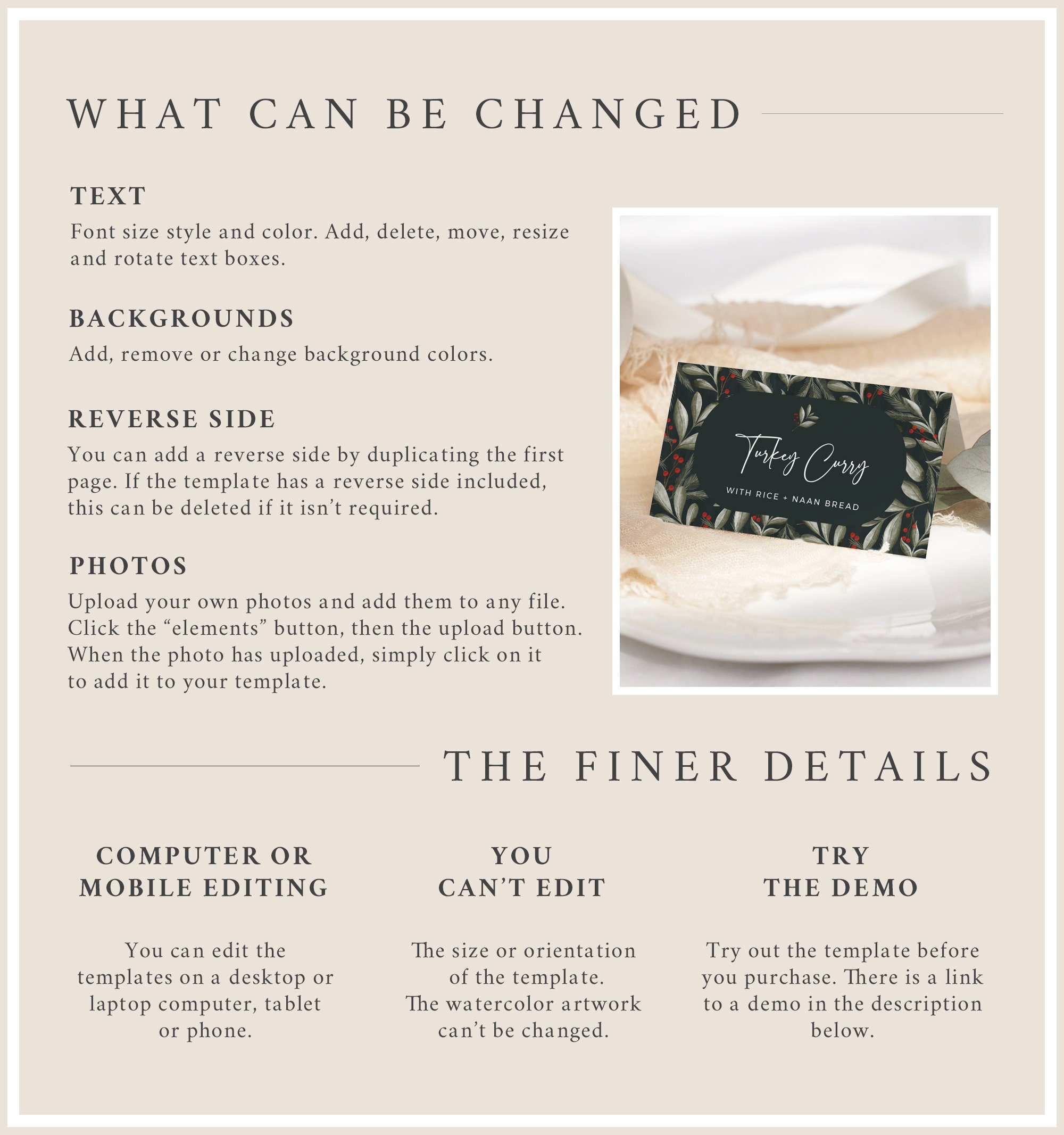 It can be fully edited using TEMPLETT which is a fully customizable template editor that allows you to quickly and easily customize digital templates. After your purchase you will get instant access to your template(s) via an emailed link. No software to install or fonts to download.