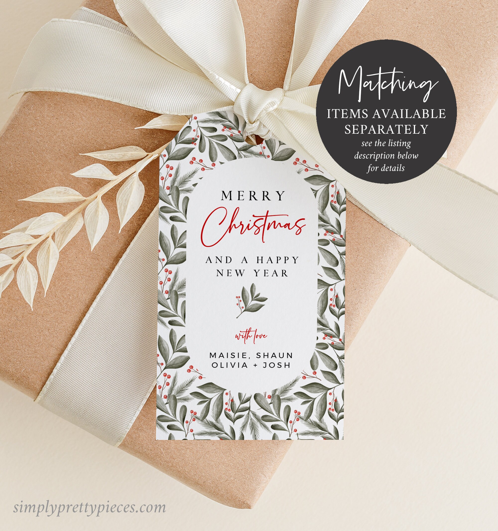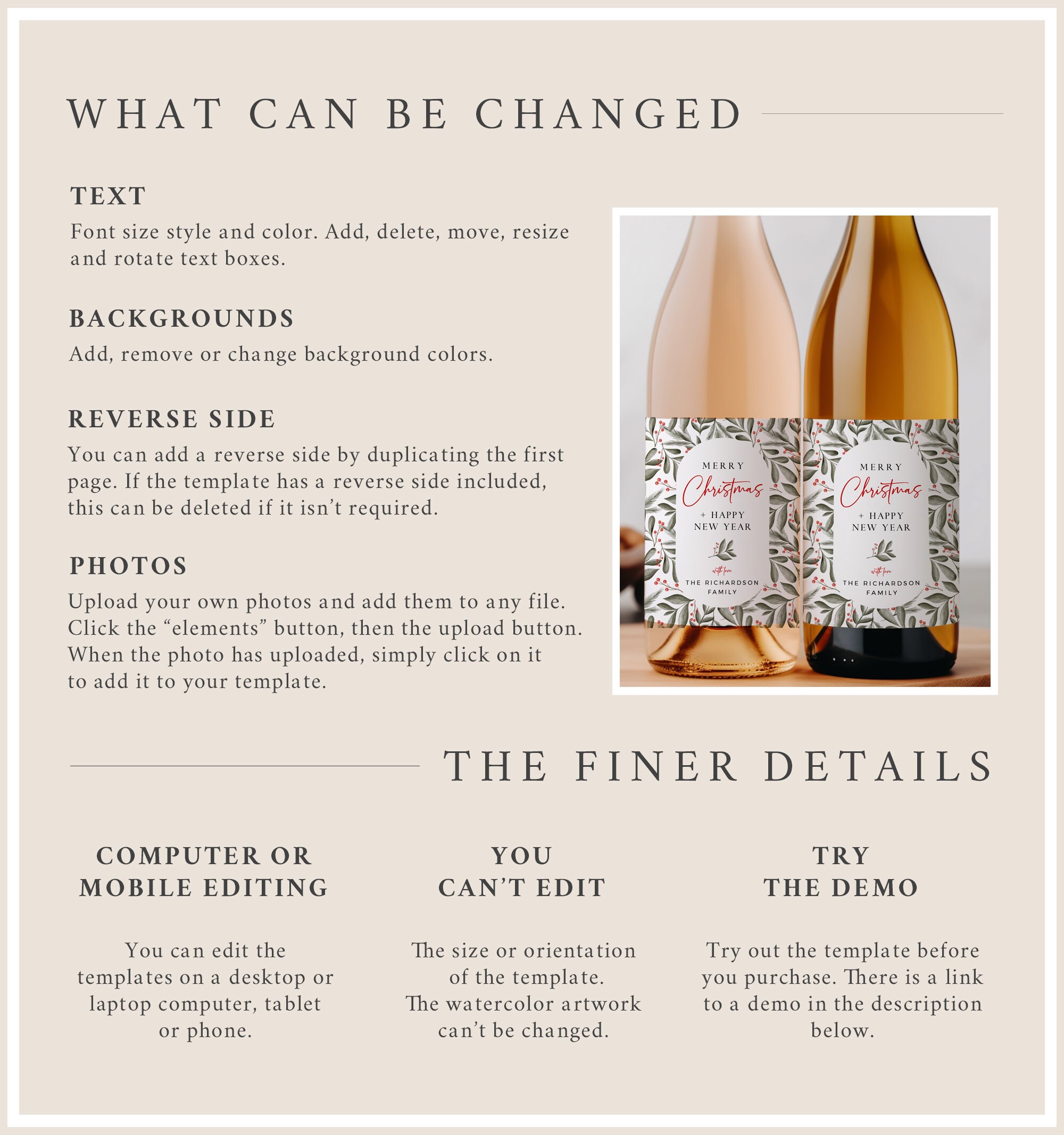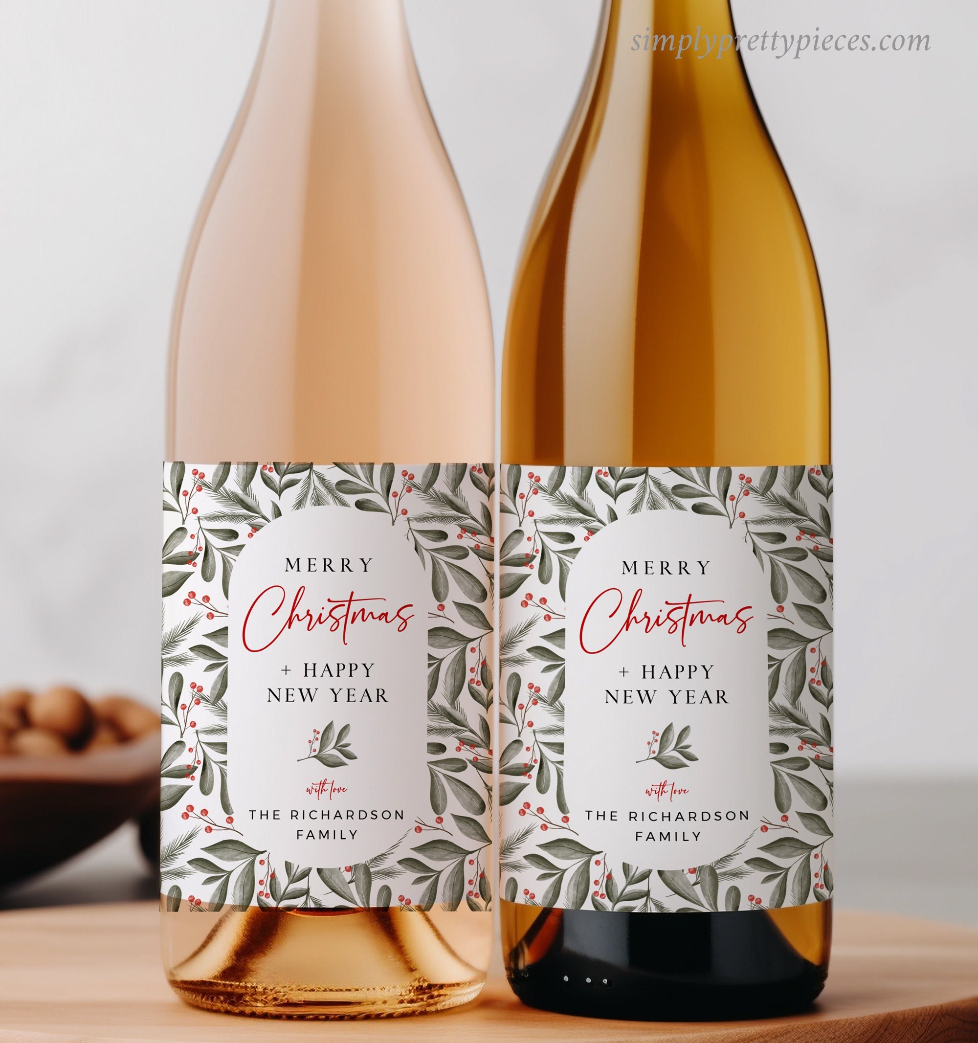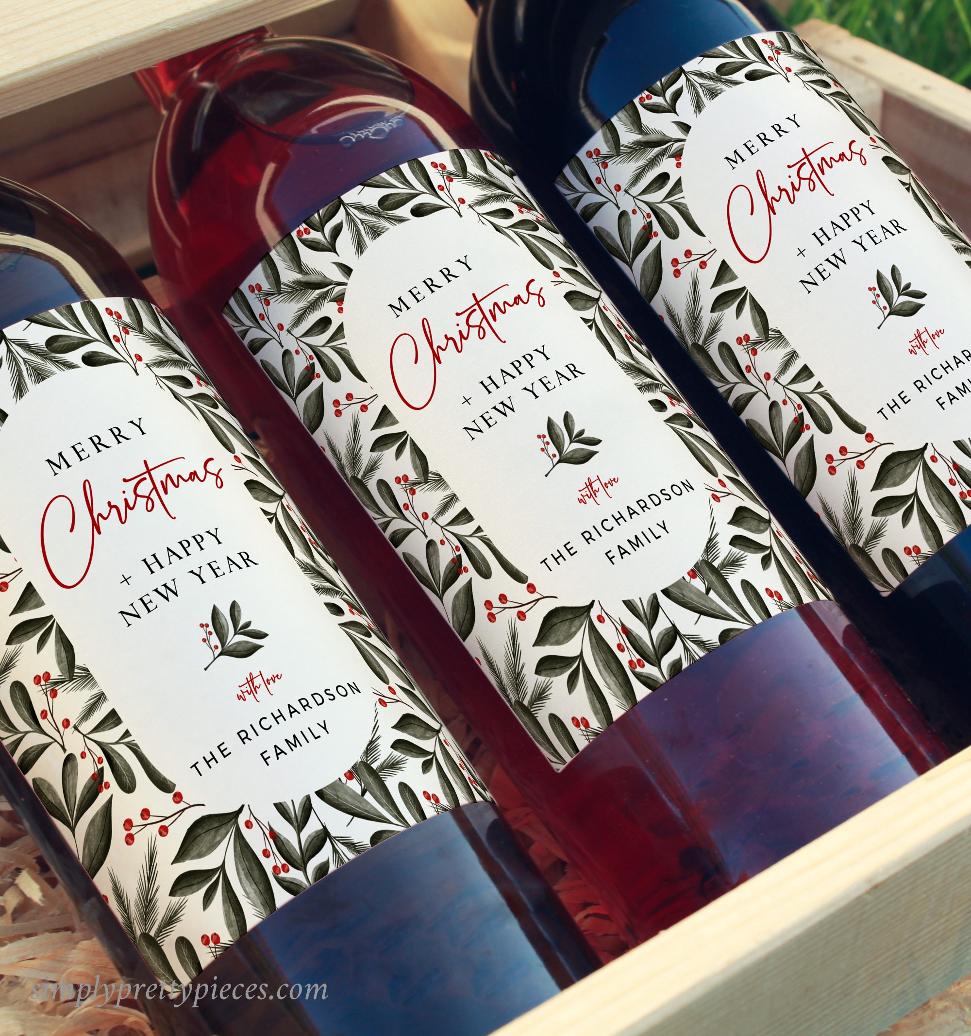 Printable wine bottle label template that has a modern Scandi-inspired design, a classic green and red color palette and a modern font. It is easy to edit and print and you can create all the wine bottle labels you need. These can be use on a gift or they make perfect decor for a Christmas dinner party or other special event.
