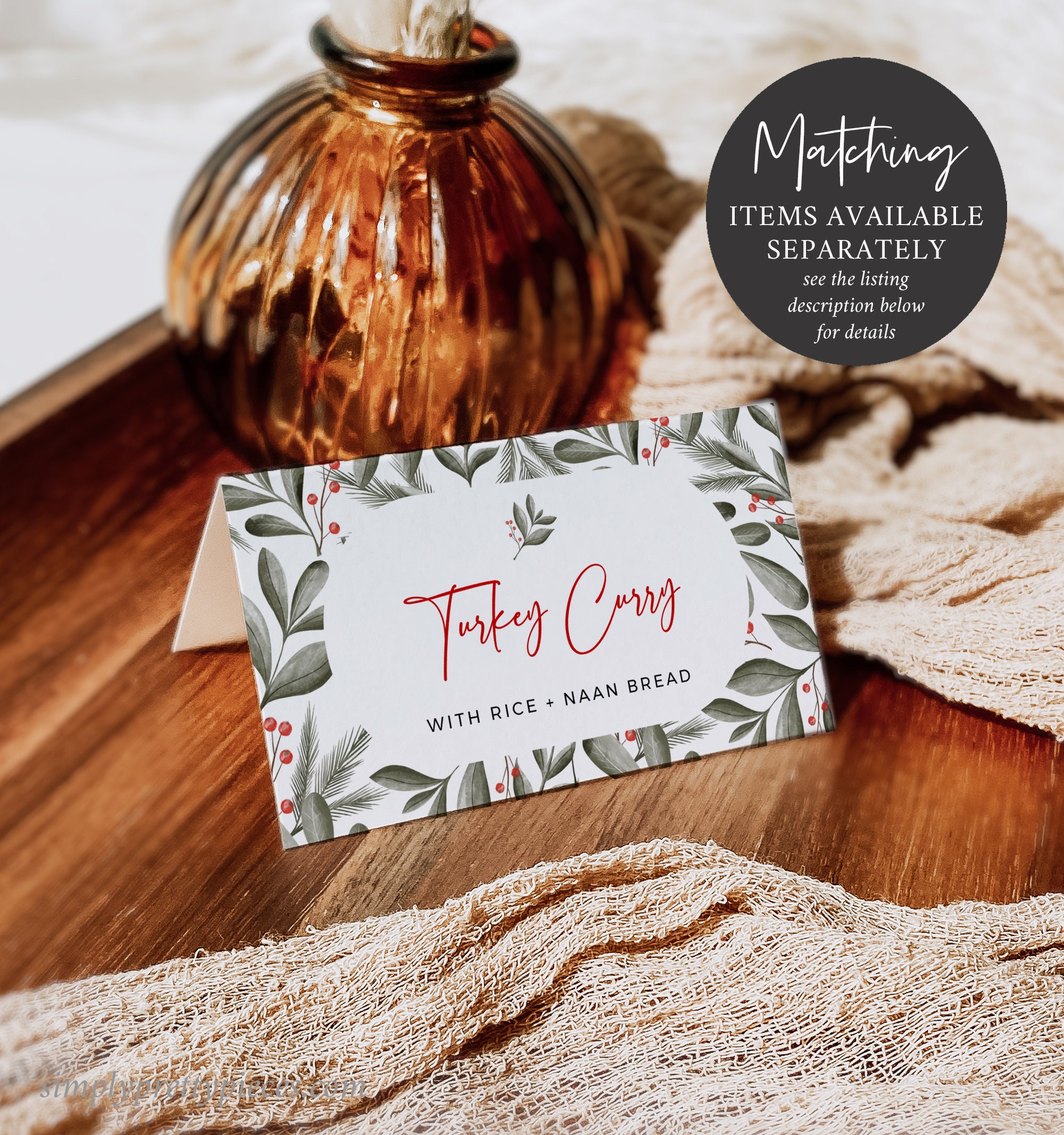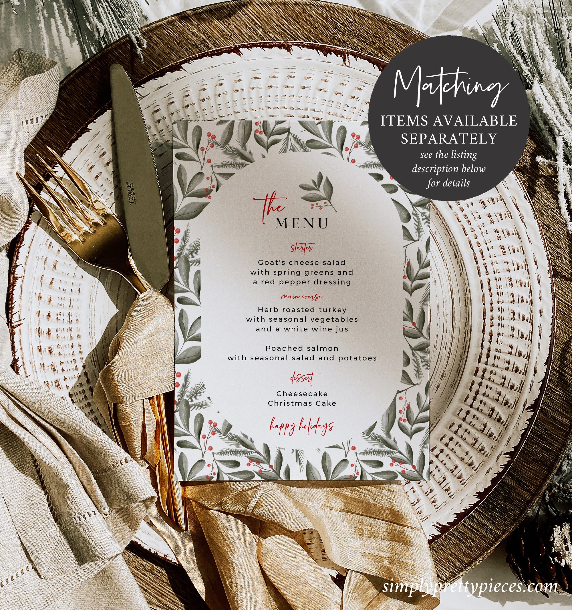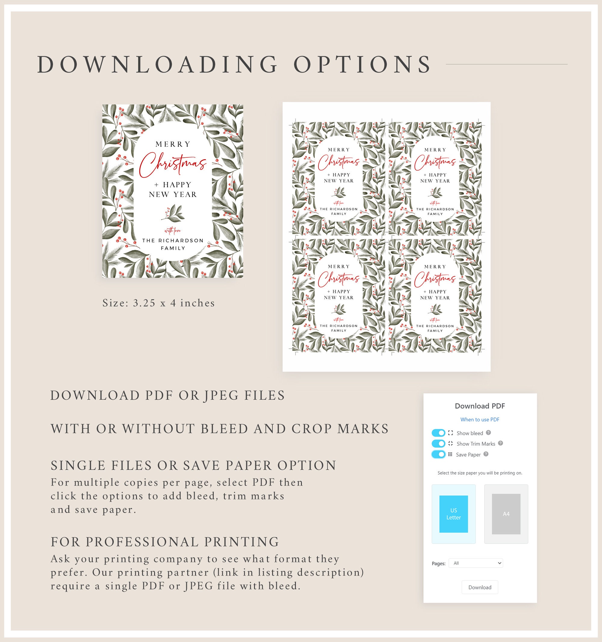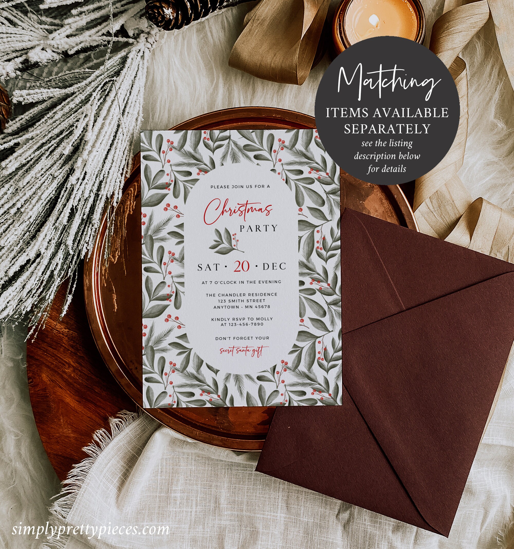 Printable wine bottle label template that has a modern Scandi-inspired design, a classic green and red color palette and a modern font. It is easy to edit and print and you can create all the wine bottle labels you need. These can be use on a gift or they make perfect decor for a Christmas dinner party or other special event.