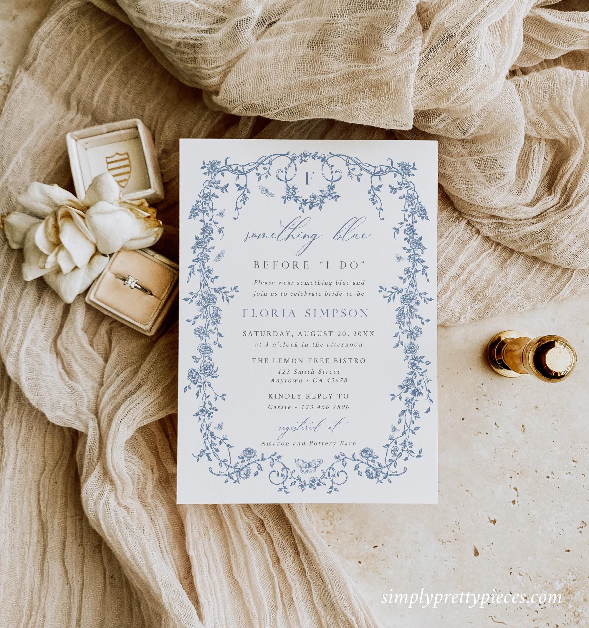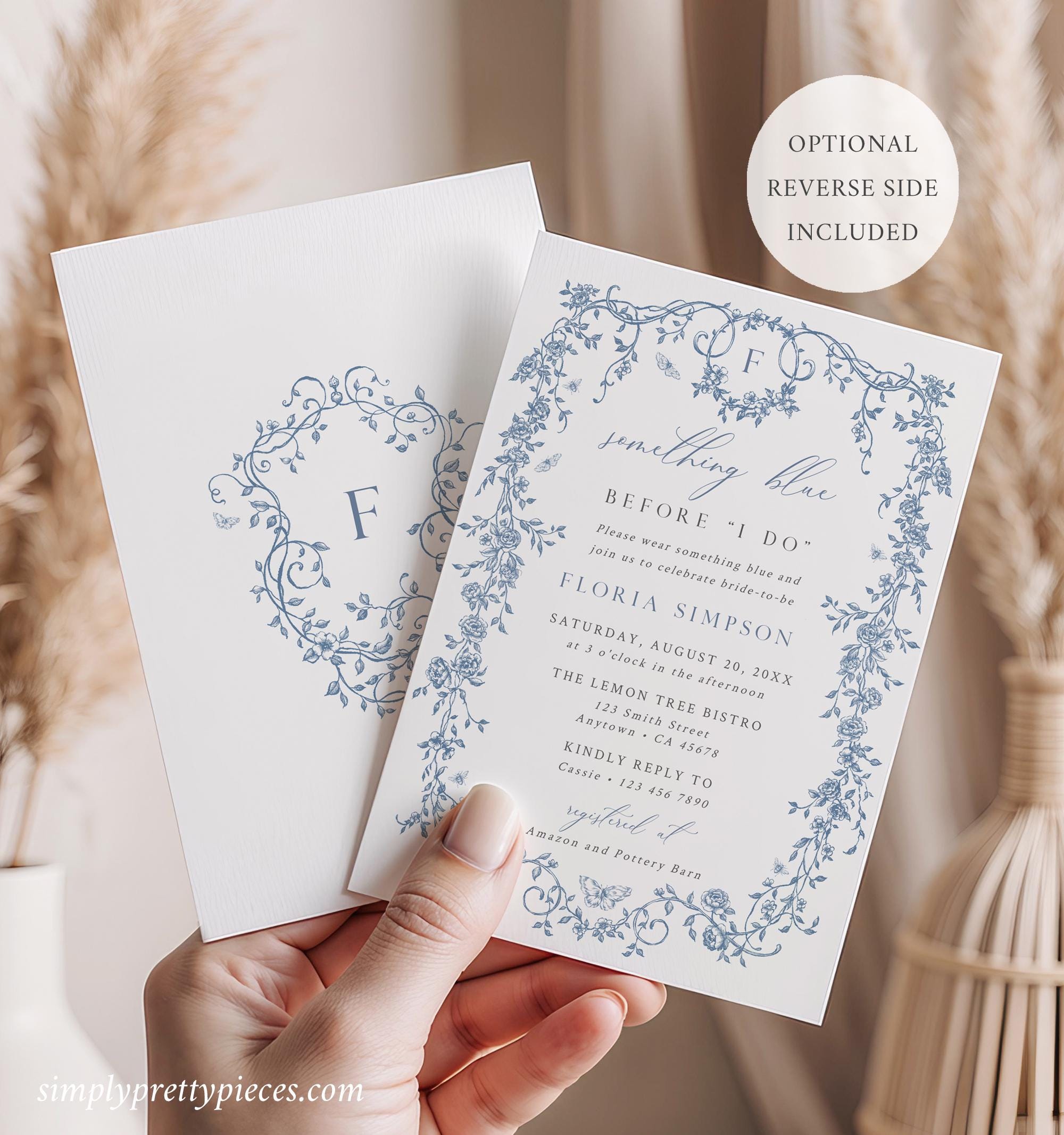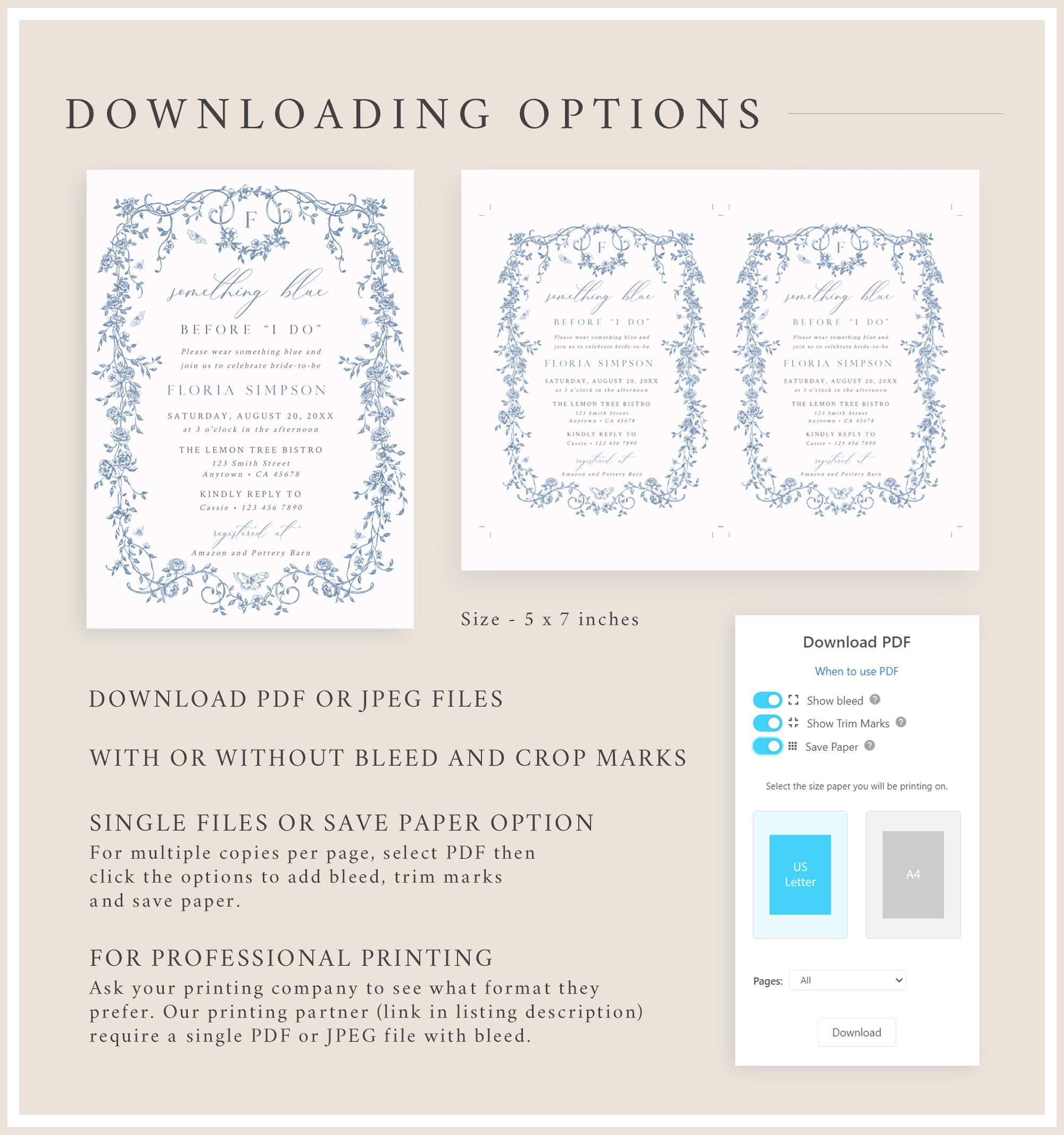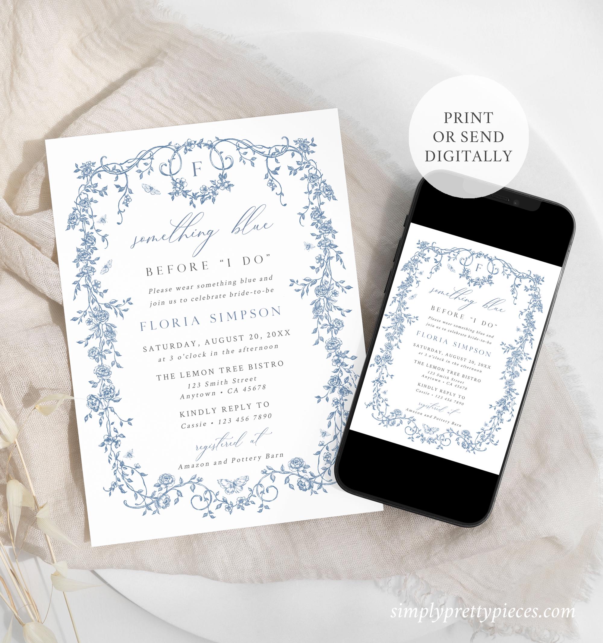 Printable Something Blue Before I do bridal shower invitation template that has a French toile de jouy design and an optional monogram reverse side. It has a dusty blue color palette and it is accented with a modern calligraphy font. Perfect for a chinoiserie themed bridal shower or event.