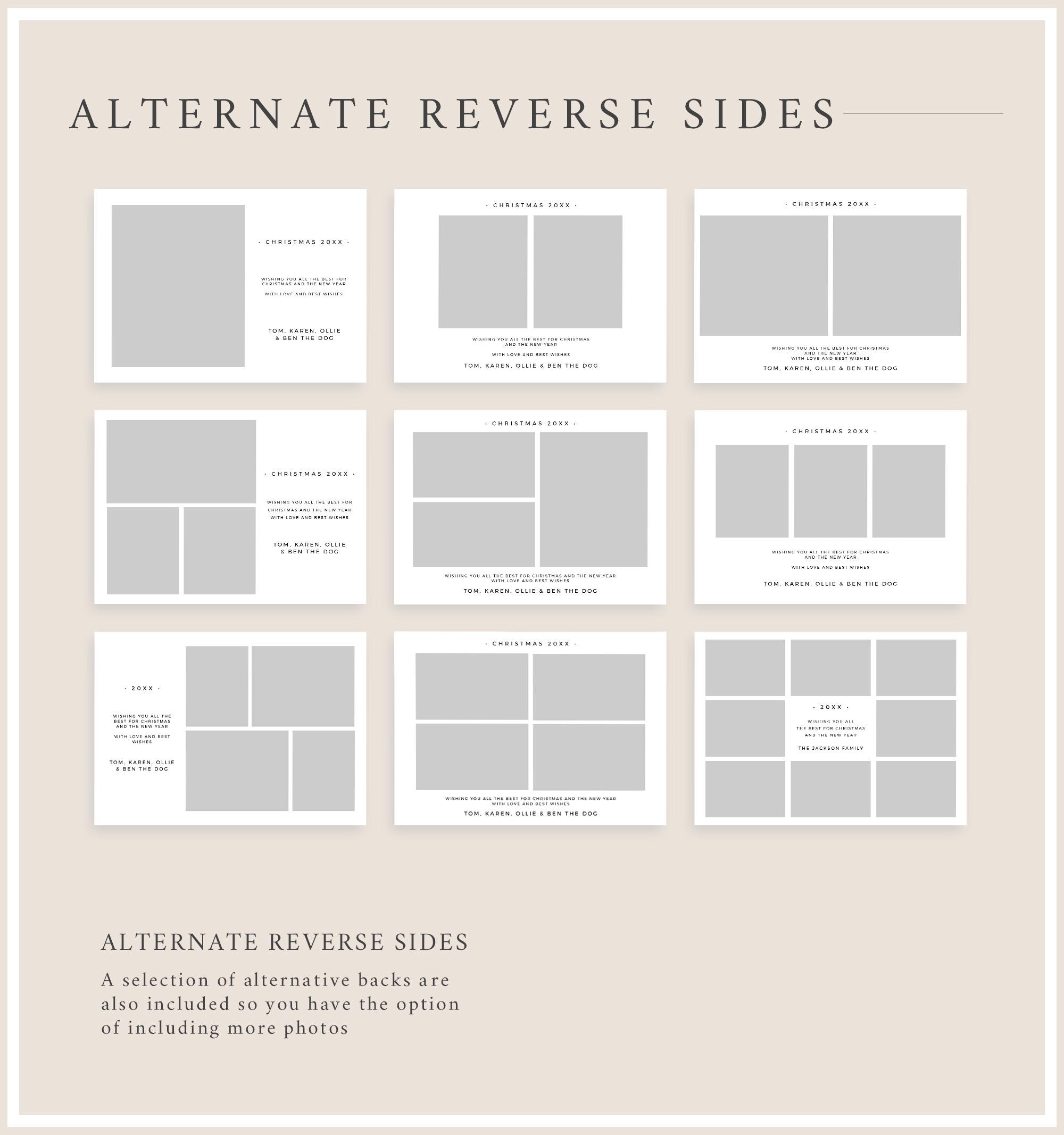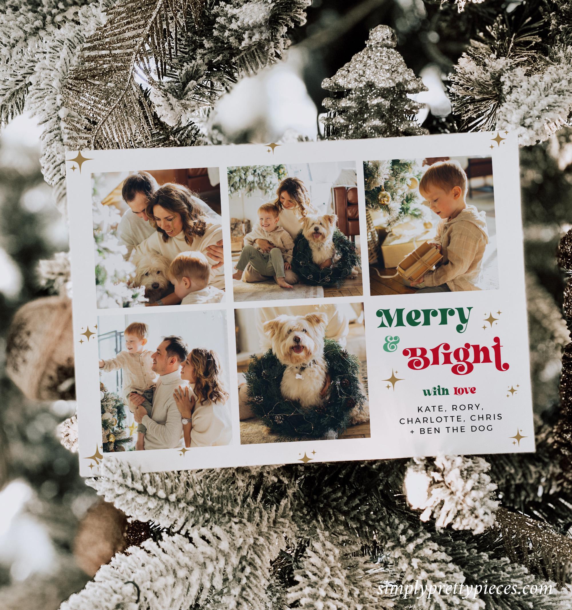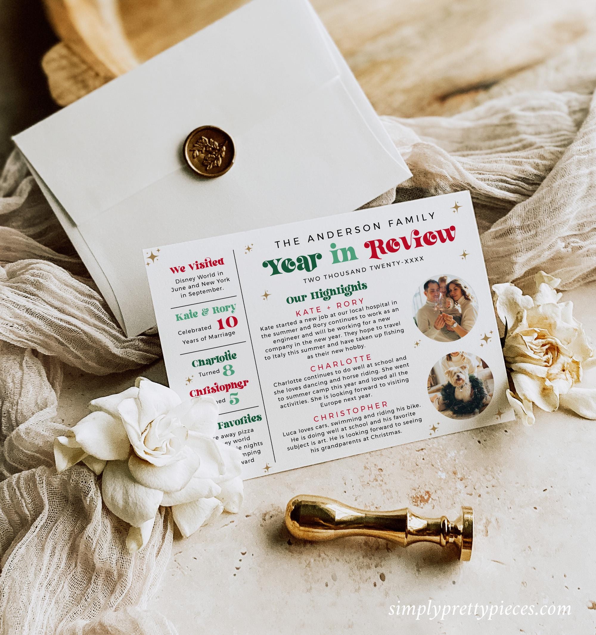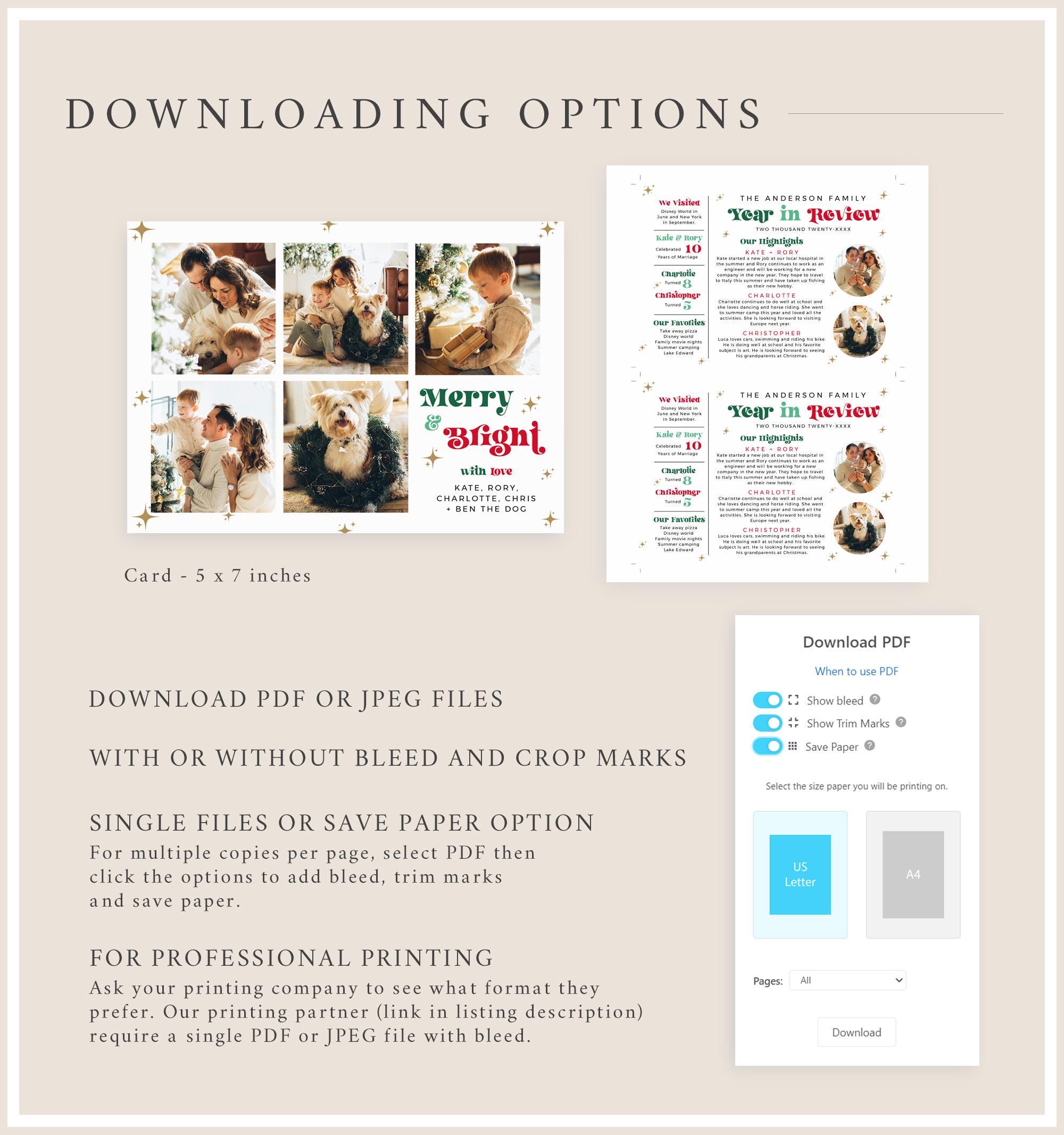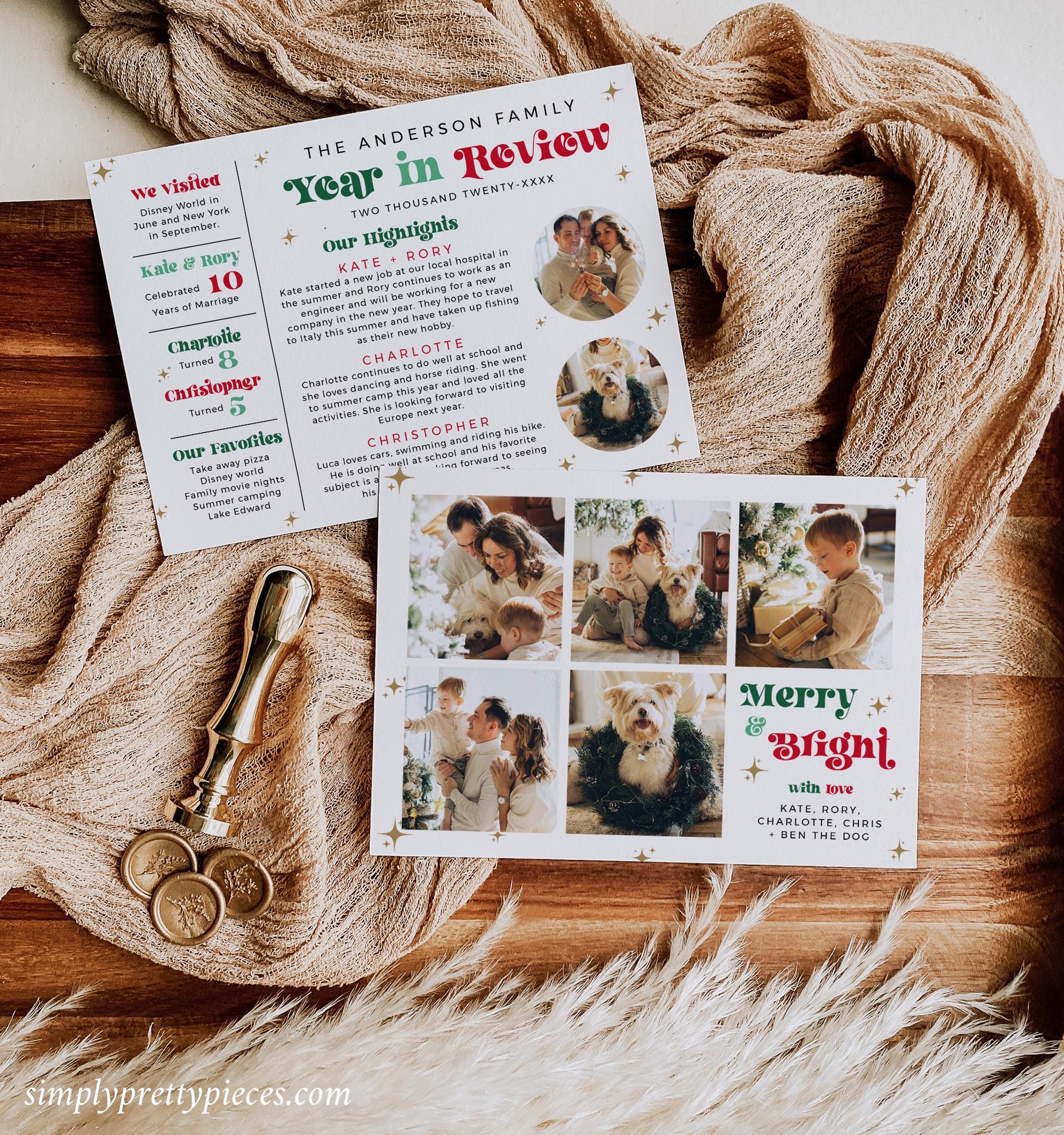 Printable boho year in review template in horizontal format that has a modern design, a red green and gold color palette and a retro font. There is space for five photos on the front and two on the reverse. A template with additional photo front sides is also included so you have other layout options. This overview of the year card is easy to edit and print and is the perfect way to send your Christmas wishes to family and friends.