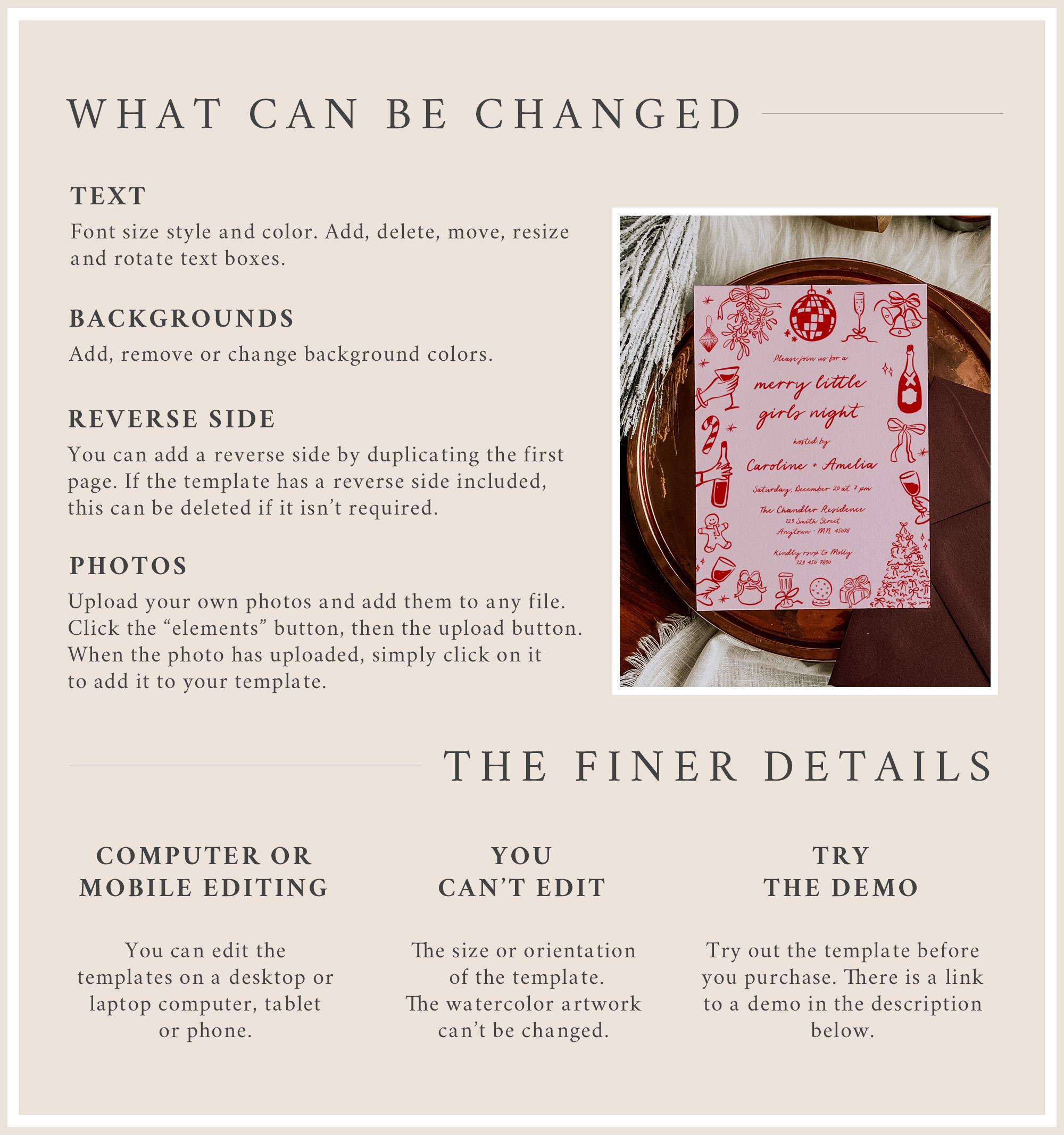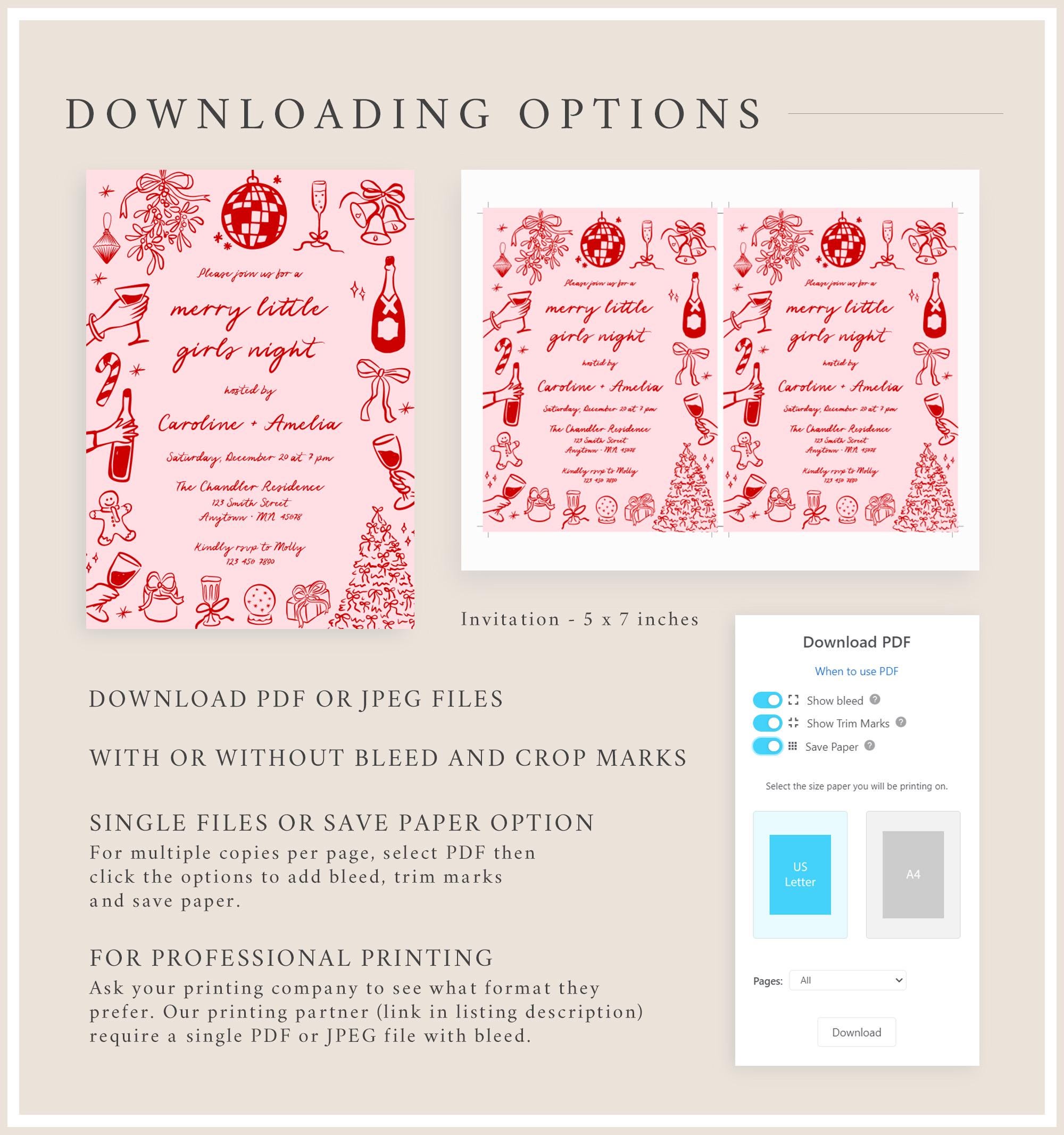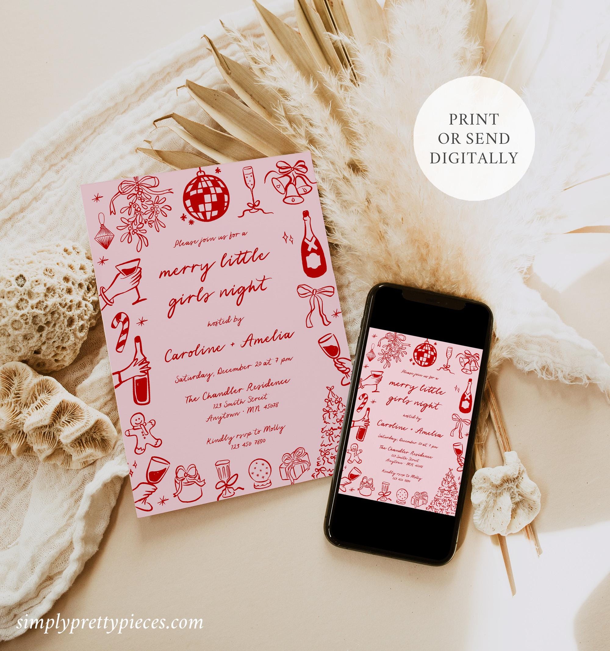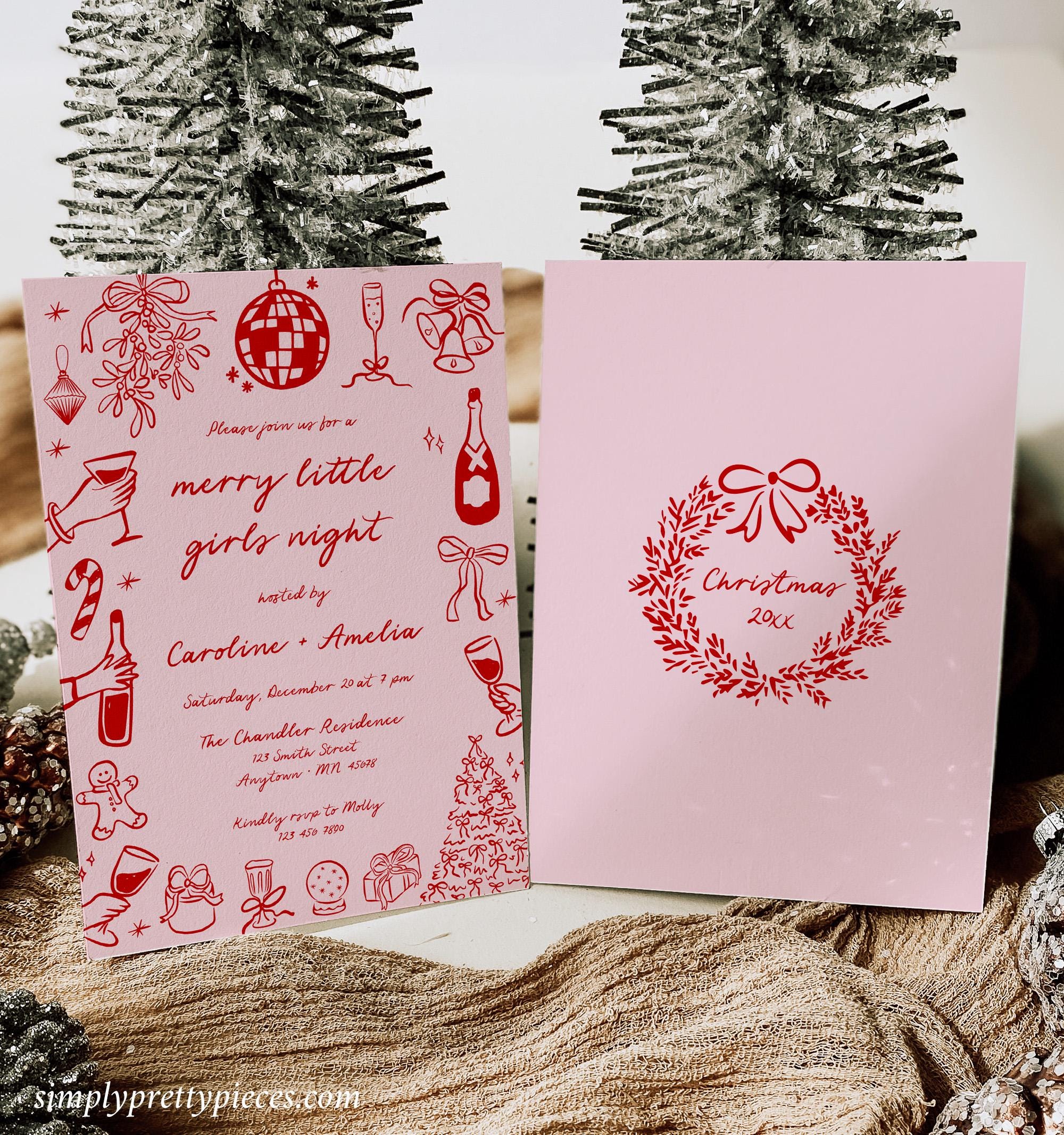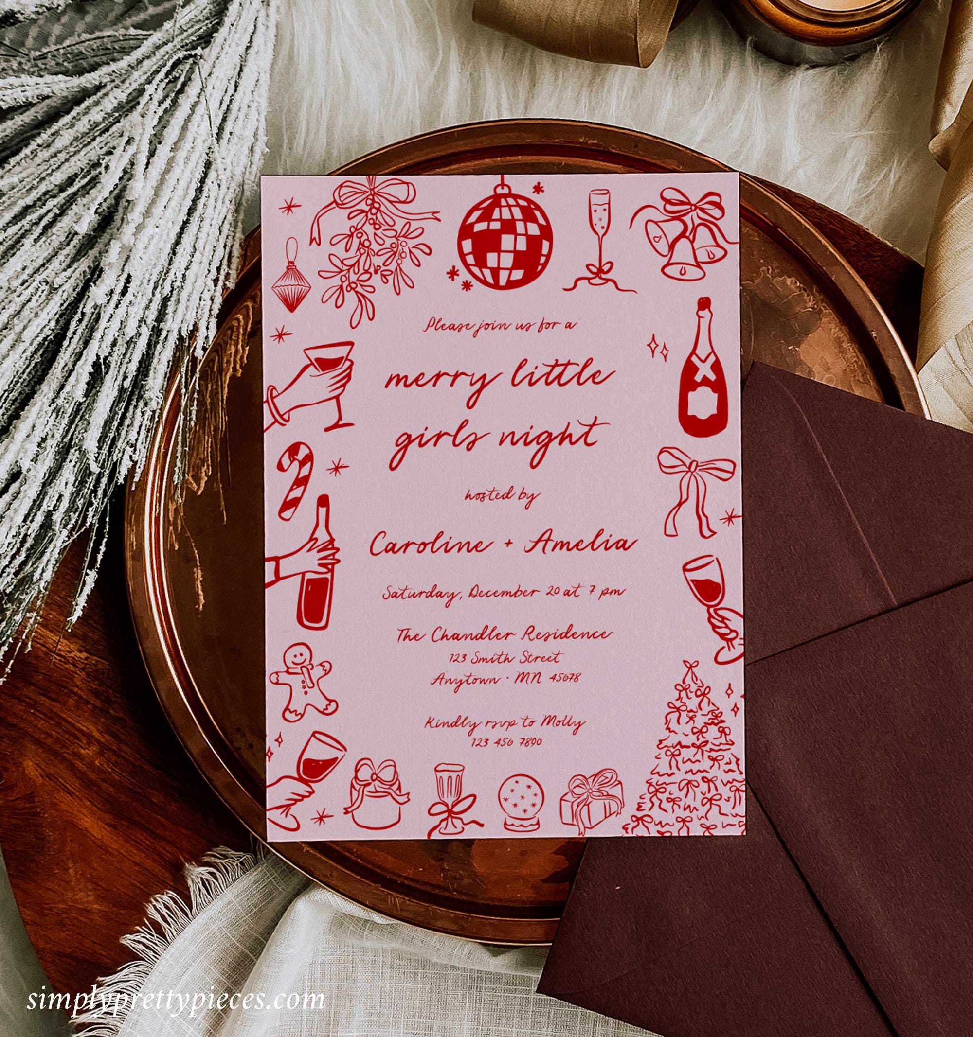 Printable quirky merry little girls night invitation template that has a fun hand drawn illustrations, a red and pink color palette and a hand written font. This holiday party invite is easy to edit and print and is the perfect way to invite family and friends to a Christmas party or event.
