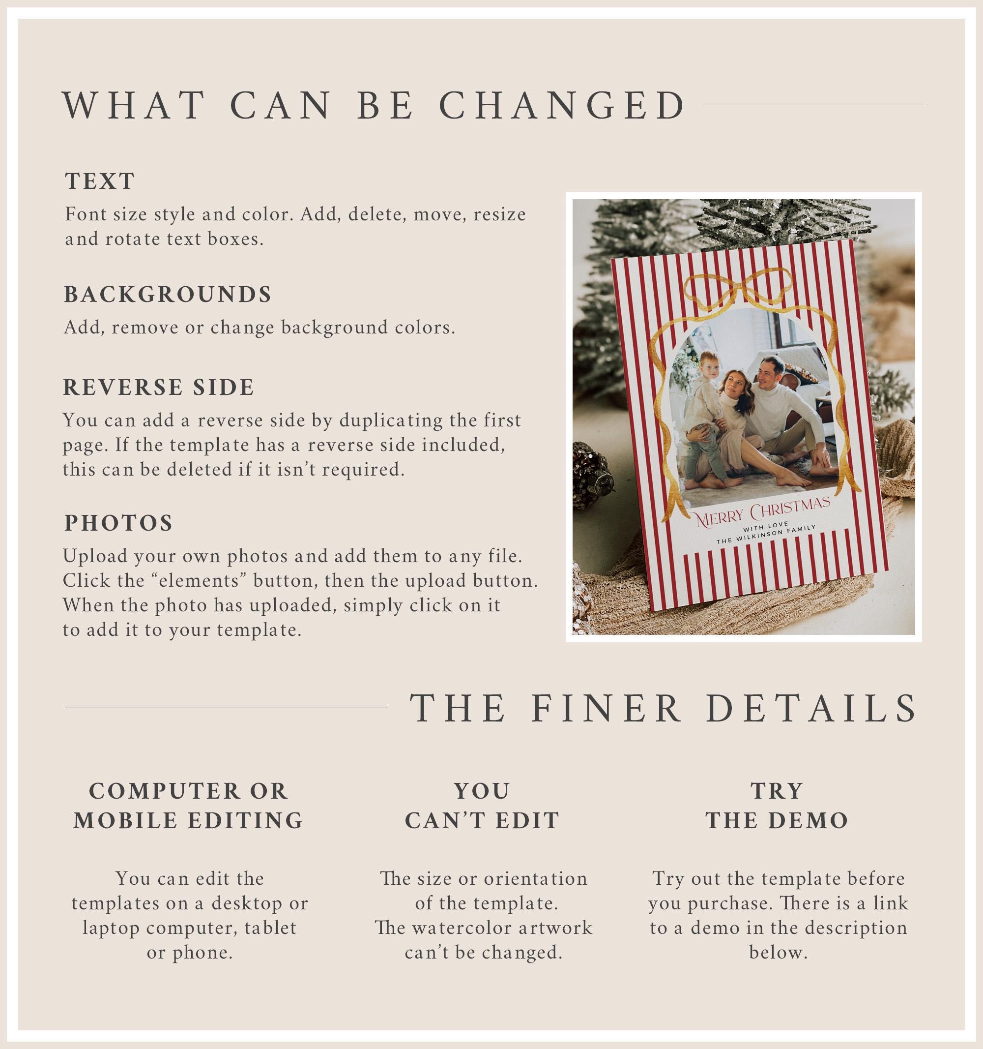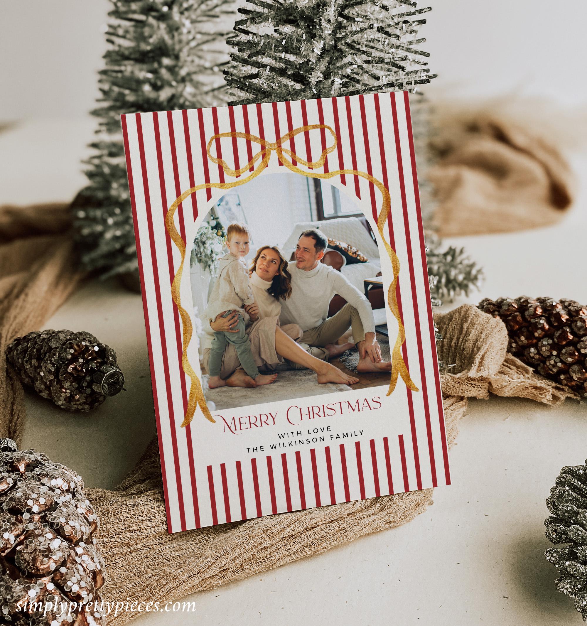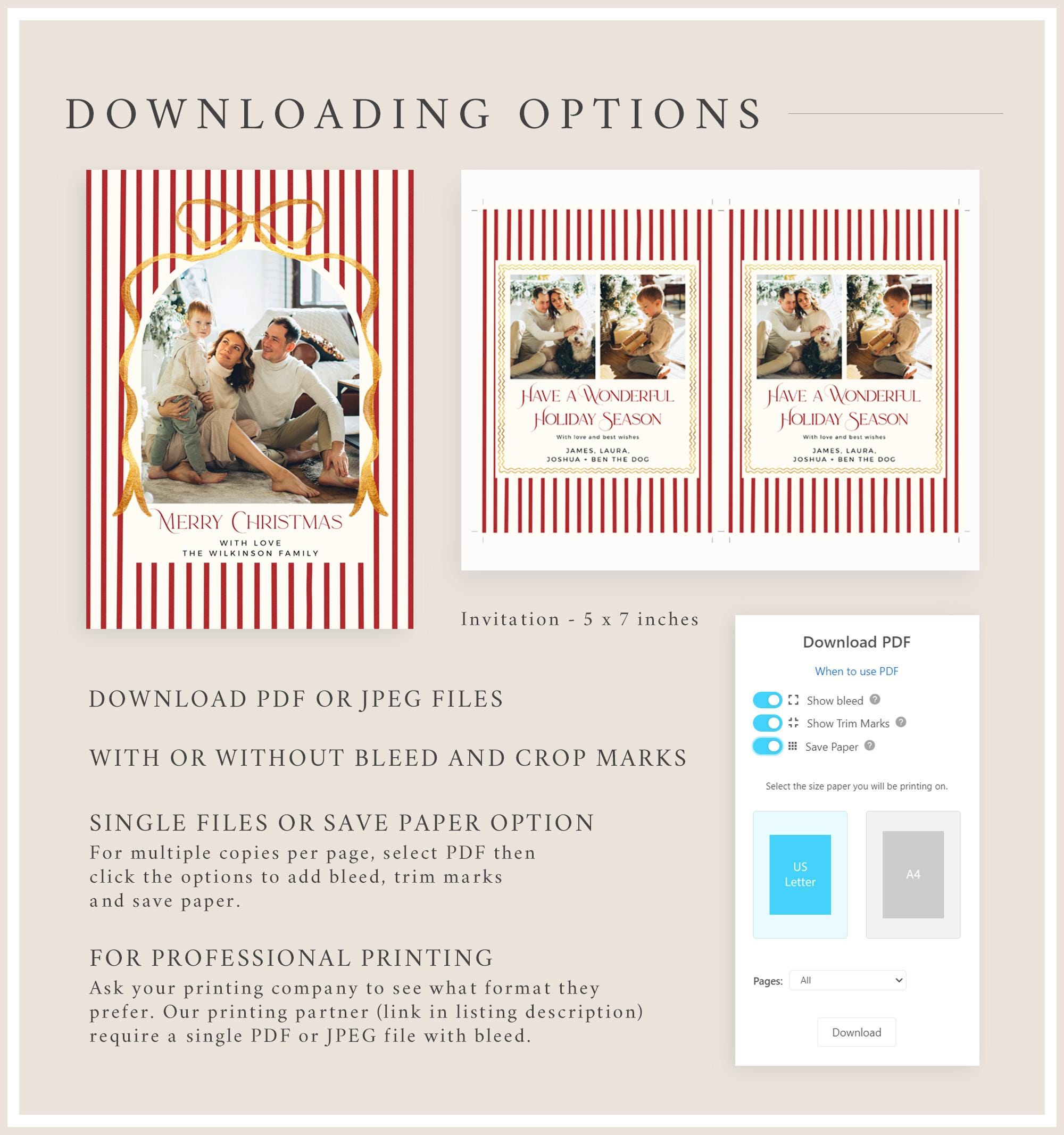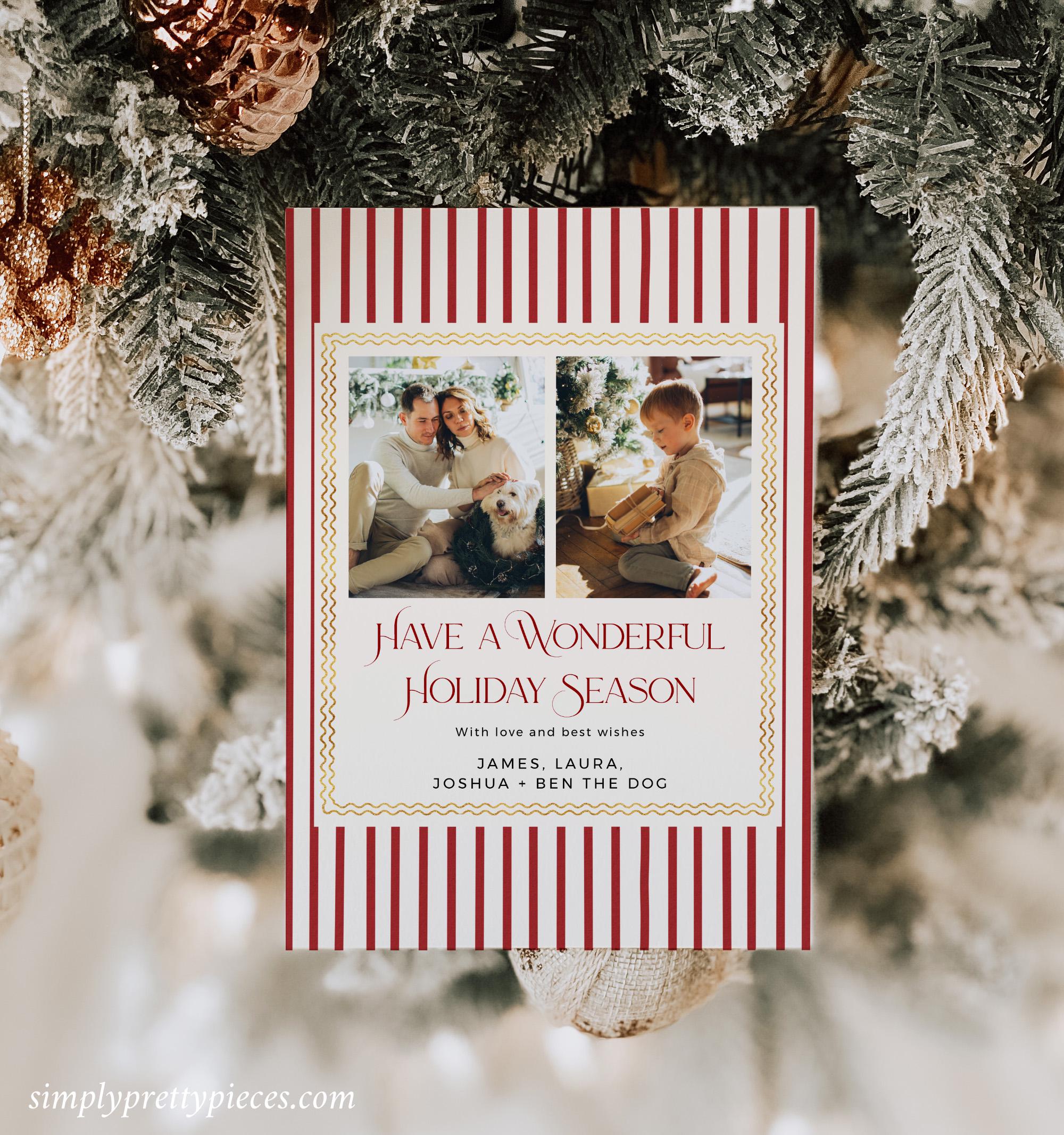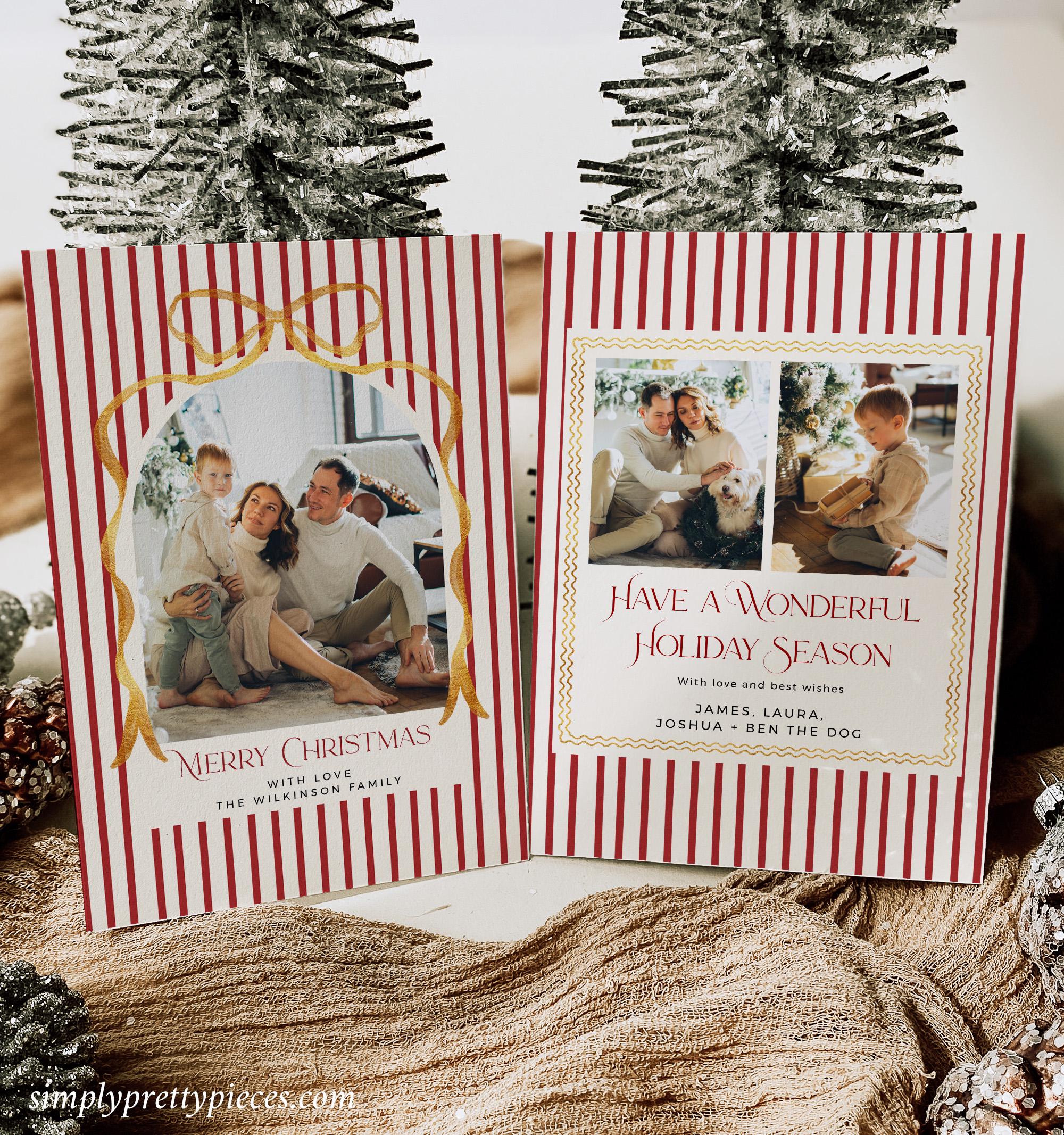 Printable holiday card template that has a vintage stripe design, a muted red and gold color palette and a modern font. There is space for one photo on the front and two on the reverse. A template with additional photo reverse sides is also included so you have other layout options. This stylish Christmas card is easy to edit and print and is the perfect way to send out holiday wishes to your family and friends.