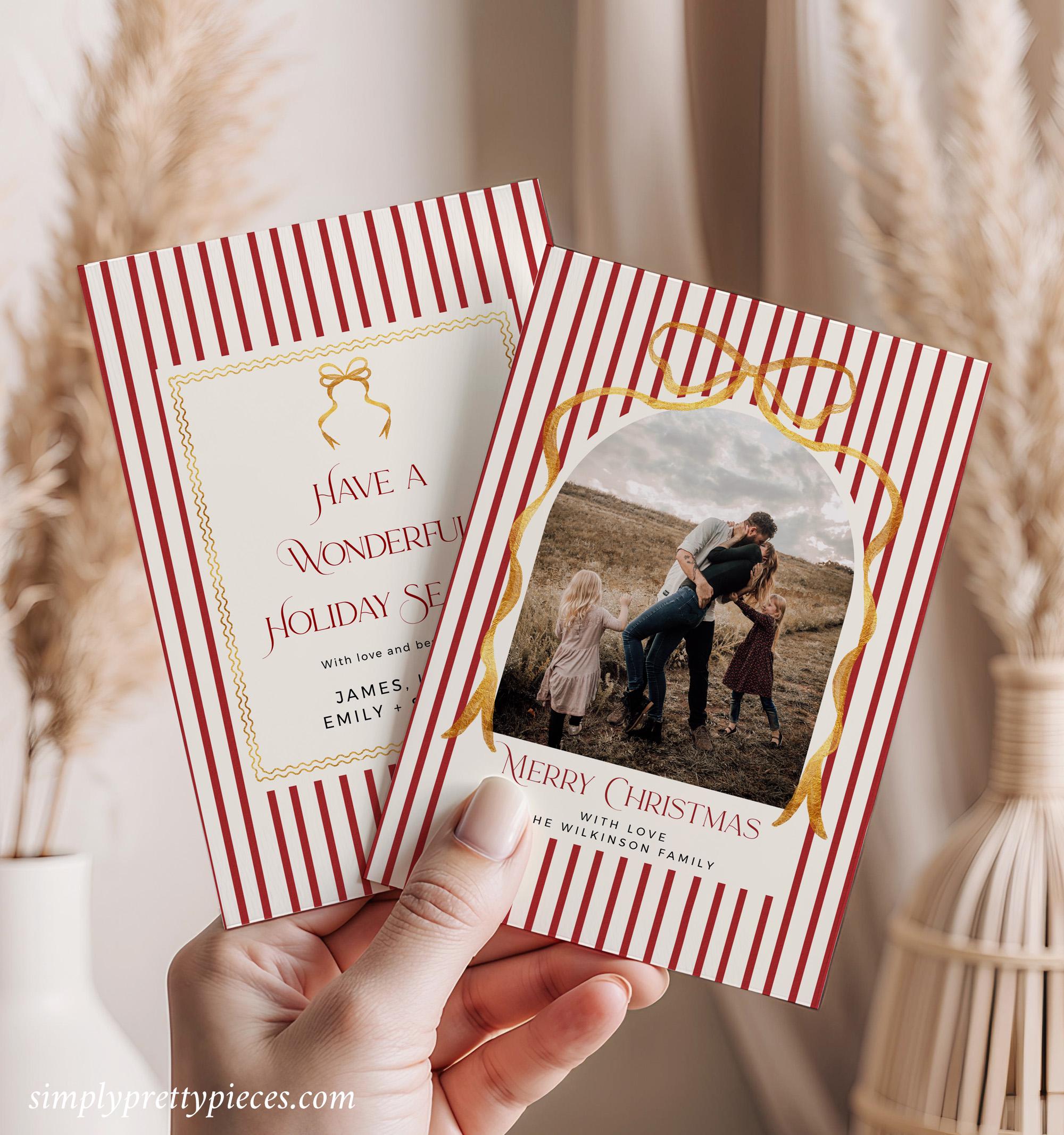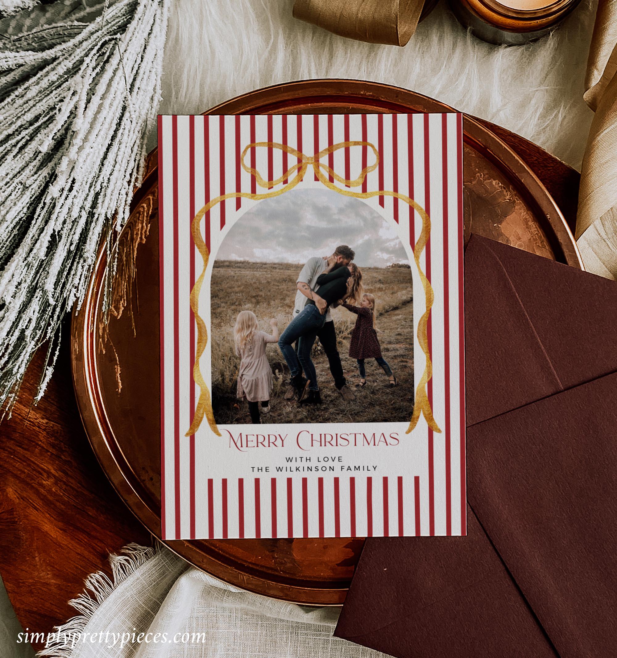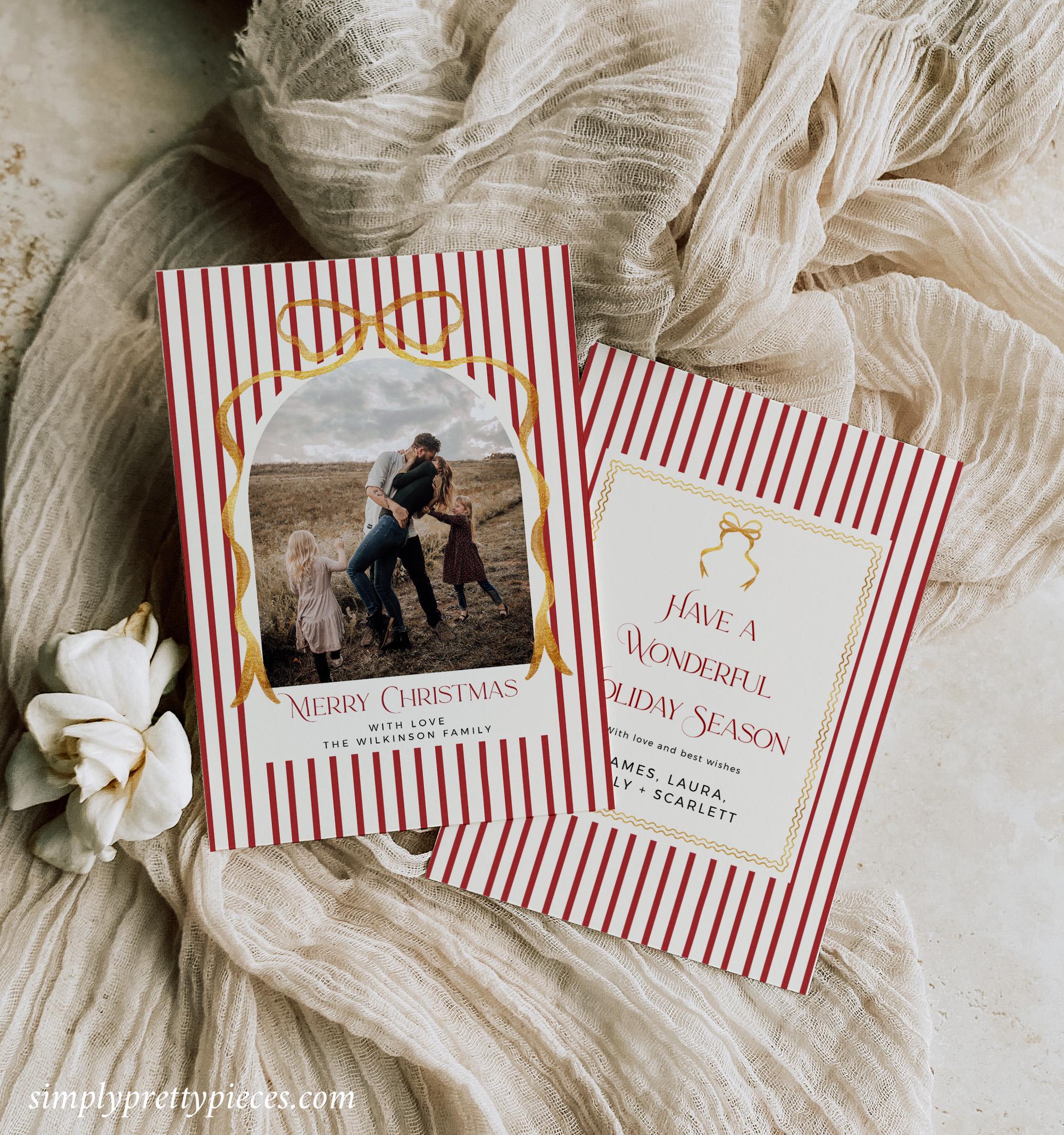 Printable holiday card template that has a vintage stripe design, a muted red and gold color palette and a modern font. There is space for one photo on the front and a greenting on the reverse side. A template with additional photo reverse sides is also included so you have other layout options. This stylish Christmas card is easy to edit and print and is the perfect way to send out holiday wishes to your family and friends.