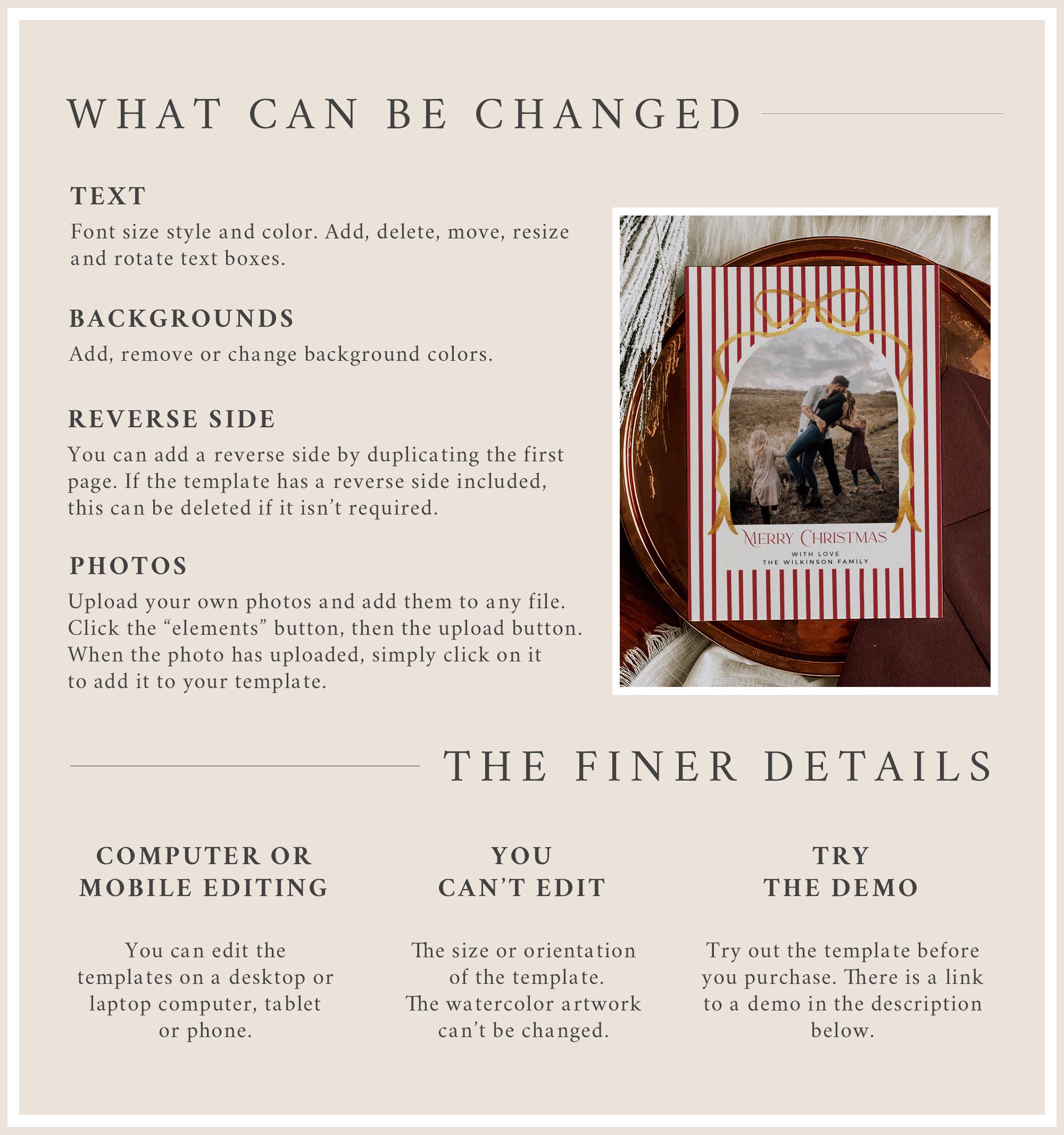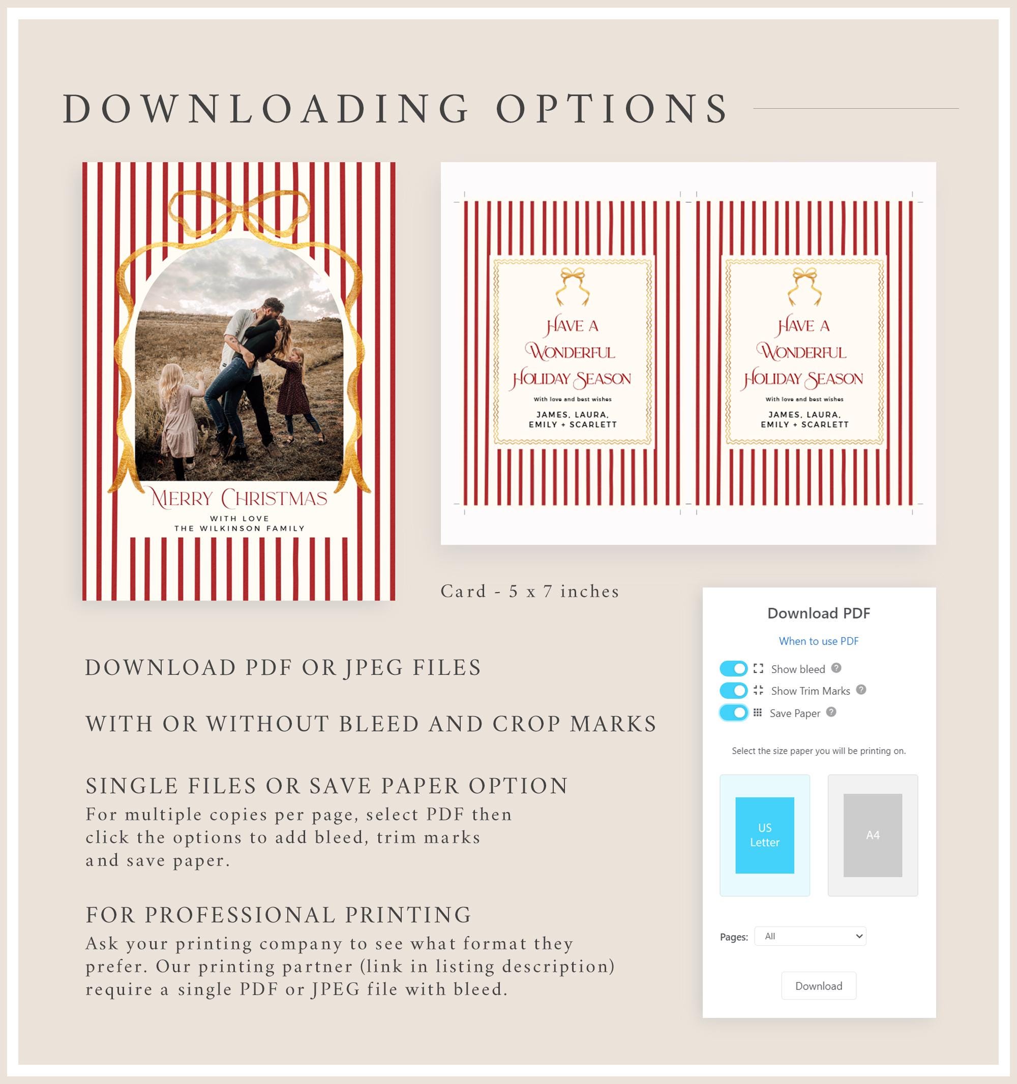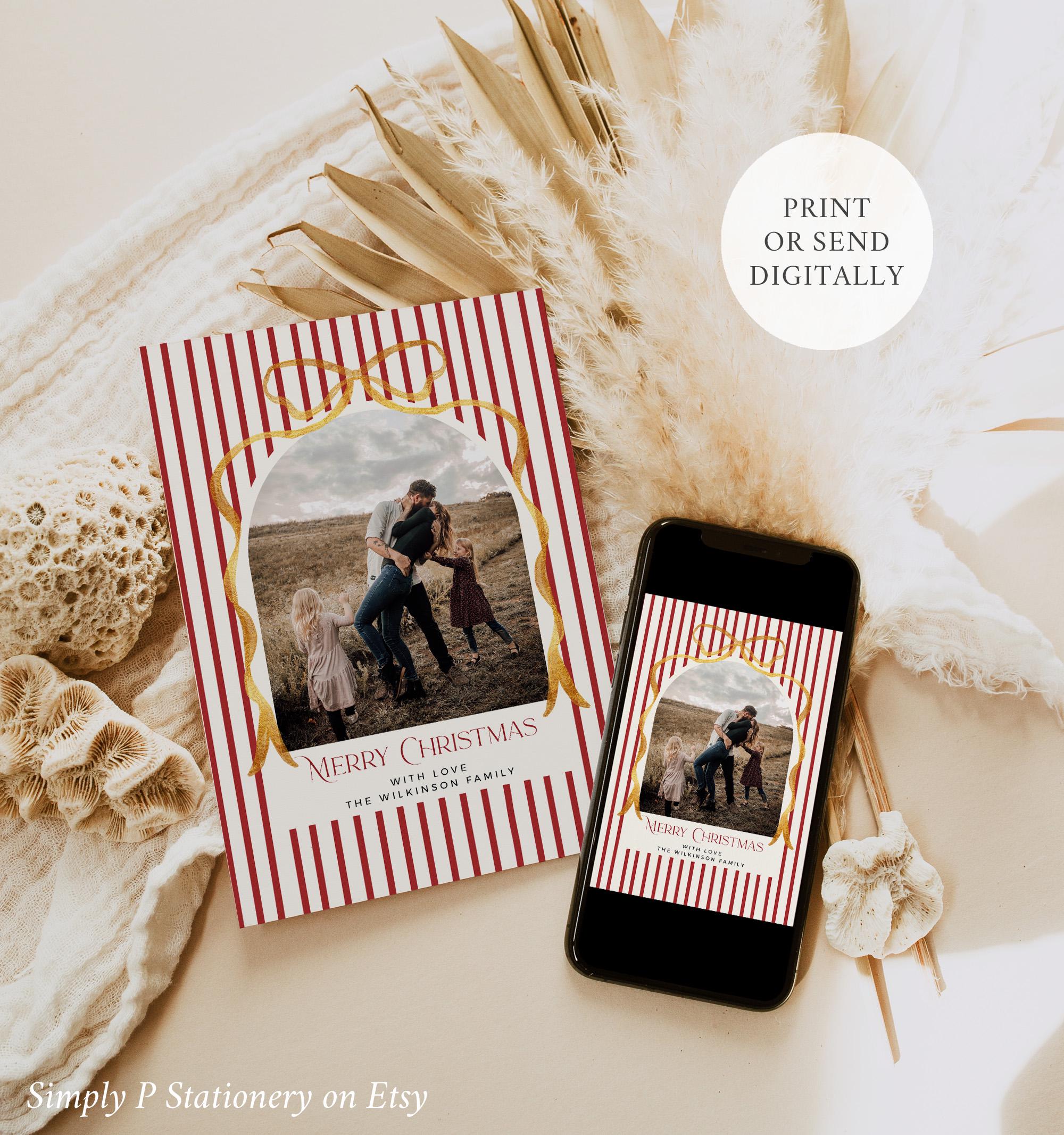 Printable holiday card template that has a vintage stripe design, a muted red and gold color palette and a modern font. There is space for one photo on the front and a greenting on the reverse side. A template with additional photo reverse sides is also included so you have other layout options. This stylish Christmas card is easy to edit and print and is the perfect way to send out holiday wishes to your family and friends.