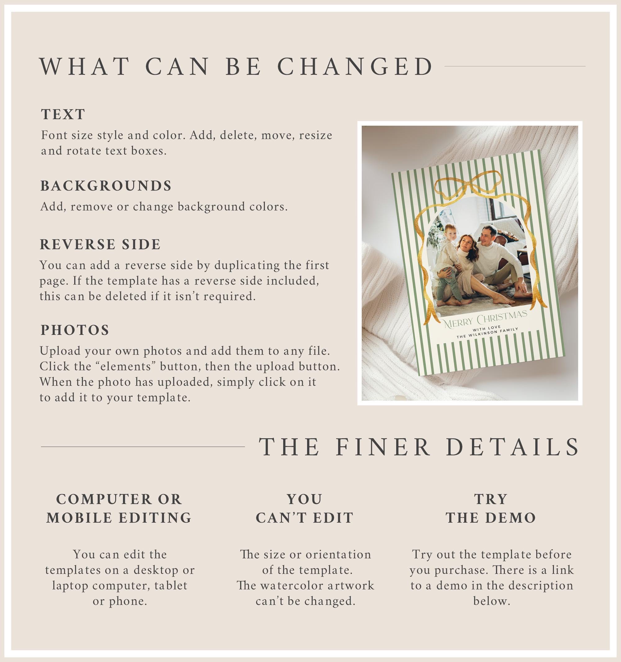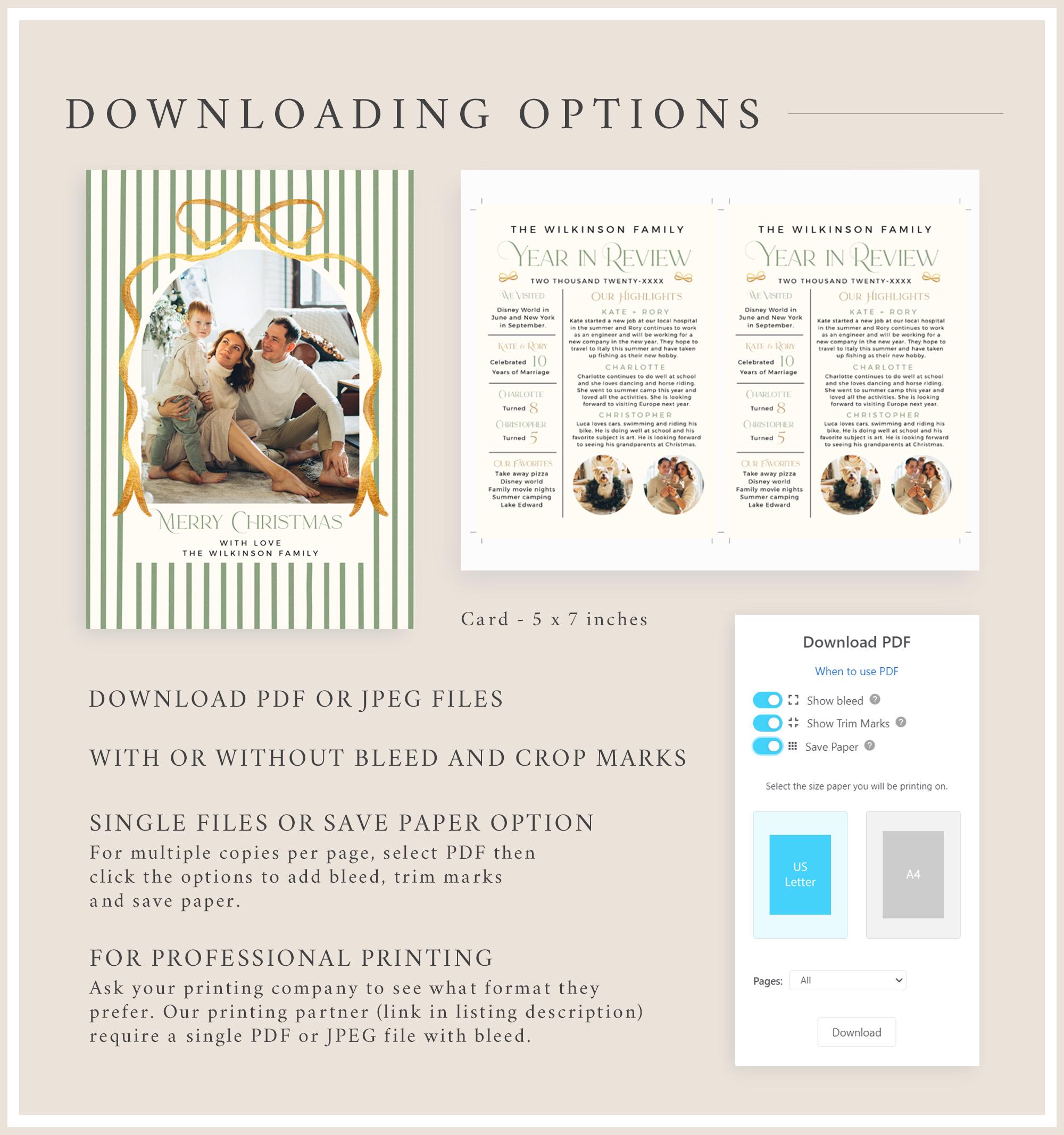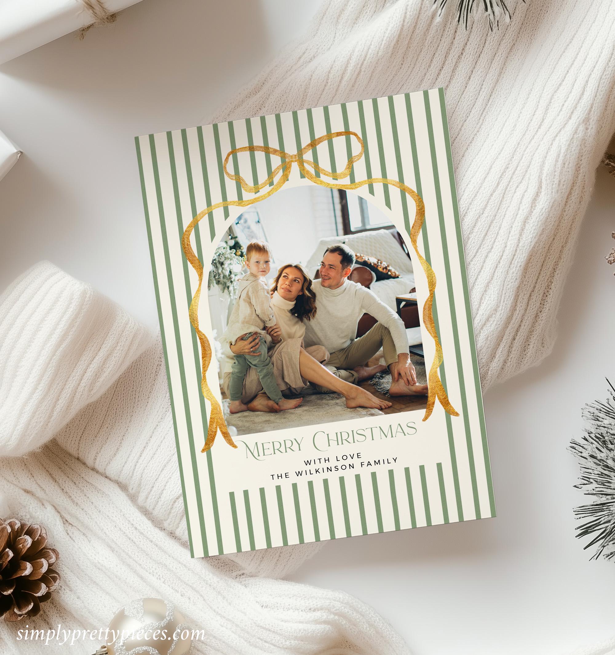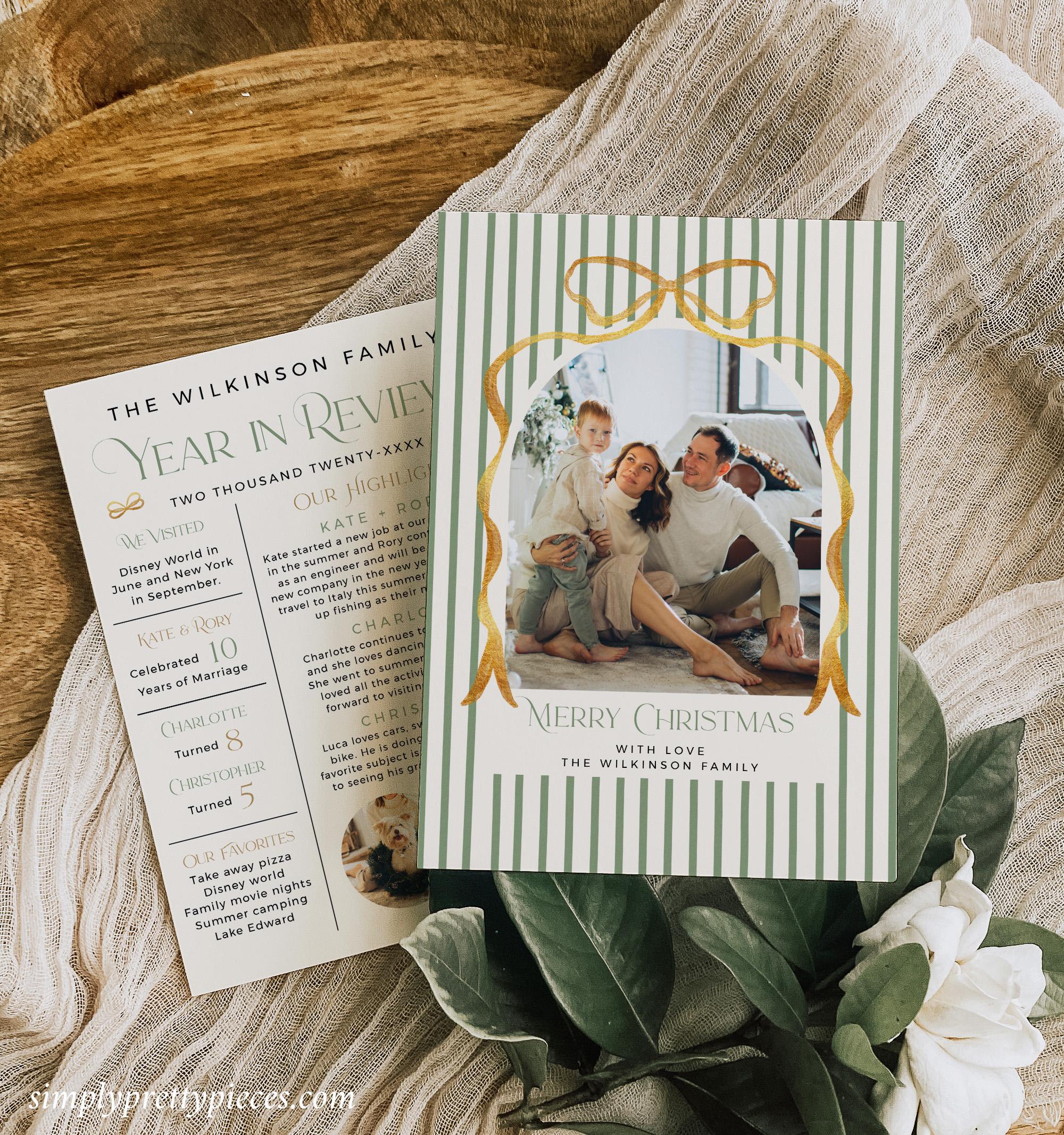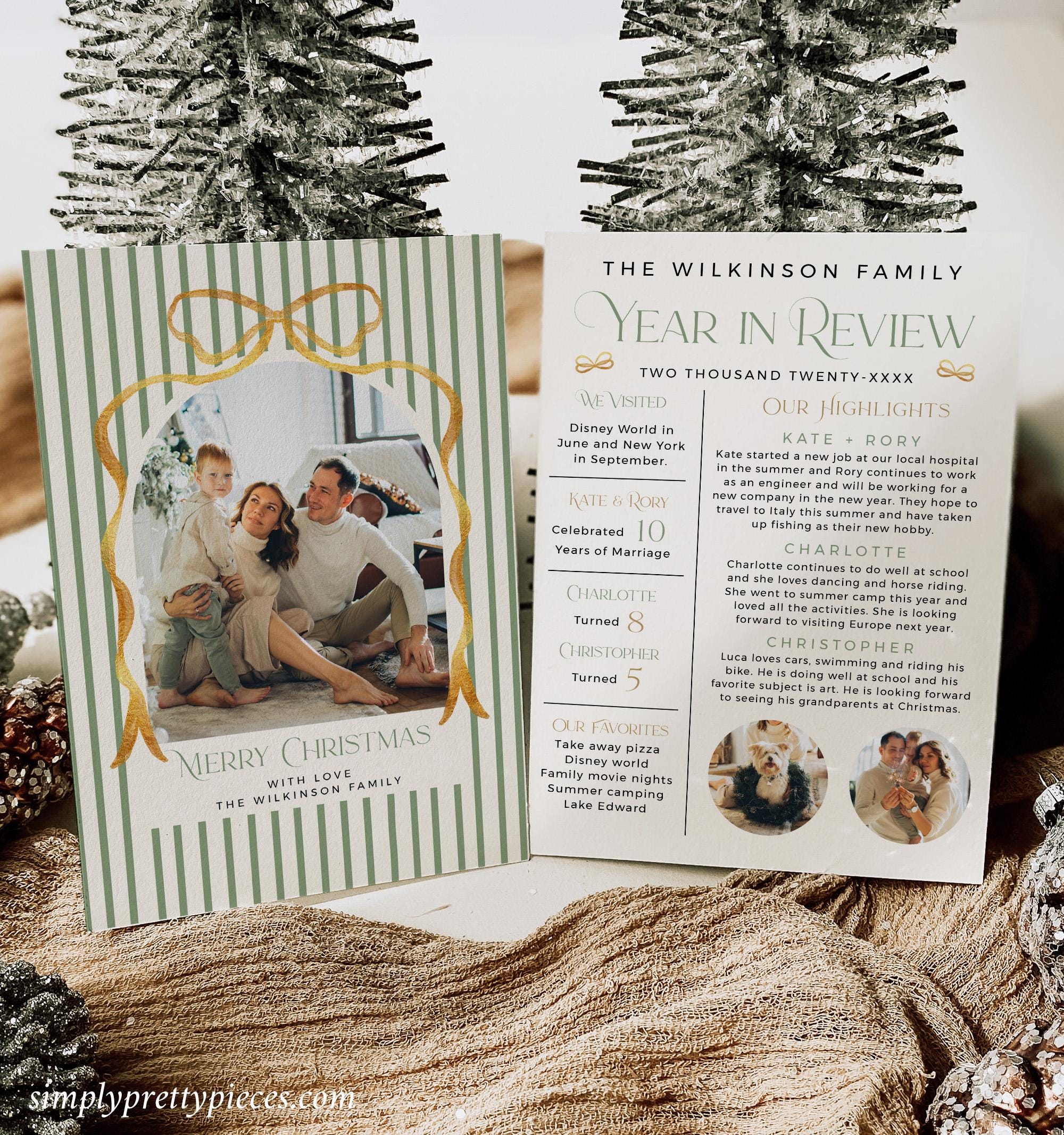 Editable vintage year in review template that has a striped design adorned with a bow, a muted sage green and gold color palette and a modern font. There is space for one photo on the front and two on the reverse. This overview of the year card is easy to edit and print and is the perfect way to send your Christmas wishes to family and friends.