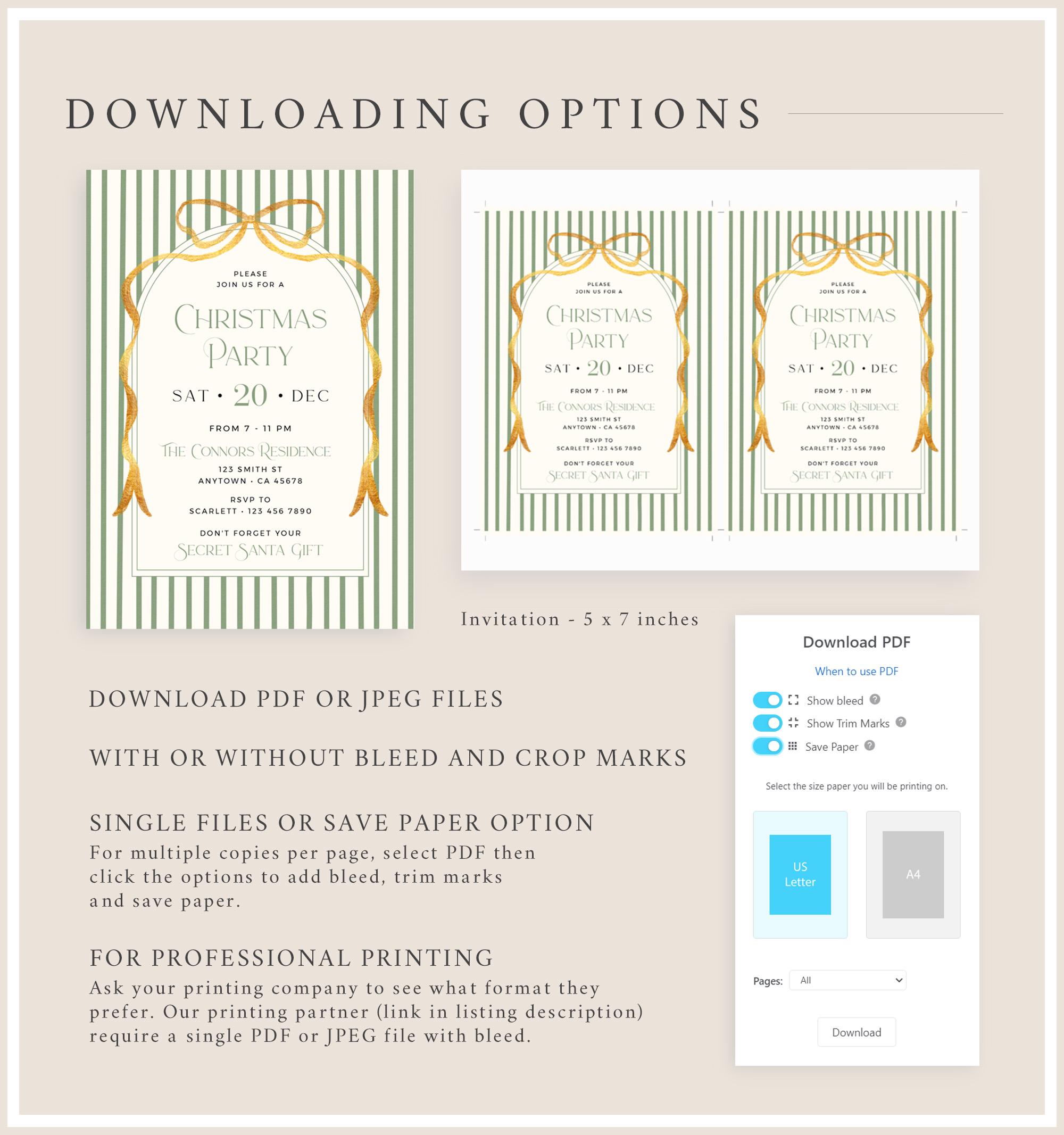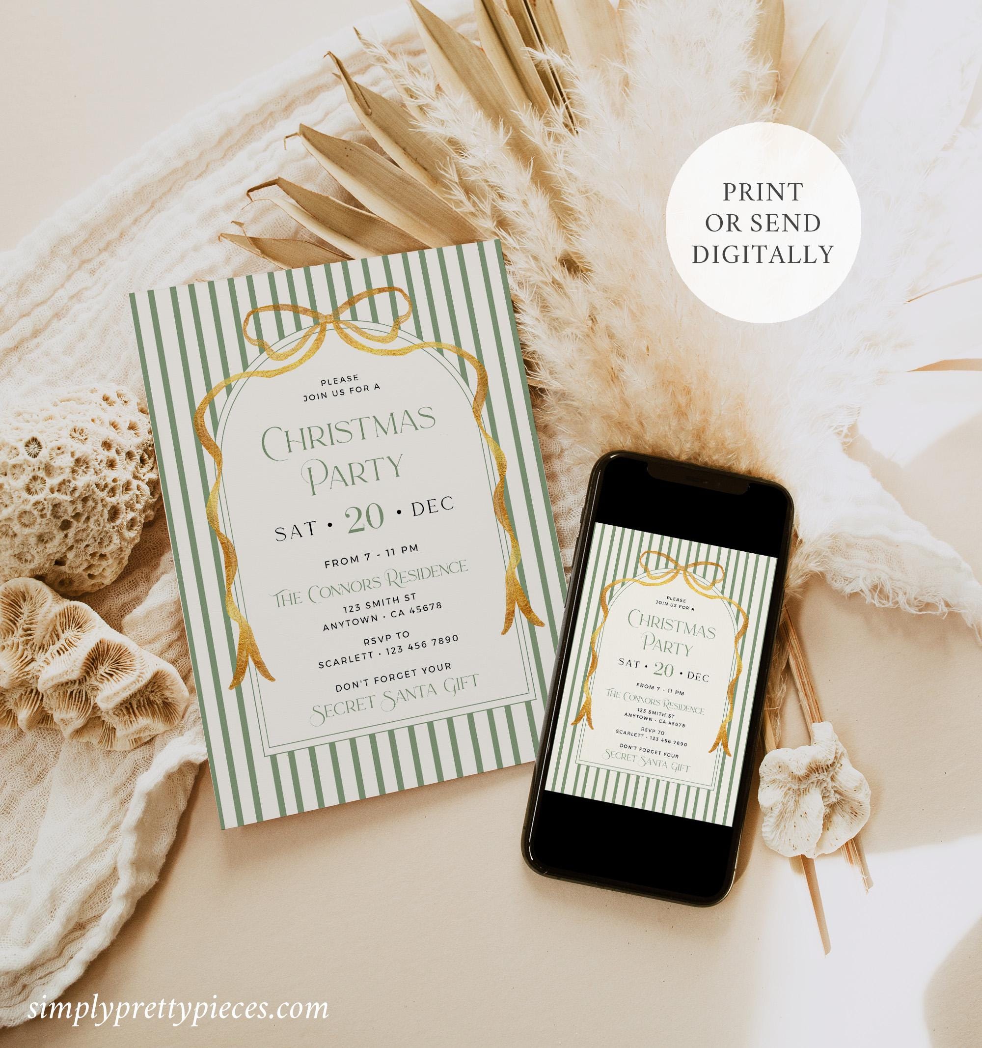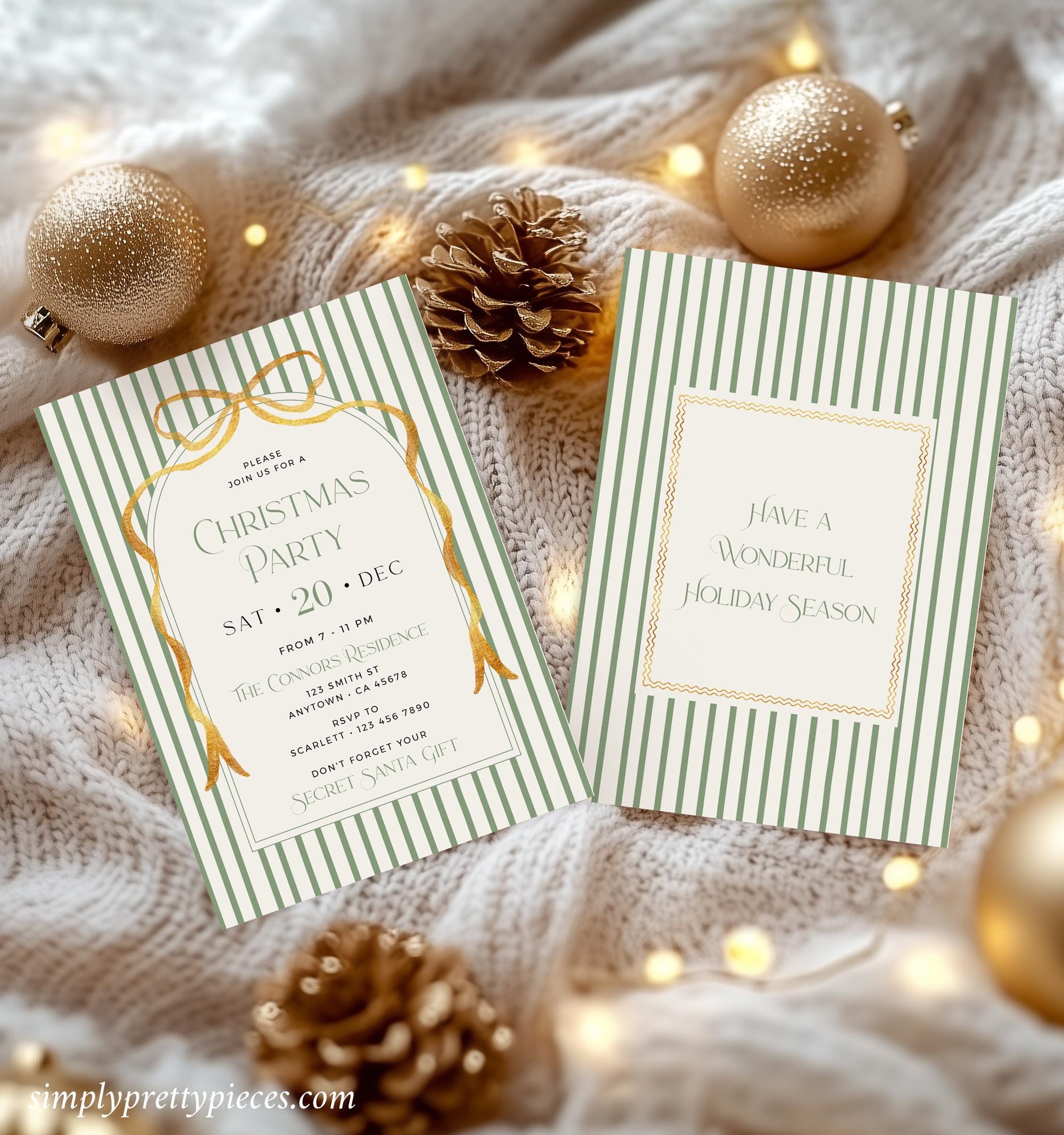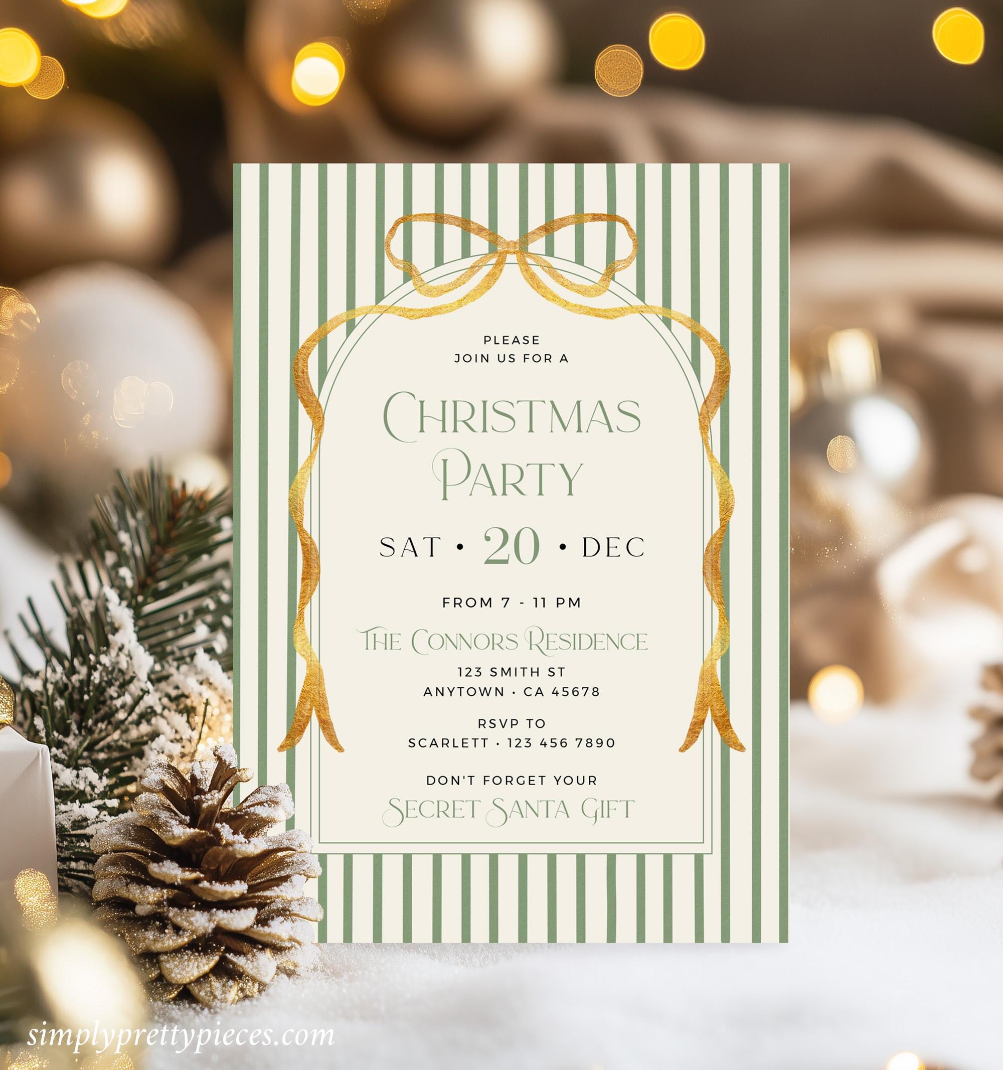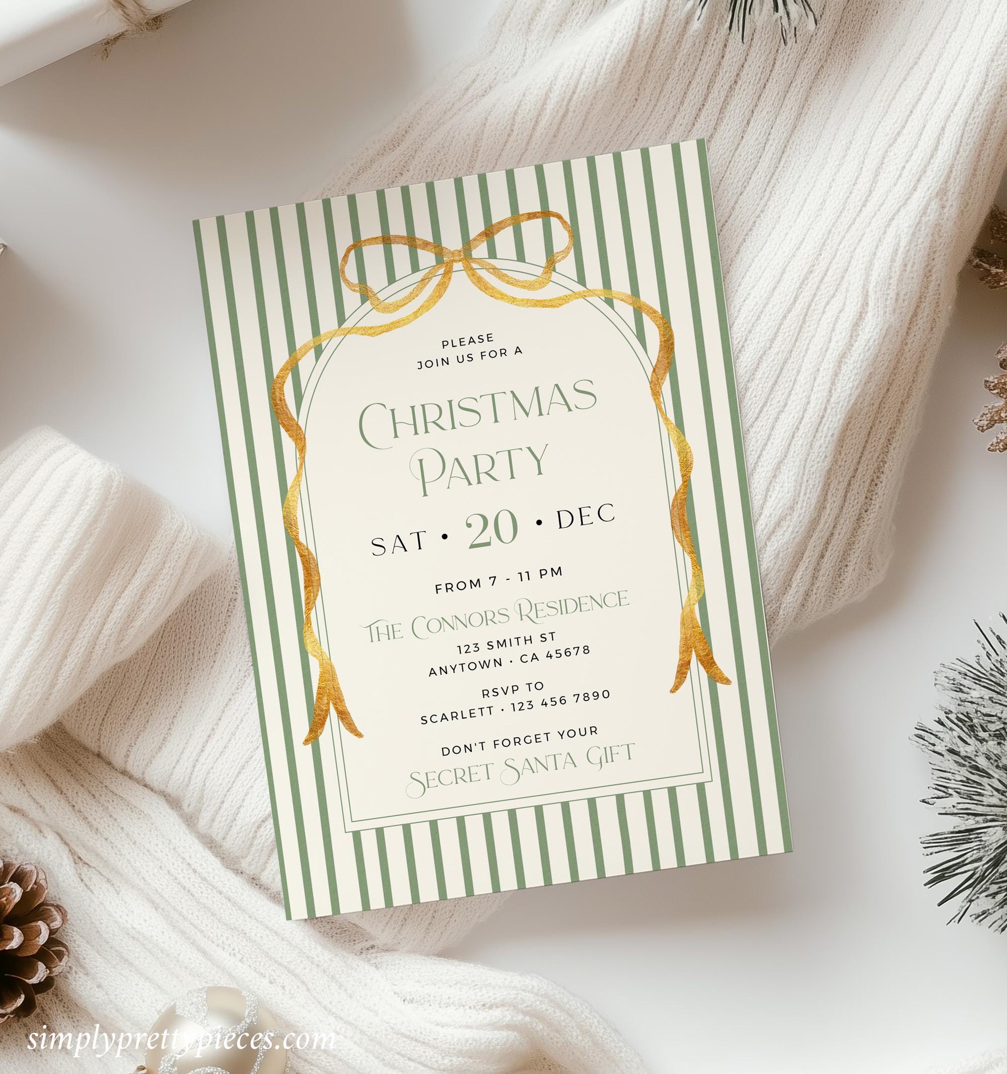 Printable Christmas party invitation template that has a classic green striped design with a gold bow and a modern font. This vintage style holiday party invite is easy to edit and print and is the perfect way to invite family and friends to a Christmas party or event.