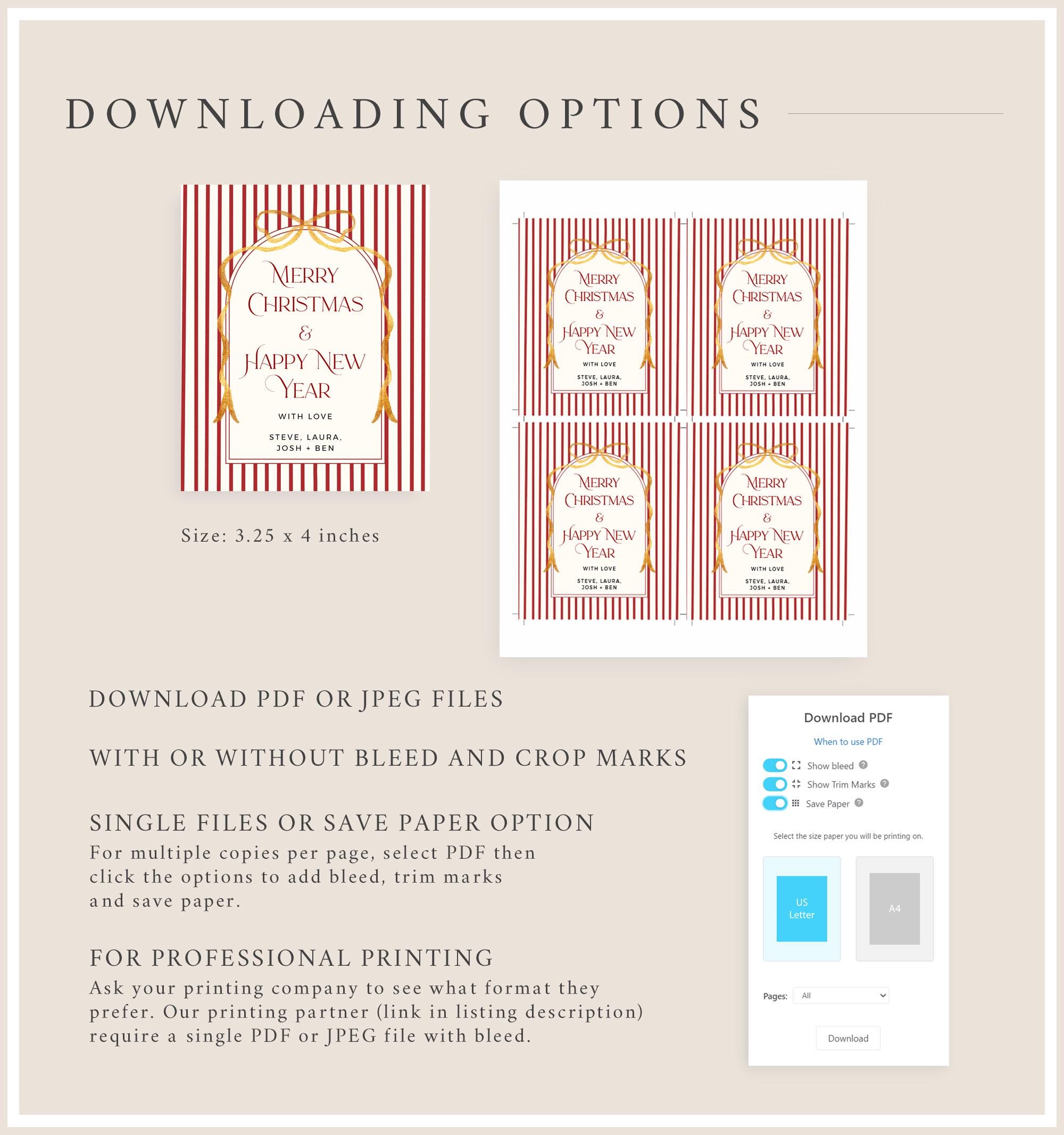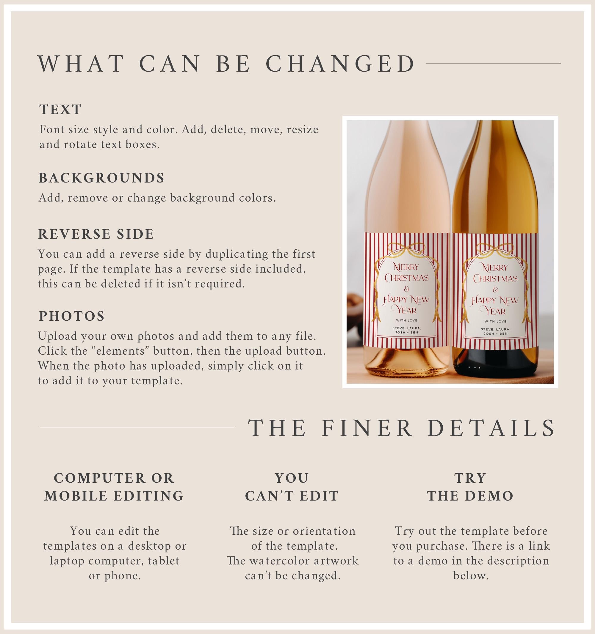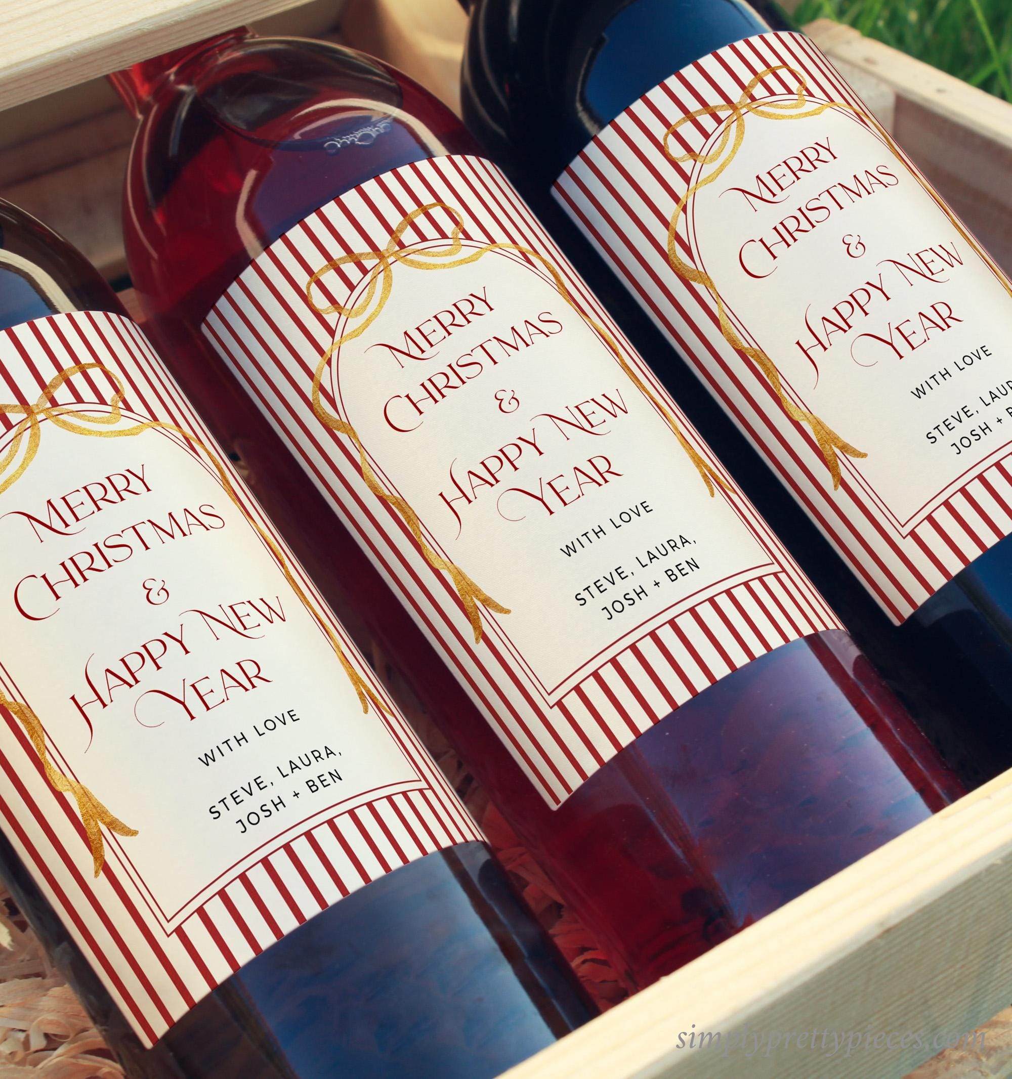 Printable wine bottle label template that has a vintage red striped design with a gold bow and a modern font. It is easy to edit and print and you can create all the wine bottle labels you need. These can be use on a gift or they make perfect decor for a Christmas dinner party or other special event.