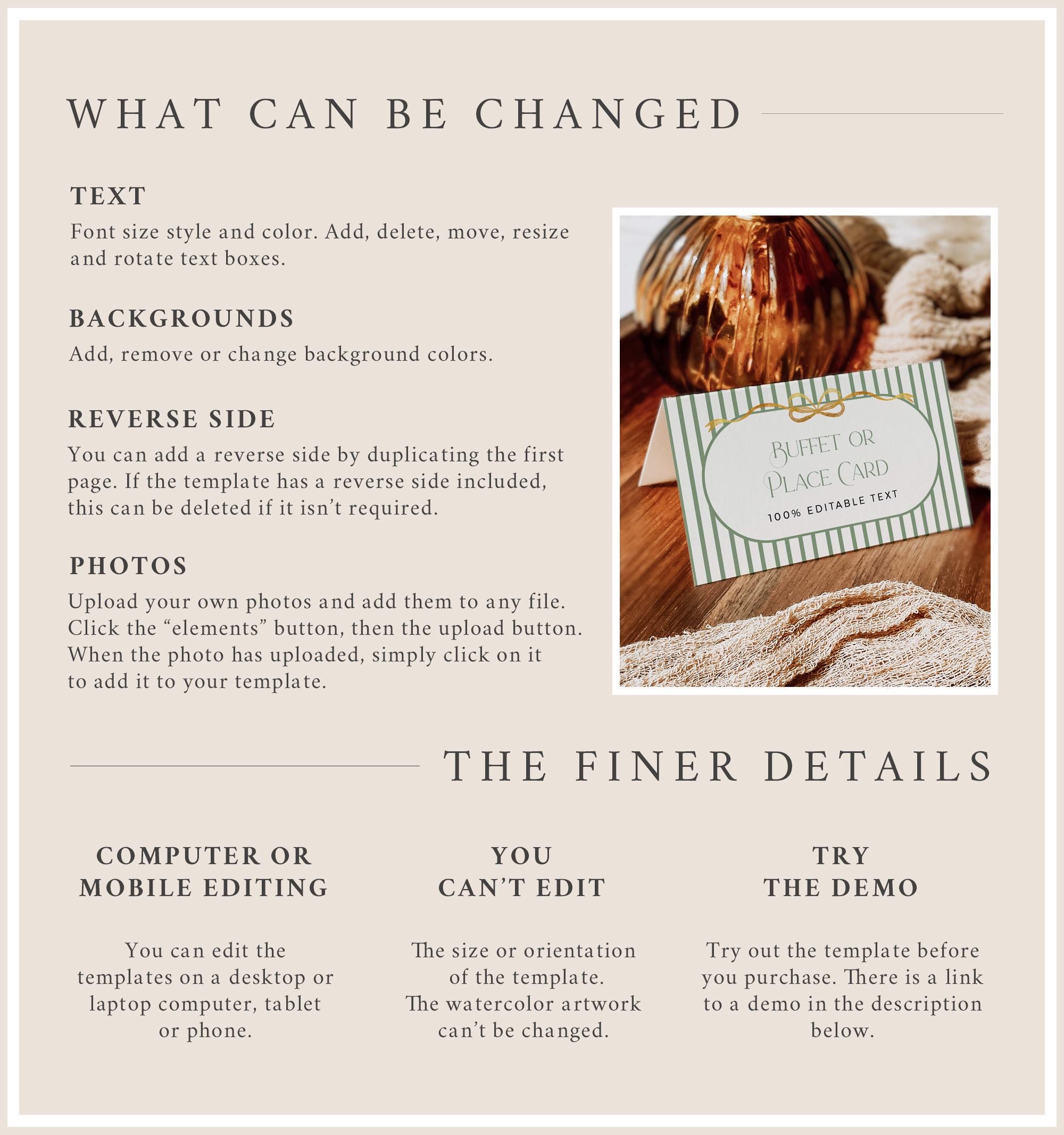 It can be fully edited using TEMPLETT which is a fully customizable template editor that allows you to quickly and easily customize digital templates. After your purchase you will get instant access to your template(s) via an emailed link. No software to install or fonts to download.