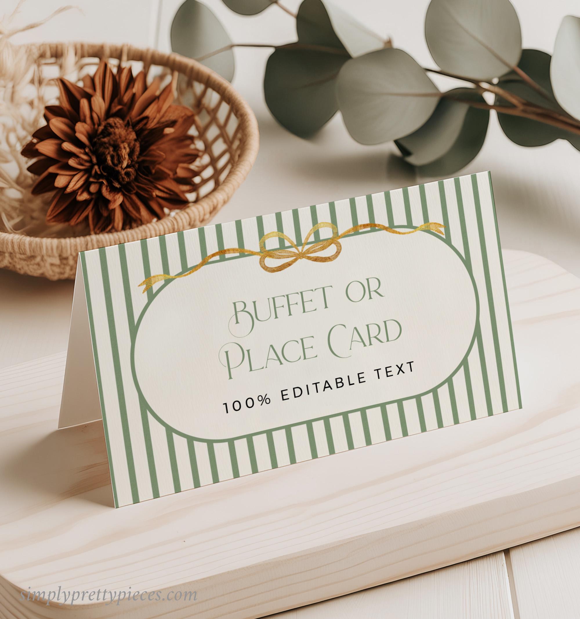 Printable buffet label or place card template that has a vintage green striped design with a gold bow and a modern font. They can be used as food tent cards or place cards. They are easy to edit and print and you can make as many labels as you need. Simply print, trim and add to your buffet or table settings for the perfect finishing touch.