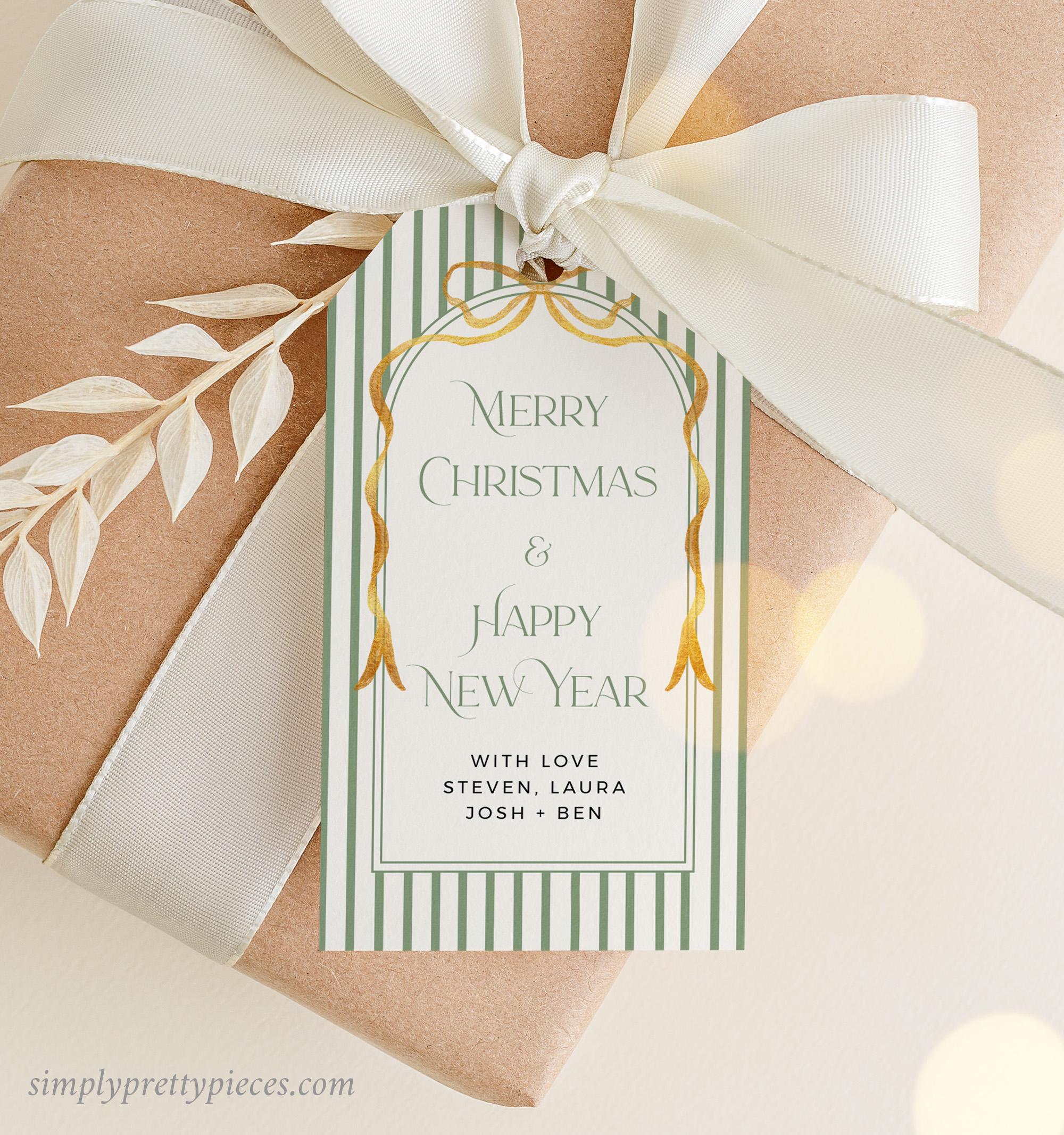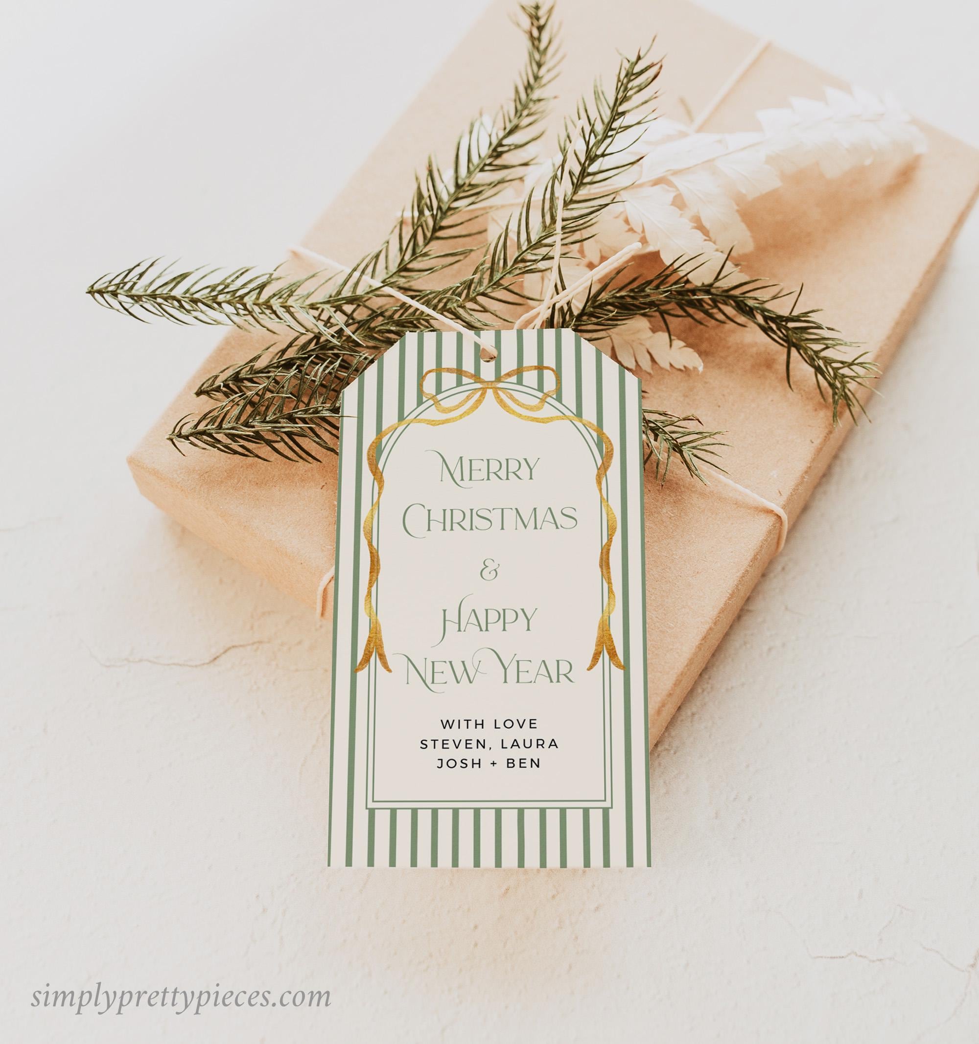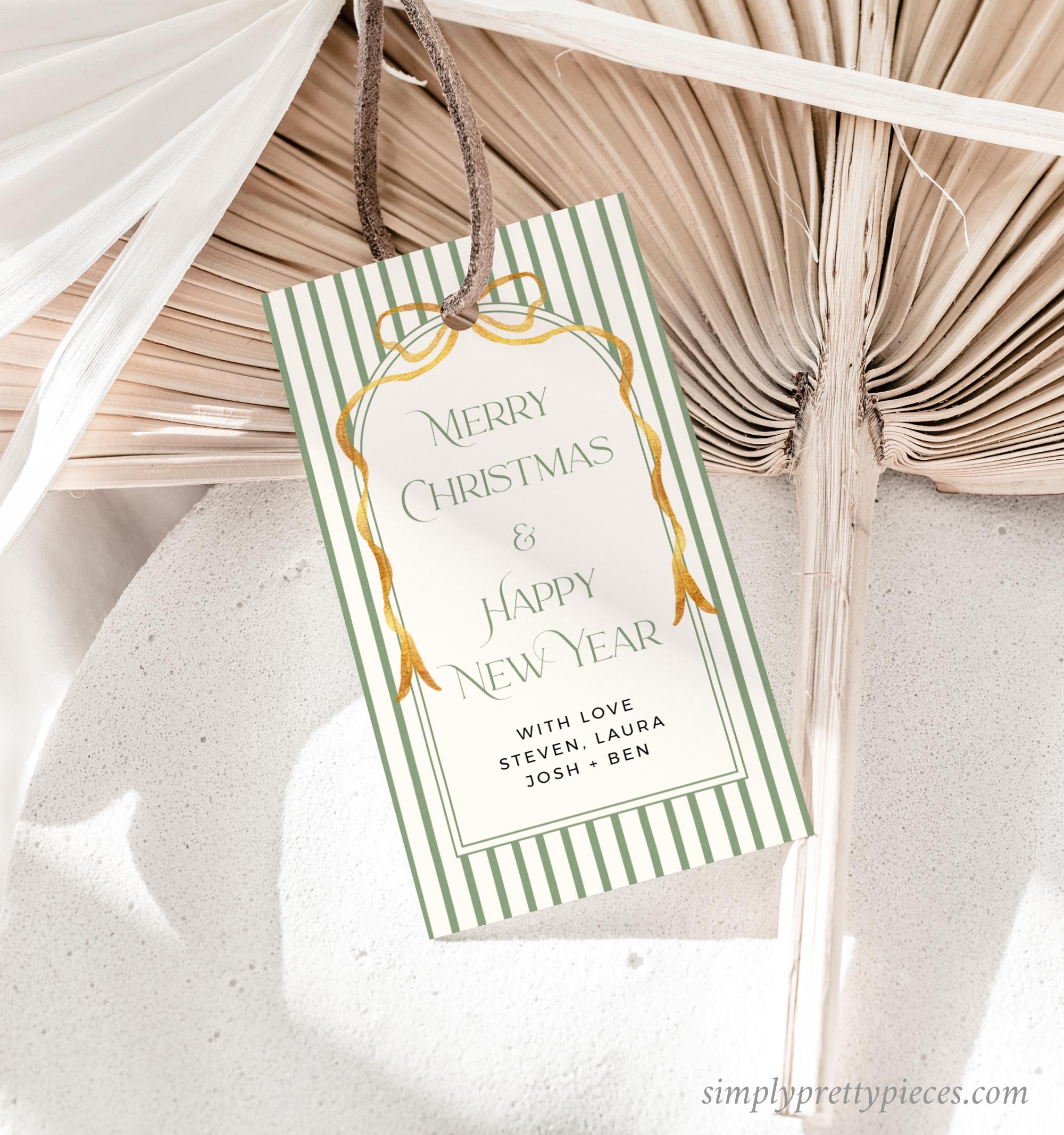 Editable holiday gift tag template that has a vintage green stripe design with a gold bow and a modern font. It is easy to edit and print and you can make as many tags as you need. Simply print, trim and add to your gifts for the perfect finishing touch.