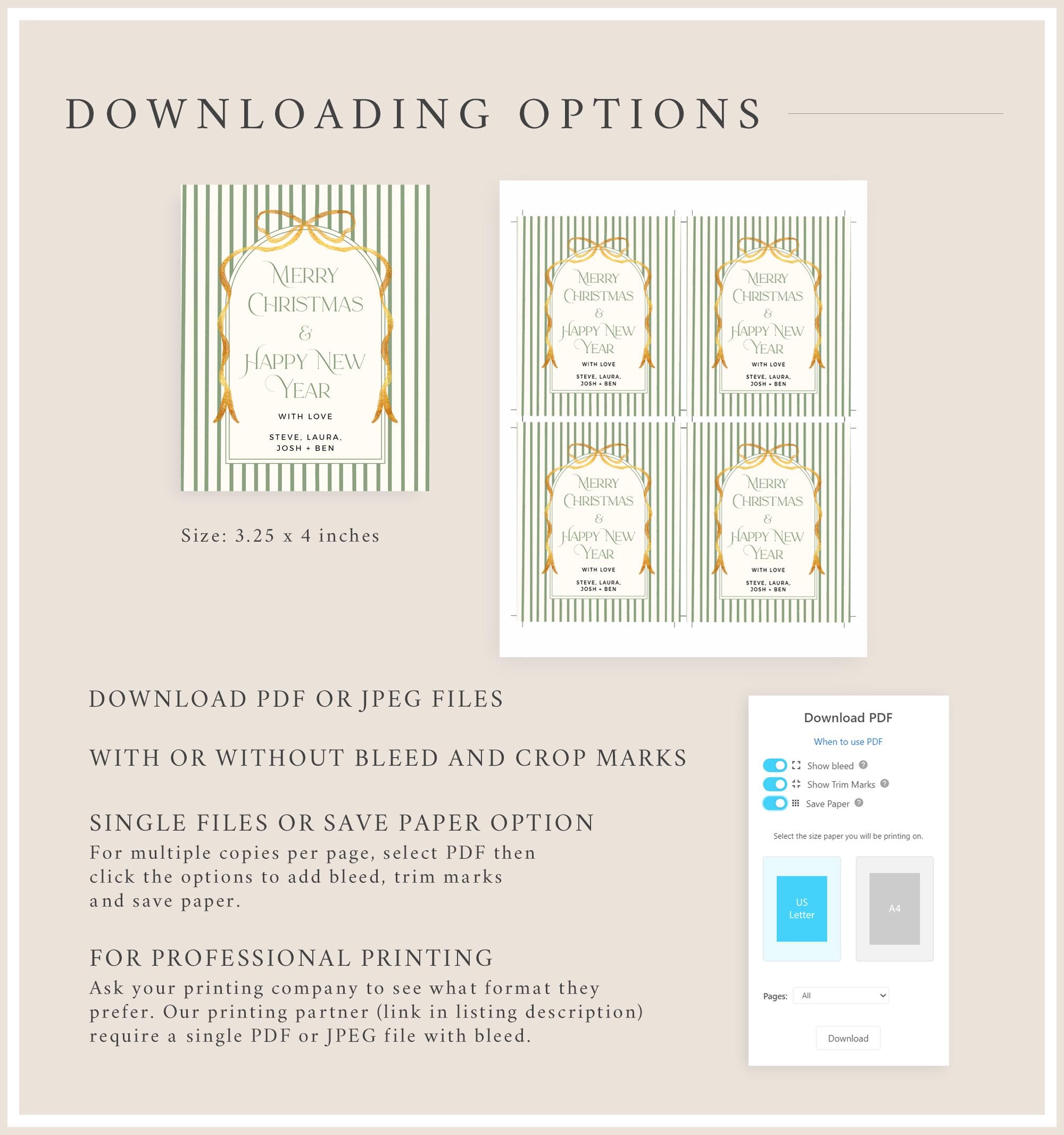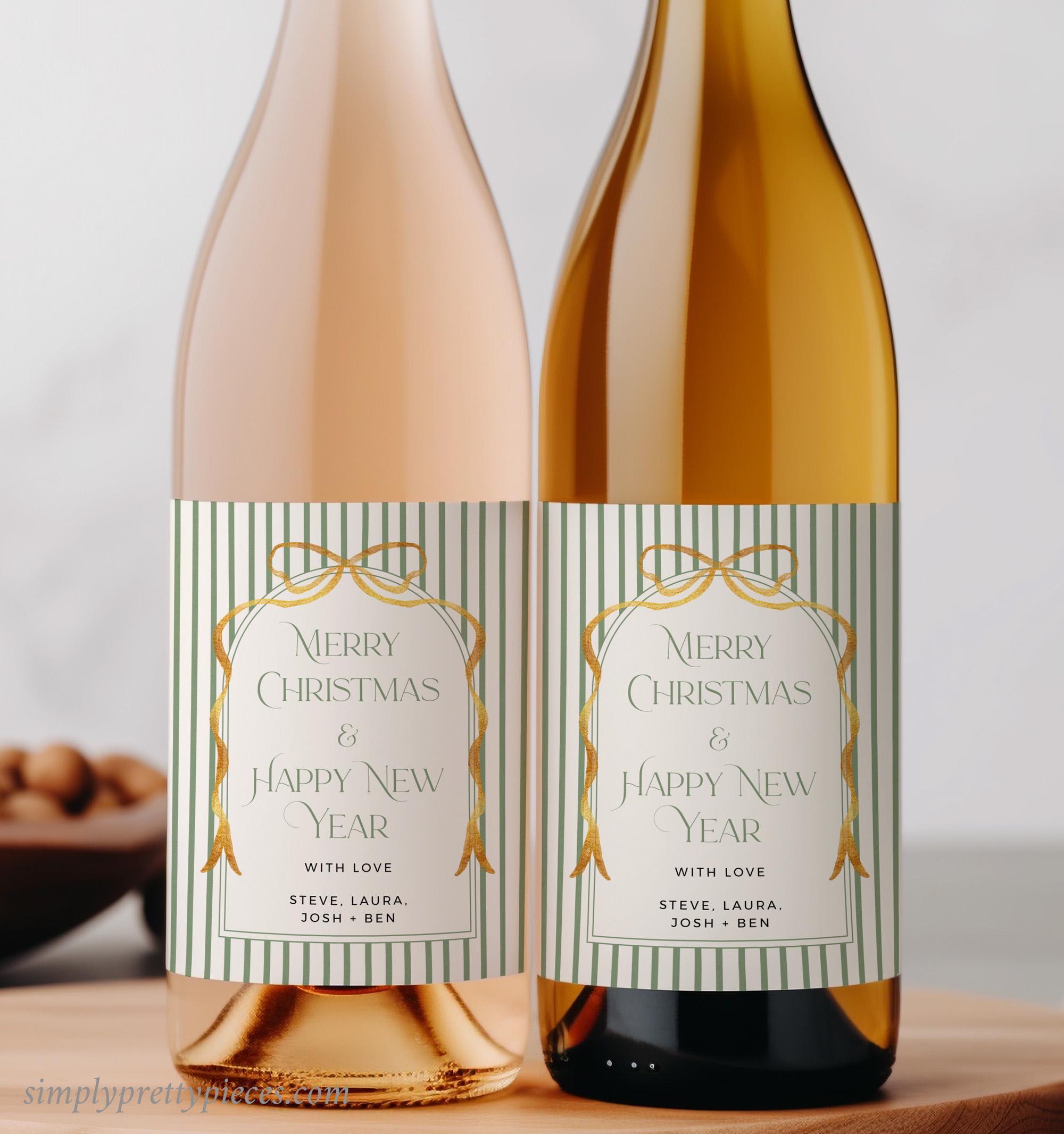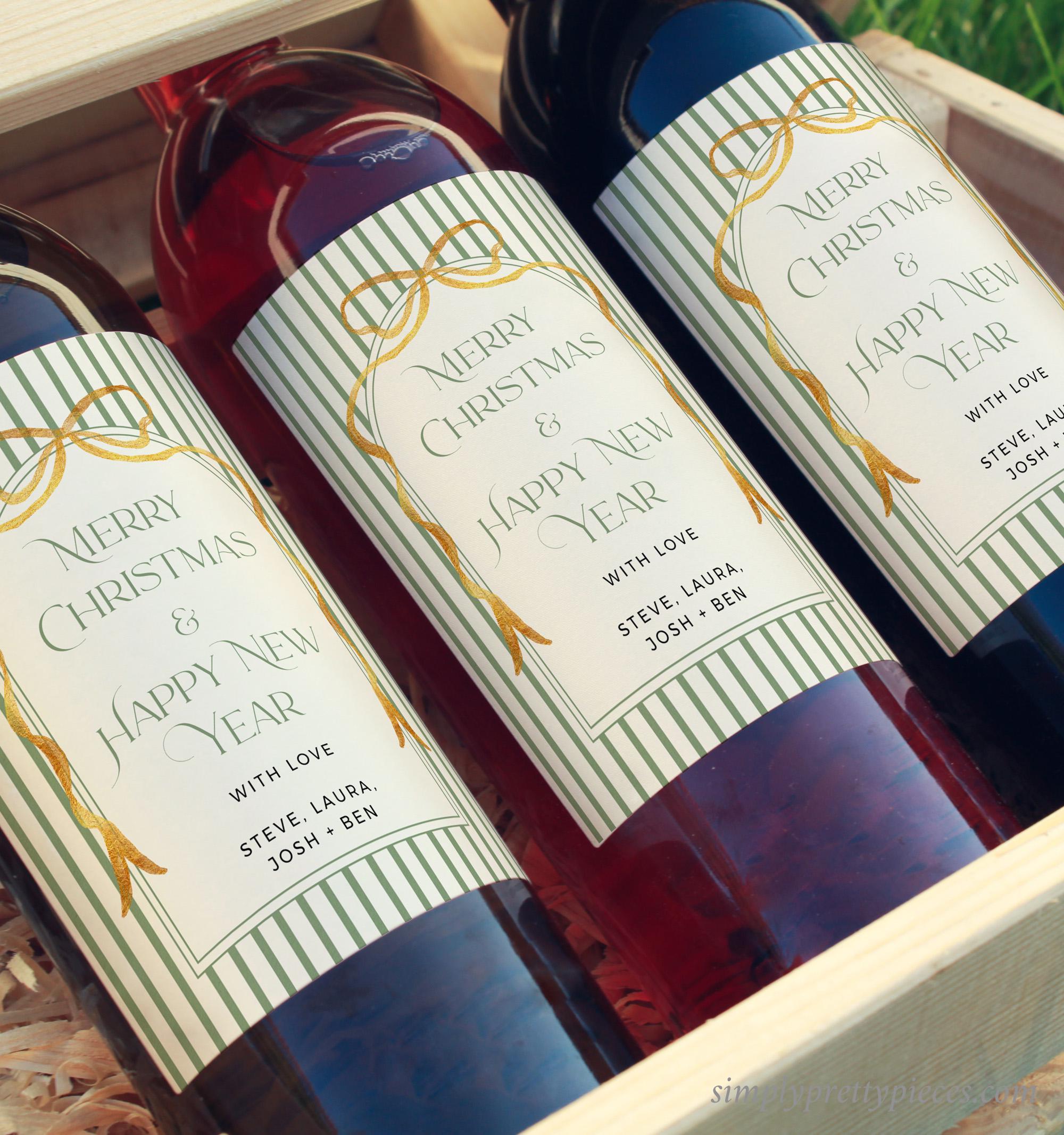 Printable wine bottle label template that has a vintage green striped design with a gold bow and a modern font. It is easy to edit and print and you can create all the wine bottle labels you need. These can be use on a gift or they make perfect decor for a Christmas dinner party or other special event.