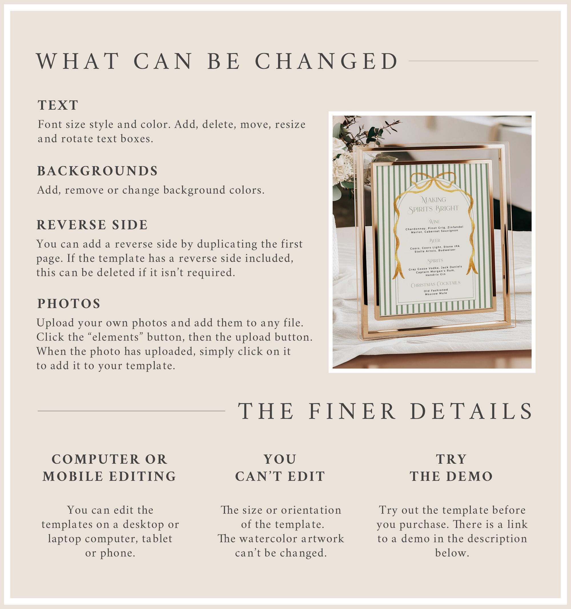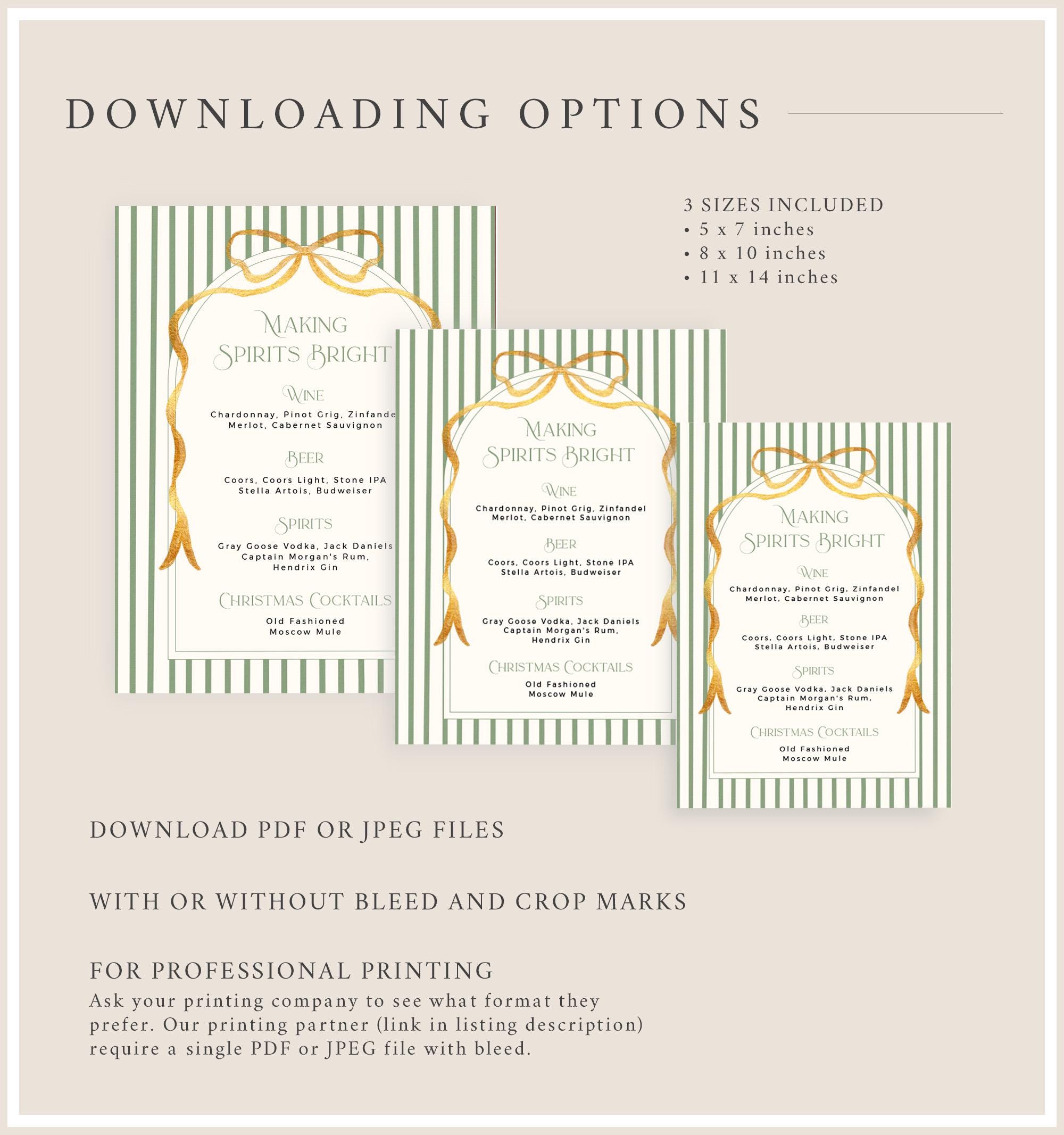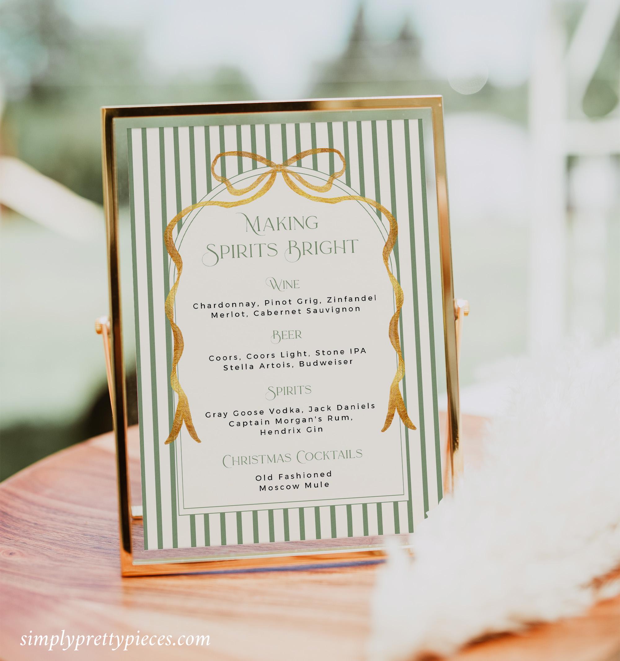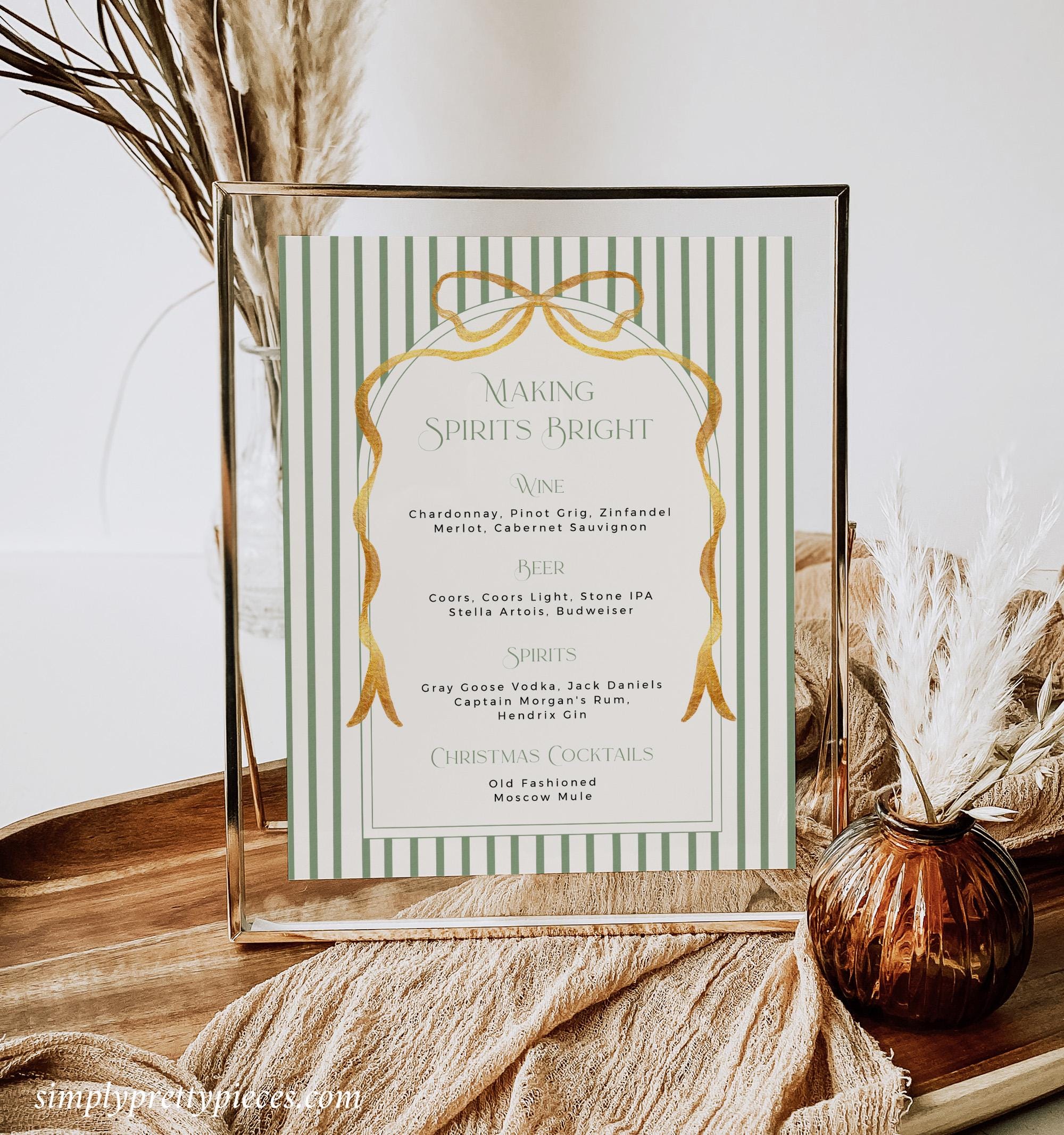 Printable christmas bar menu templates that have a vintage green stripe design with a gold bow and a modern font. They are easy to edit and print and will look beautiful displayed on the bar at your holiday drinks party. Three templates are included so you can choose the size you prefer.