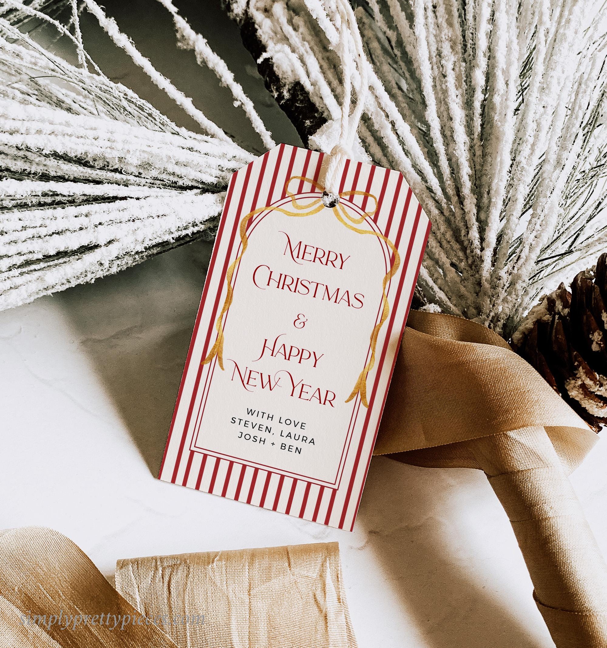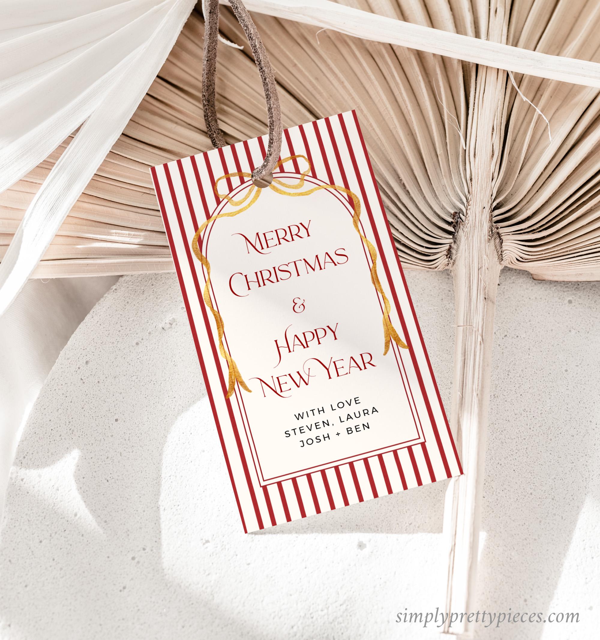 Editable holiday gift tag template that has a vintage red stripe design with a gold bow and a modern font. It is easy to edit and print and you can make as many tags as you need. Simply print, trim and add to your gifts for the perfect finishing touch.