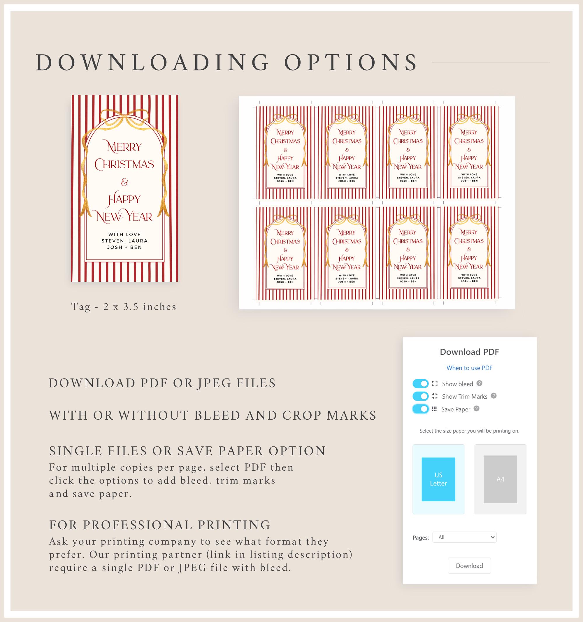 All of the templates for tags, labels, place cards etc are designed to be printed on US letter or A4 card/paper/full sheet sticker and trimmed. They are not formatted for any branded or pre-cut tags, labels or place cards.
