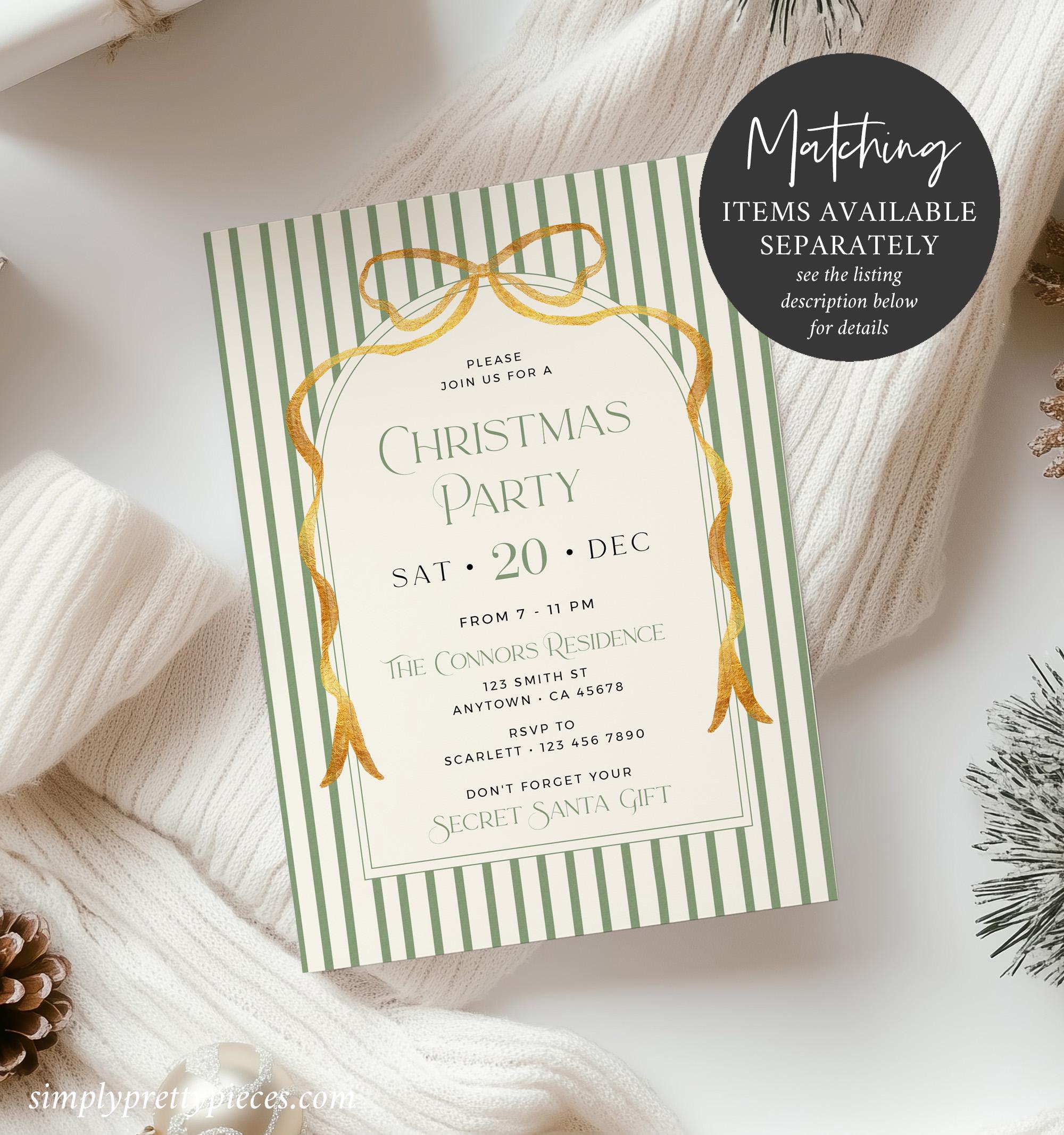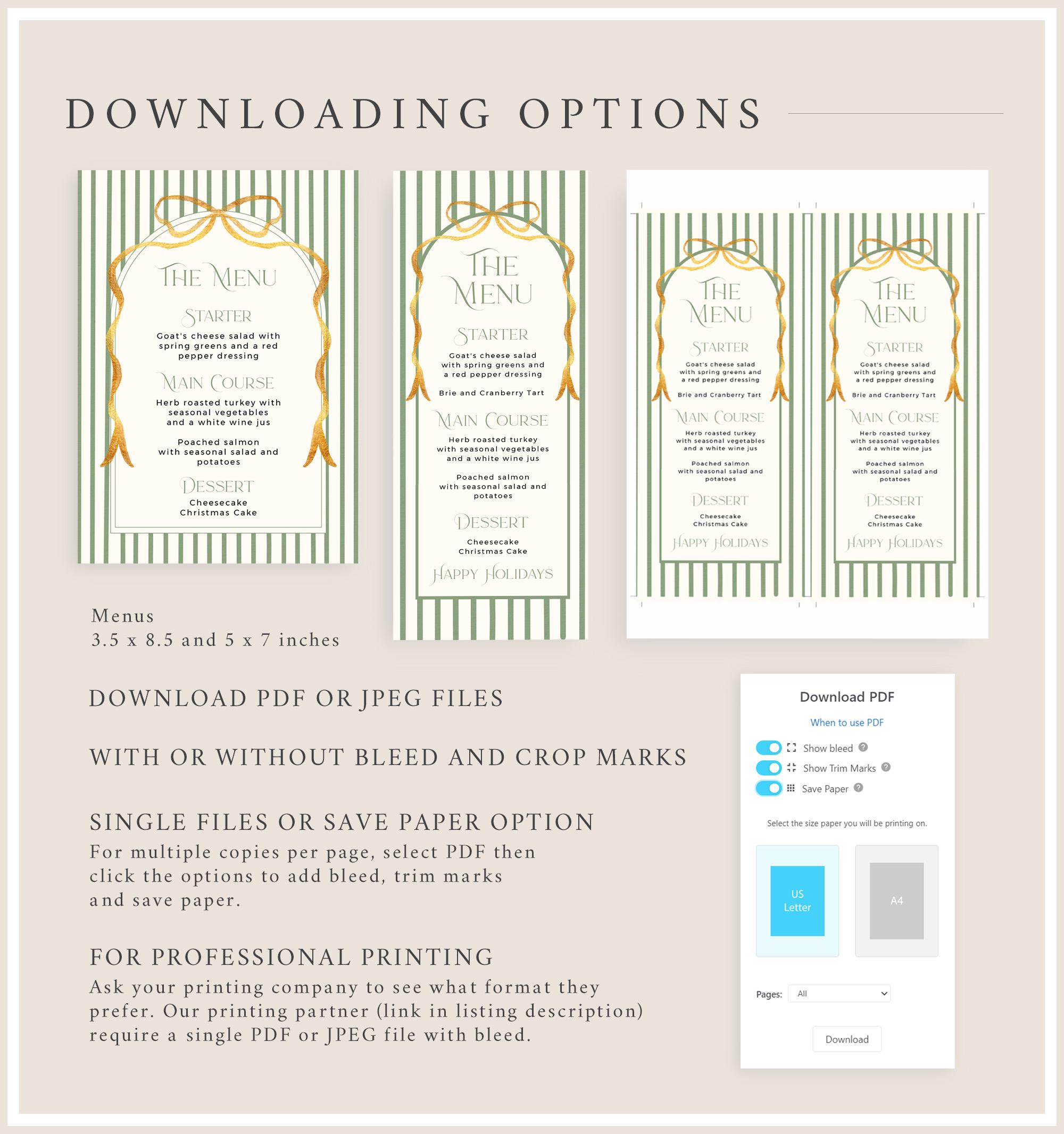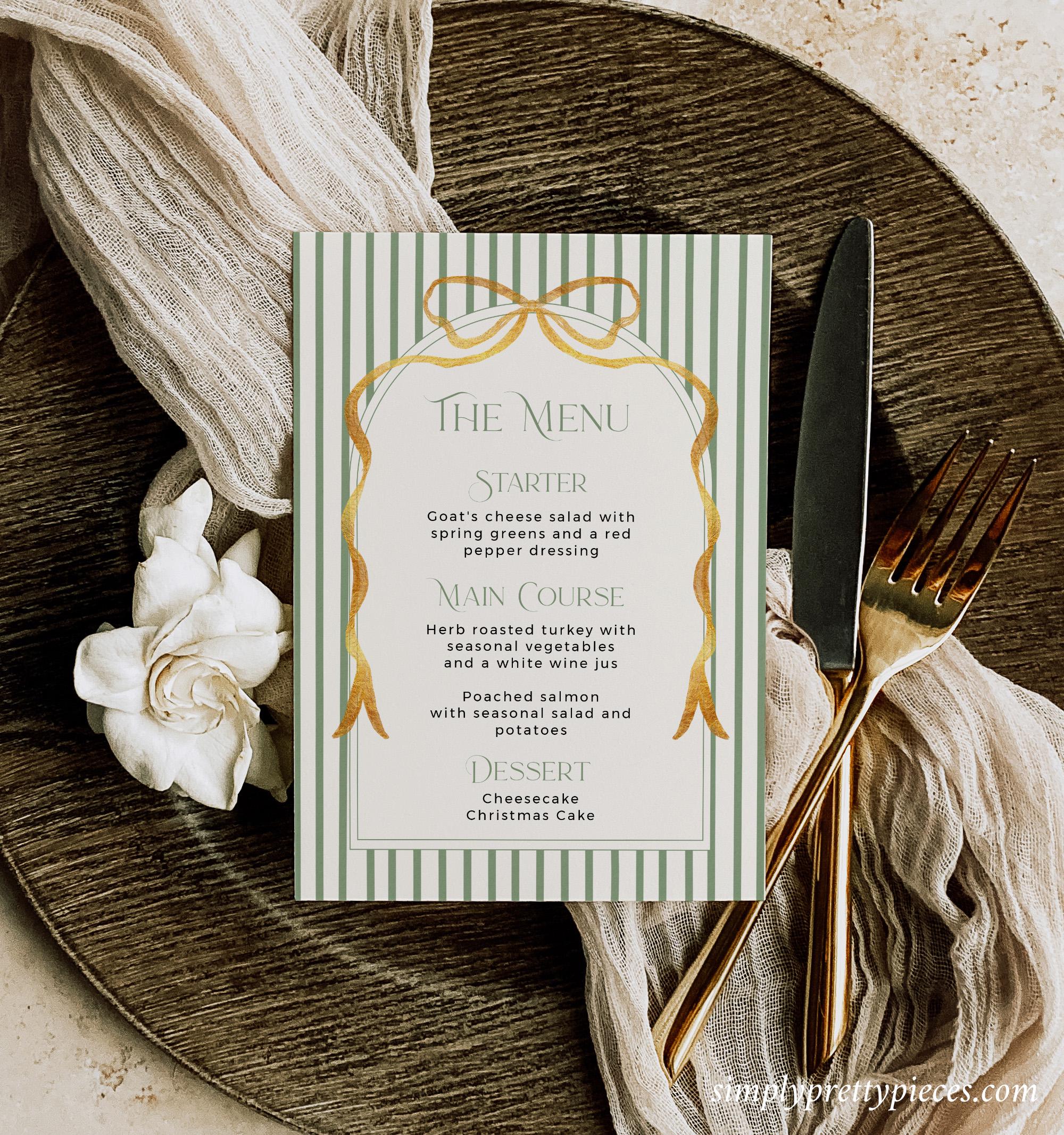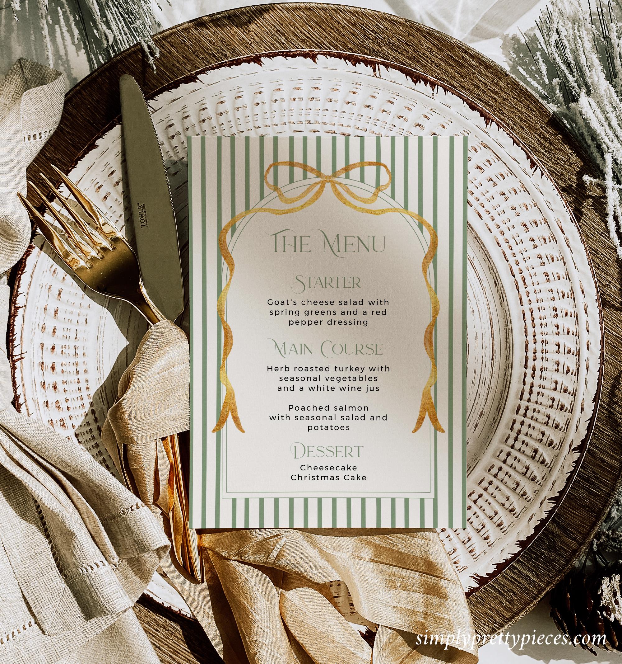 Editable vintage Christmas menu templates that have a classic green stripe design with a gold bow and a modern font. They are easy to edit and print and will look festive on your Christmas table settings. Two templates are included so you can choose the size you prefer for your holiday party.