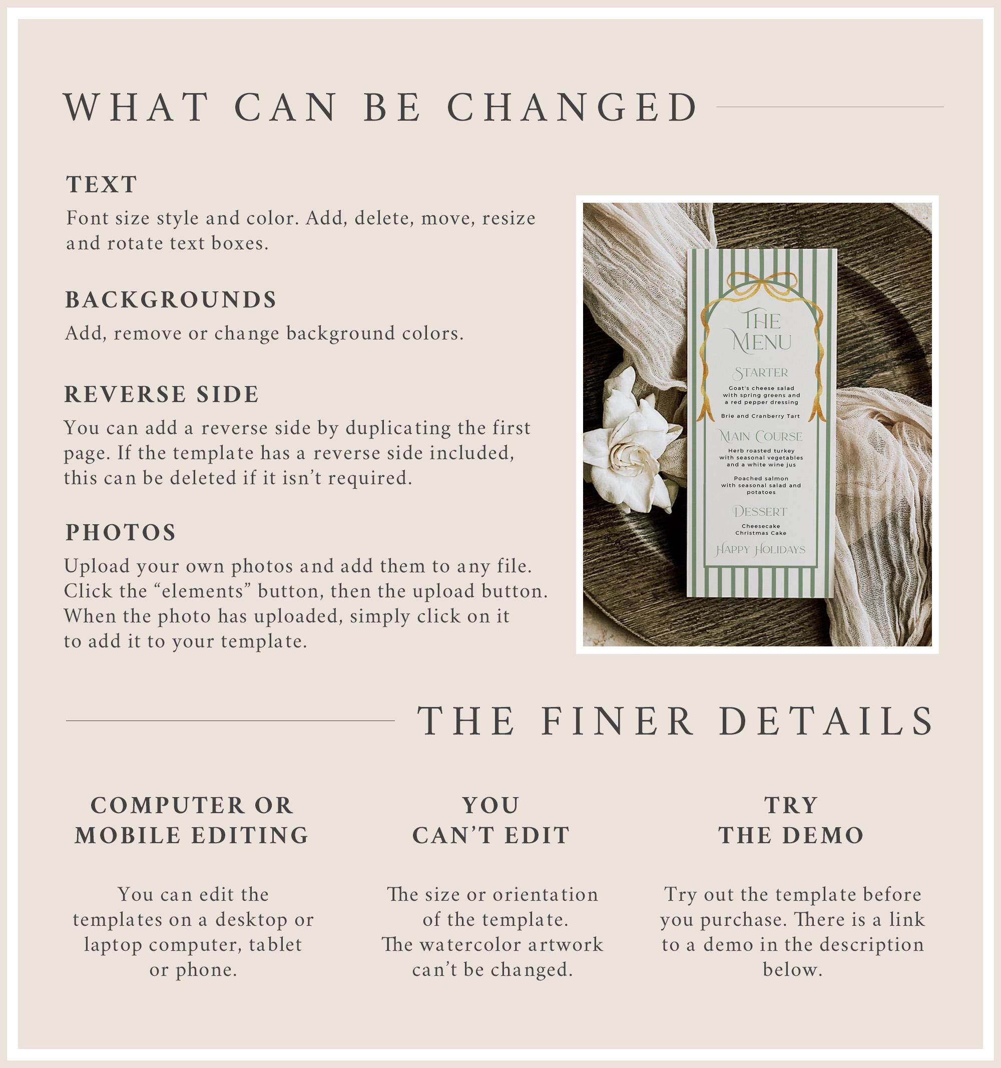 It can be fully edited using TEMPLETT which is a fully customizable template editor that allows you to quickly and easily customize digital templates. After your purchase you will get instant access to your template(s) via an emailed link. No software to install or fonts to download.
