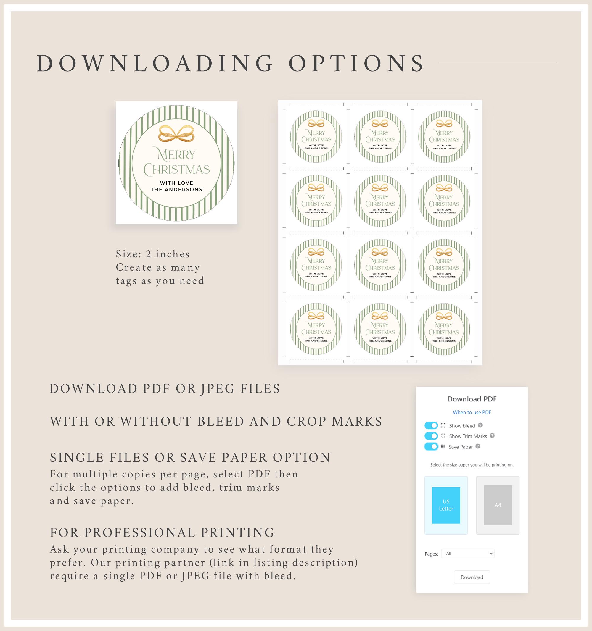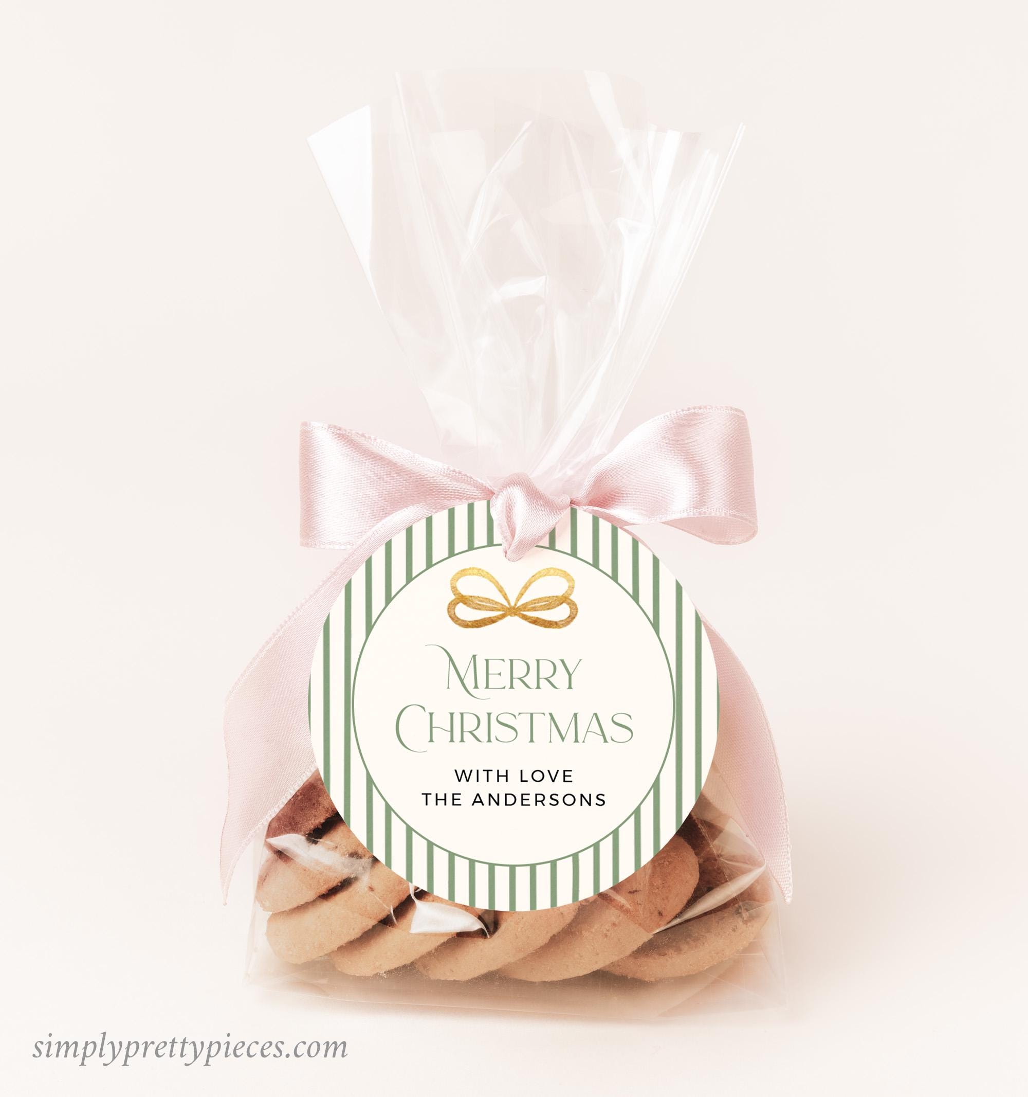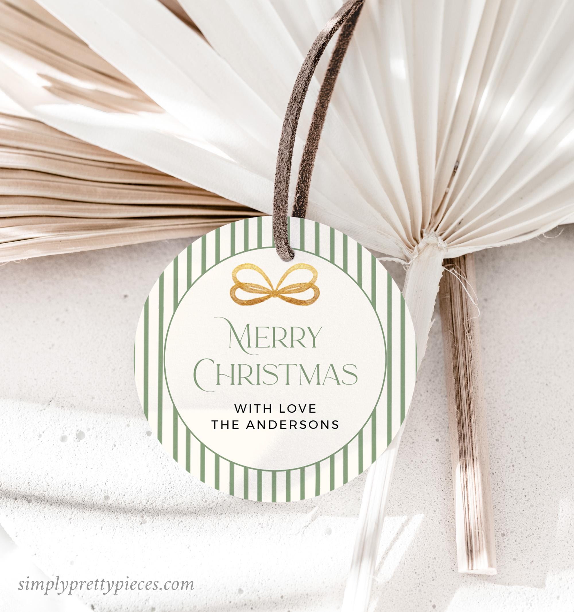 Printable round gift tag template that has a vintage green striped design with a gold bow and a modern font. It is easy to edit and print and you can make as many tags as you need. They can be printed on cardstock and used as gift tags or cupcake toppers and they can also be printed on sticker paper and used as labels for candles or gifts. Simply print, trim and add to your gifts for the perfect finishing touch.