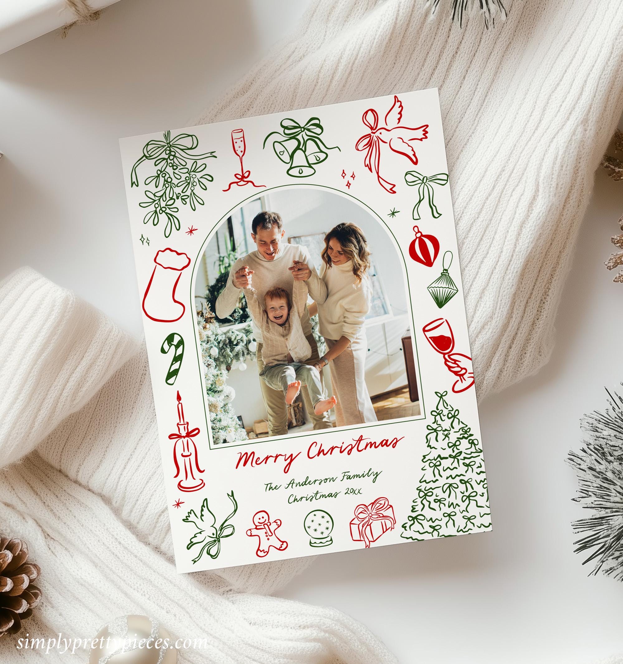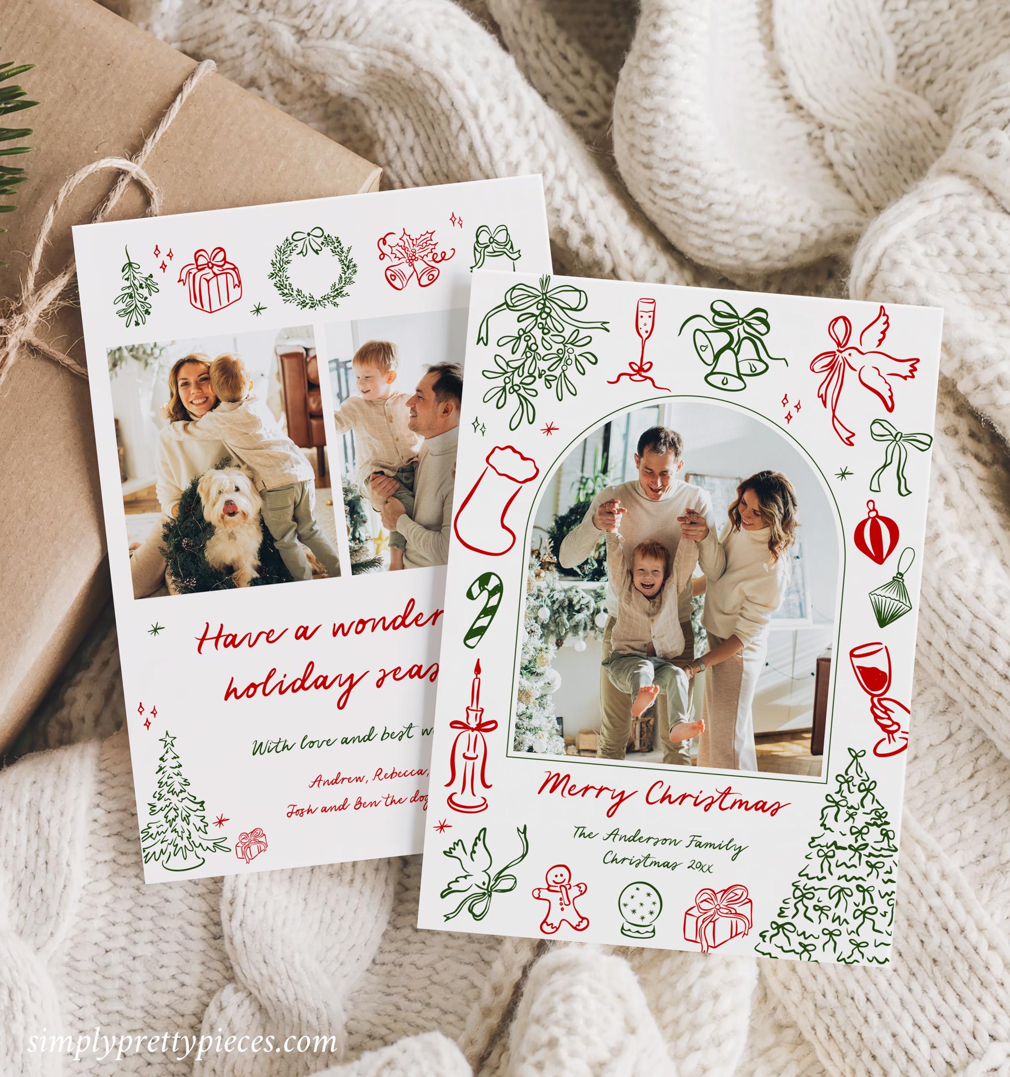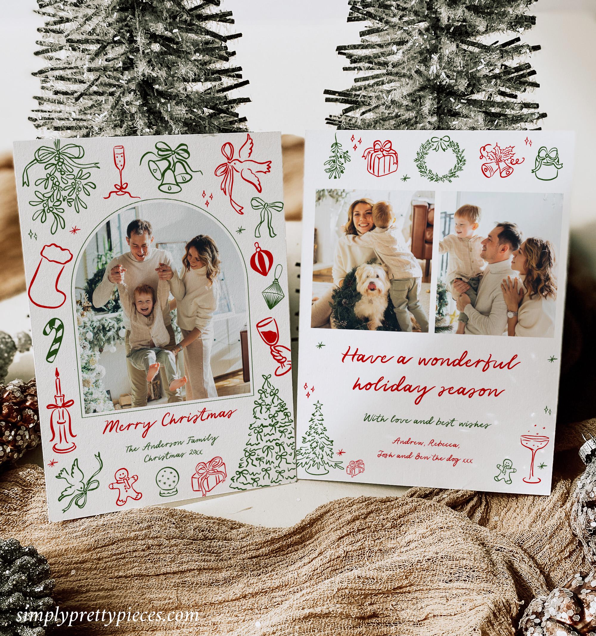 Whimsical holiday card template that has cute hand drawn illustrations, a red and green color palette and a hand written font. There is space for one photo on the front and two on the reverse. A template with additional photo reverse sides is also included so you have other layout options. This modern Christmas card is easy to edit and print and is the perfect way to send out holiday wishes to your family and friends.