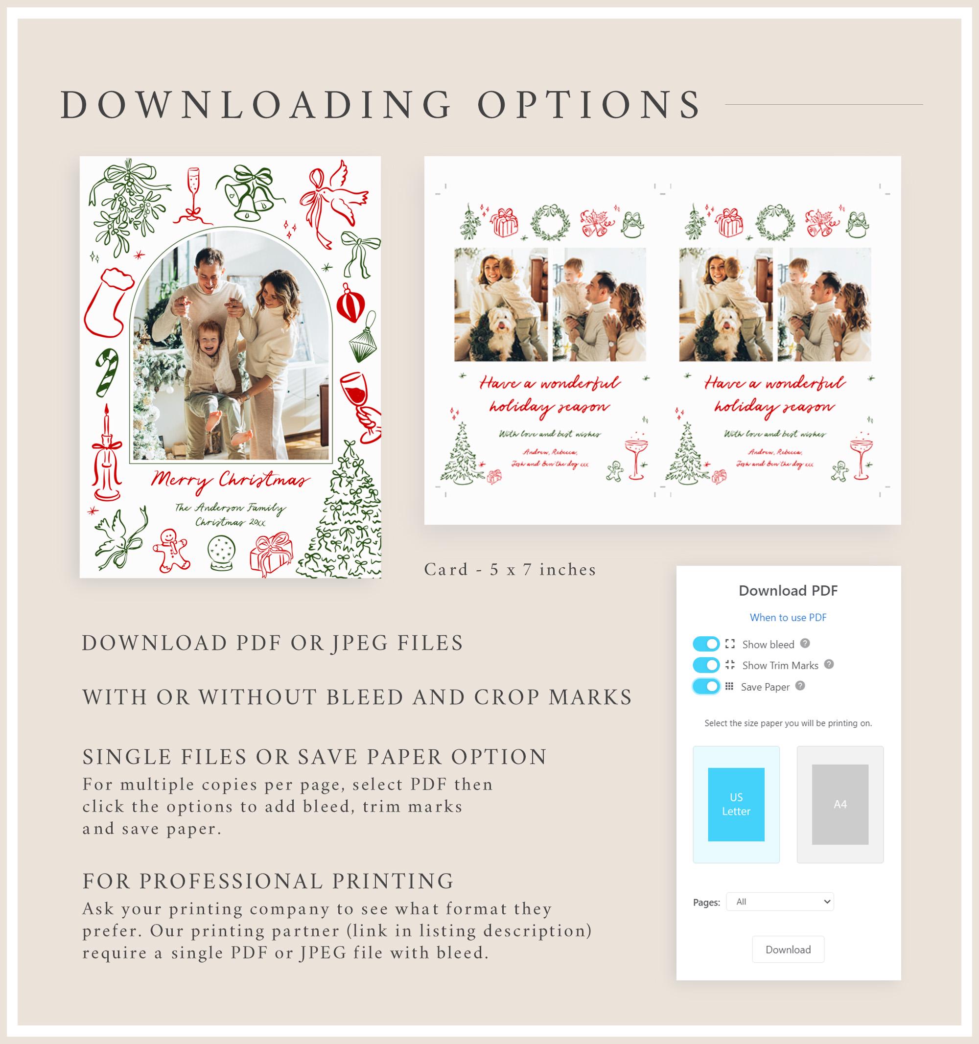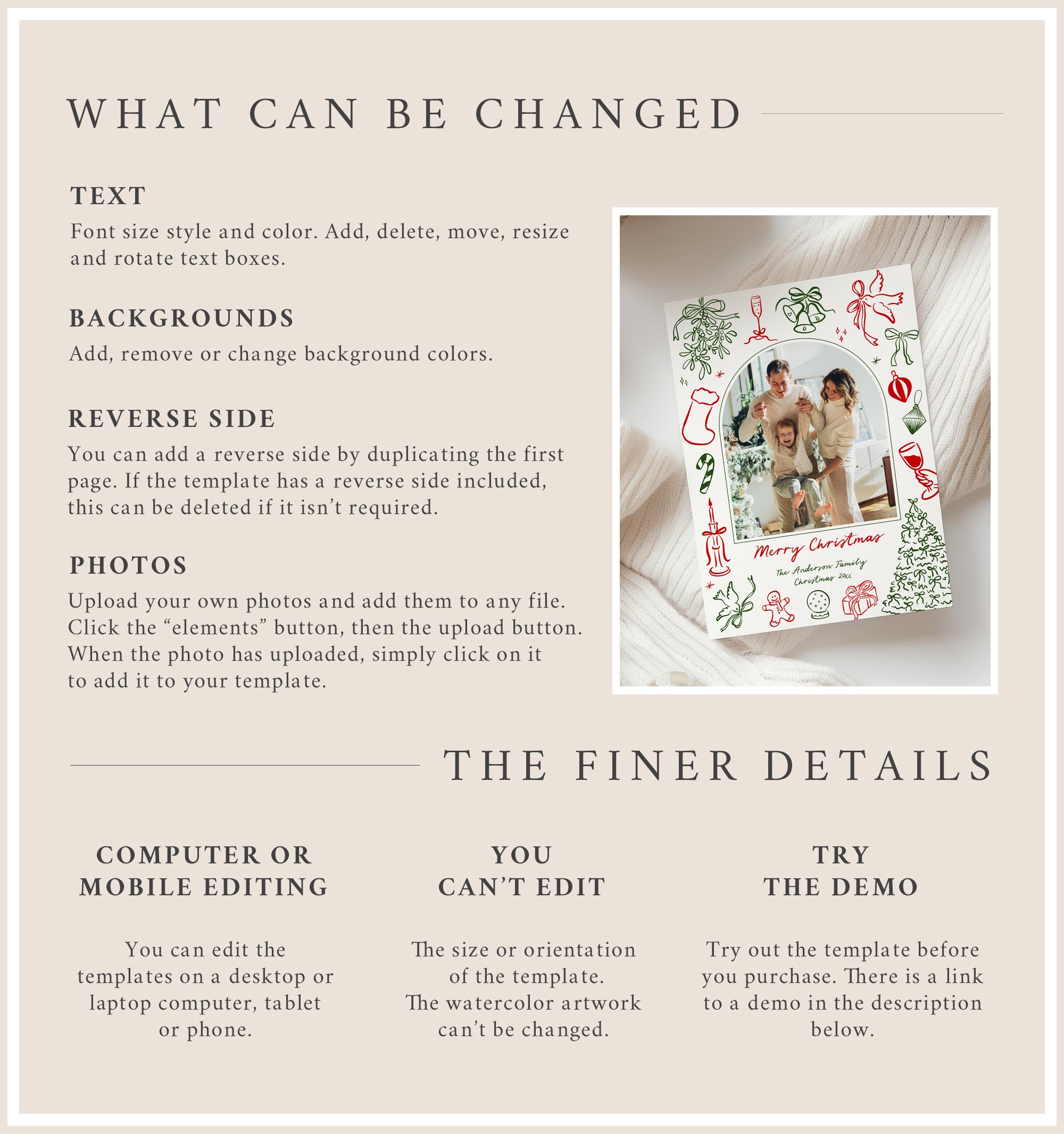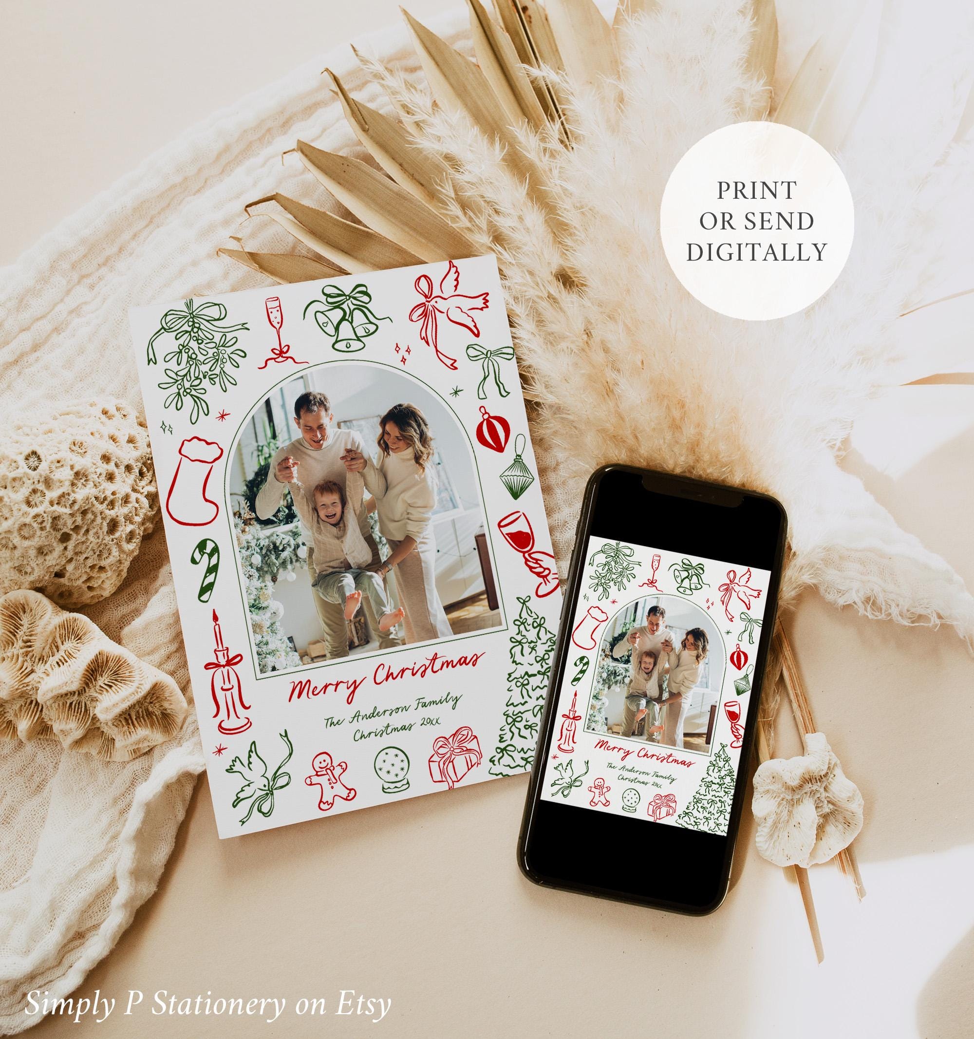 Whimsical holiday card template that has cute hand drawn illustrations, a red and green color palette and a hand written font. There is space for one photo on the front and two on the reverse. A template with additional photo reverse sides is also included so you have other layout options. This modern Christmas card is easy to edit and print and is the perfect way to send out holiday wishes to your family and friends.