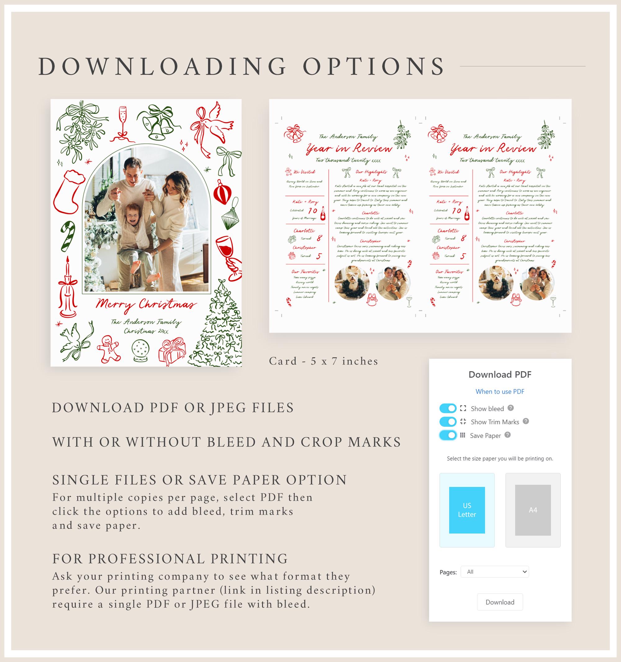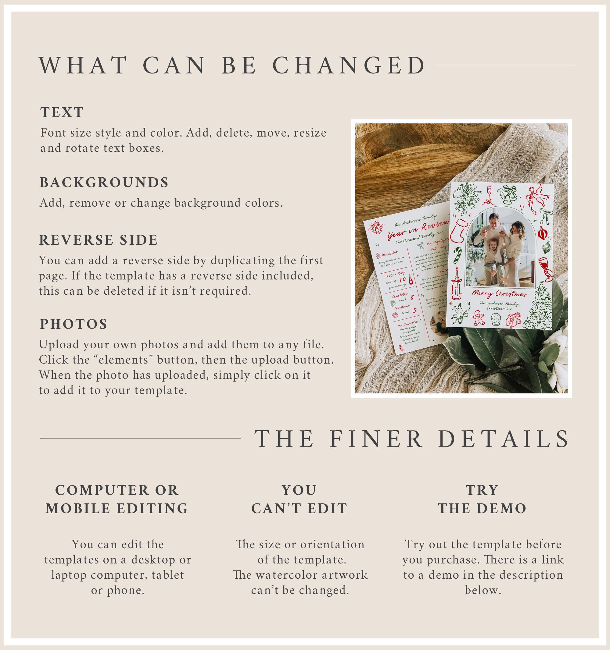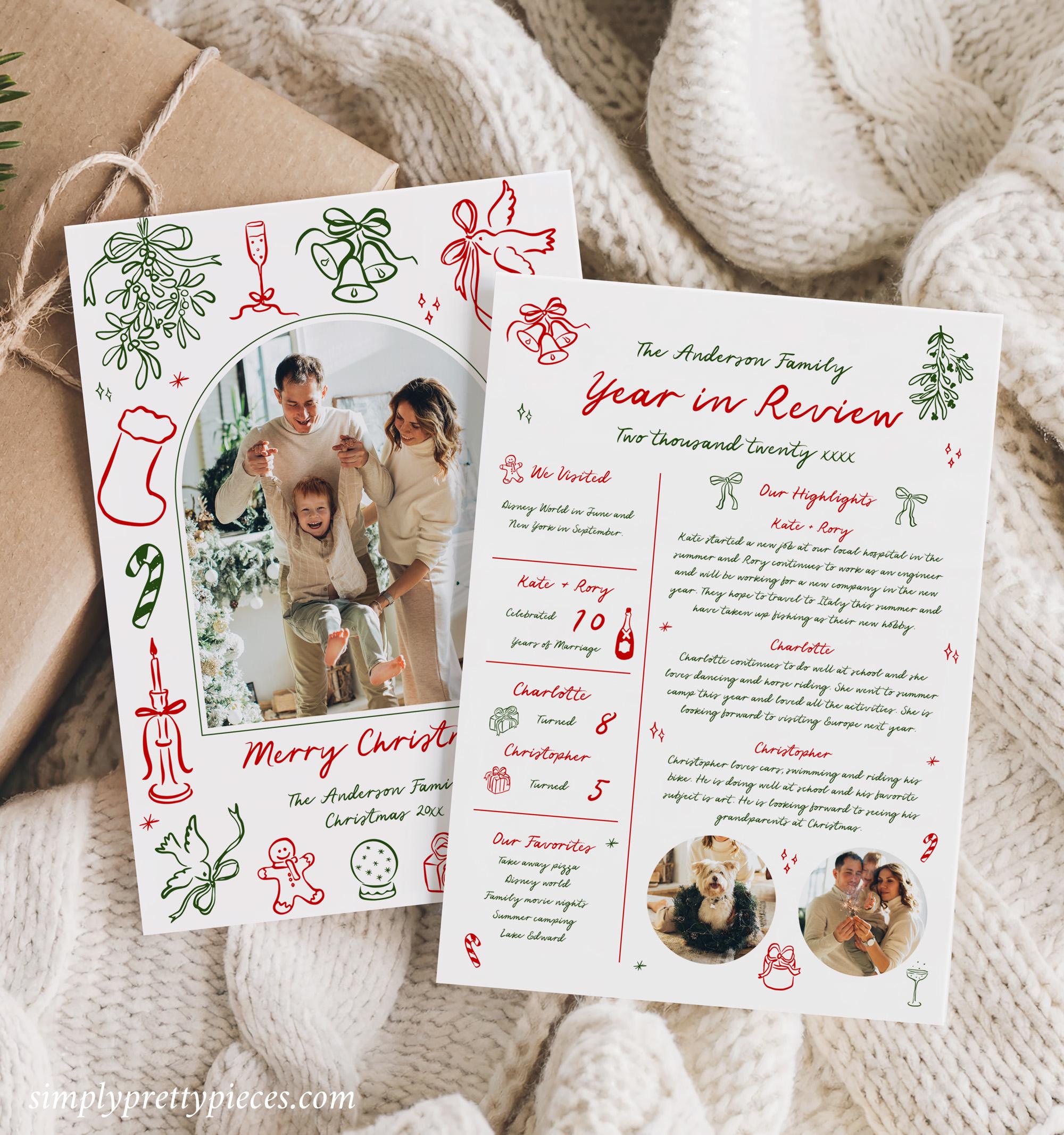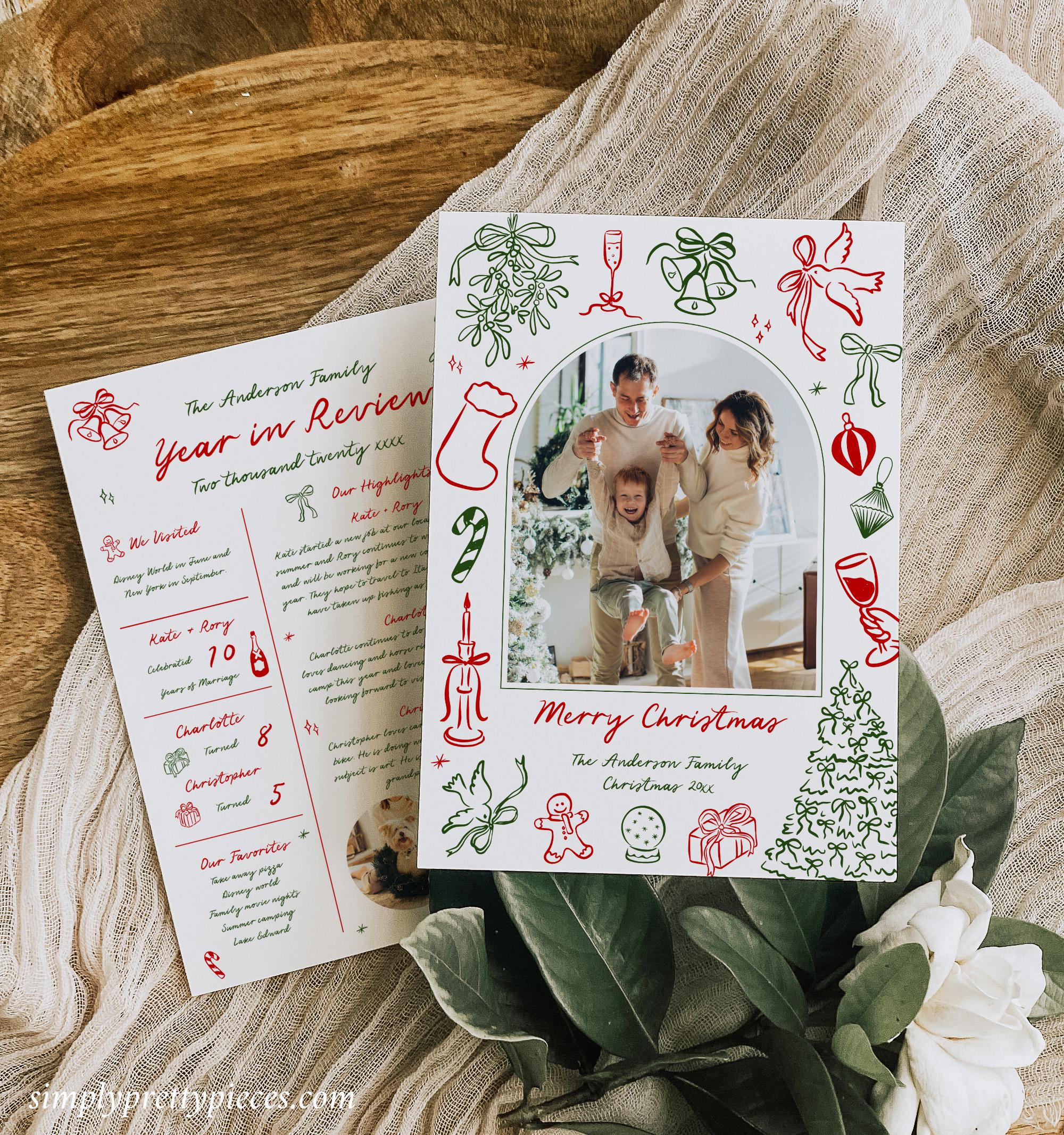 Editable year in review card template that has a quirky hand drawn design, a red and green color palette and a modern font. There is space for one photo on the front and two on the reverse. This holiday card is easy to edit and print and a is the perfect way to send Christmas wishes to family and friends.