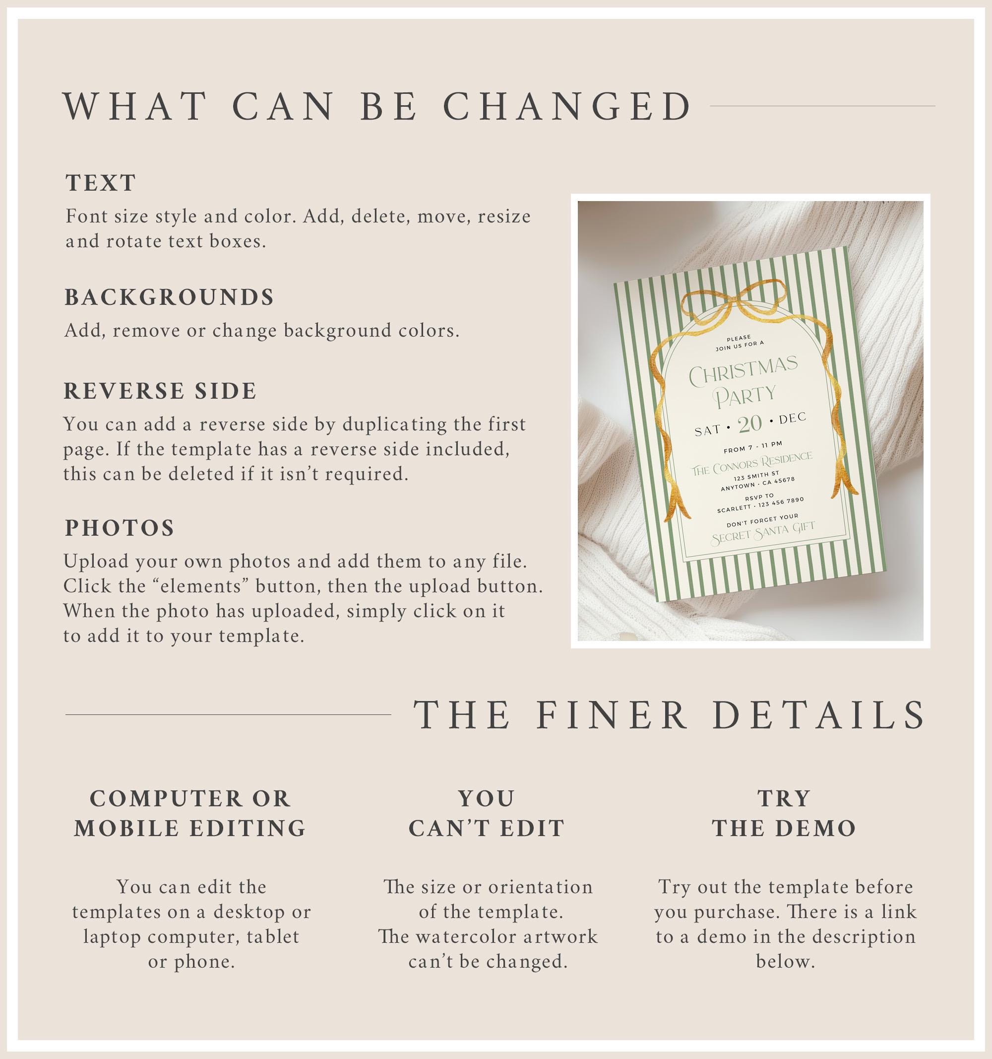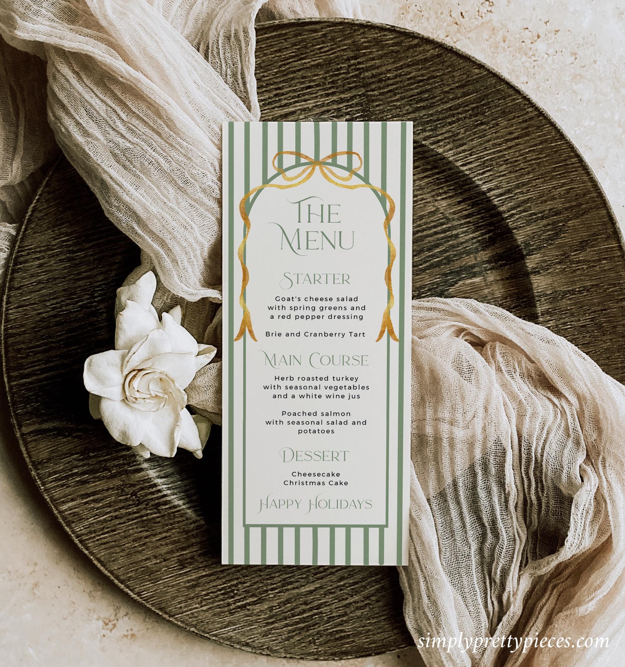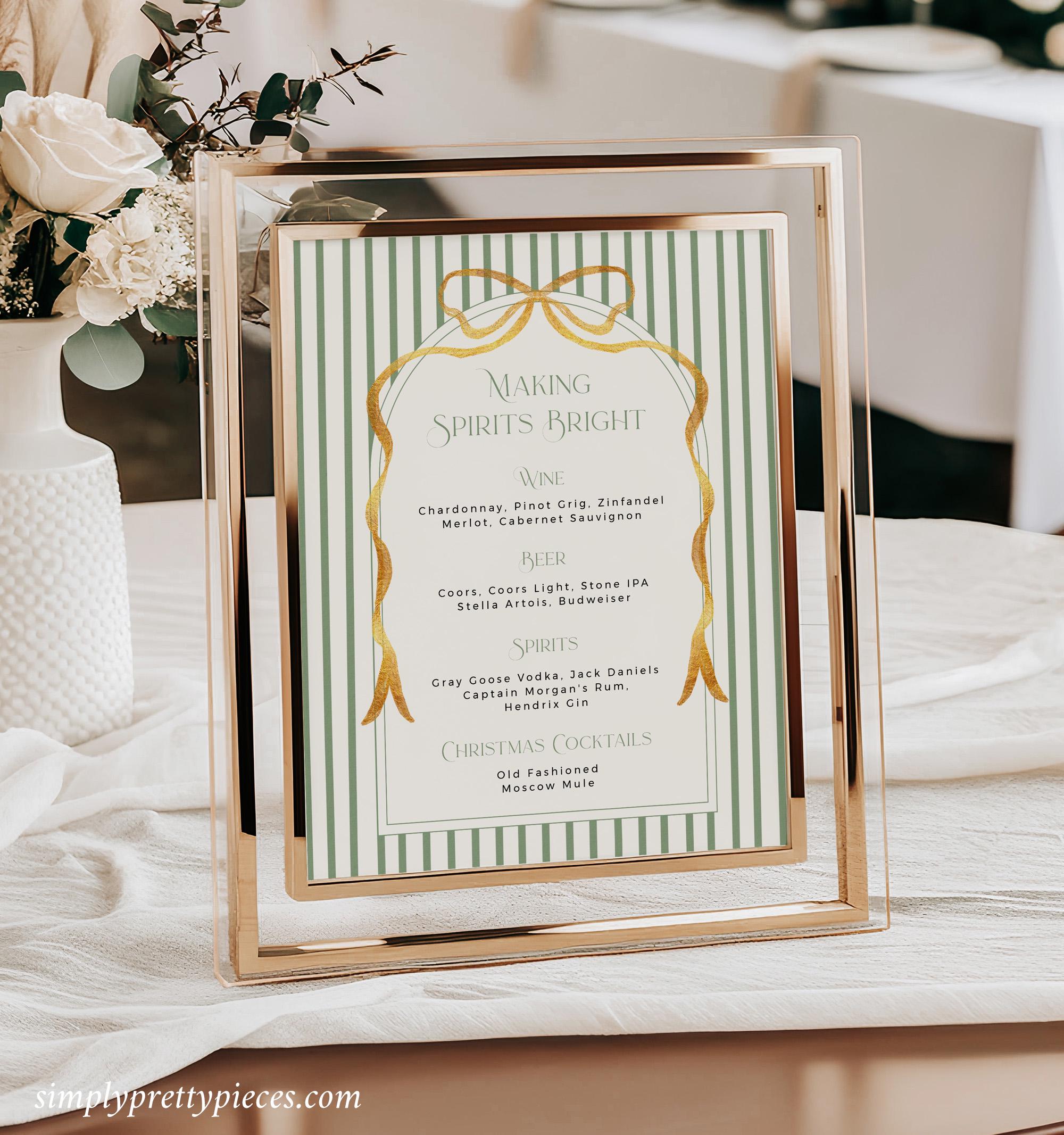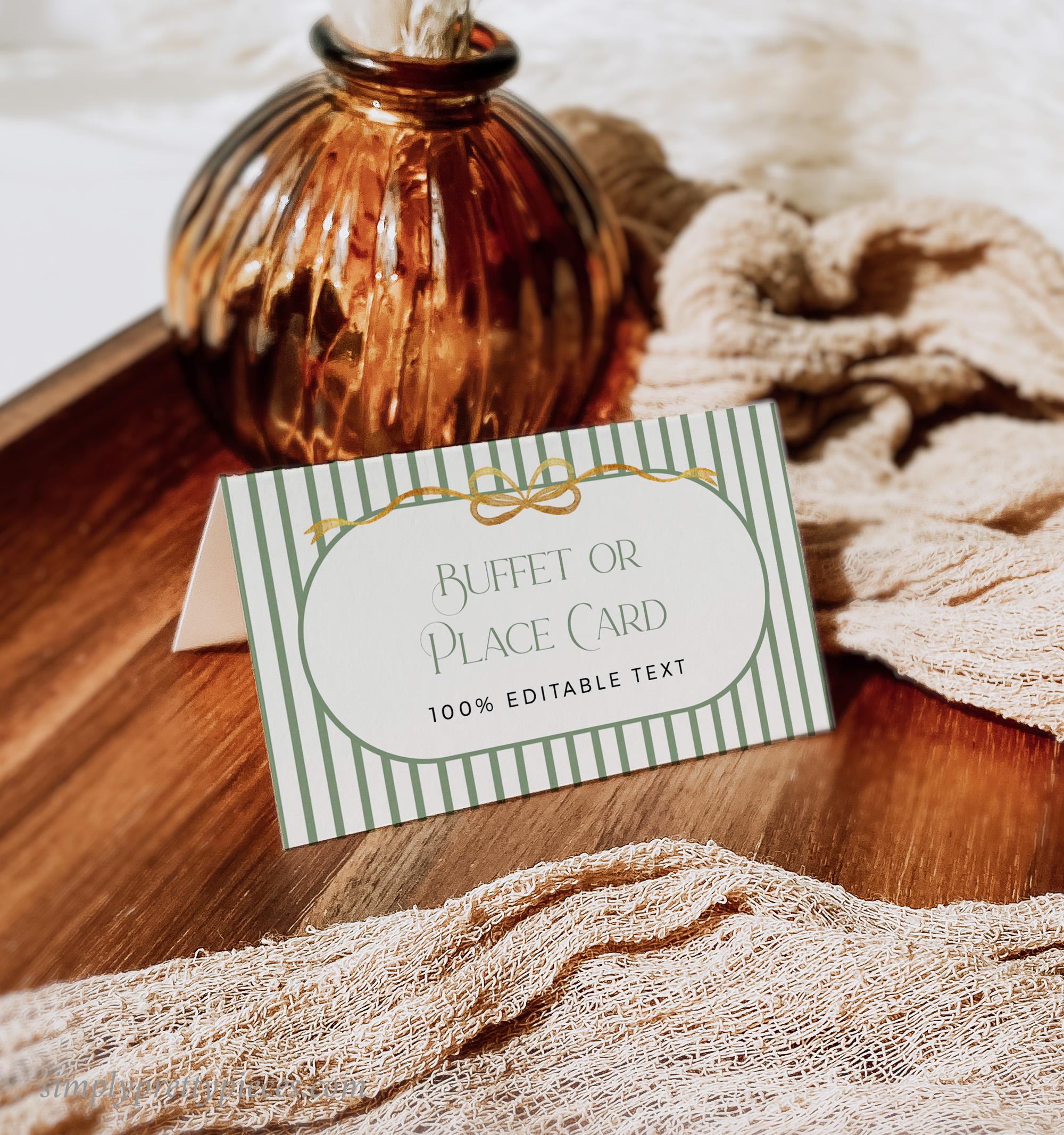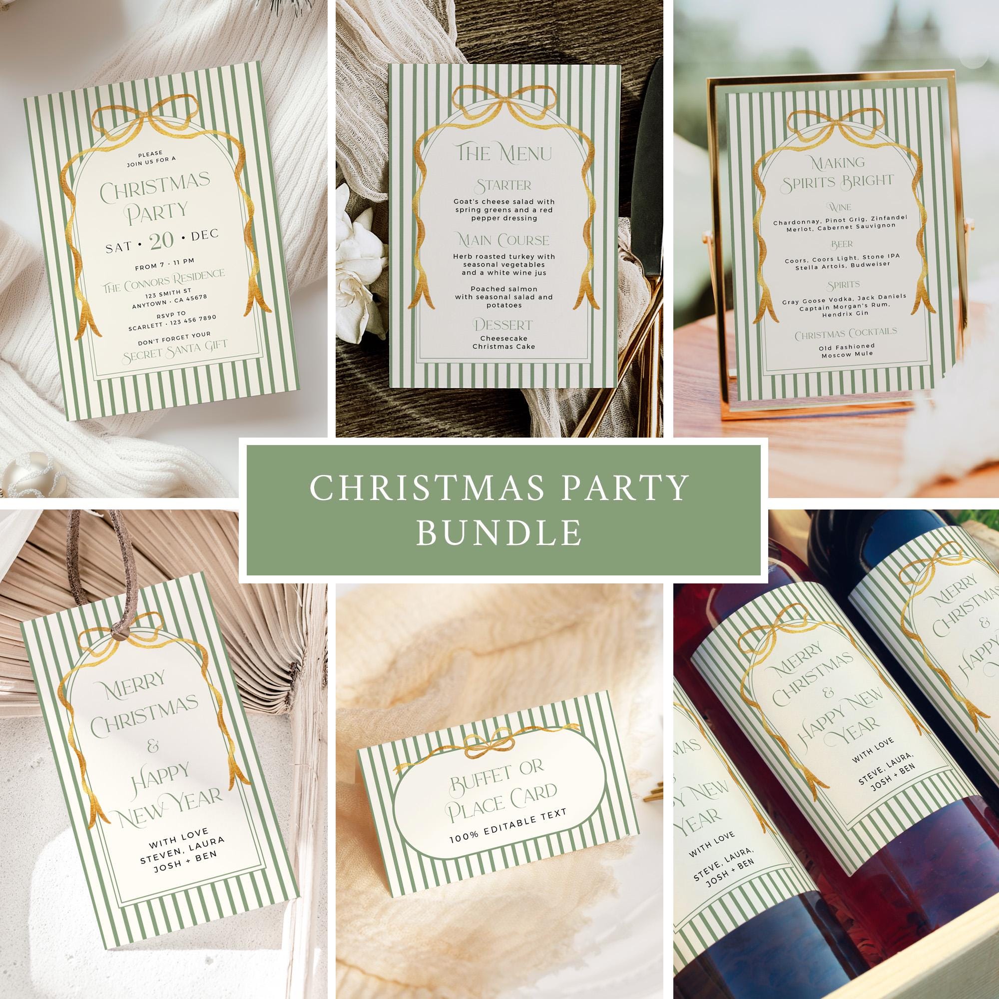 Printable Christmas party bundle that has a vintage green stripe design with a gold bow and a modern font. Included are templates for an invitation, menu, tags, buffet decor etc. They are easy to edit and print and you can create everything you need for your holiday party or event.
