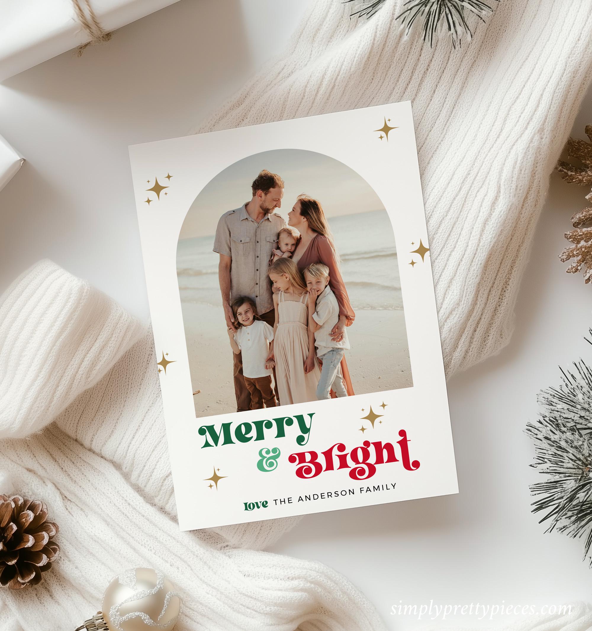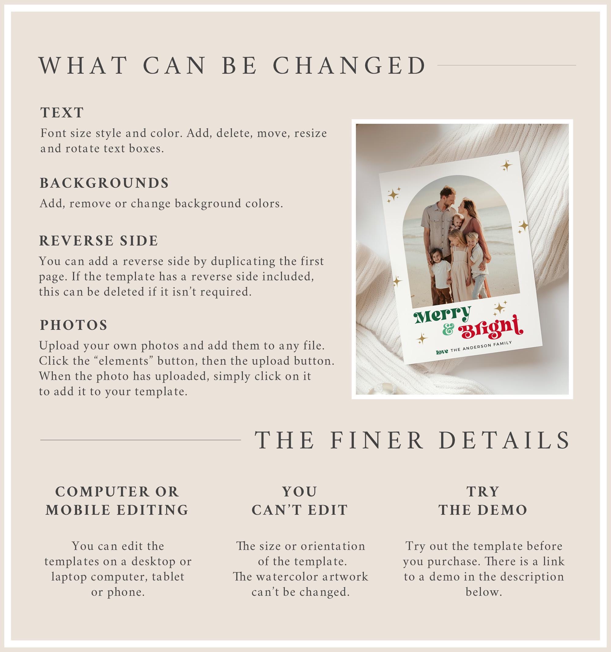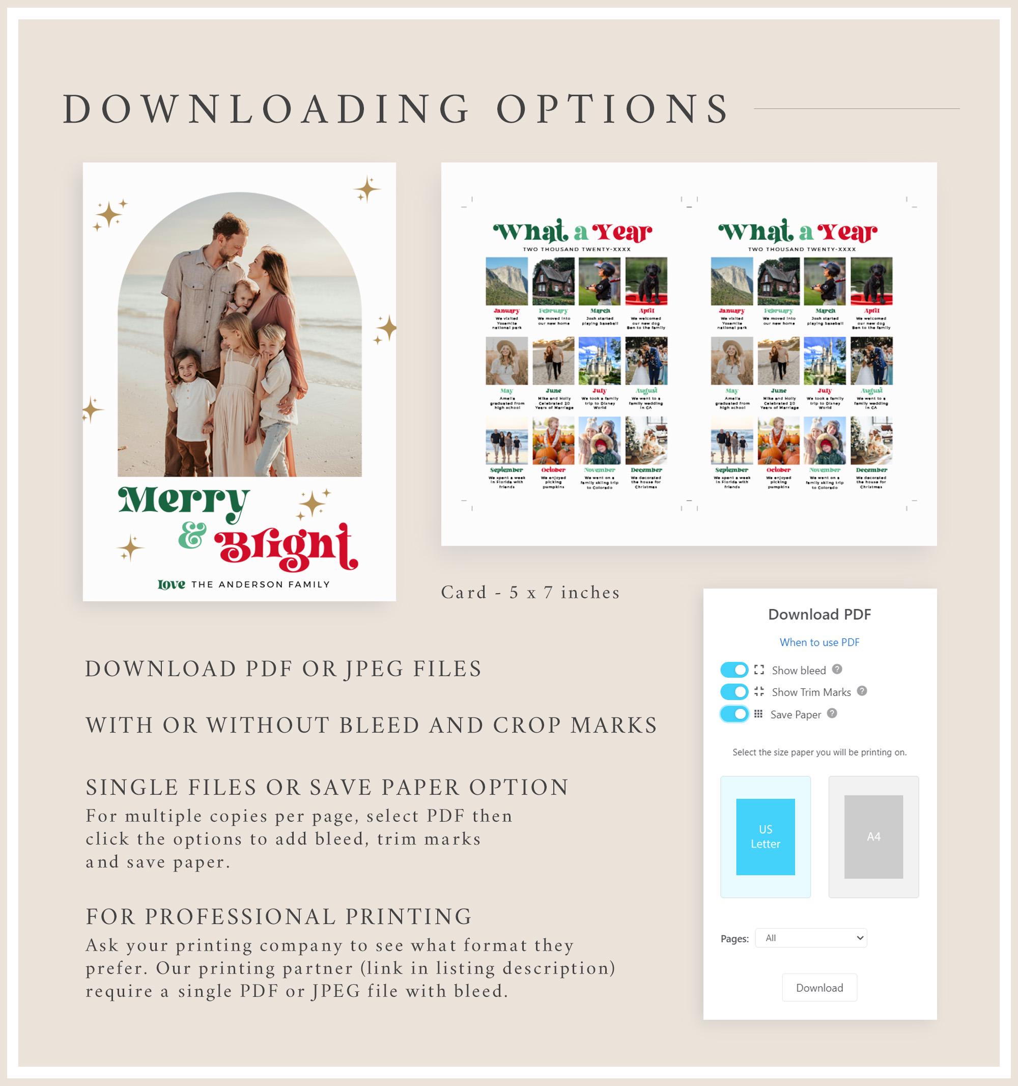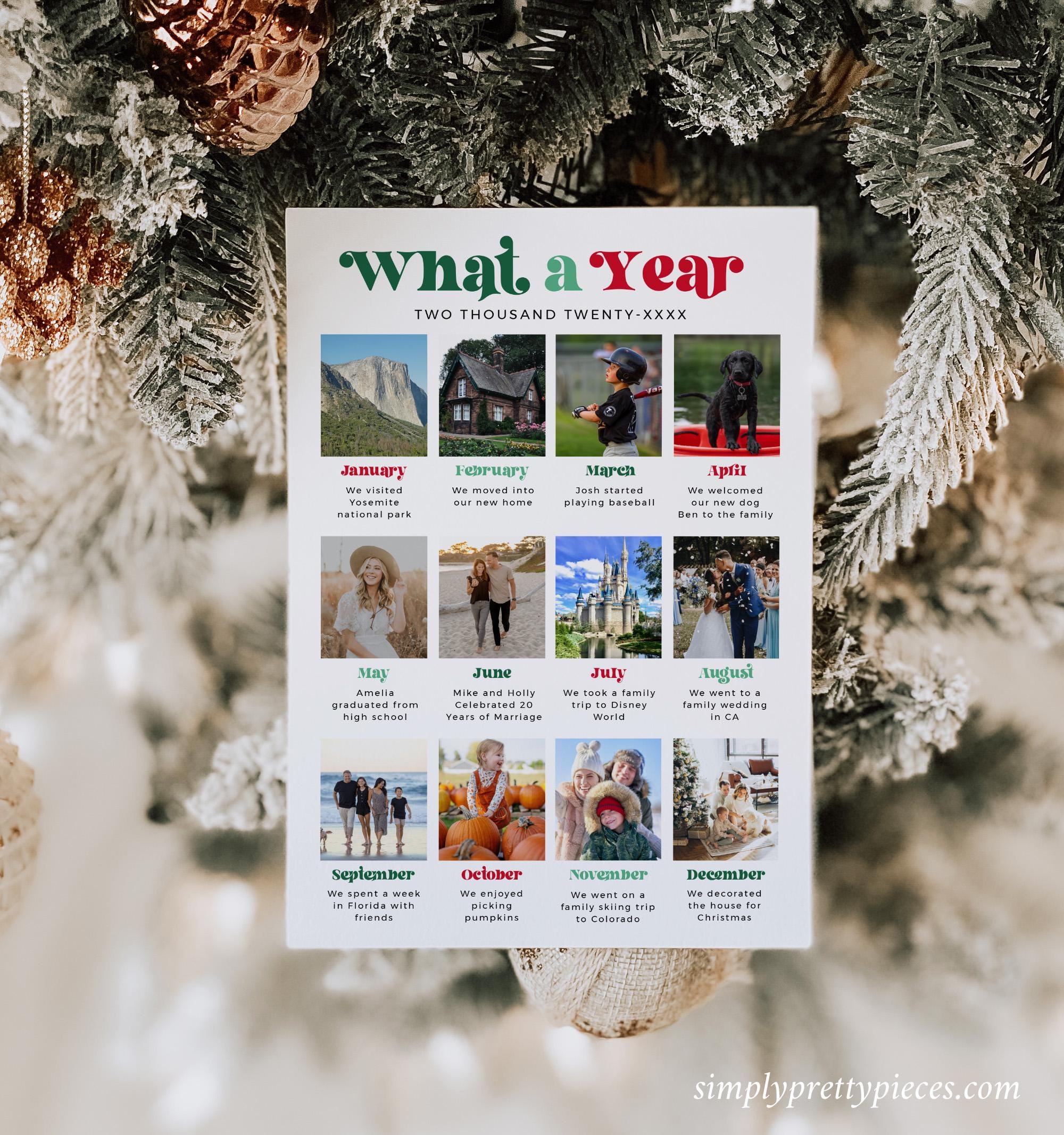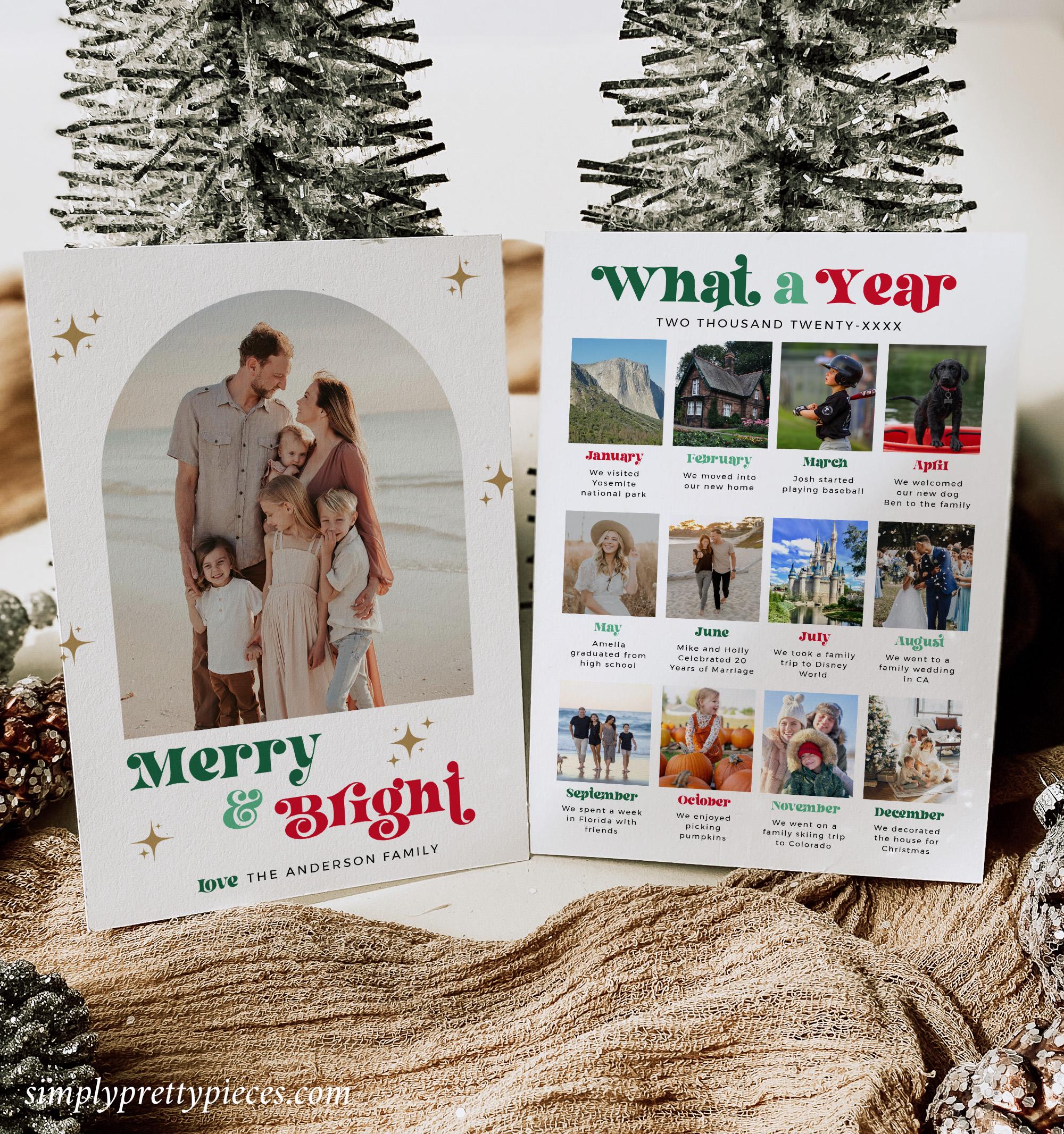 Printable retro year in review Christmas card template that has a modern design, a bright green, red and gold color palette and a retro font. There is space for one photo on the front and twelve on the reverse. A template with additional photo reverse sides is also included so you have other layout options. This overview of the year card is easy to edit and print and is the perfect way to send your Christmas wishes to family and friends.