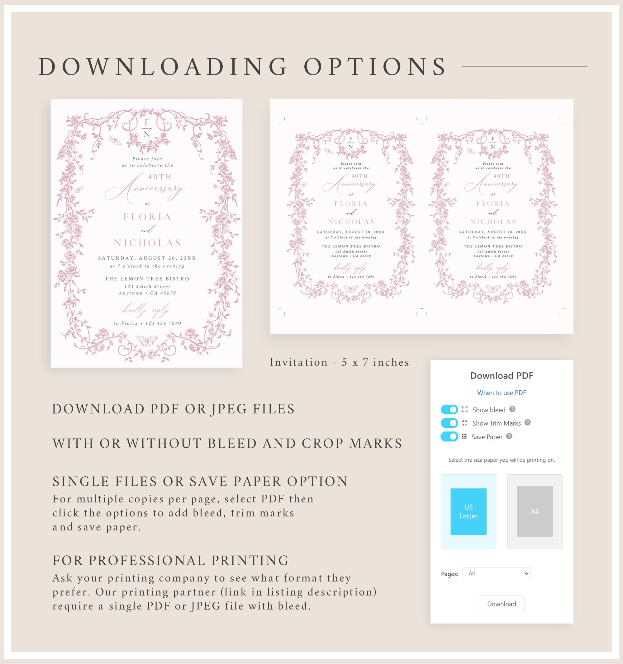 Editable wedding anniversary party invitation template that has a French toile de jouy design with an optional monogram reverse side. The pretty chinoiserie graphics have a muted dusty pink color palette and it is accented with a modern calligraphy font. All the text can be edited so it can be changed for any wedding anniversary celebration. Perfect for a summer anniversary party or event.