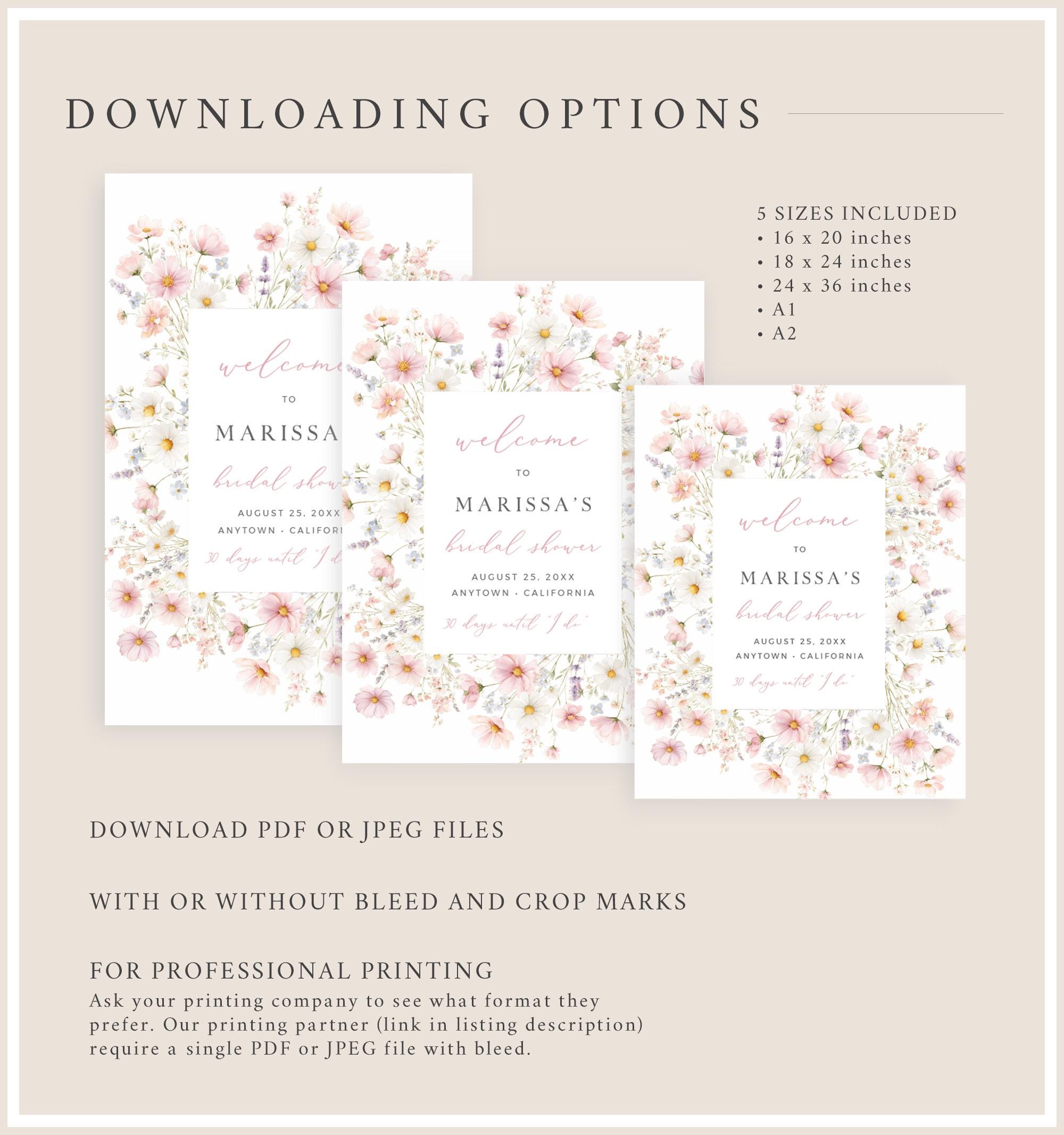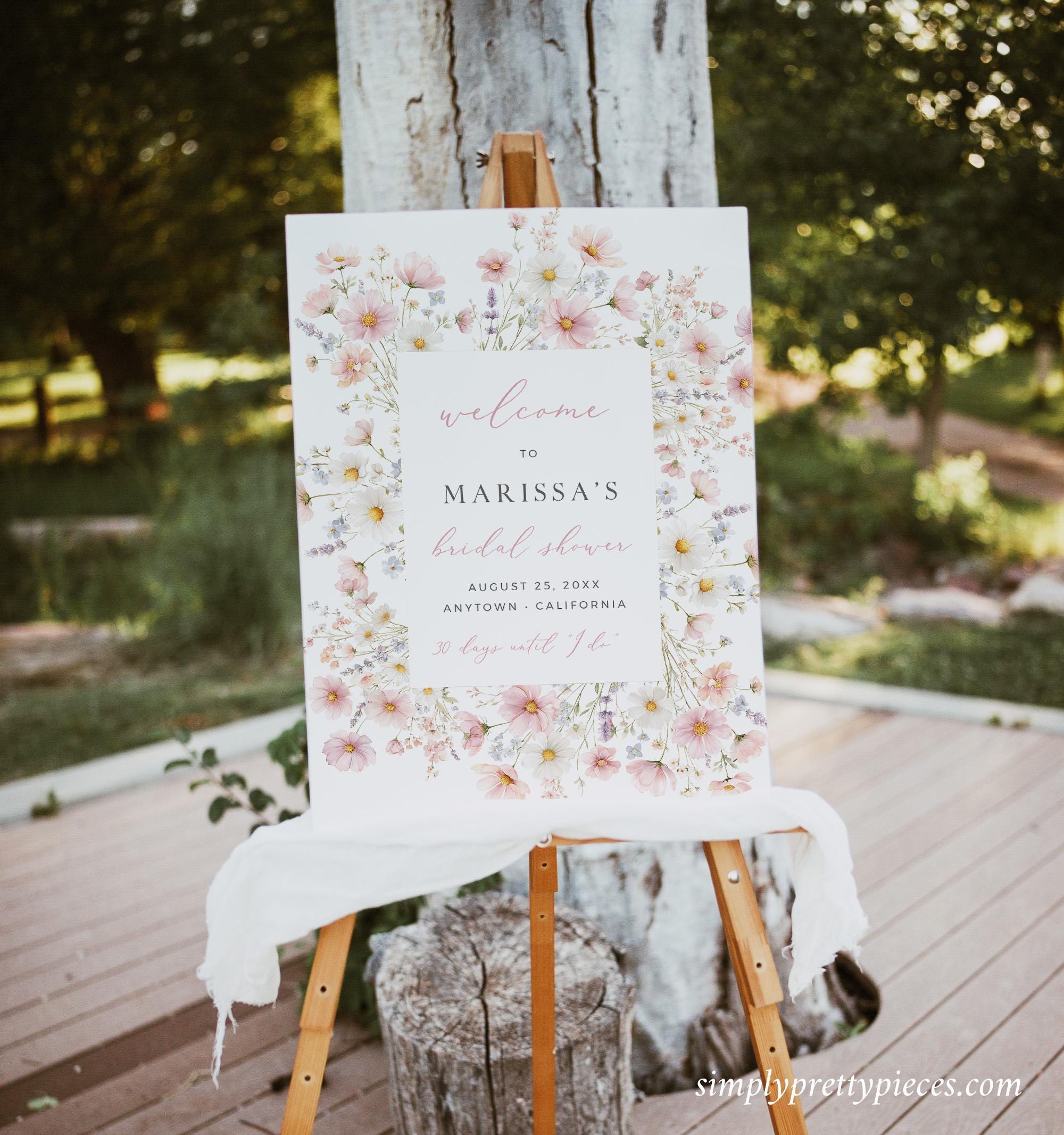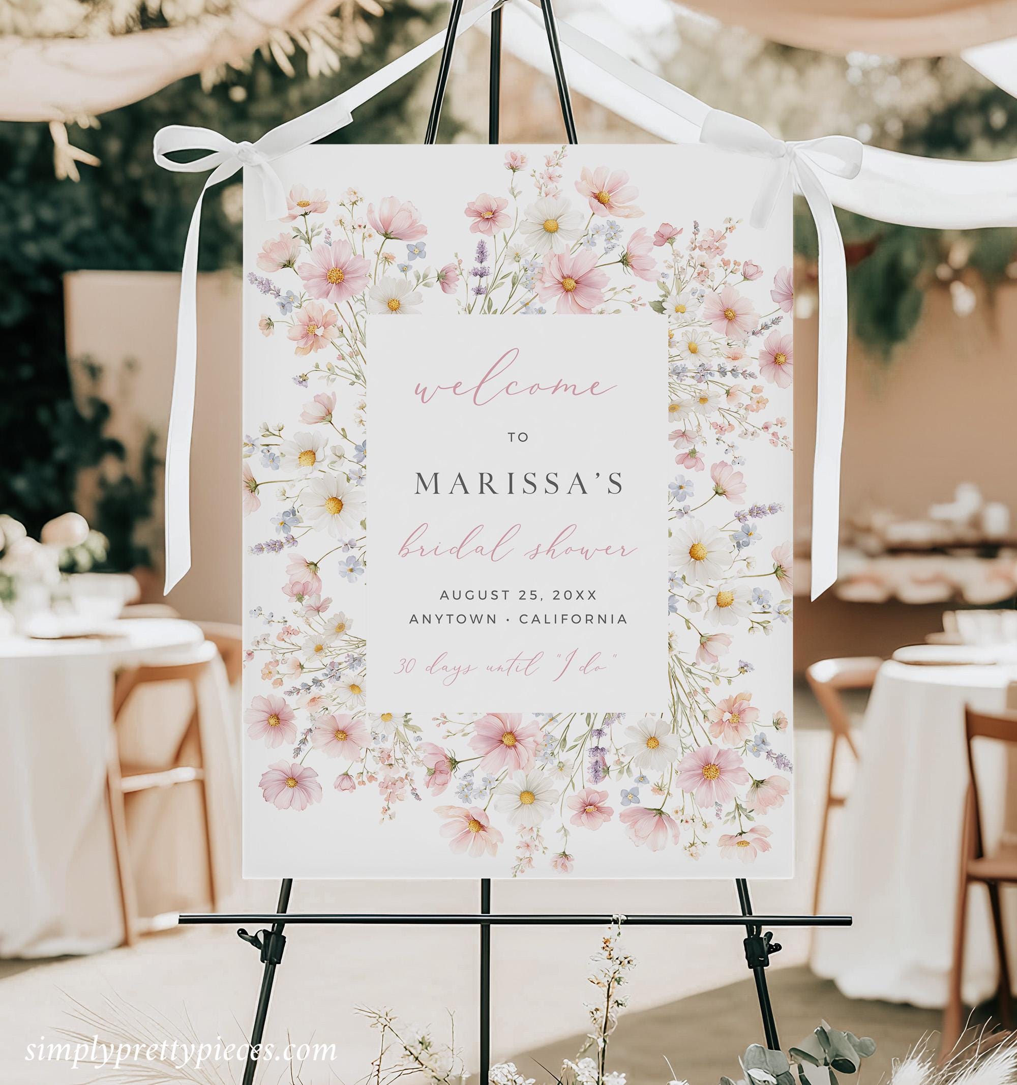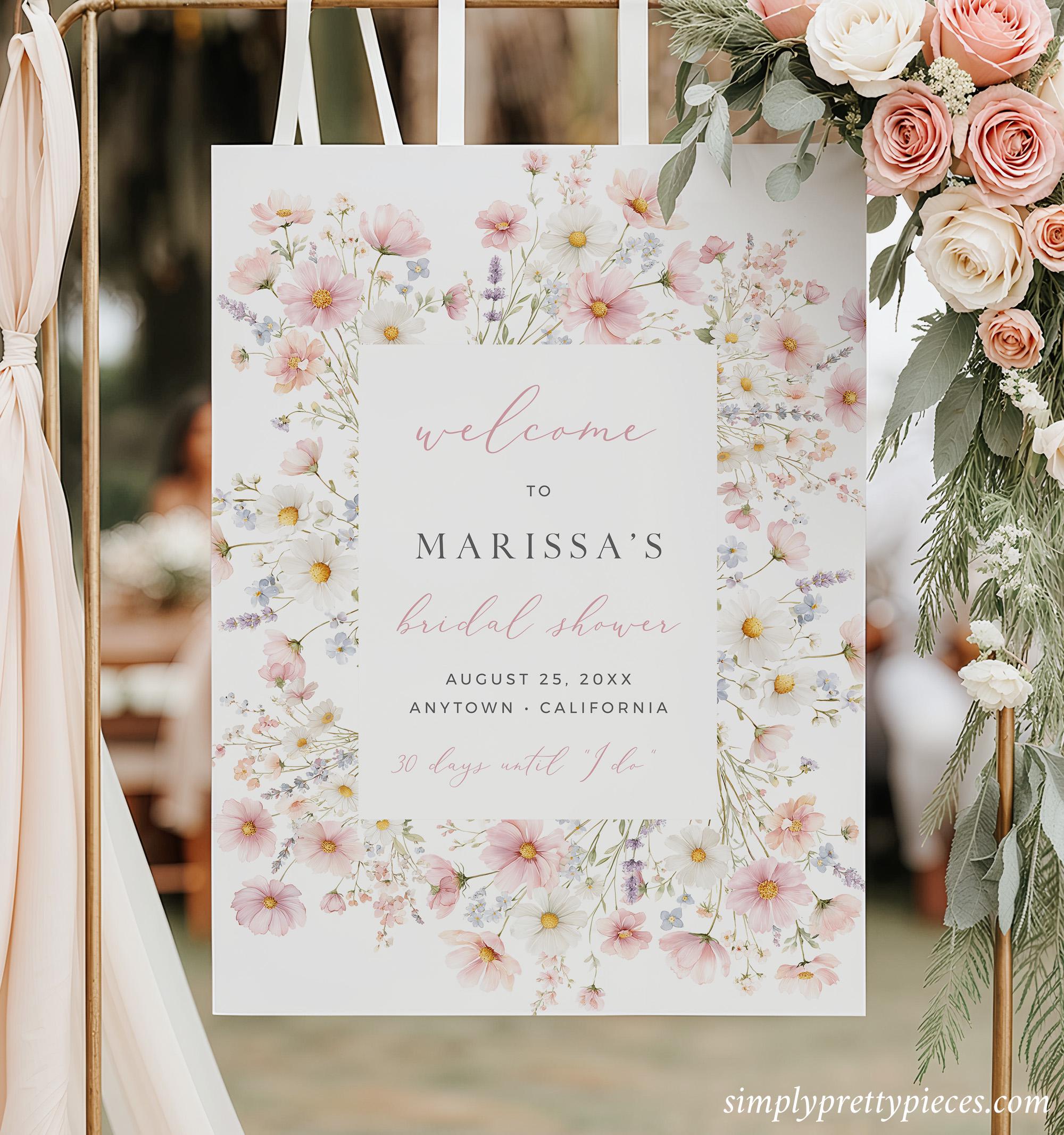 Printable bridal shower welcome sign template that has a wildflower design and a modern font. It has a soft blush pink, blue, lilac, yellow and green color palette and it has the convenience of being an instant download. It is easy to edit and will look perfect displayed at the entrance to your bridal shower.