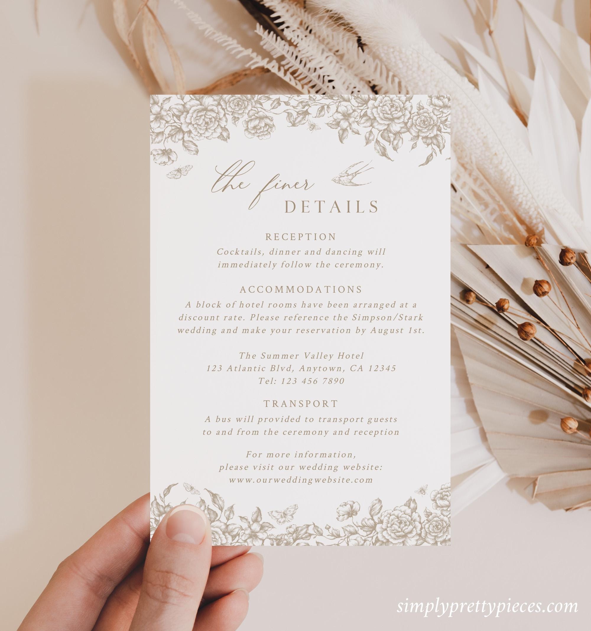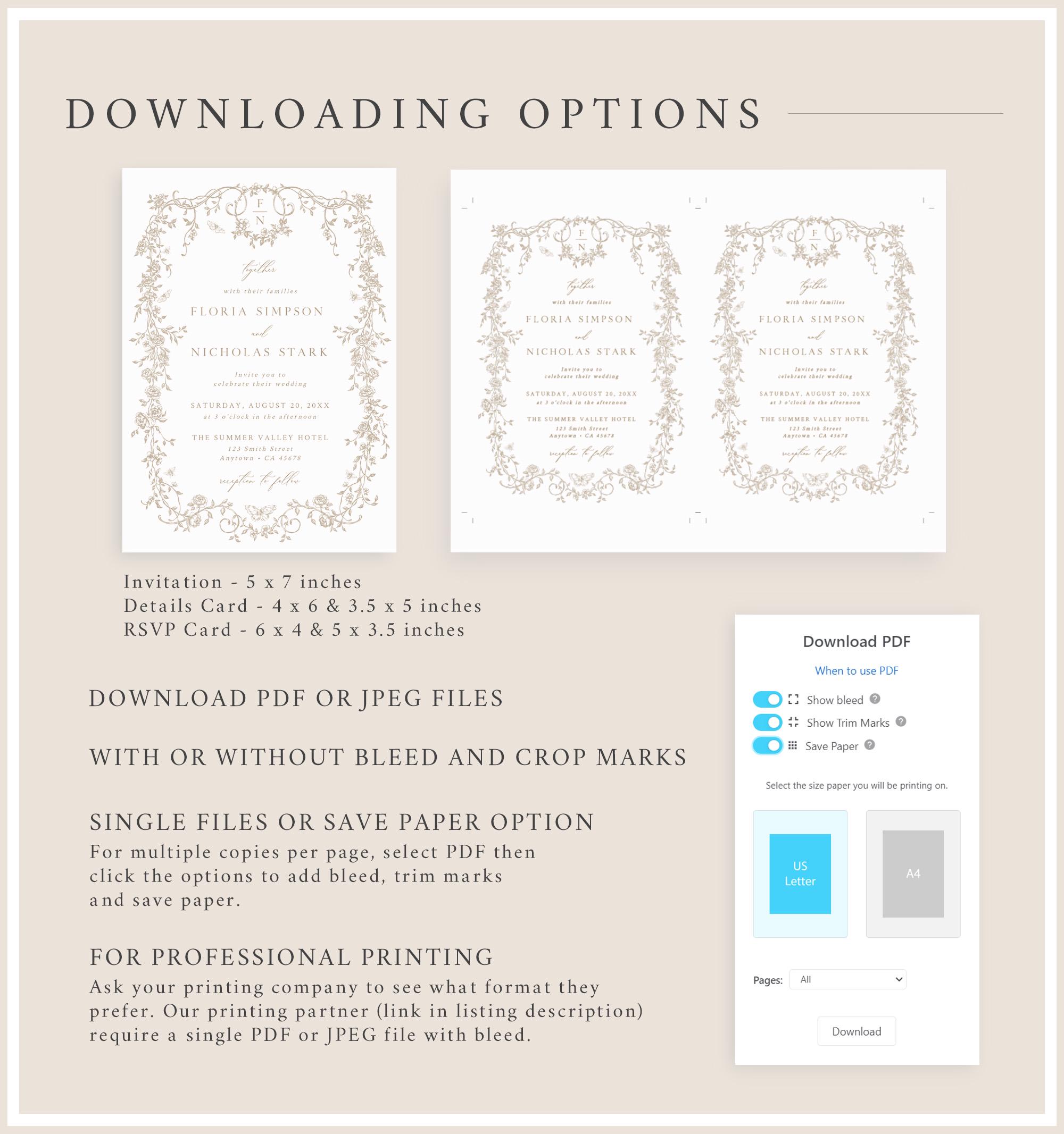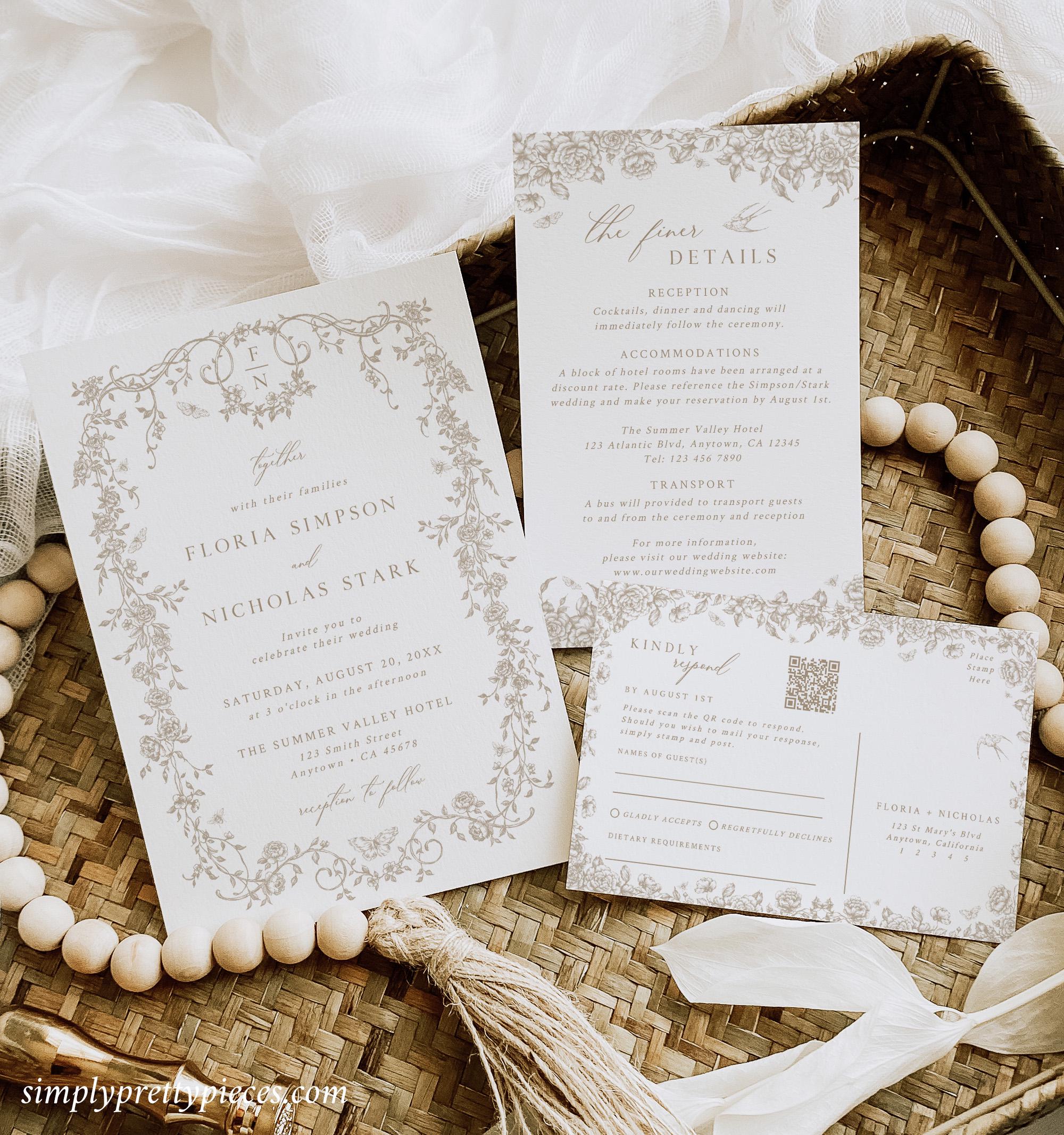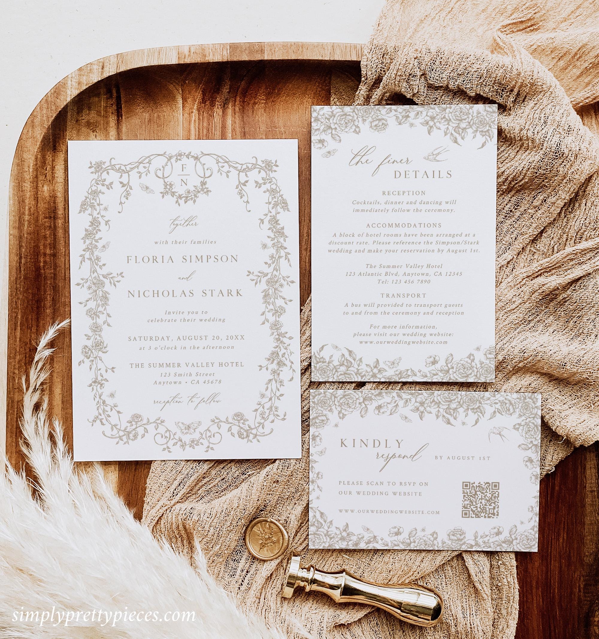 Printable wedding invitation suite that has a vintage chinoiserie design, a soft neutral beige color palette and a stylish calligraphy font. It is easy to edit and print and the invitation has an optional monogram reverse side. This pretty toile de jouy wedding suite includes an invitation, details card, RSVP with QR code and an RSVP postcard.