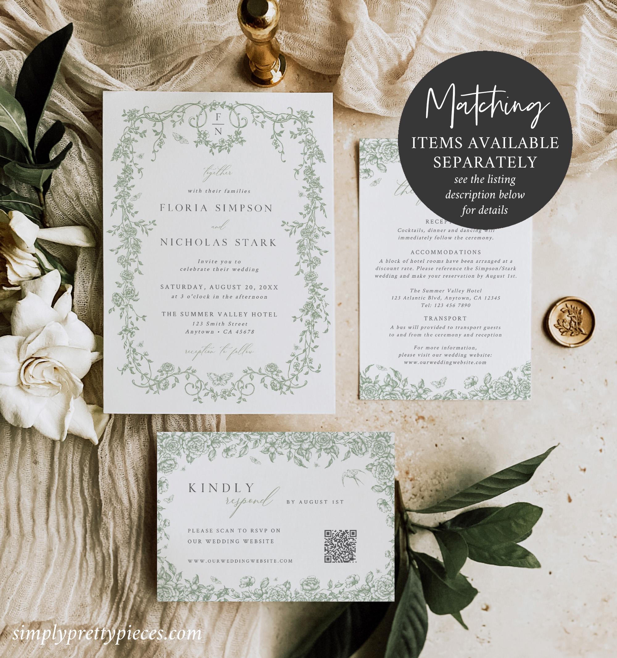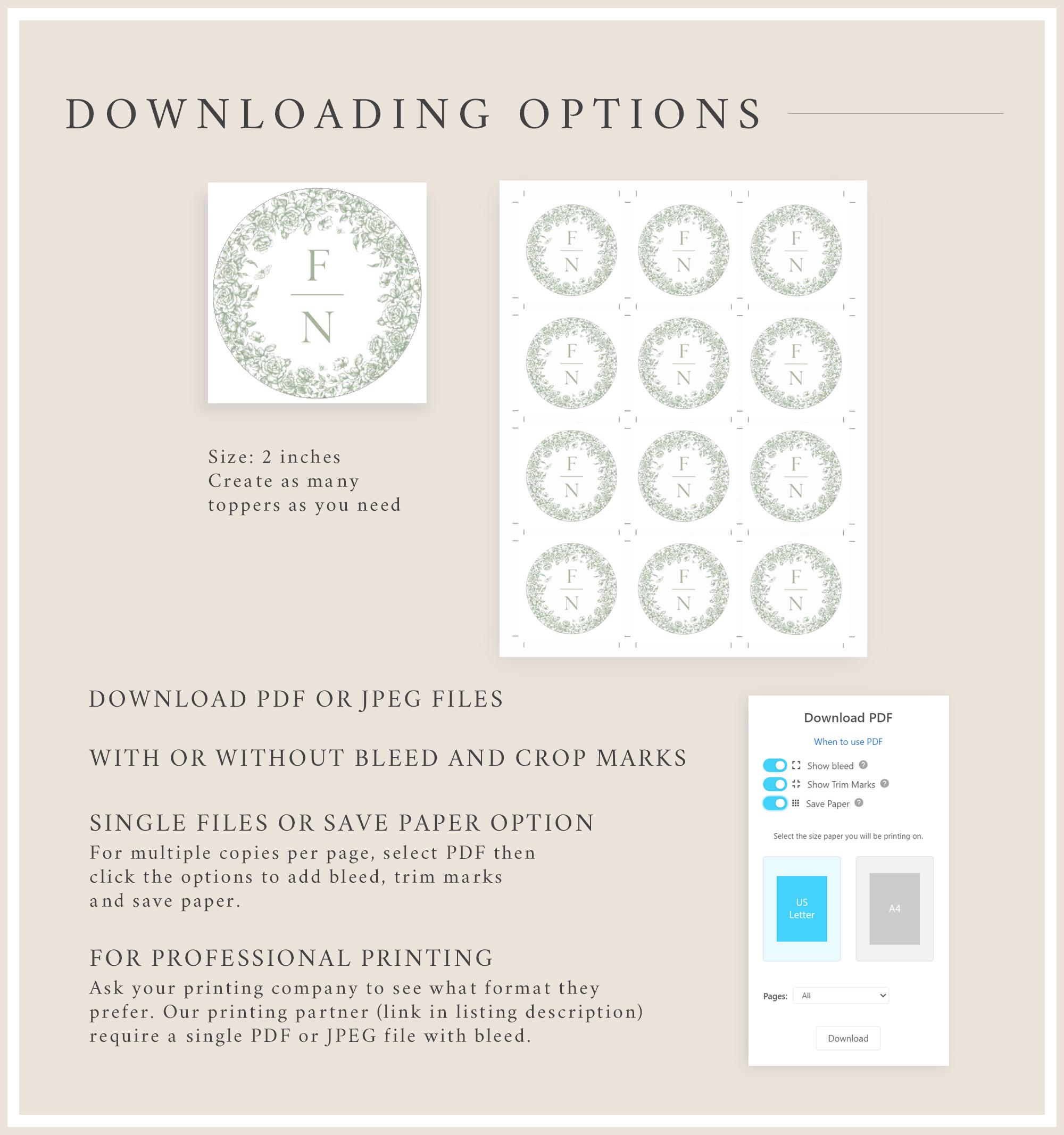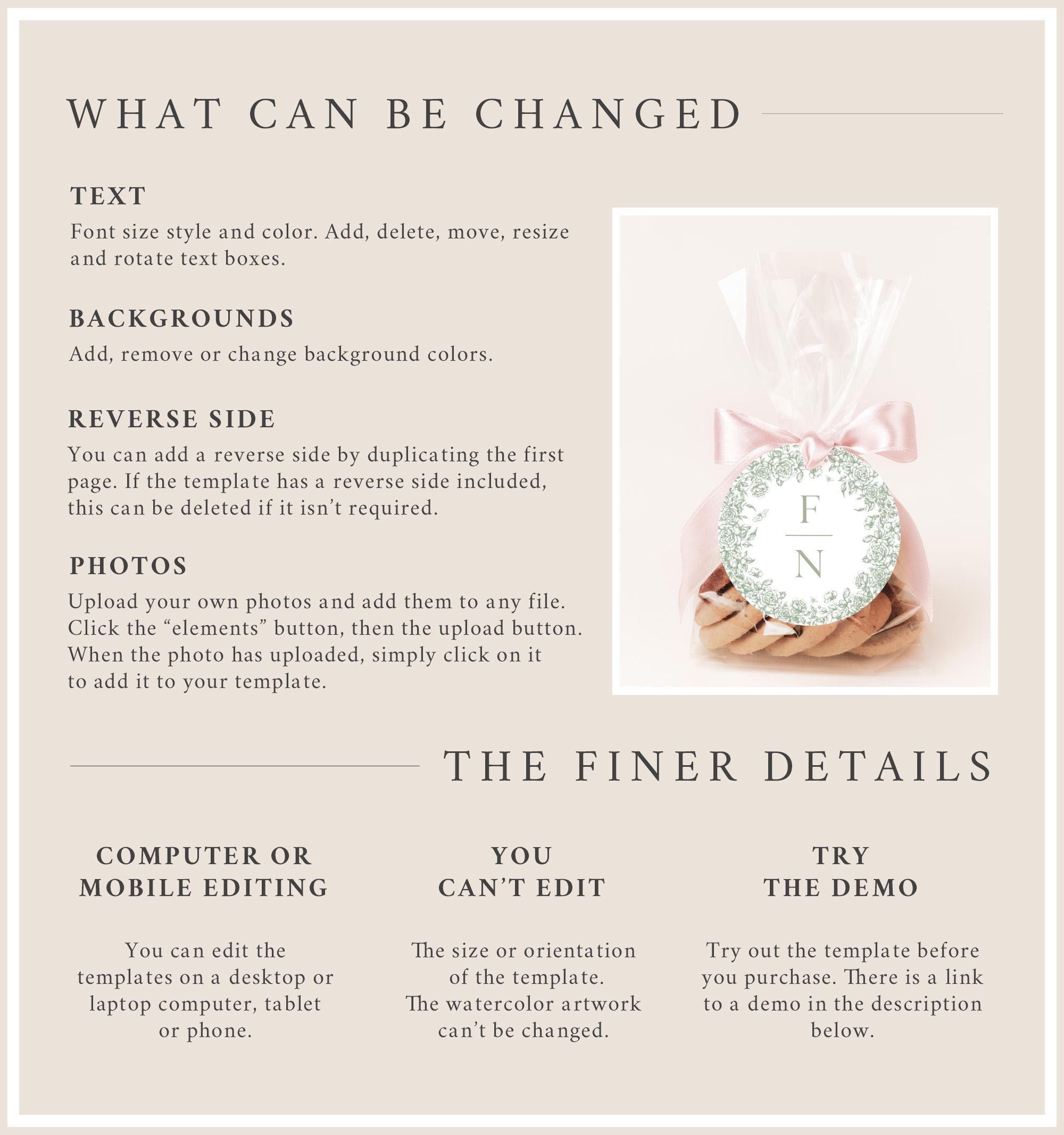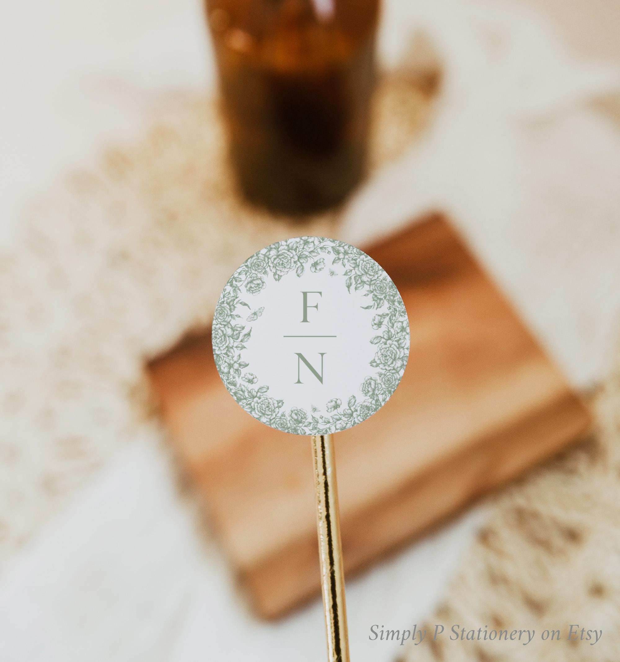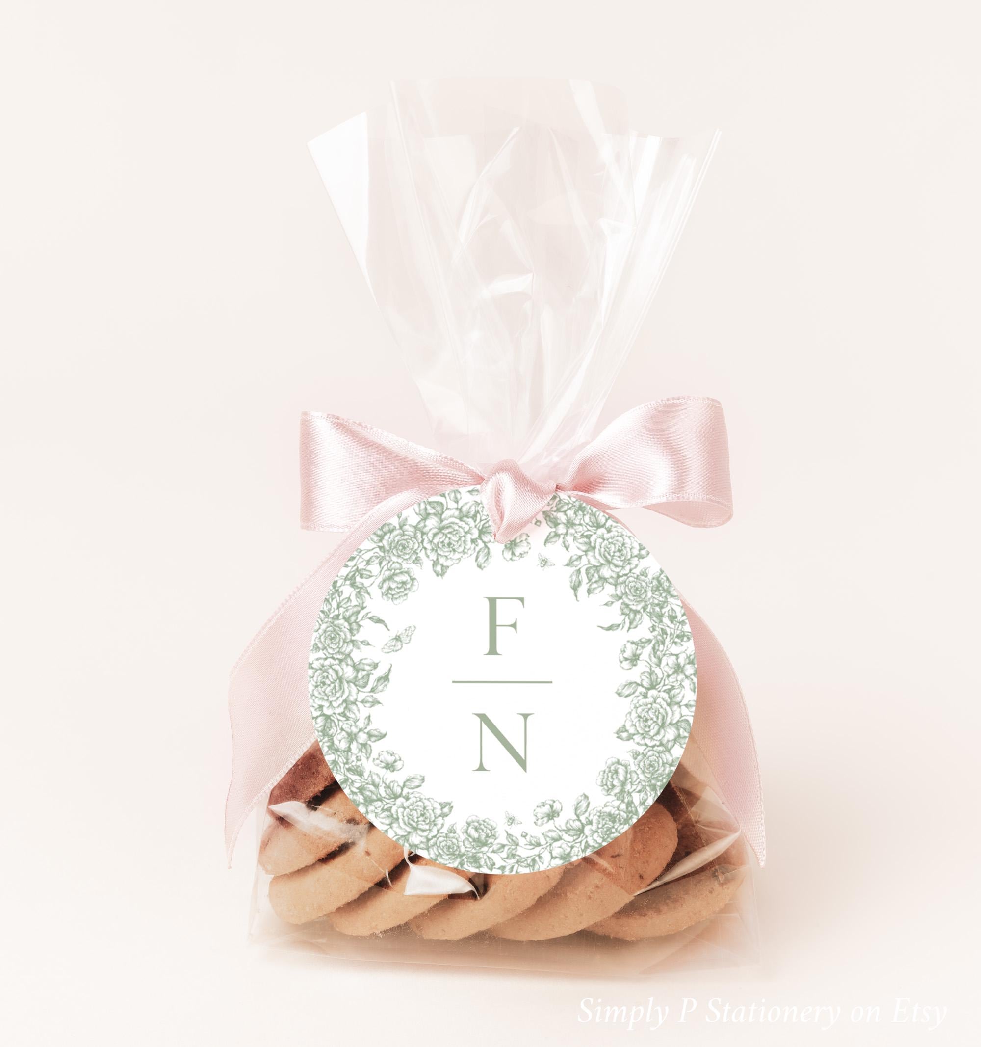 Printable round favor tag template that has a toile de jouy design, a soft sage green color palette and a modern font. All the text is editable and you can create all the tags or stickers you need. They are ideal for wedding favors, bridal shower favors or gift tags.