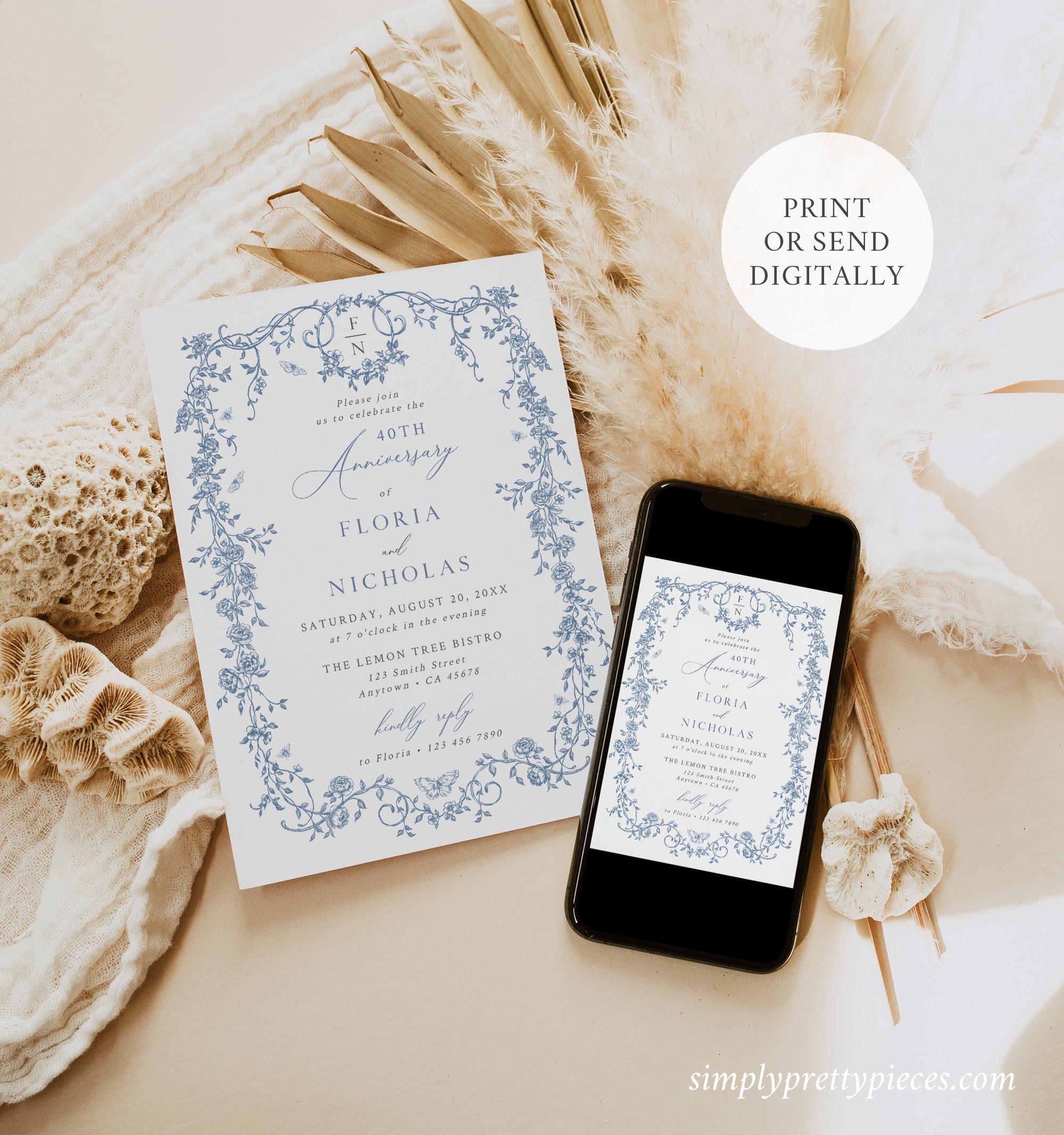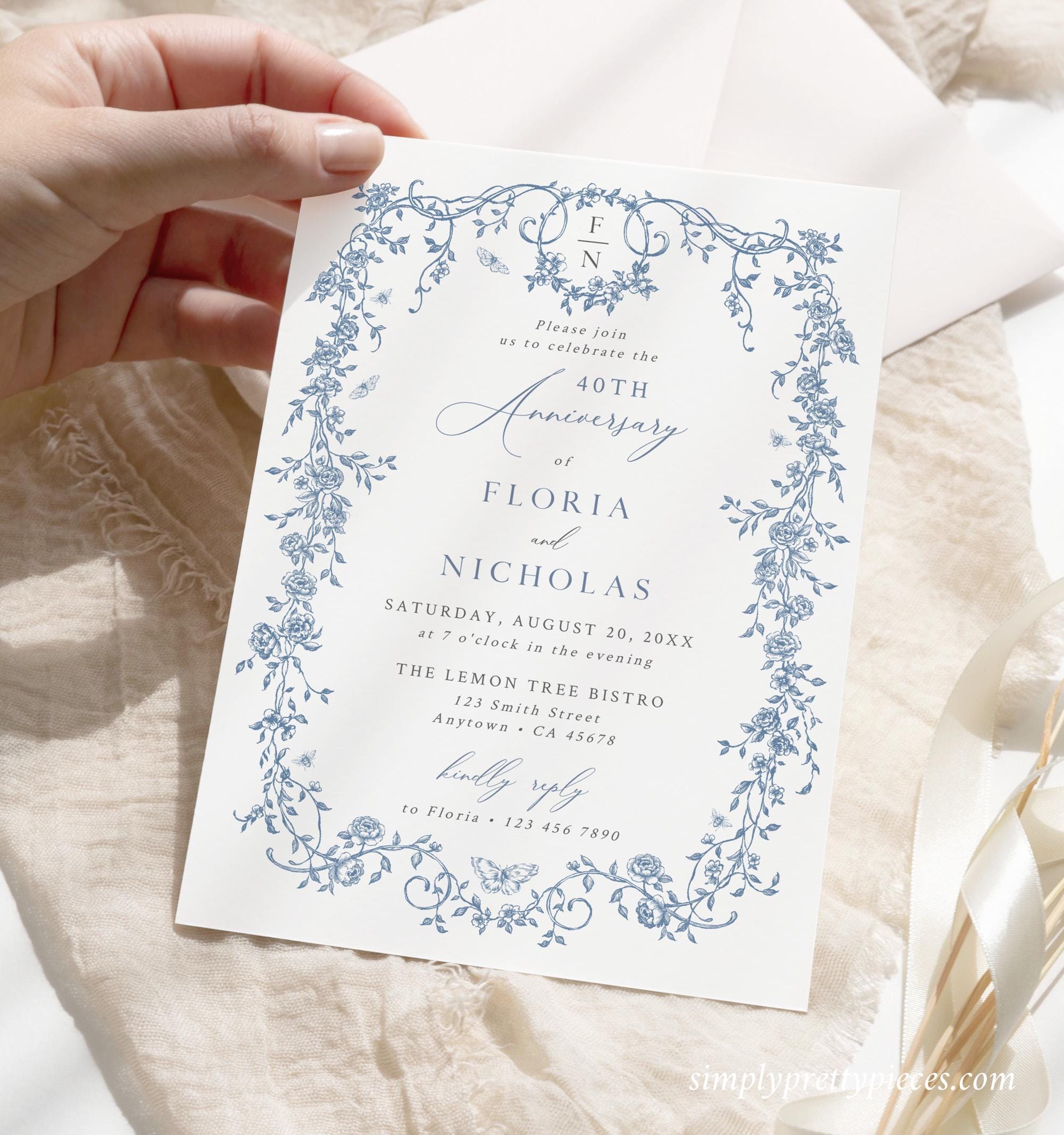 Printable wedding anniversary party invitation template that has a French toile de jouy design with an optional monogram reverse side. The pretty chinoiserie graphics have a muted dusty blue color palette and it is accented with a modern calligraphy font. All the text can be edited so it can be changed for any wedding anniversary celebration. Perfect for a summer anniversary party or event.
