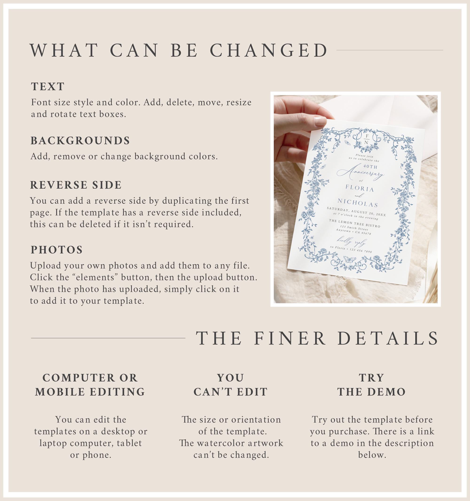 It can be fully edited using TEMPLETT which is a fully customizable template editor that allows you to quickly and easily customize digital templates. After your purchase you will get instant access to your template(s) via an emailed link. No software to install or fonts to download.