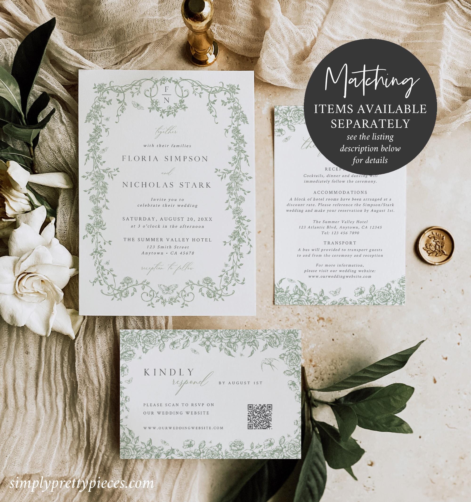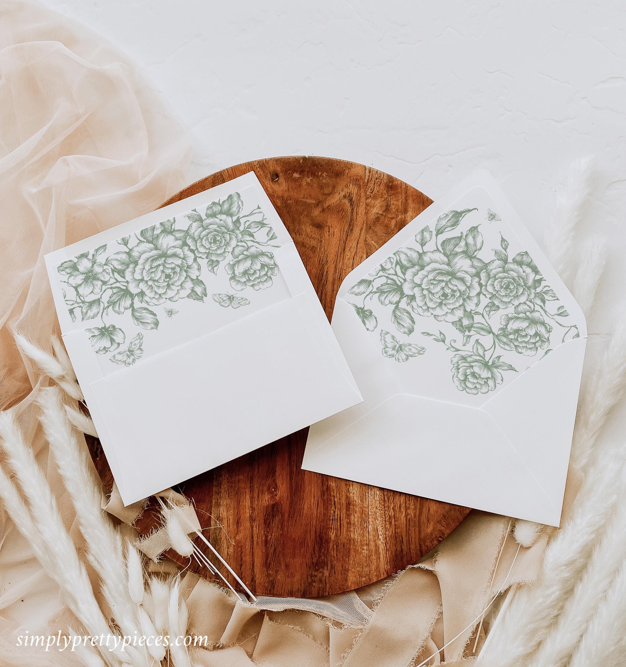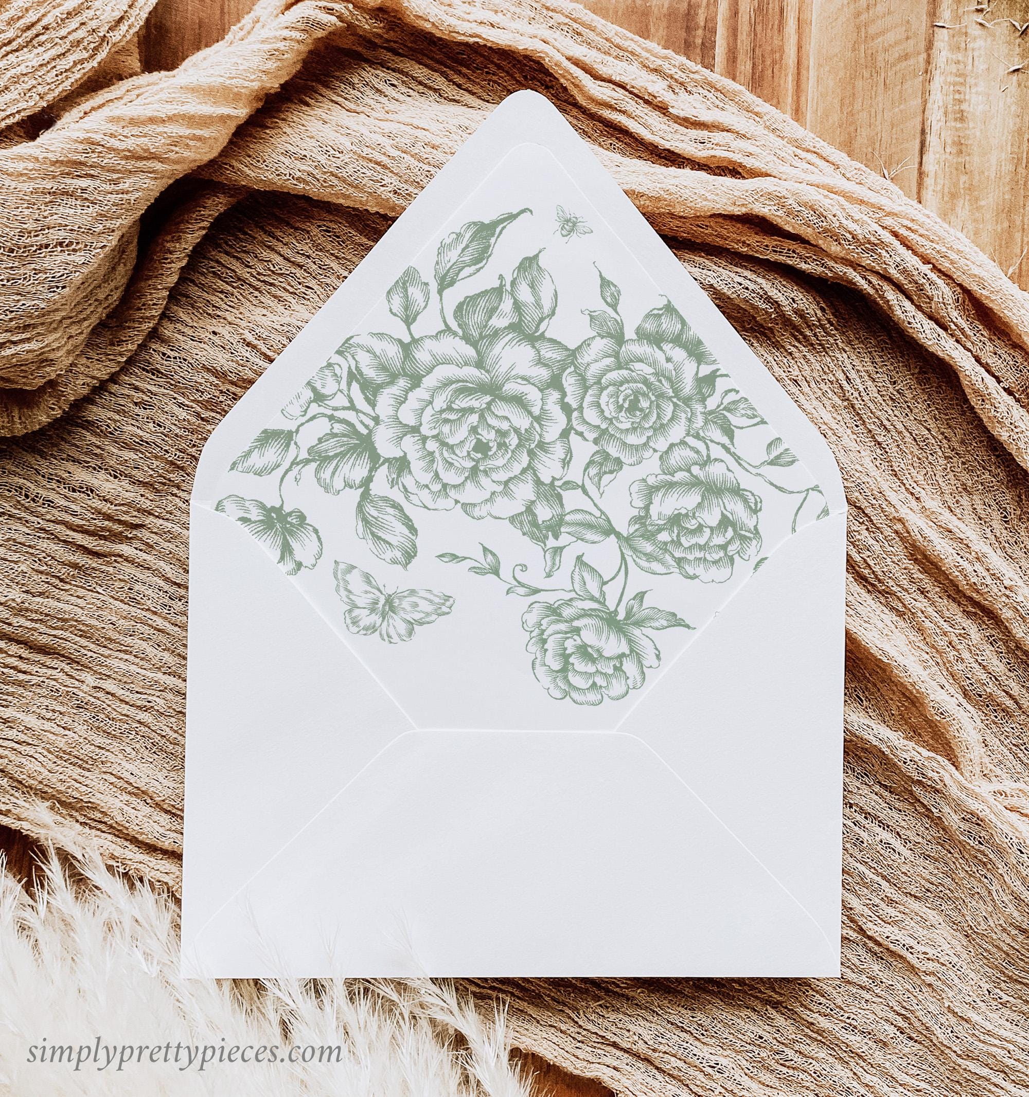 Instant download envelope liner templates that have French toile de jouy graphics in soft sage green tones. They are easy to download and print and they will give your stationery a unique, elegant finish. Liners with a Standard flap, Euro Flap and Square flap are included.