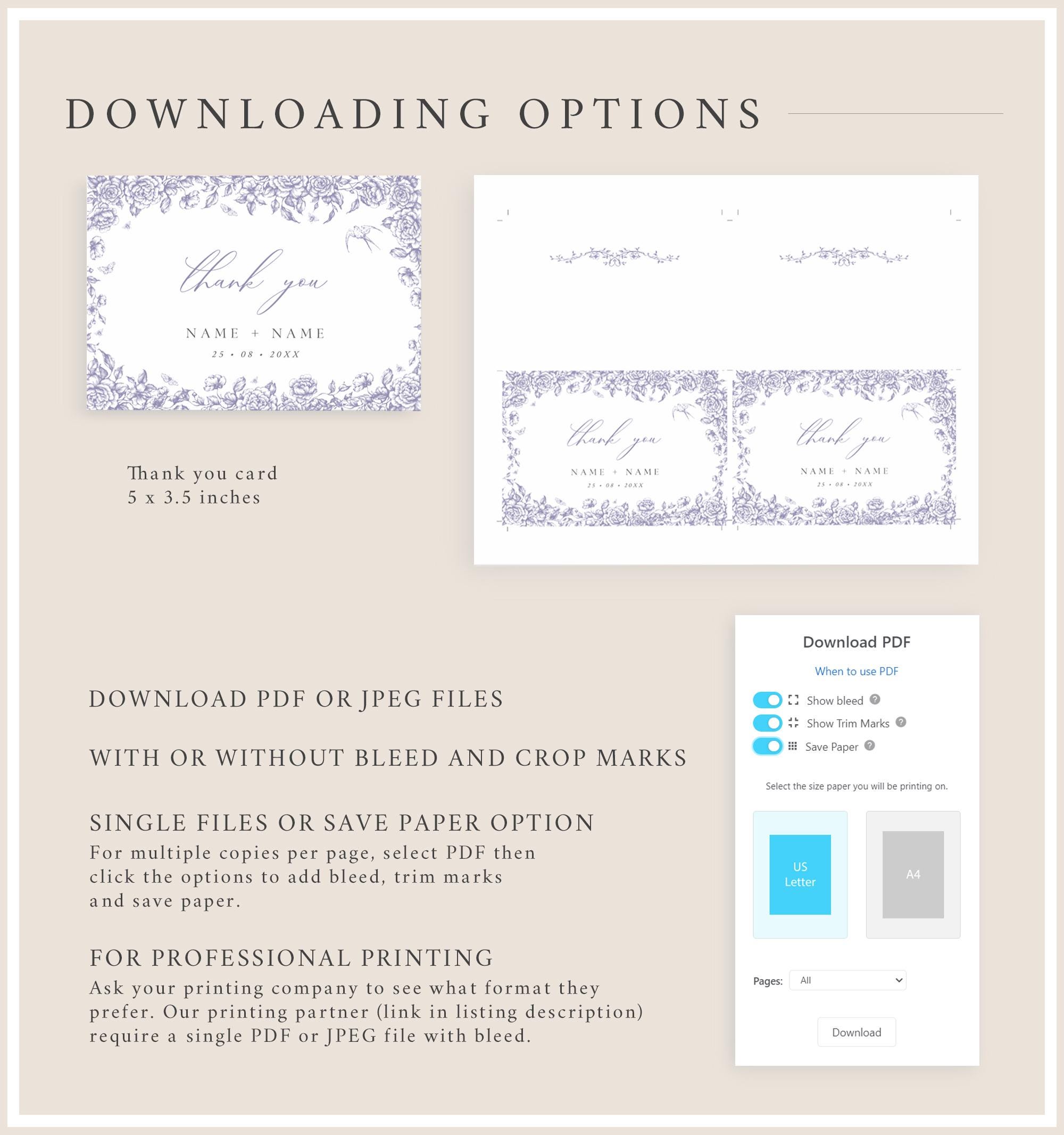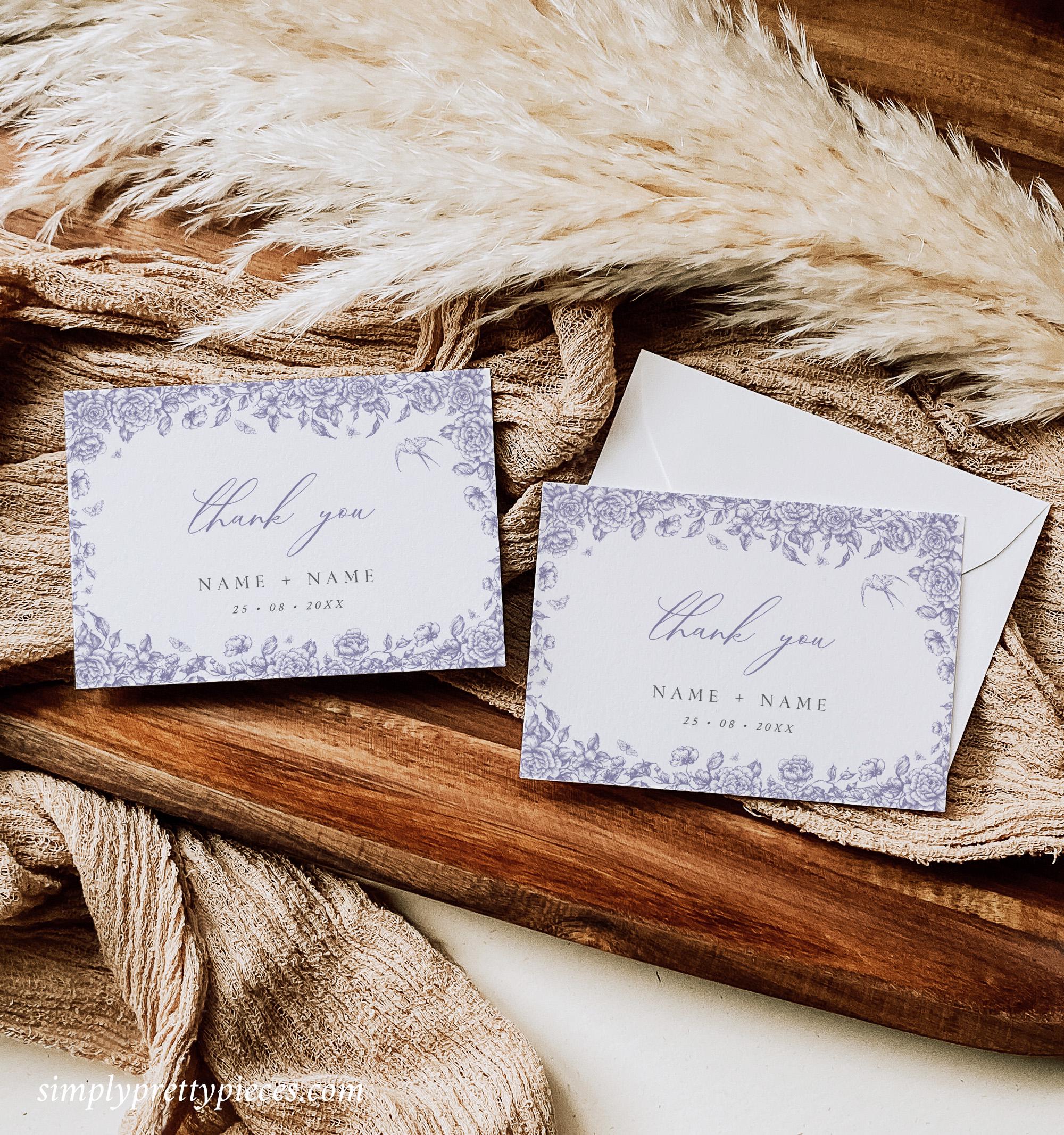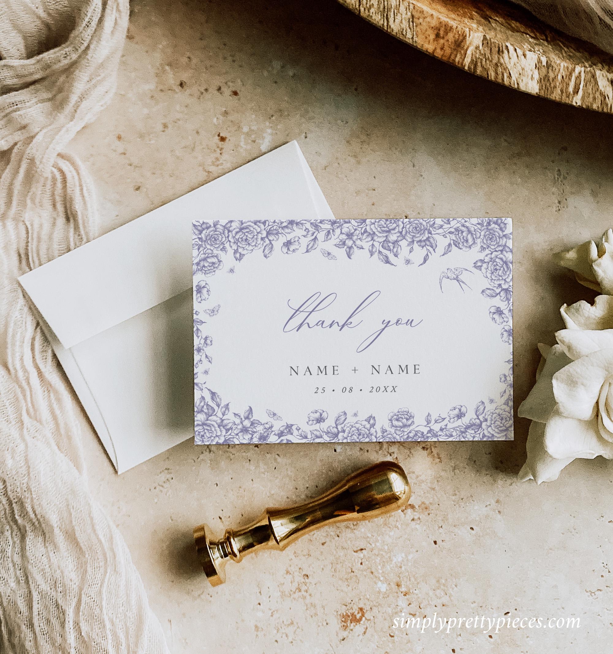 Printable foldable thank you card template that has a French toile de jouy design, a dusty lilac color palette and a calligraphy font. It can be edited with your names and you can print a thank you message on the inside. A lovely way to send your thanks.