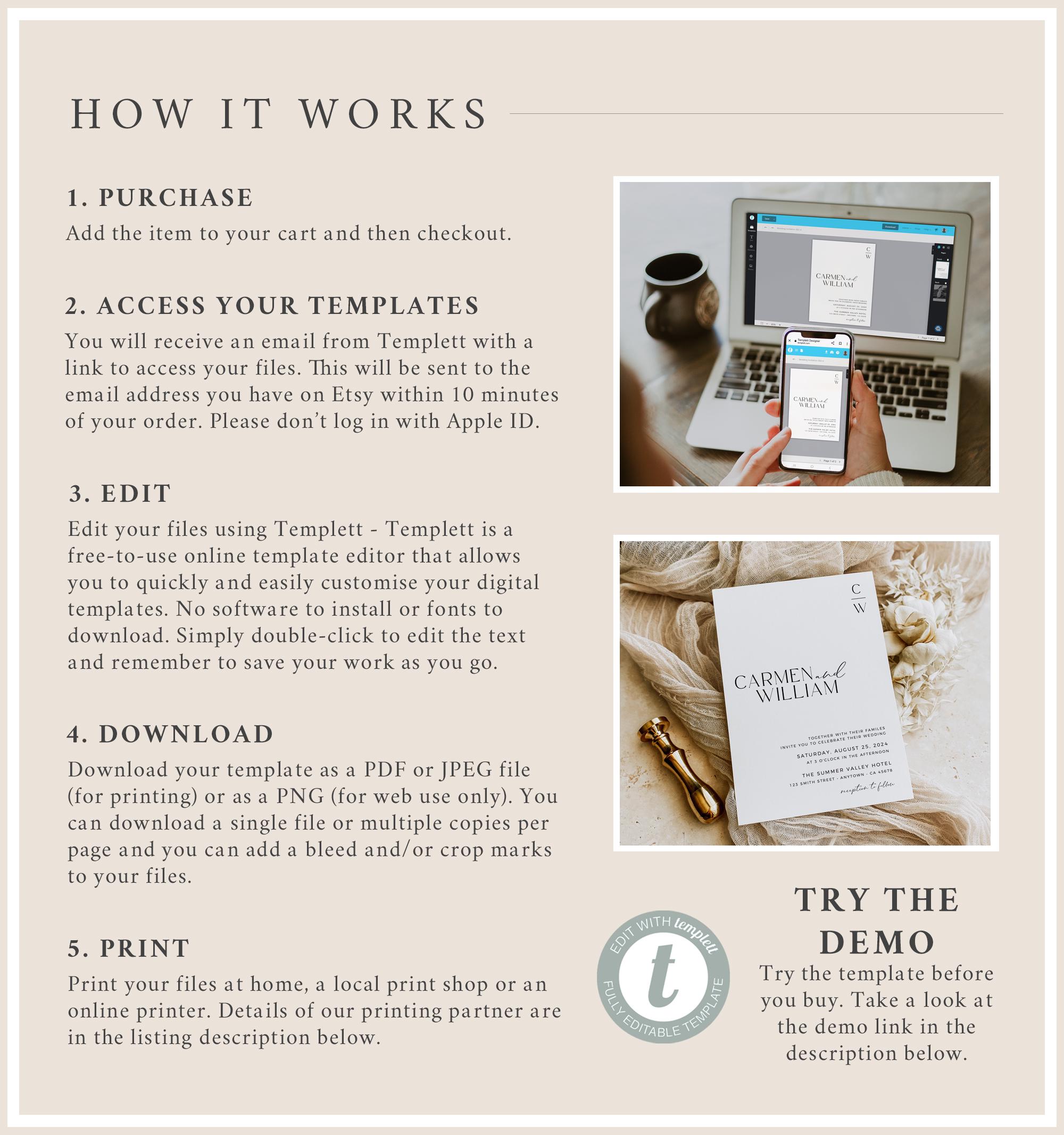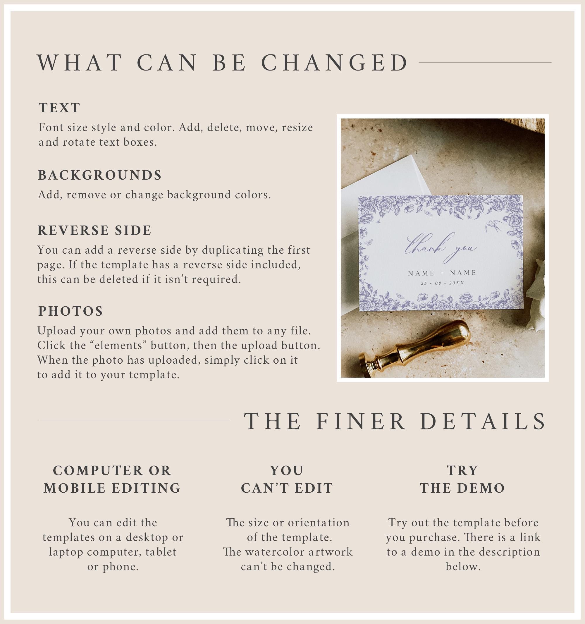 It can be fully edited using TEMPLETT which is a fully customizable template editor that allows you to quickly and easily customize digital templates. After your purchase you will get instant access to your template(s) via an emailed link. No software to install or fonts to download.