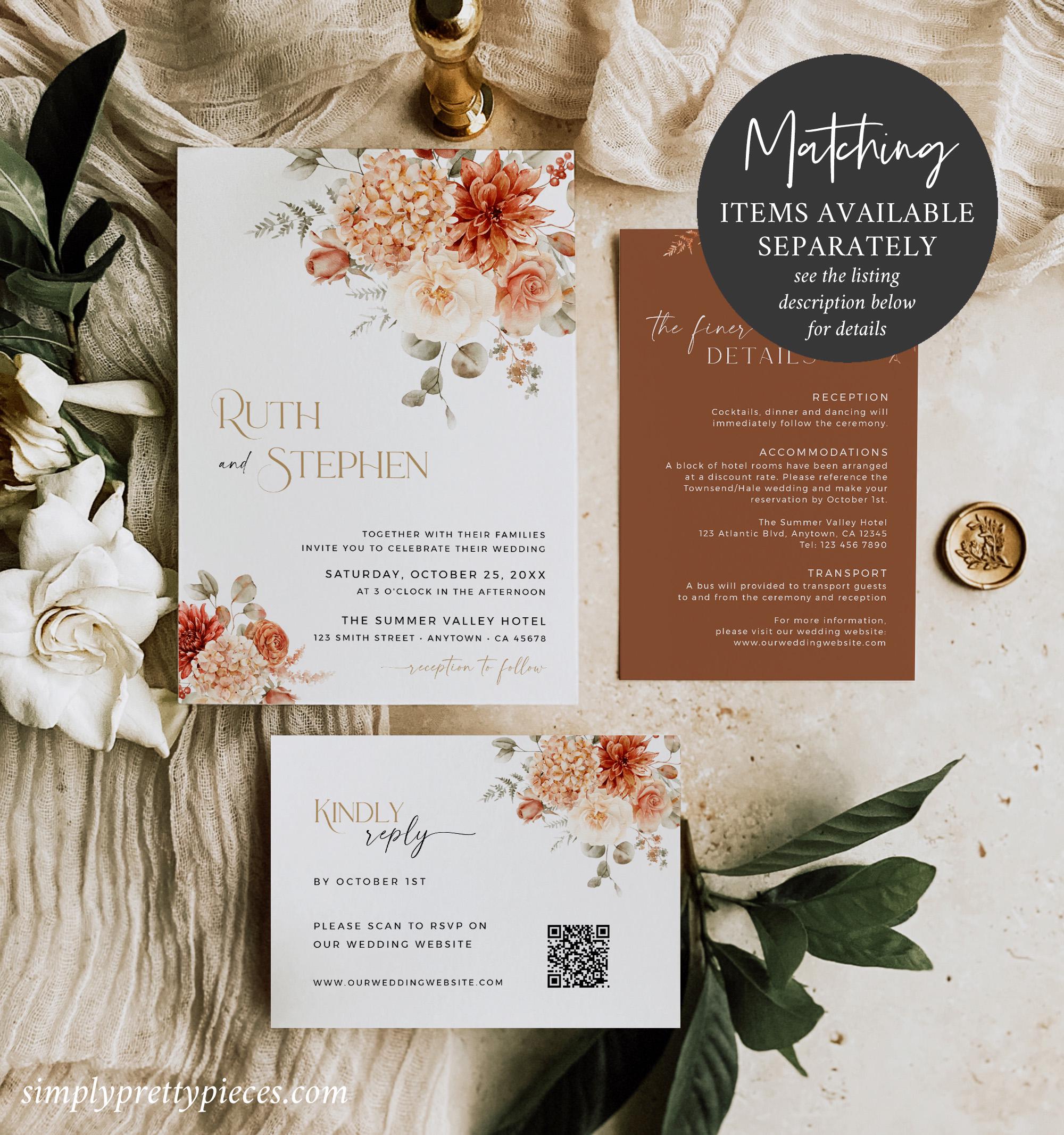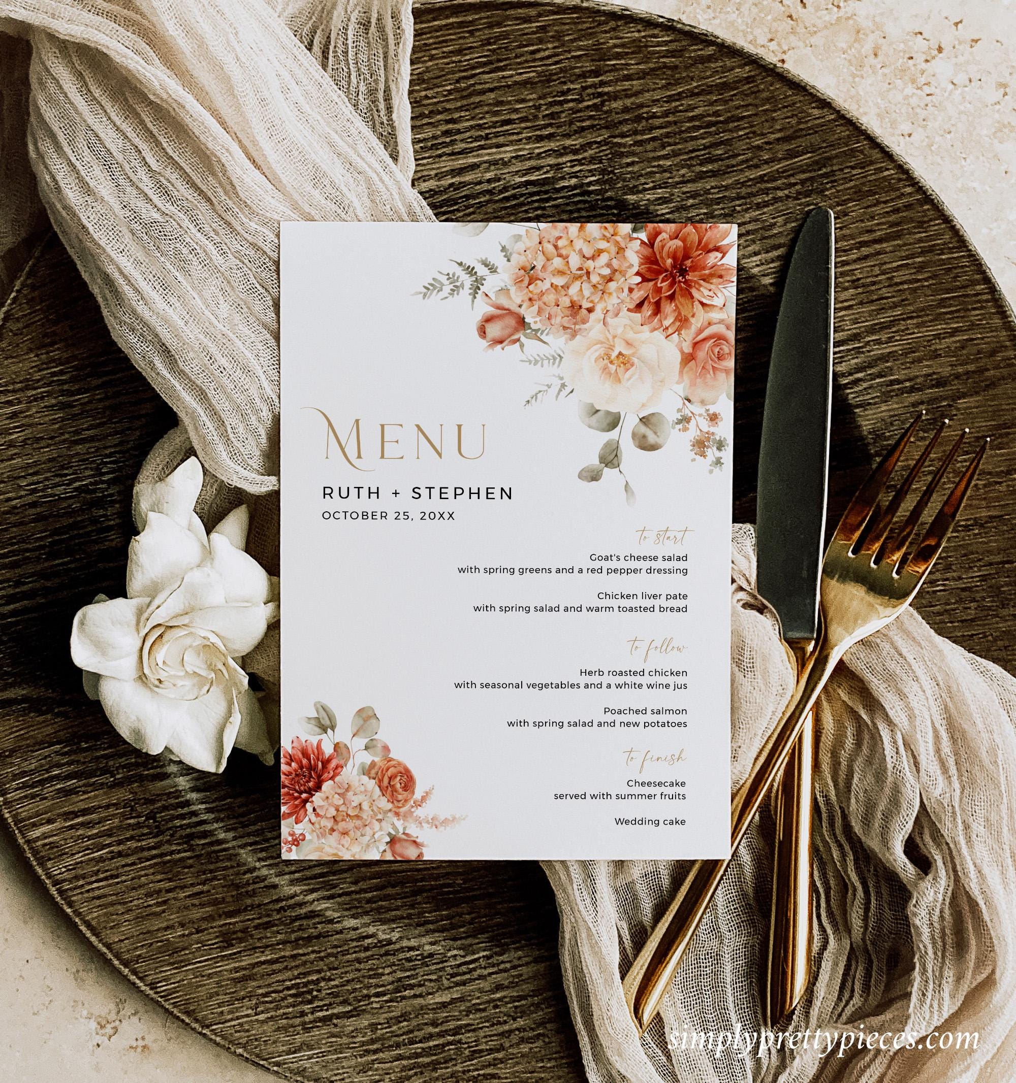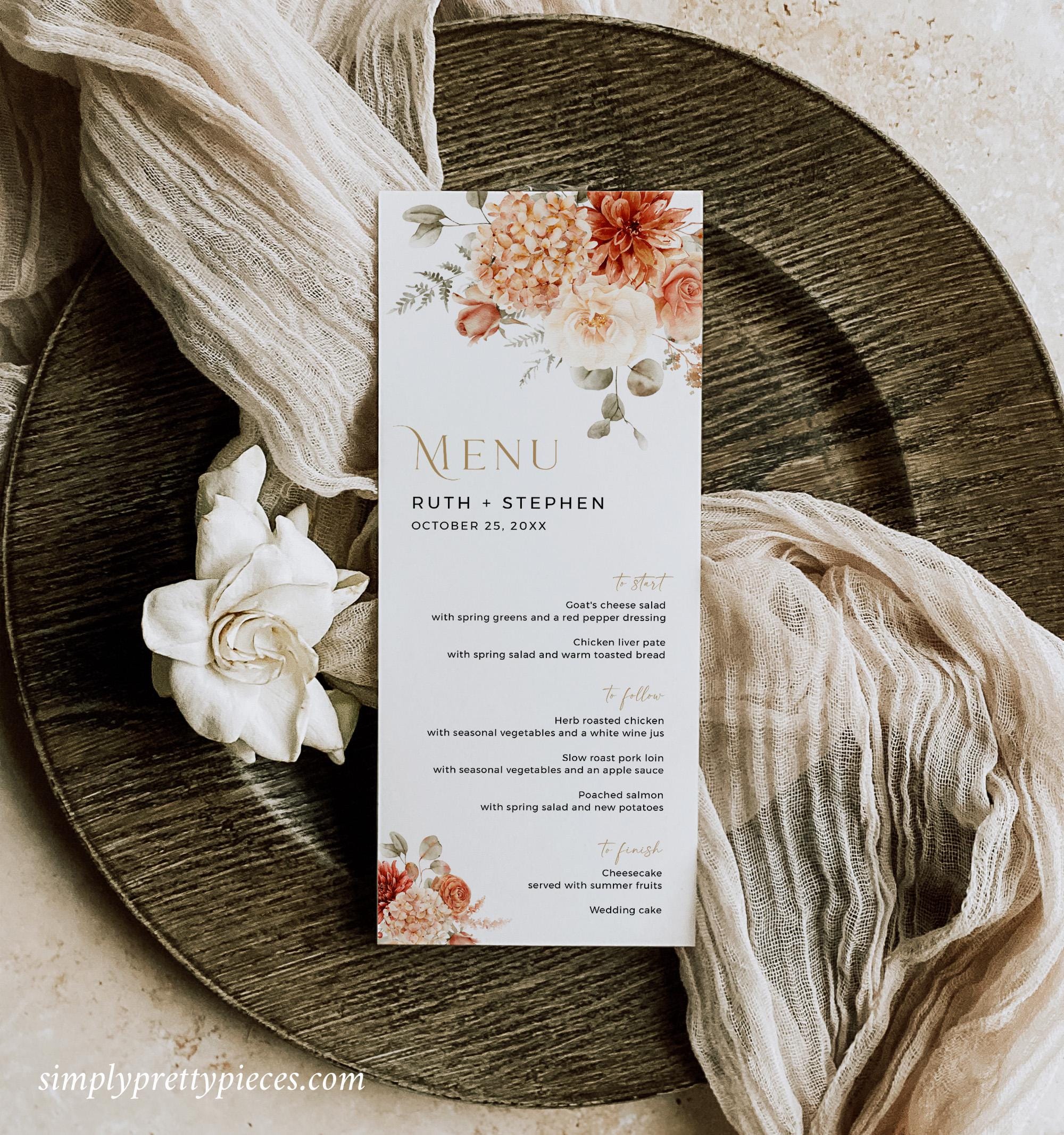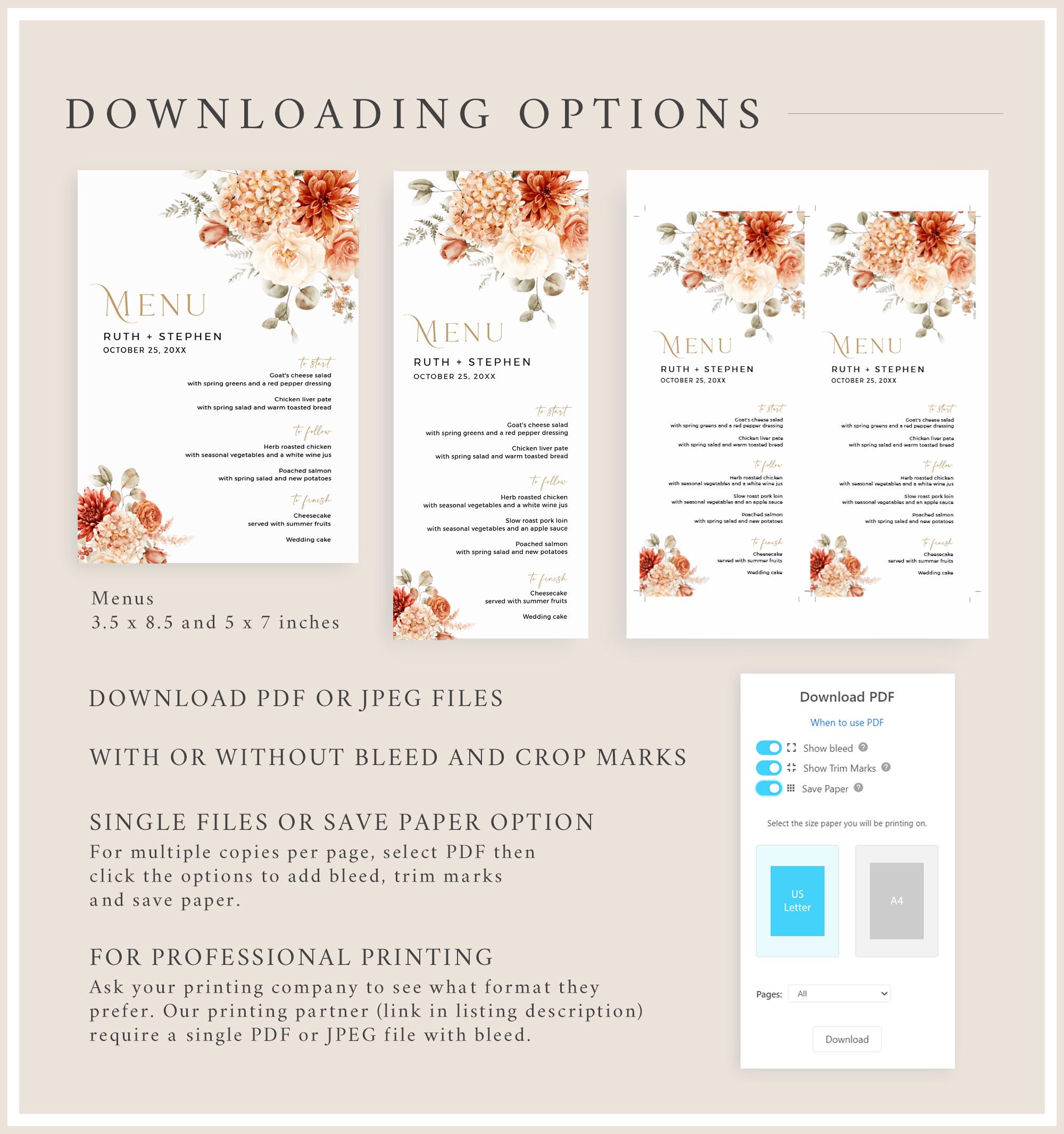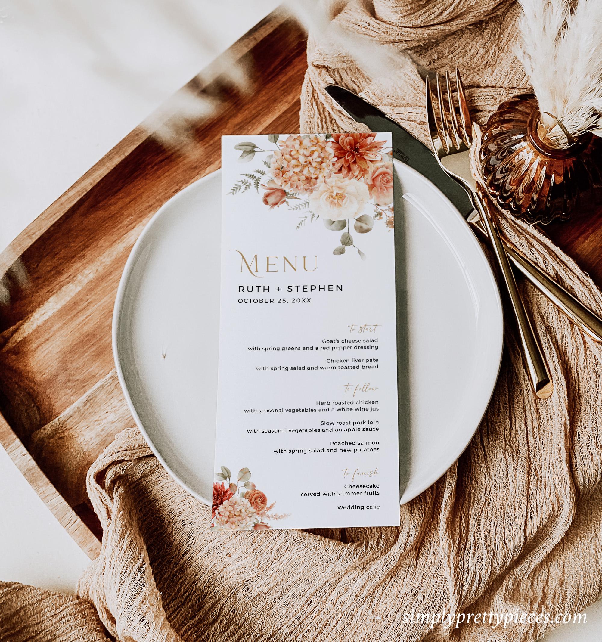 Printable wedding menu templates that have a rustic boho design and will look beautiful on your table settings. They are easy to edit and feature pretty florals with a terracotta, beige, rust and gold color palette and a modern calligraphy font. Two templates are included so you can choose the size you prefer.