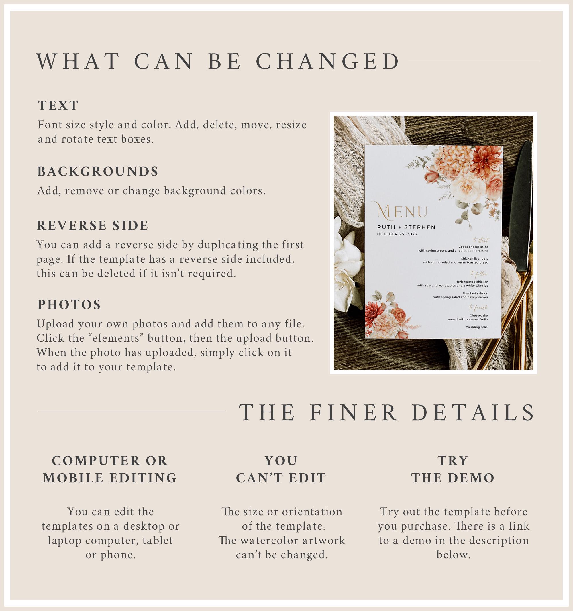 It can be fully edited using TEMPLETT which is a fully customizable template editor that allows you to quickly and easily customize digital templates. After your purchase you will get instant access to your template(s) via an emailed link. No software to install or fonts to download.