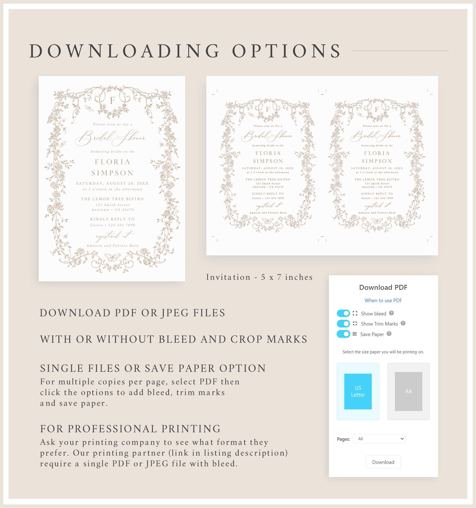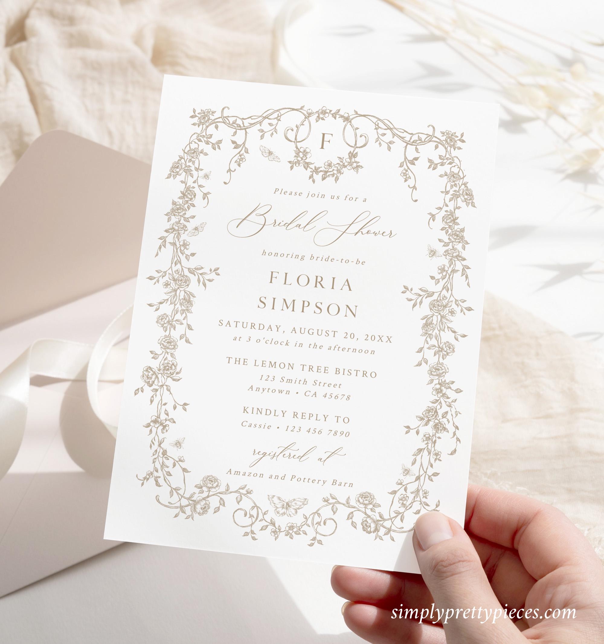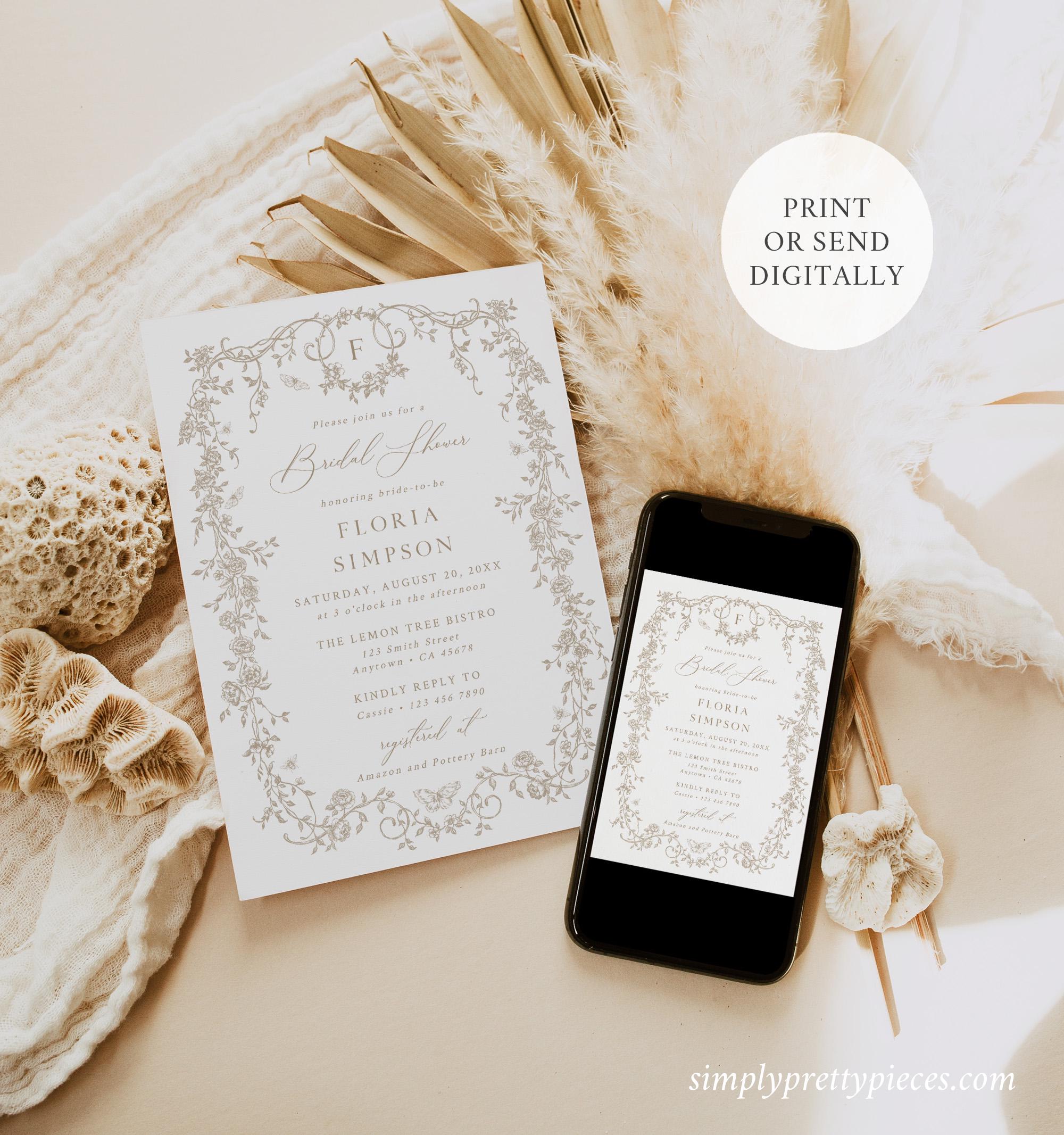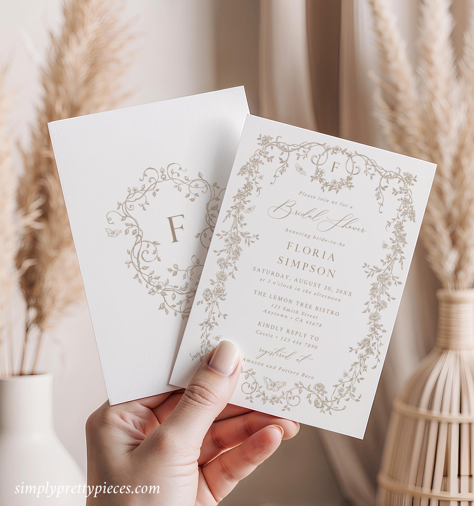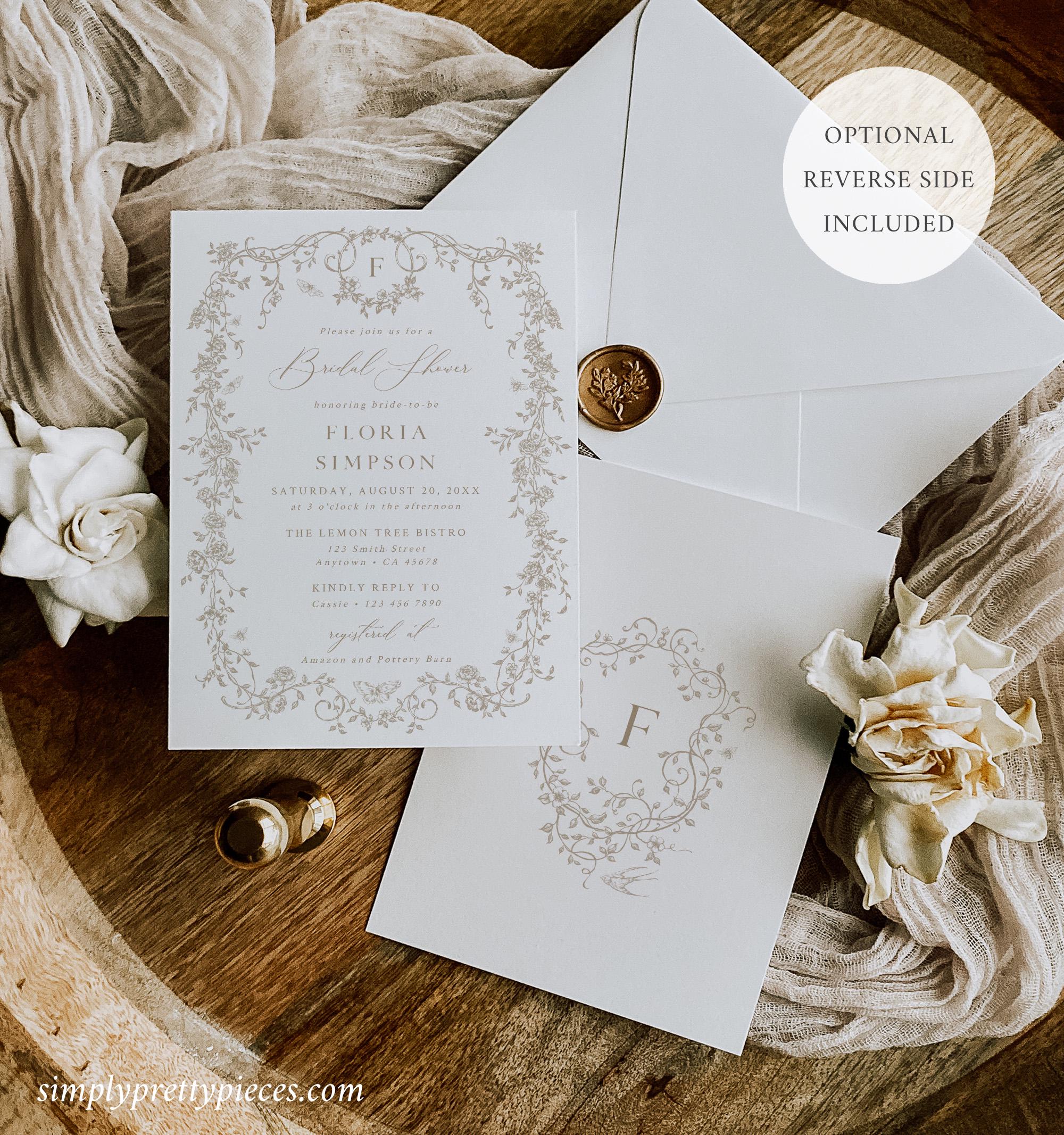 Printable bridal shower invitation template that has a French toile de jouy design and an optional monogram reverse side. It has a neutral beige color palette and it is accented with a modern calligraphy font. Perfect for a chinoiserie themed bridal shower or event.