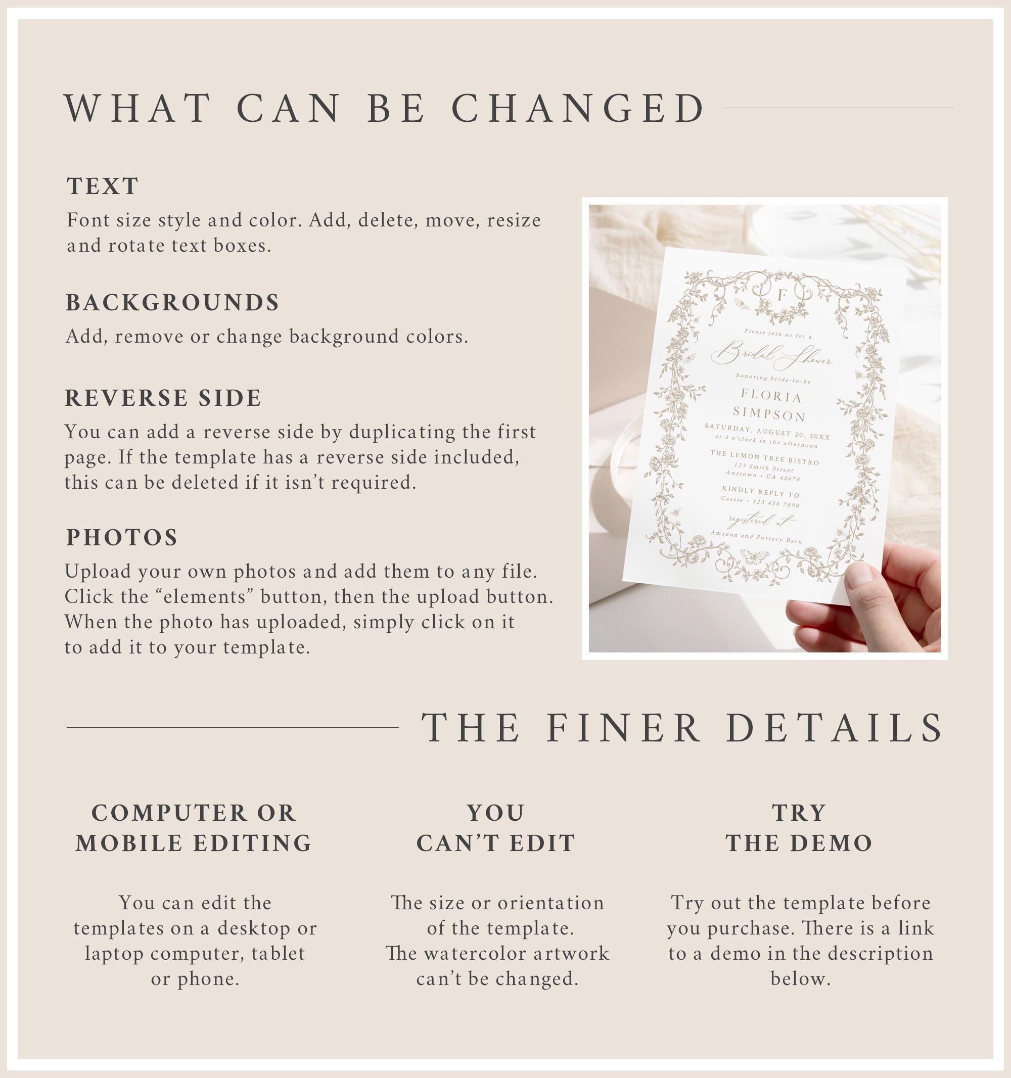 It can be fully edited using TEMPLETT which is a fully customizable template editor that allows you to quickly and easily customize digital templates. After your purchase you will get instant access to your template(s) via an emailed link. No software to install or fonts to download.