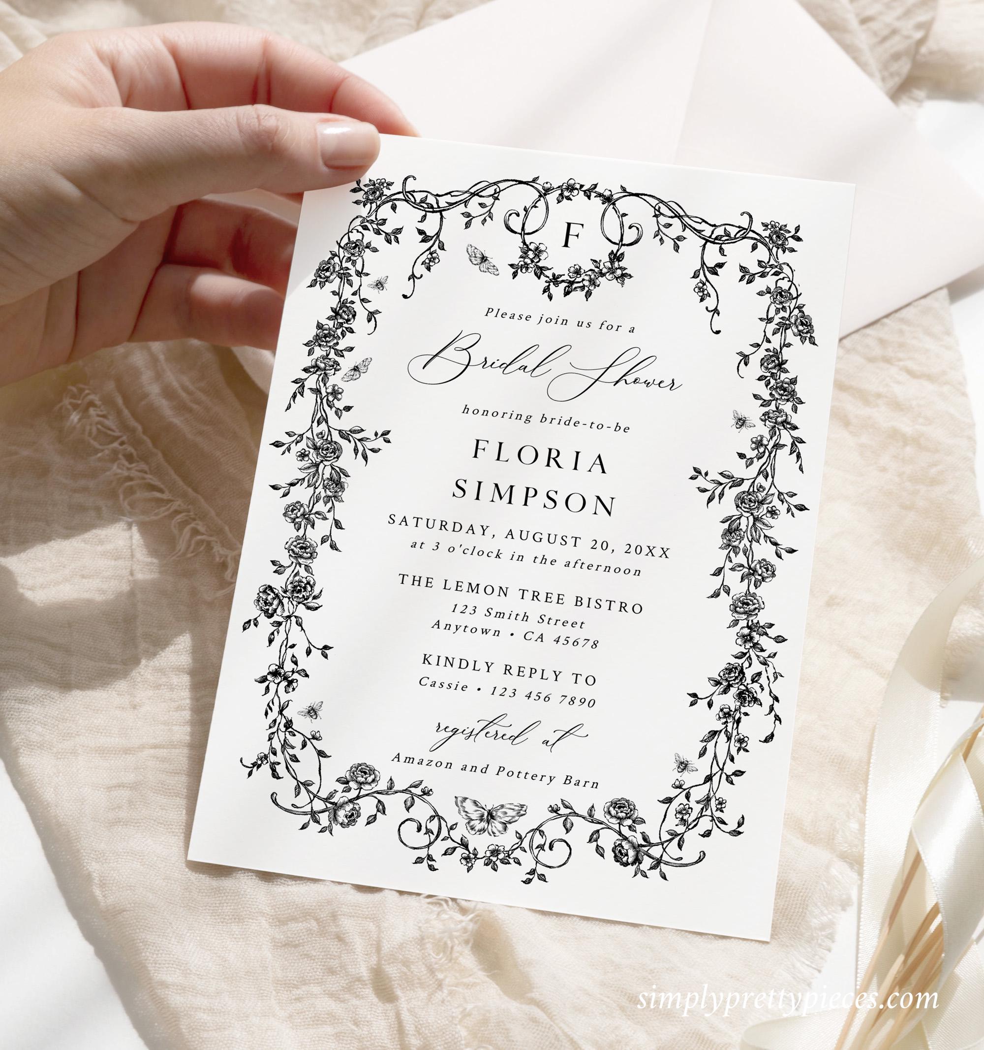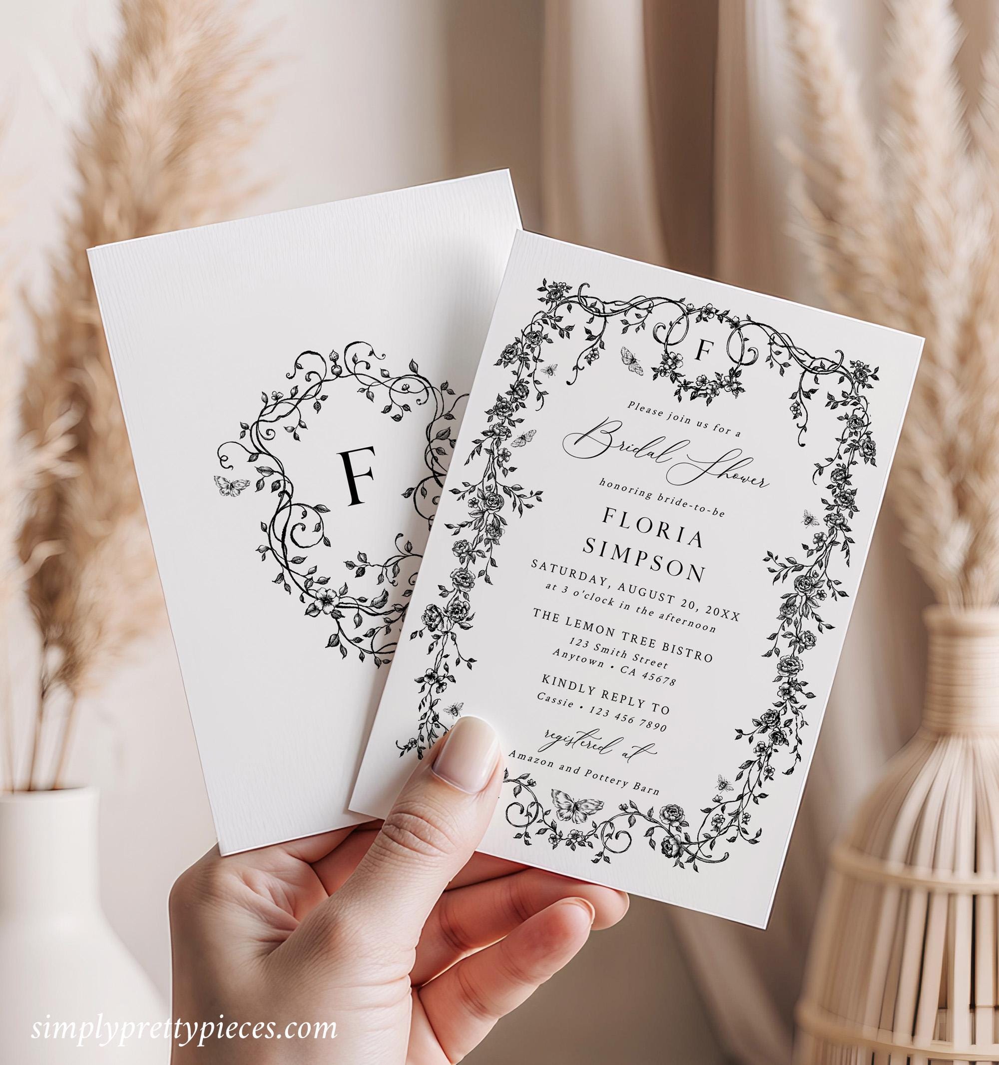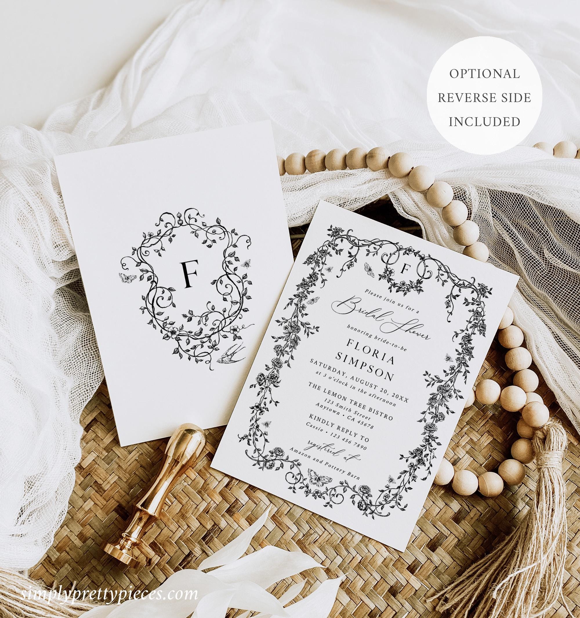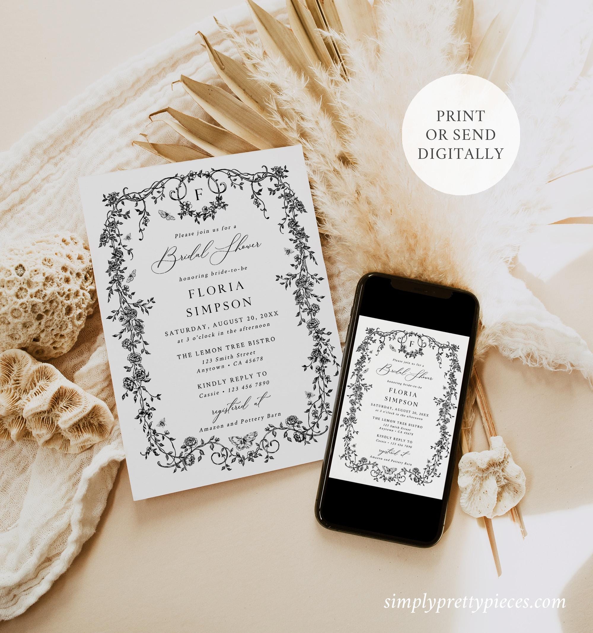 Printable bridal shower invitation template that has a French toile de jouy design and an optional monogram reverse side. It has a classic black and white color palette and it is accented with a modern calligraphy font. Perfect for a chinoiserie themed bridal shower or event.
