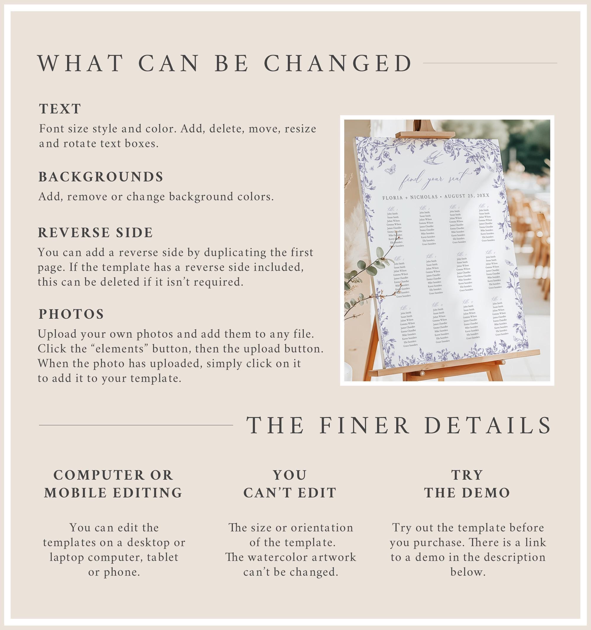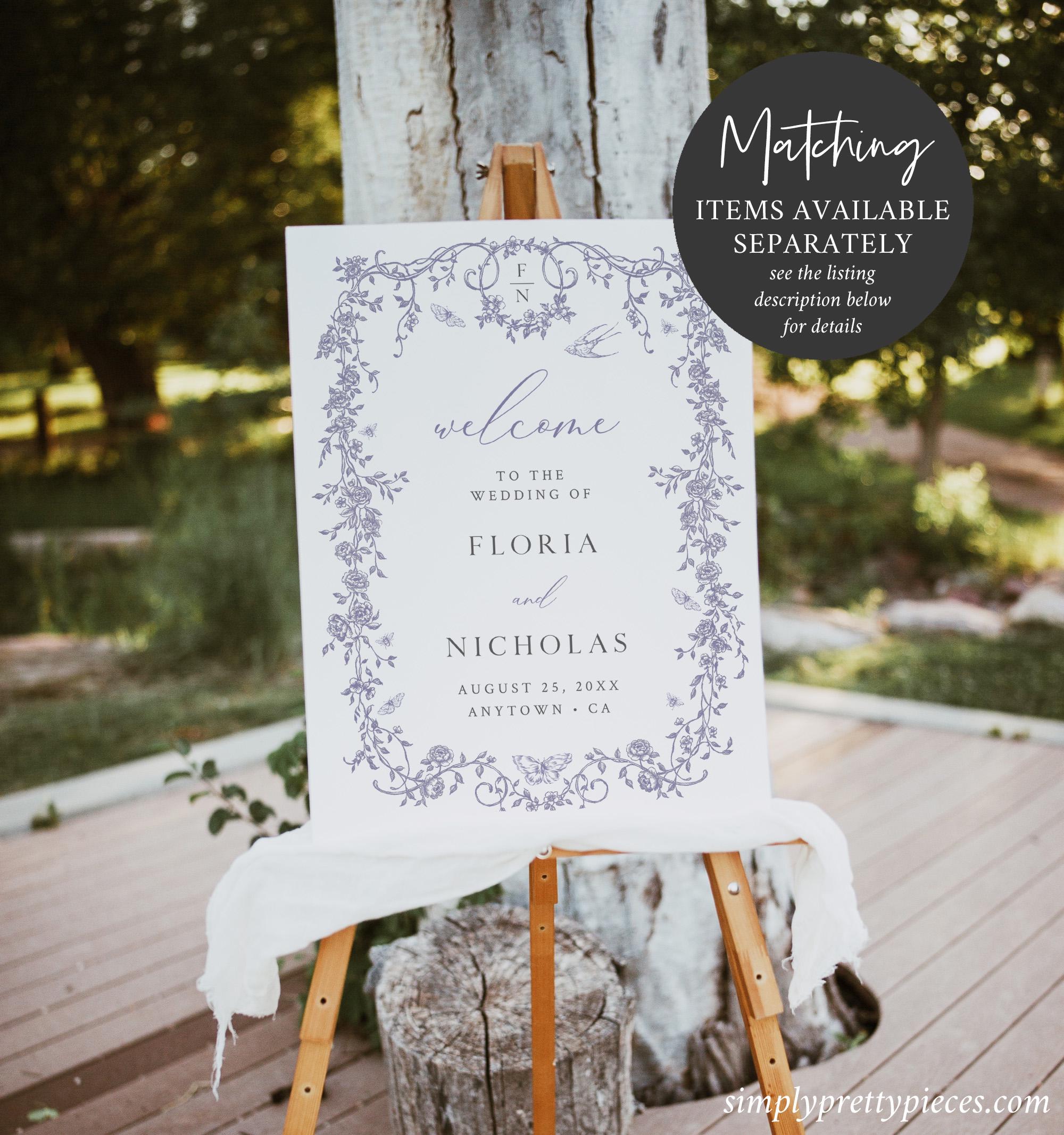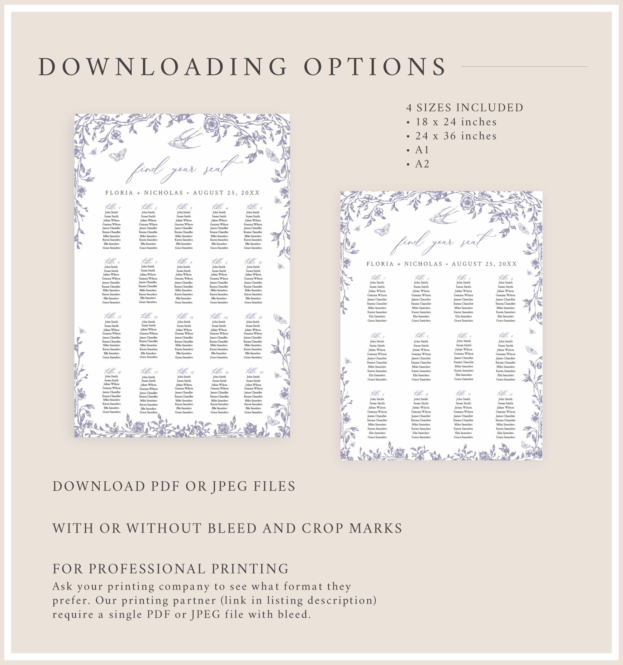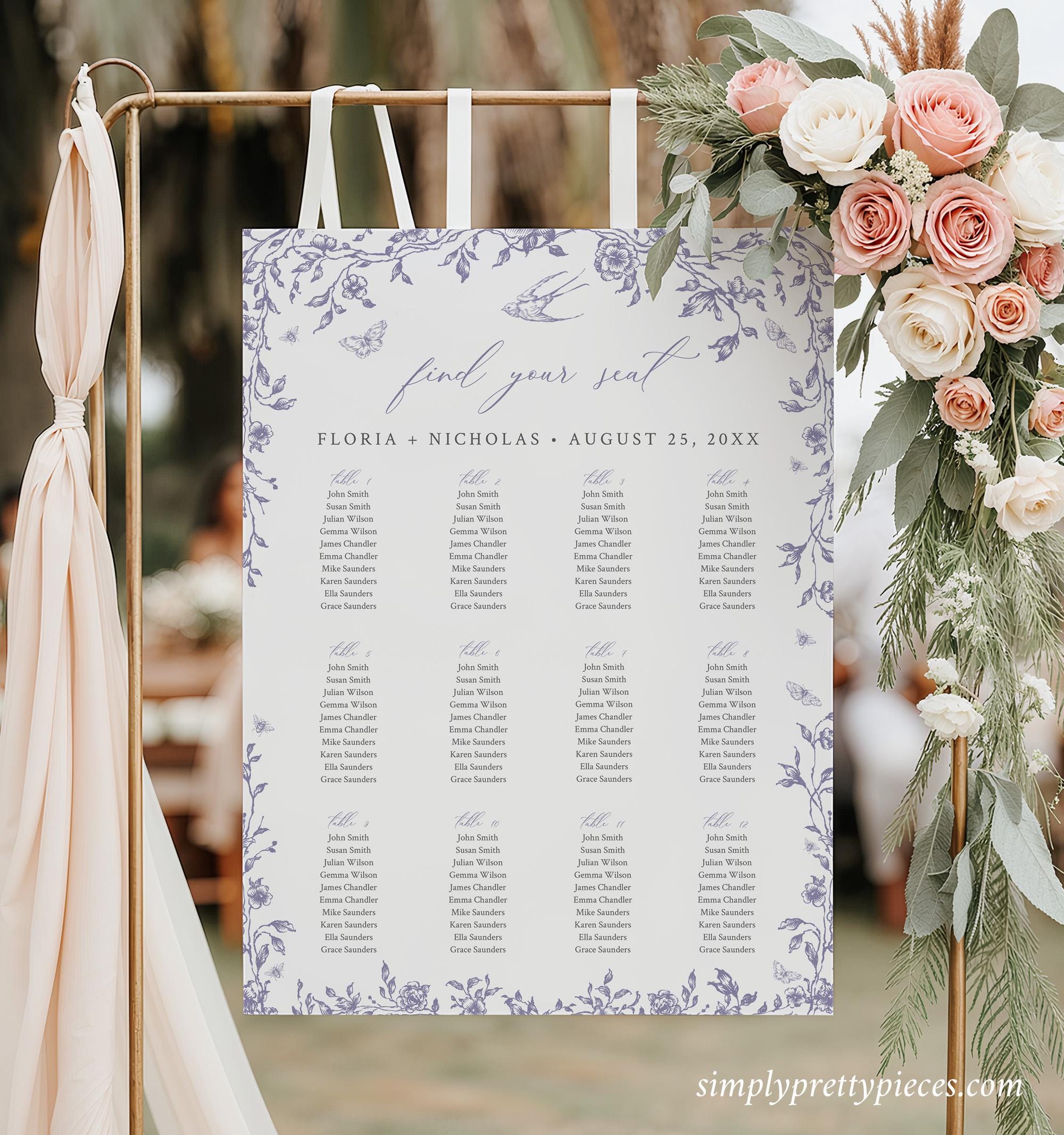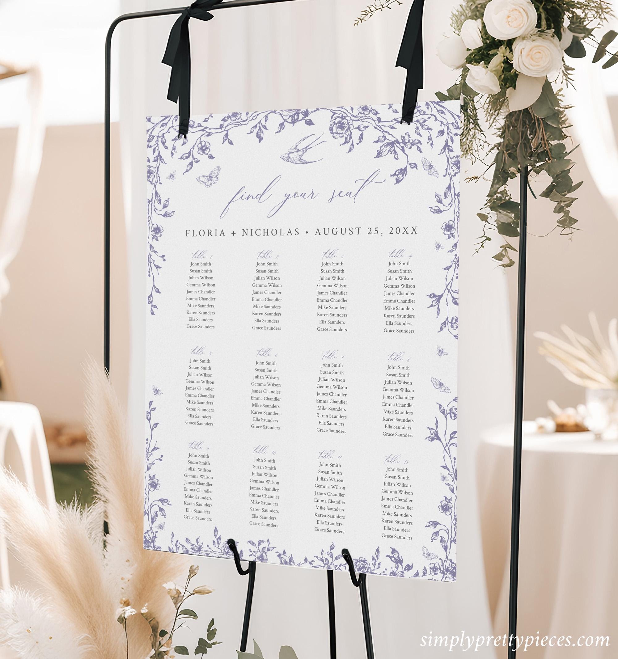 Editable seating chart templates have toile de jouy graphics, a soft dusty lilac color palette and a modern calligraphy font. A seating plan poster is great way to display the names of your guests and the pretty french floral design will stand out at your reception. Perfect for a classic wedding or any outdoor event. Four sizes are included so you can choose the one that is appropriate for your event.